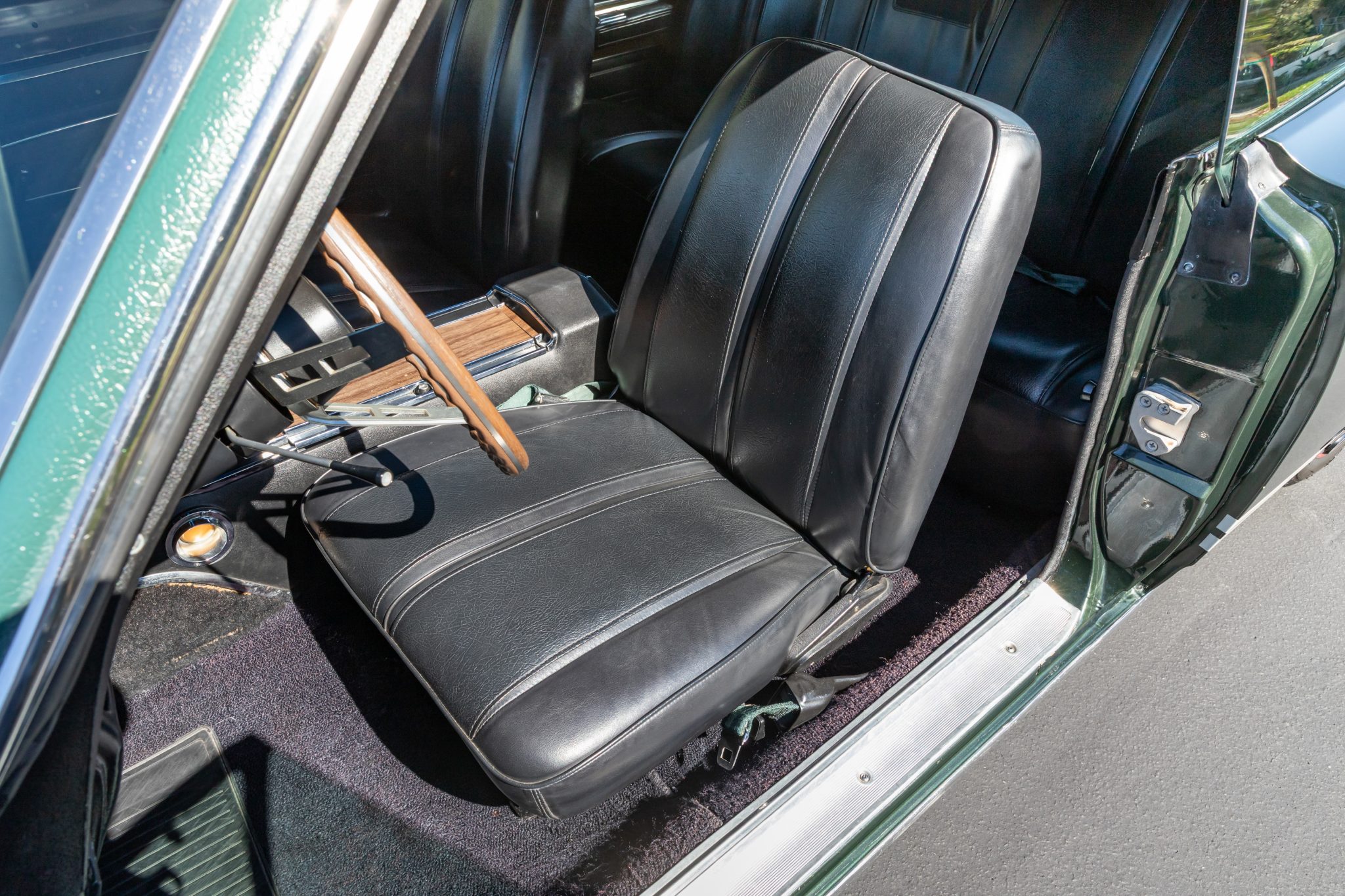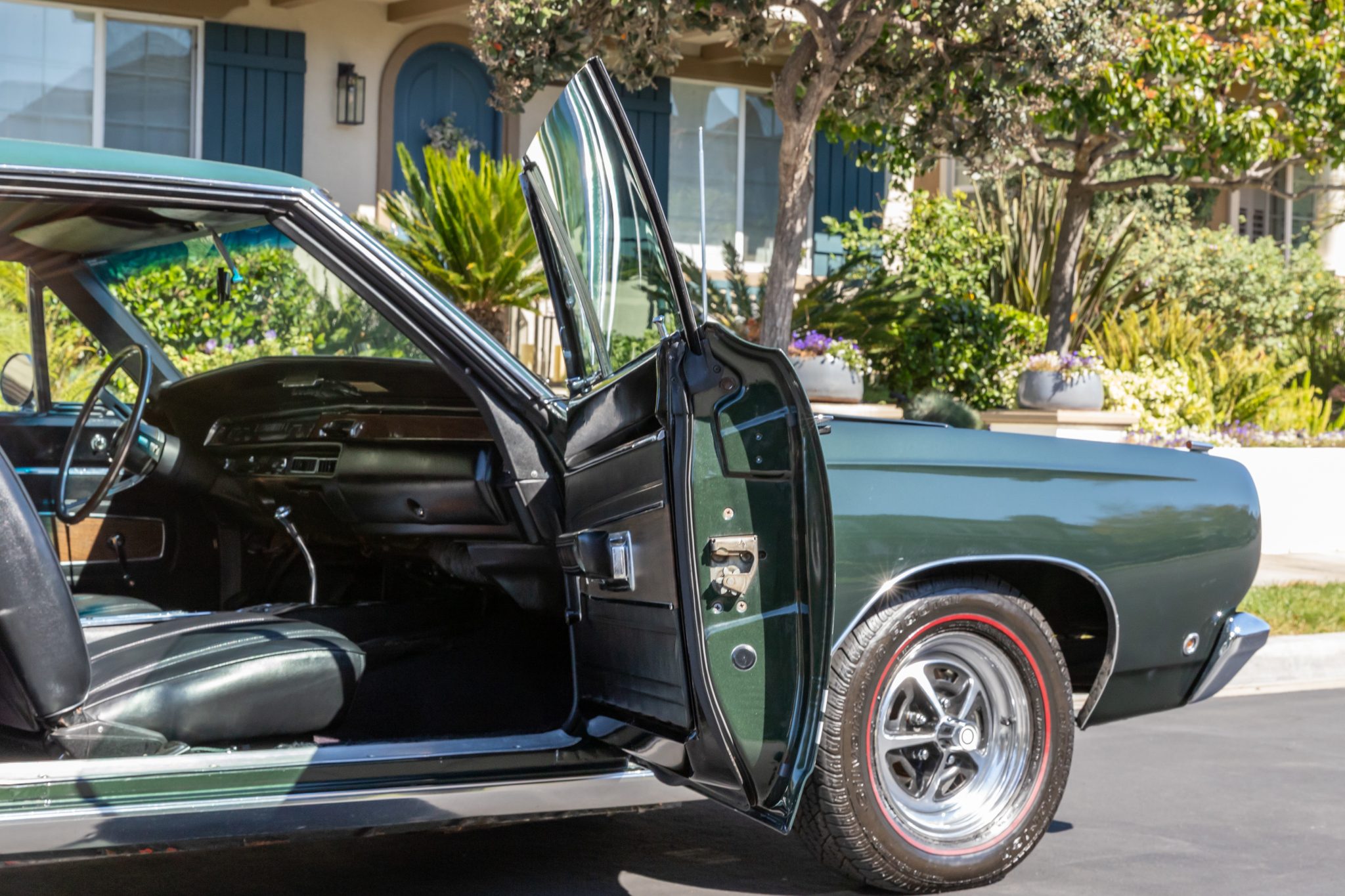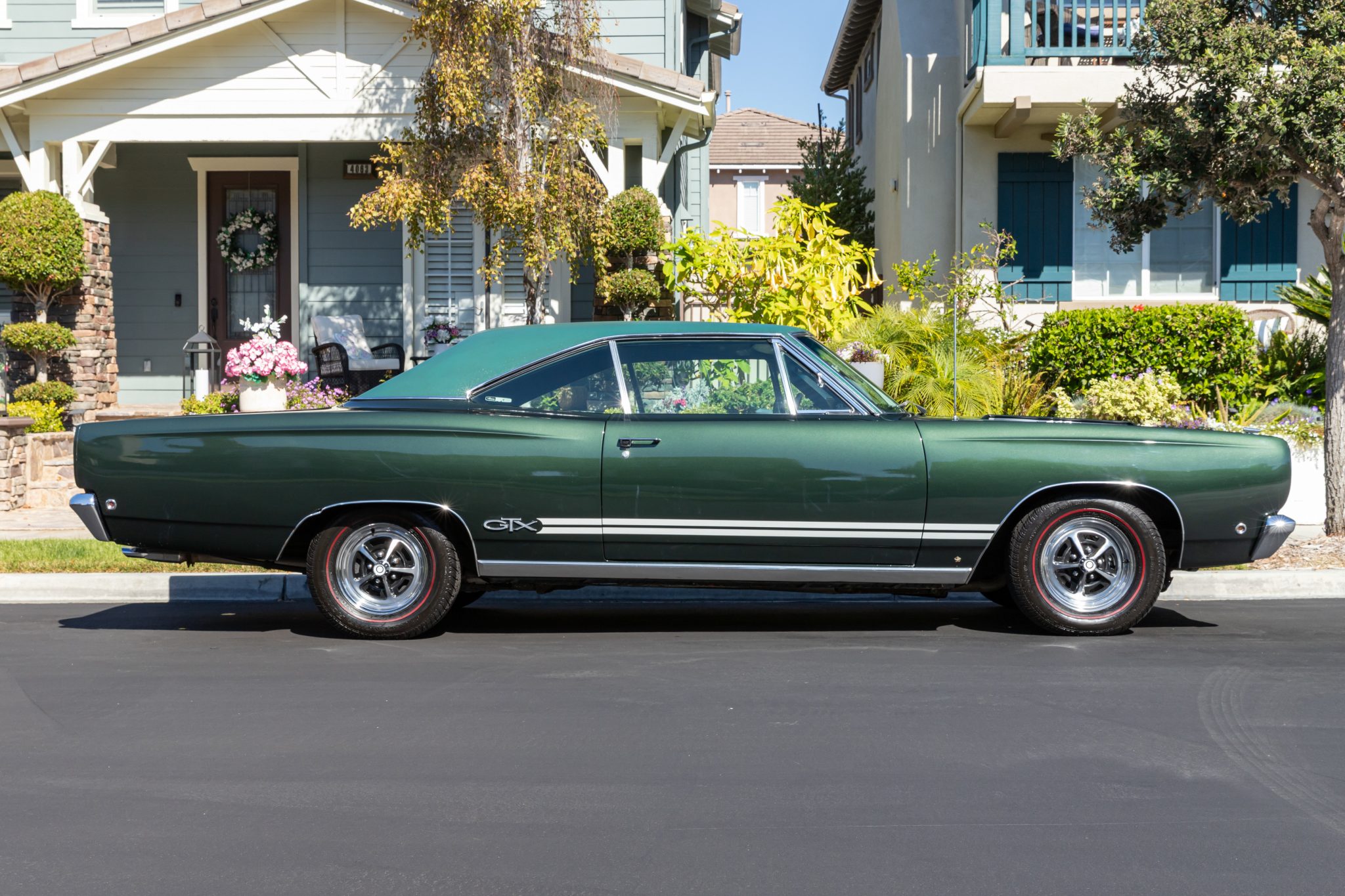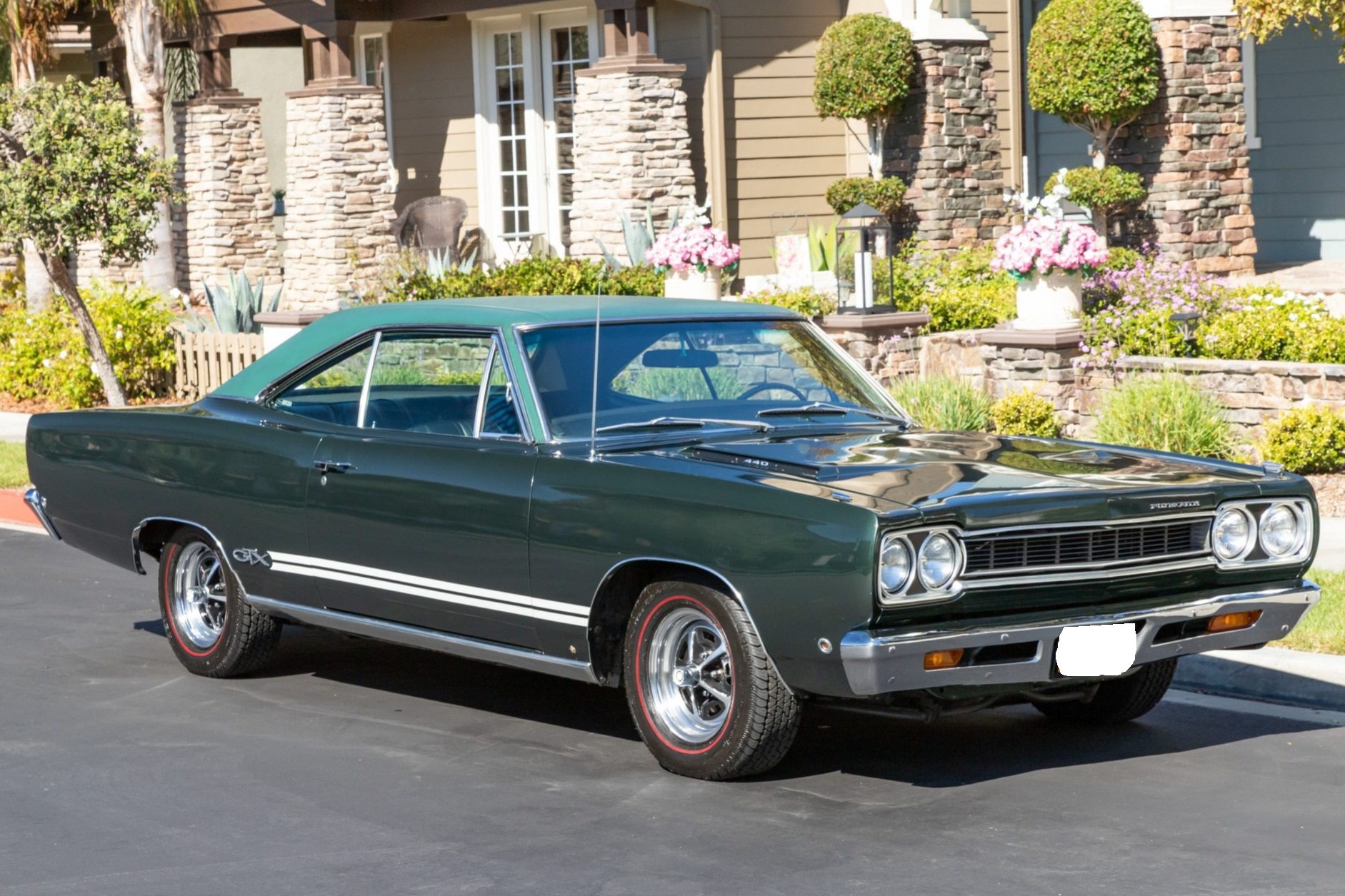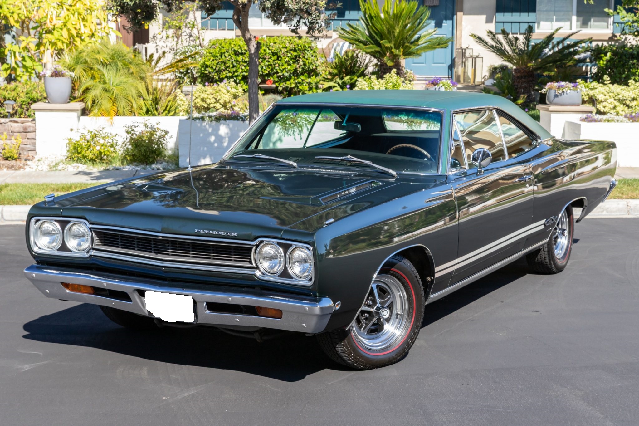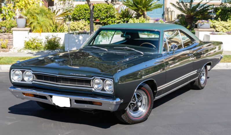 This 1968 Plymouth GTX hardtop was refurbished Powered by a 440ci V8 mated to a three-speed automatic transmission and a Sure-Grip differential, the car is finished in Forest Green with a green vinyl roof over black vinyl upholstery. Equipment includes white side stripes, 14″ chromed steel road wheels, red-line tires, power-assisted front disc brakes, power steering, woodgrain interior trim, air conditioning, front bucket seats, a center console, a tachometer, and an AM radio.