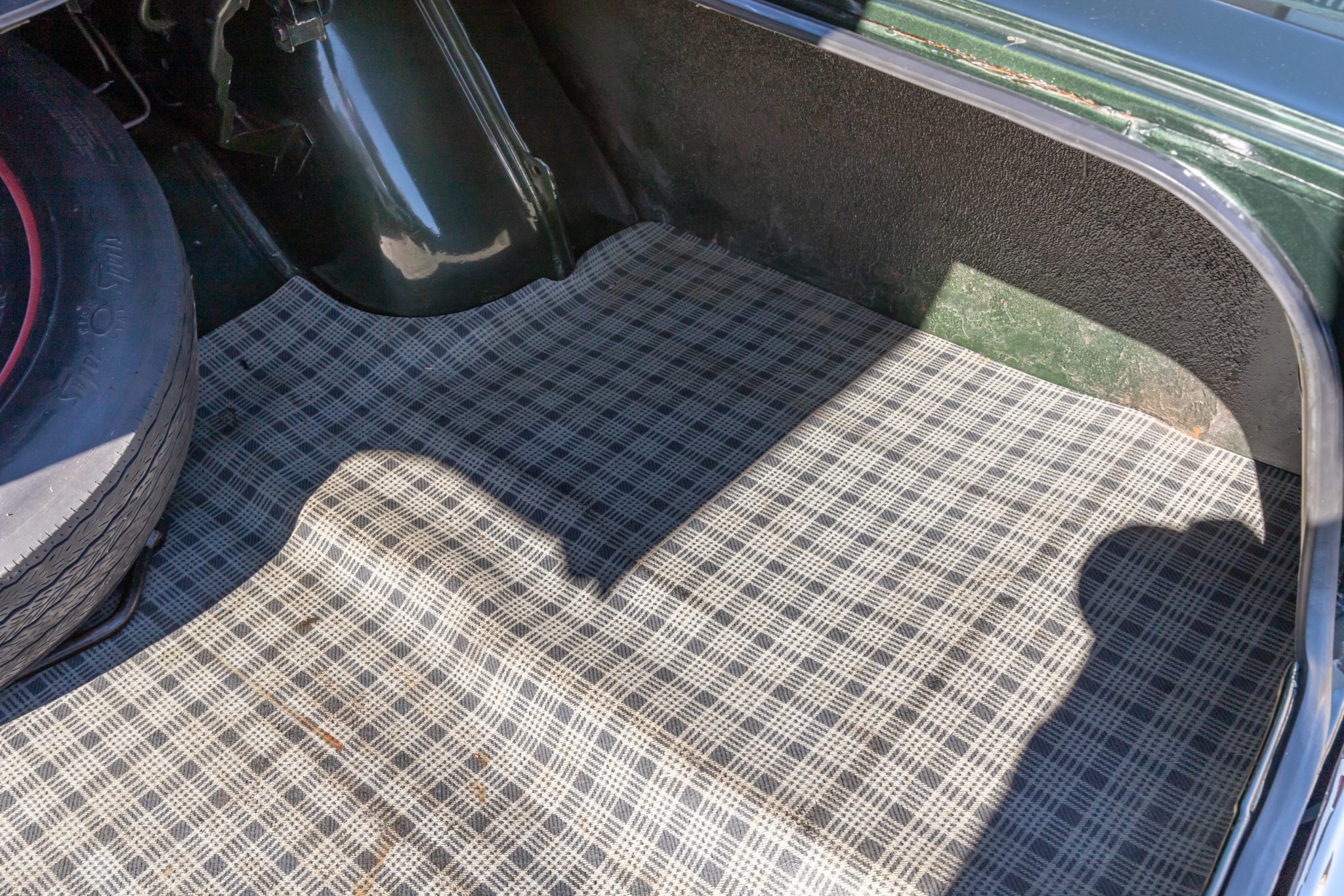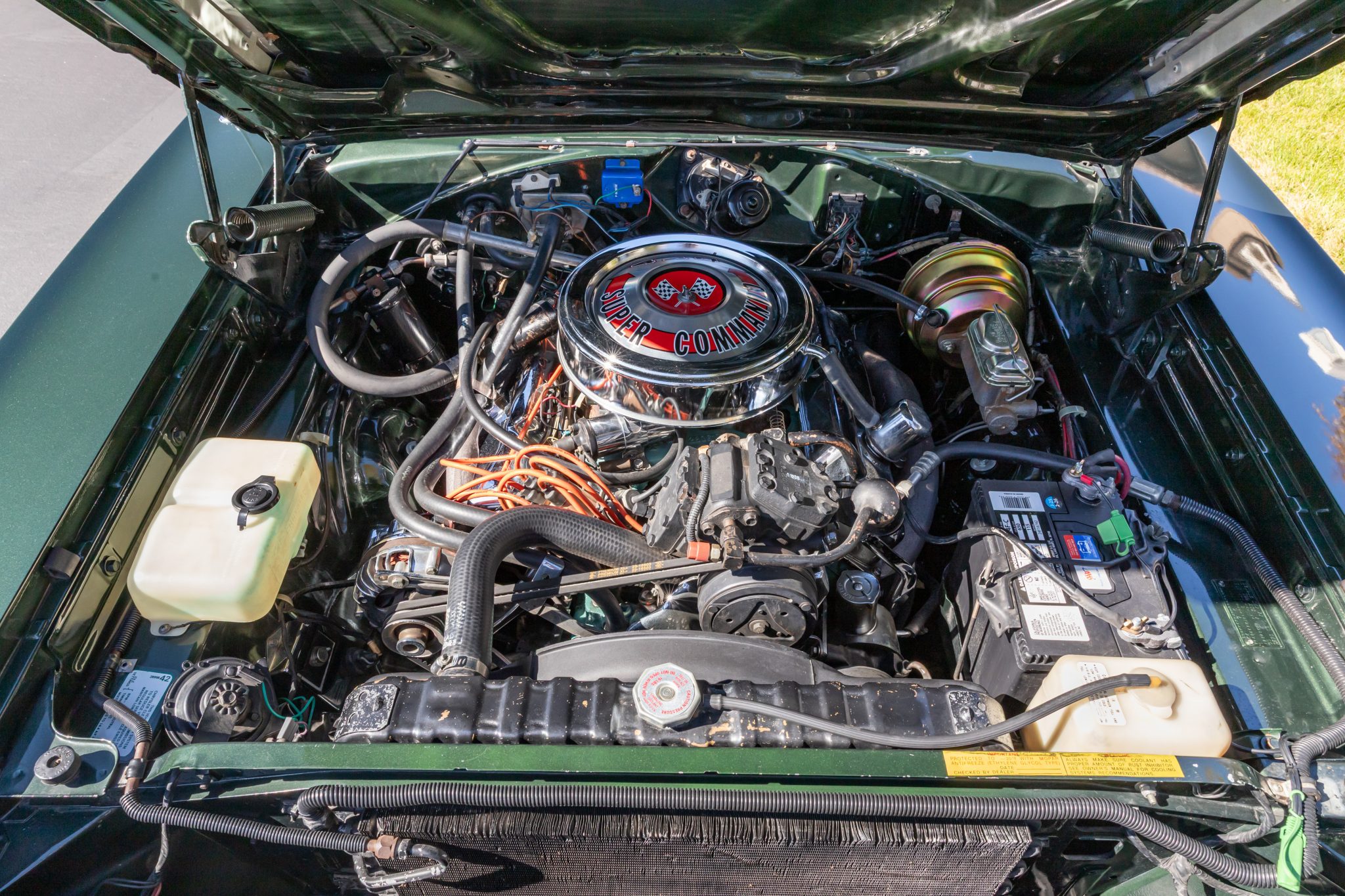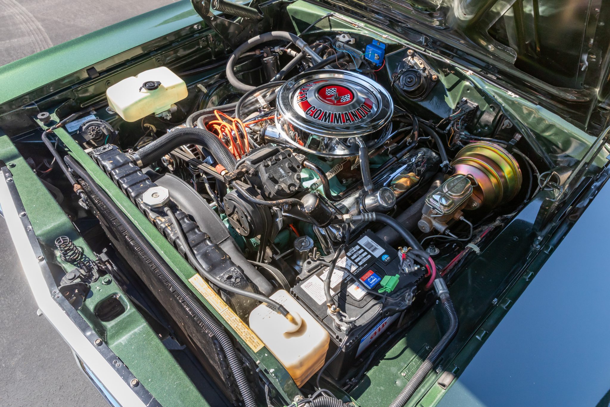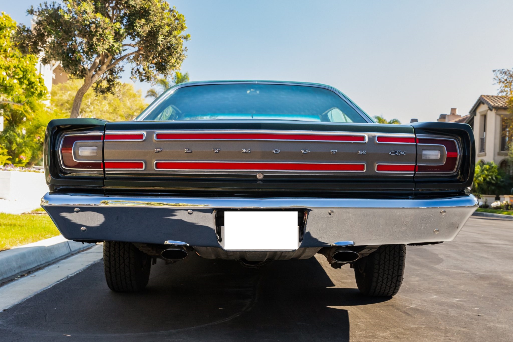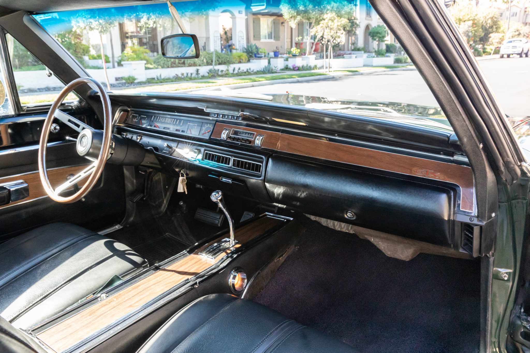 This 1968 Plymouth GTX hardtop was refurbished Powered by a 440ci V8 mated to a three-speed automatic transmission and a Sure-Grip differential, the car is finished in Forest Green with a green vinyl roof over black vinyl upholstery. Equipment includes white side stripes, 14″ chromed steel road wheels, red-line tires, power-assisted front disc brakes, power steering, woodgrain interior trim, air conditioning, front bucket seats, a center console, a tachometer, and an AM radio.
