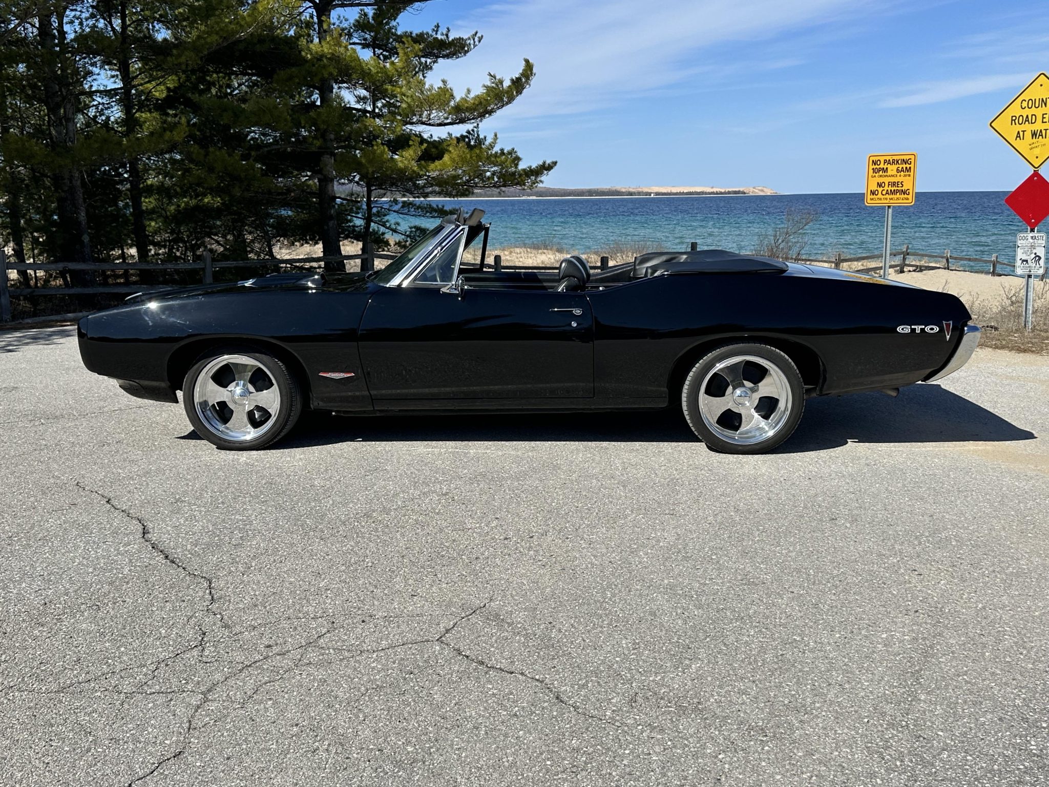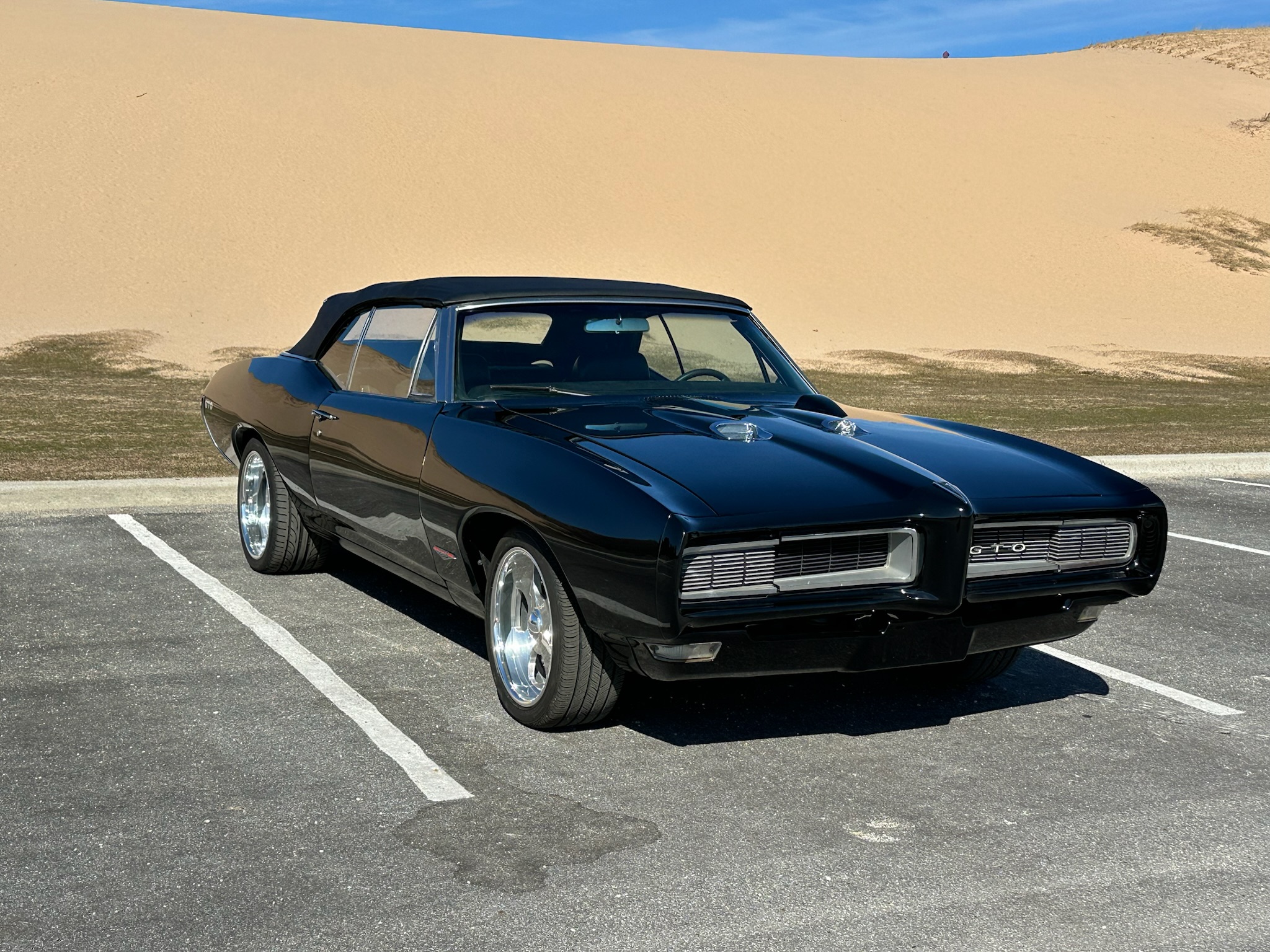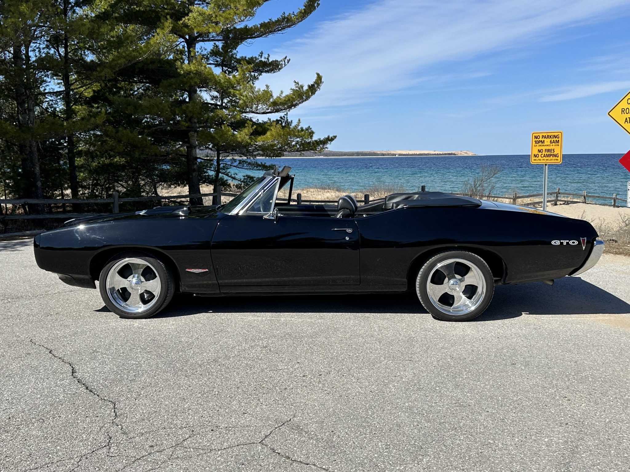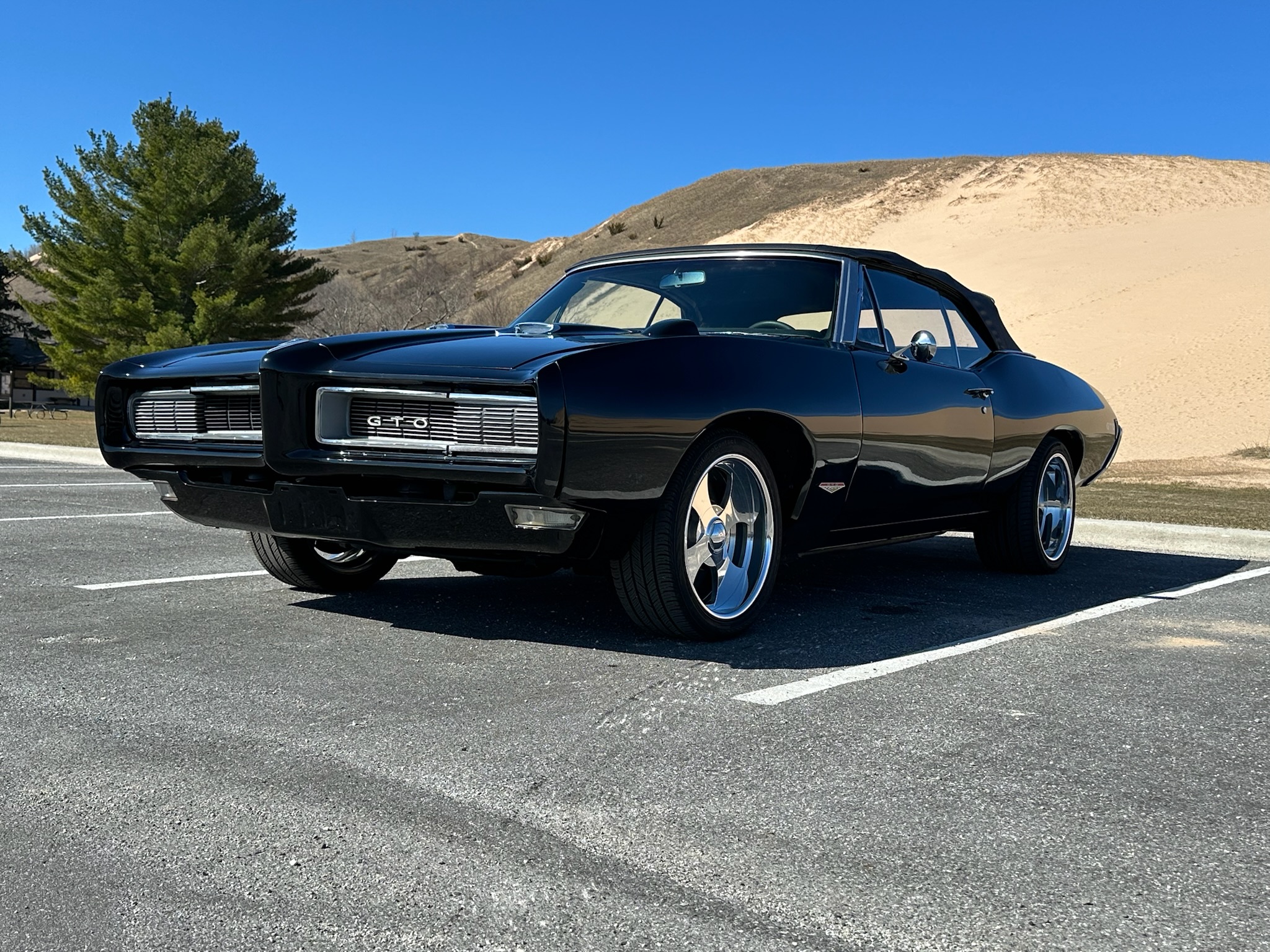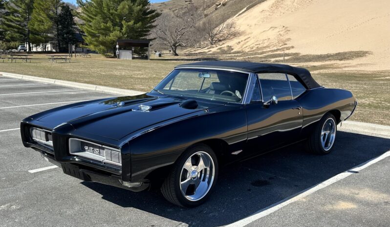 This 1968 Pontiac GTO convertible is a triple-black convertible and multiple refurbishments were completed over the last four decades. The replacement 400ci V8 is equipped with a Holley carburetor and an Edelbrock intake, and power is routed through a three-speed automatic transmission. Equipment includes 18″ Colorado Custom wheels, power steering, MSD ignition, long-tube headers, a twin-scoop hood, a black boot cover, and power-assisted drum brakes. The cabin is trimmed in black vinyl and features a Hurst shifter, a center console, carbon-look dashboard trim, and a Pioneer touchscreen receiver that has digital instrumentation capability.