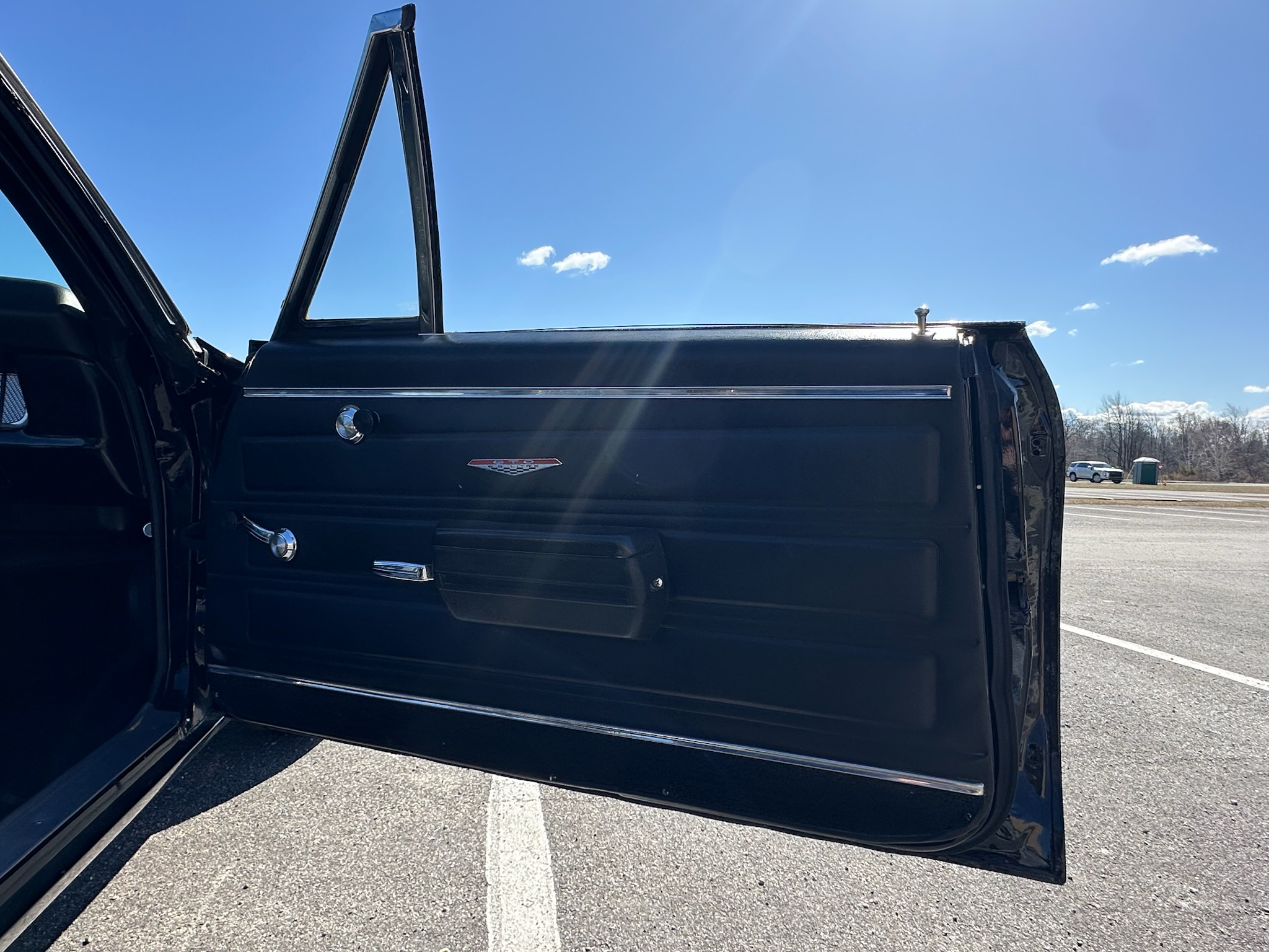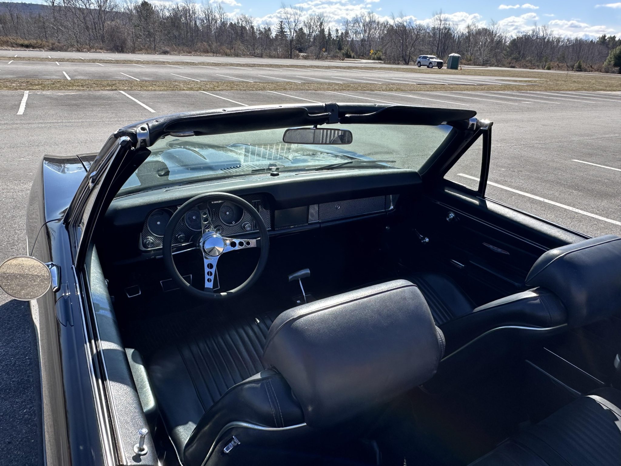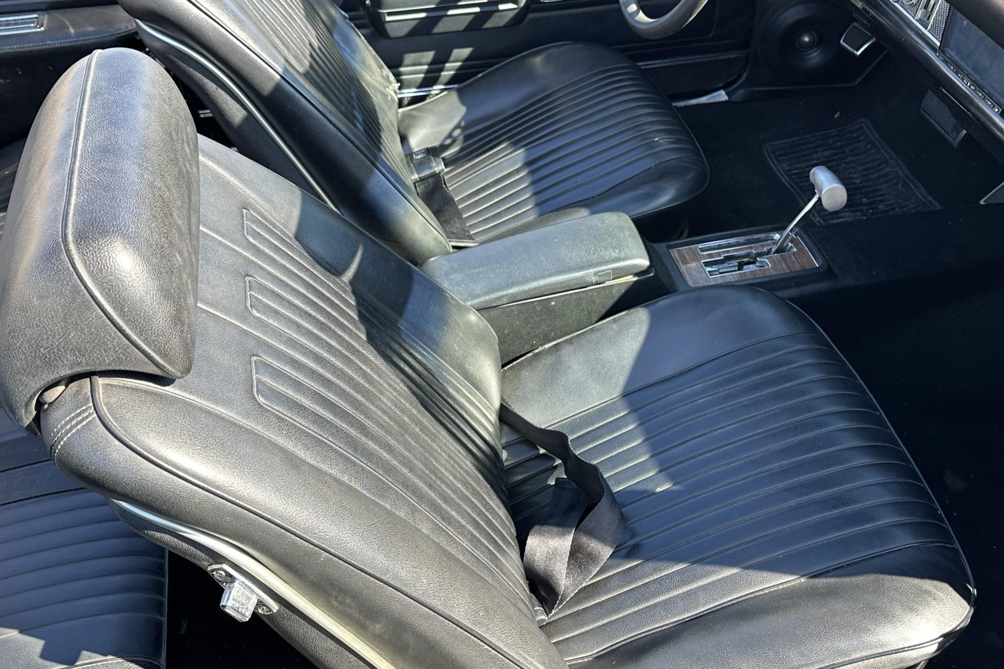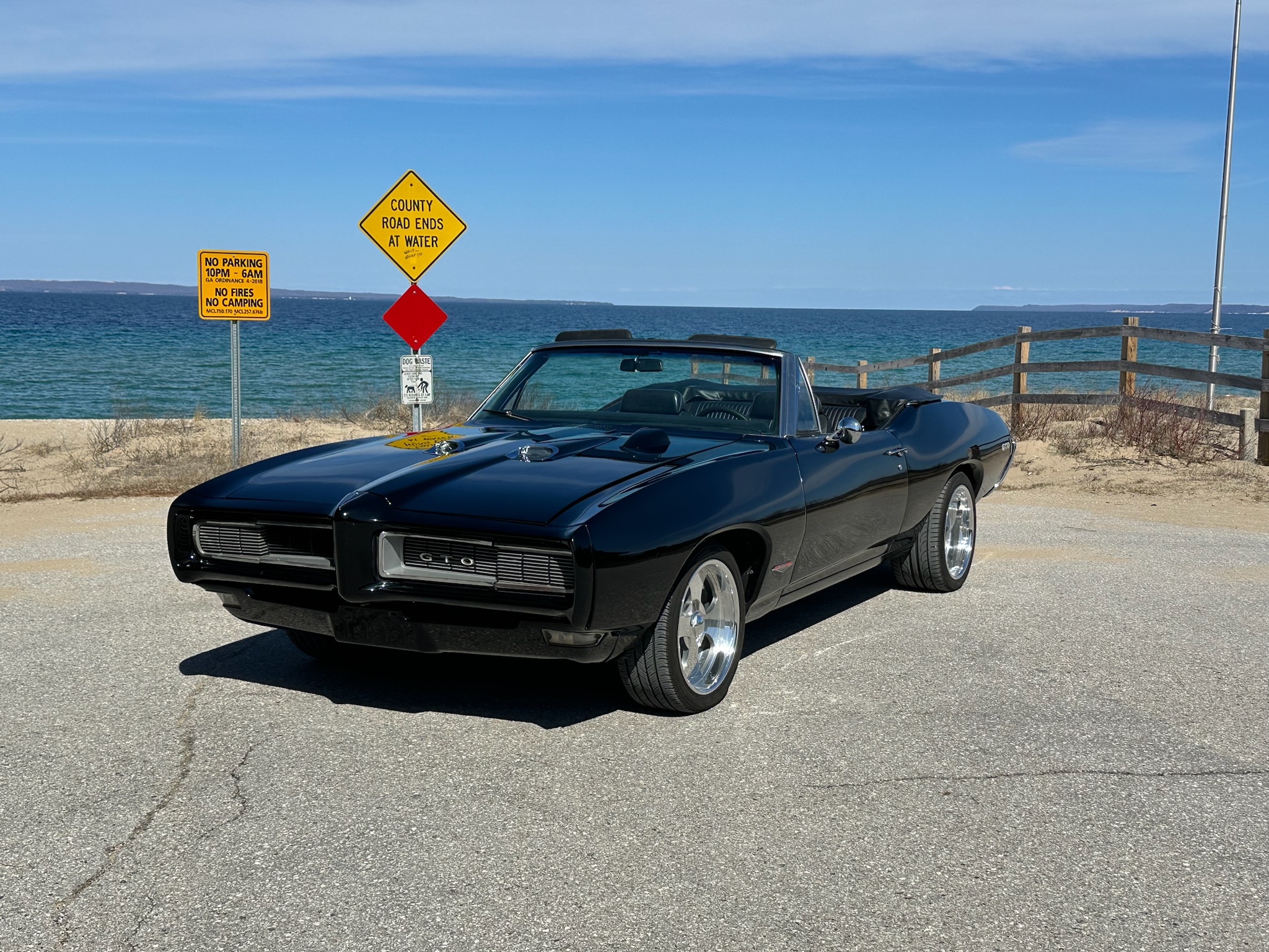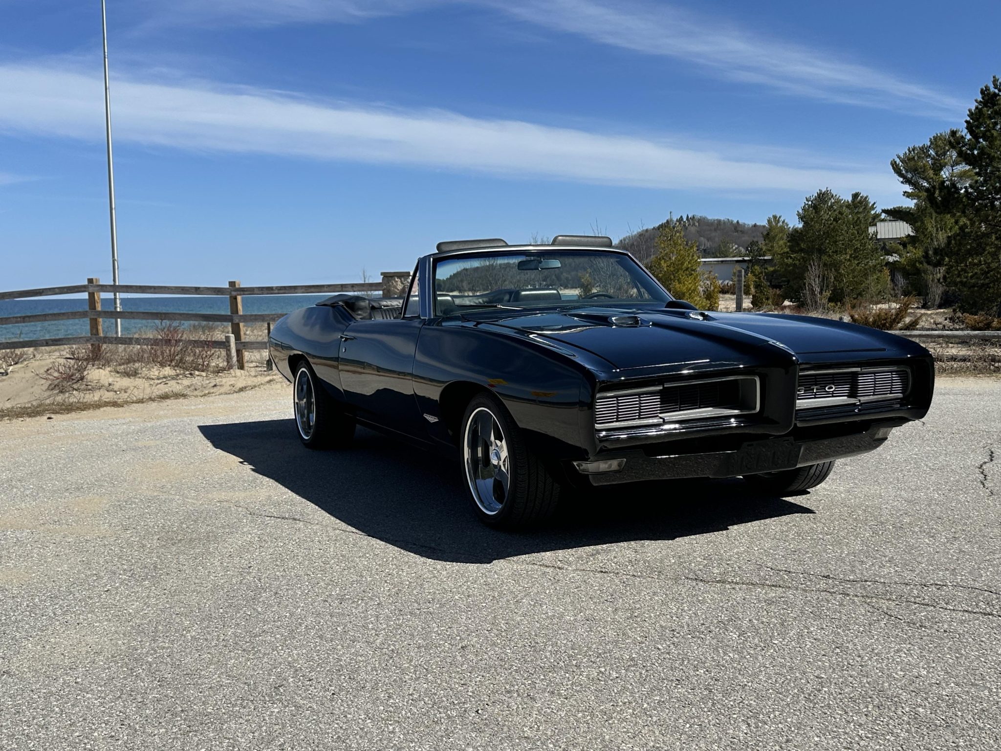 This 1968 Pontiac GTO convertible is a triple-black convertible and multiple refurbishments were completed over the last four decades. The replacement 400ci V8 is equipped with a Holley carburetor and an Edelbrock intake, and power is routed through a three-speed automatic transmission. Equipment includes 18″ Colorado Custom wheels, power steering, MSD ignition, long-tube headers, a twin-scoop hood, a black boot cover, and power-assisted drum brakes. The cabin is trimmed in black vinyl and features a Hurst shifter, a center console, carbon-look dashboard trim, and a Pioneer touchscreen receiver that has digital instrumentation capability.