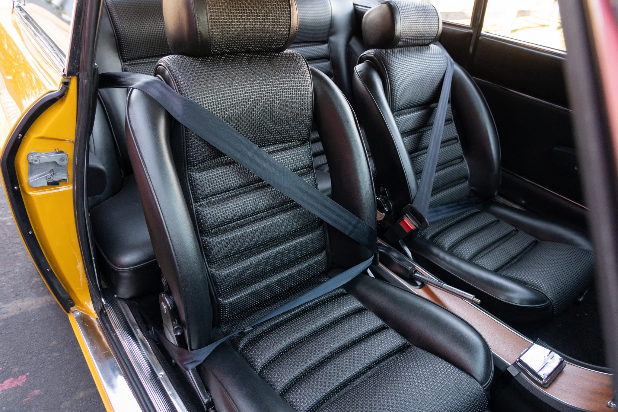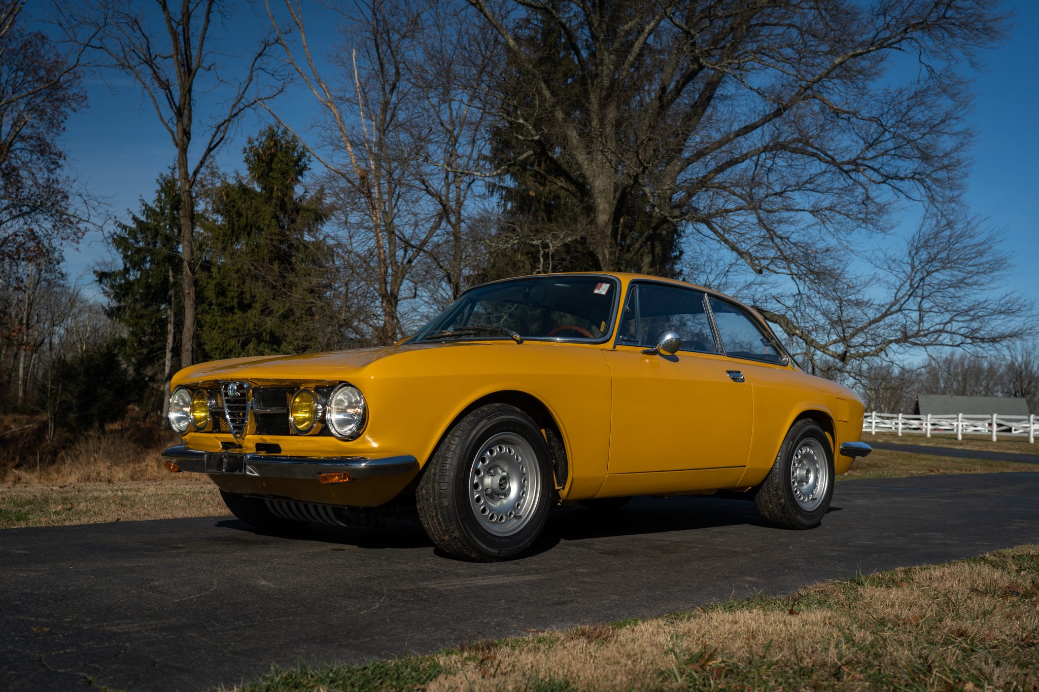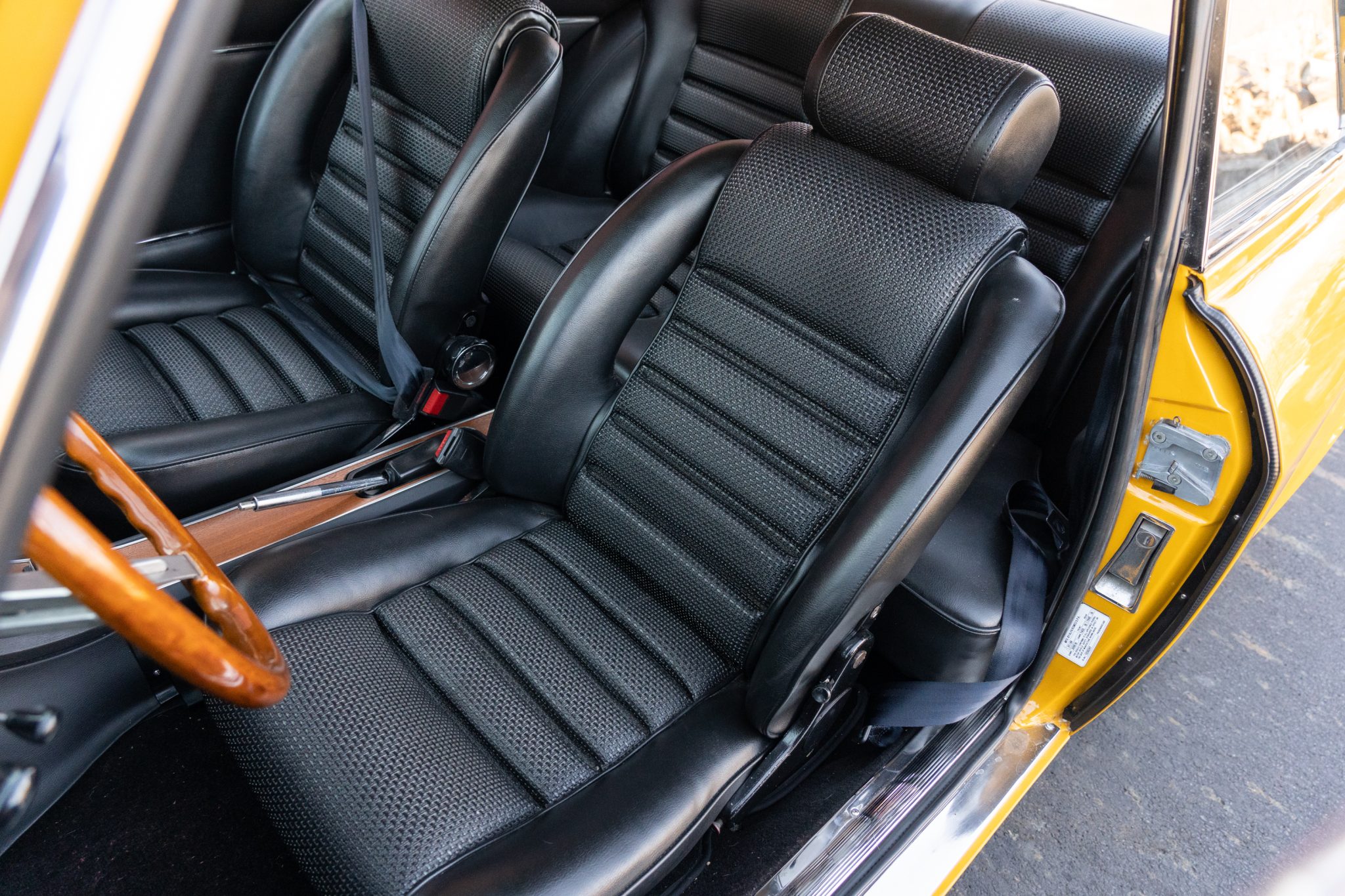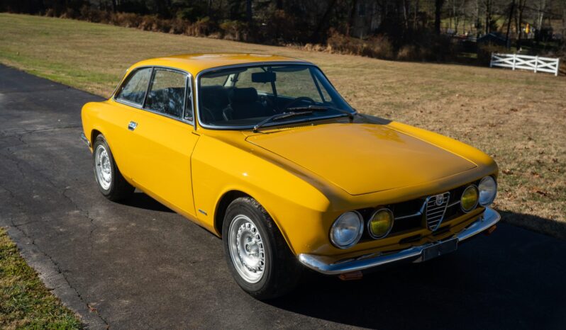 This 1969 Alfa Romeo GTV 1750 is finished in yellow over black upholstery and is powered by a 1,779cc twin-cam inline-four paired with a five-speed manual transmission. Equipment includes dual Weber carburetors, 14″ GTA-style wheels, “flying buttress” front seats, and Koni shocks paired with aftermarket springs. Updates performed during prior ownership included a repaint and partial interior refresh as well as rebuilds of engine and carburetors.