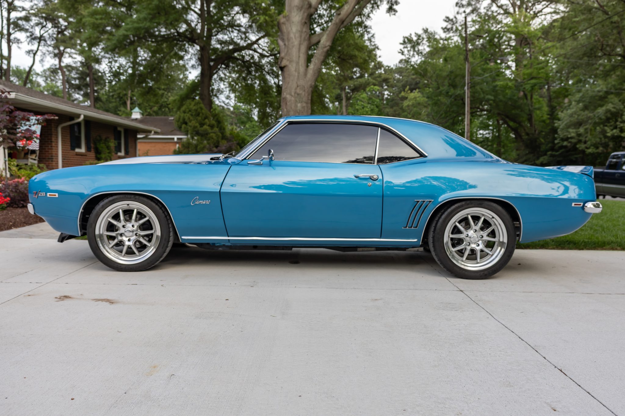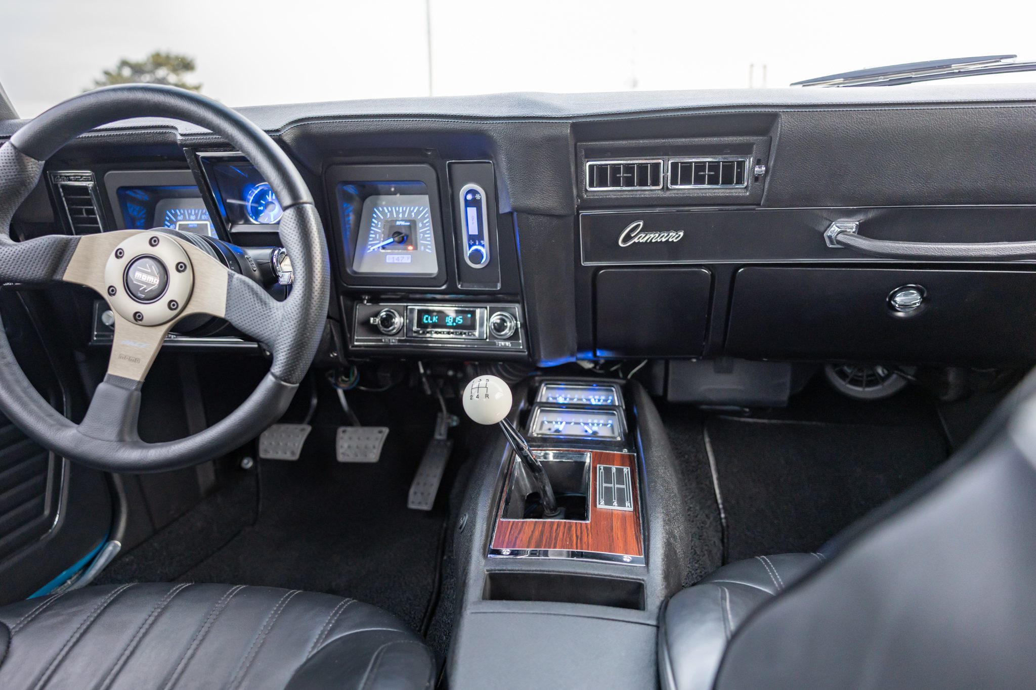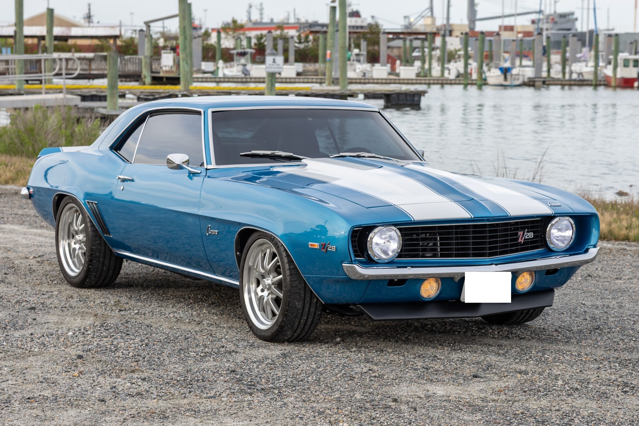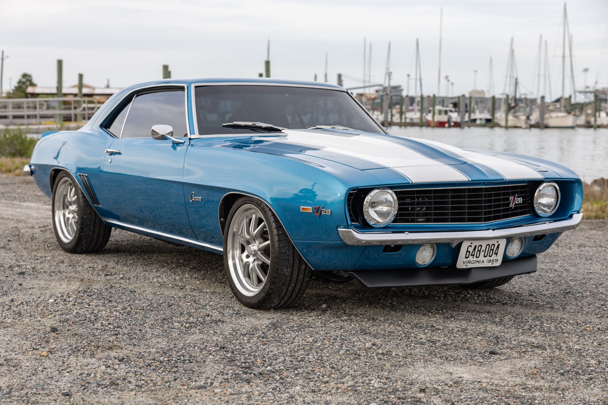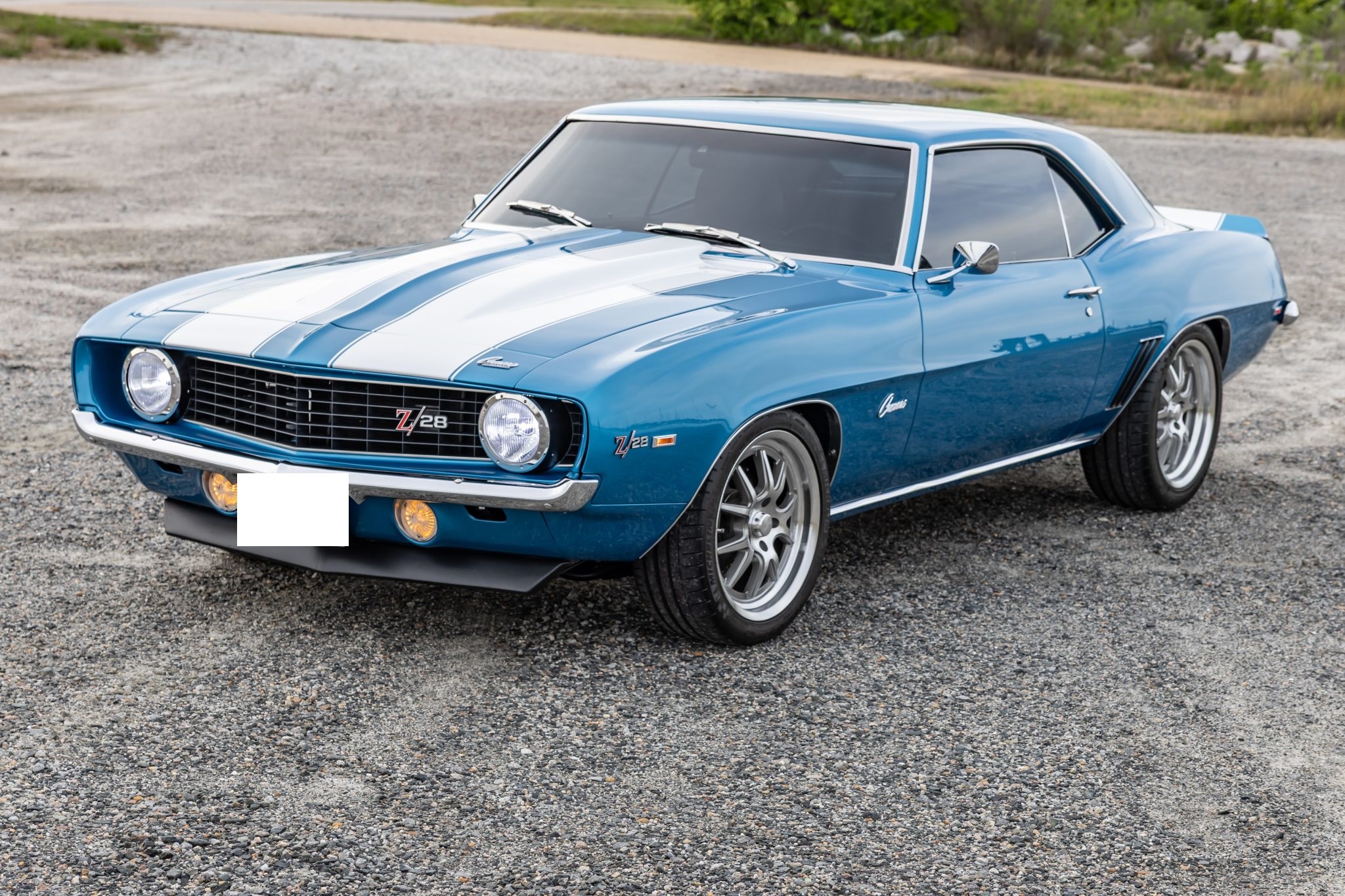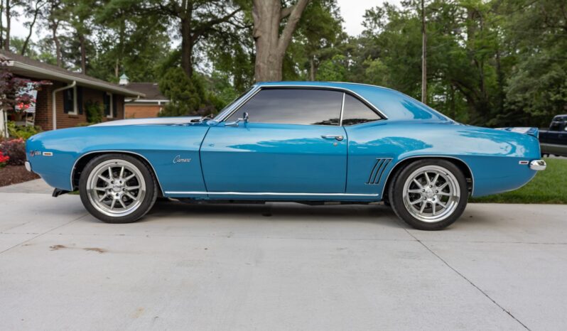 This 1969 Chevrolet Camaro coupe was refurbished and modified during a build completed in 2022 that included the installation of a 6.2-liter LS3 V8 linked to a Tremec five-speed manual transmission and a 10-bolt rear end with a limited-slip differential. The body was repaired and repainted in blue with white stripes, and the interior was re-trimmed using Procar front bucket seats upholstered in black vinyl. A Hotchkis TVS suspension package was fitted with tubular control arms, front and rear sway bars, adjustable shocks, and subframe connectors, while drilled and slotted disc brakes were also installed with a Wilwood master cylinder.