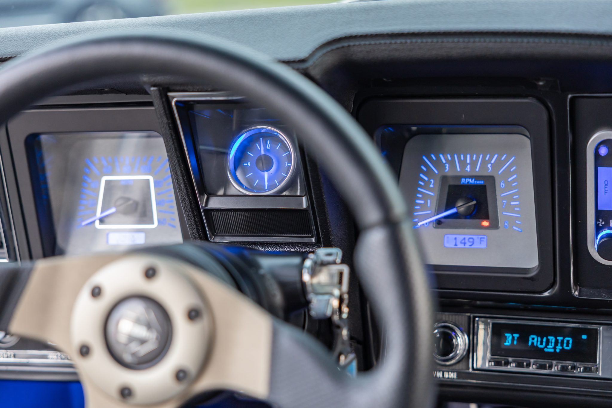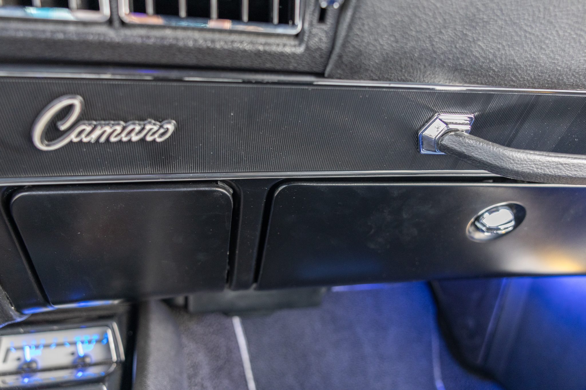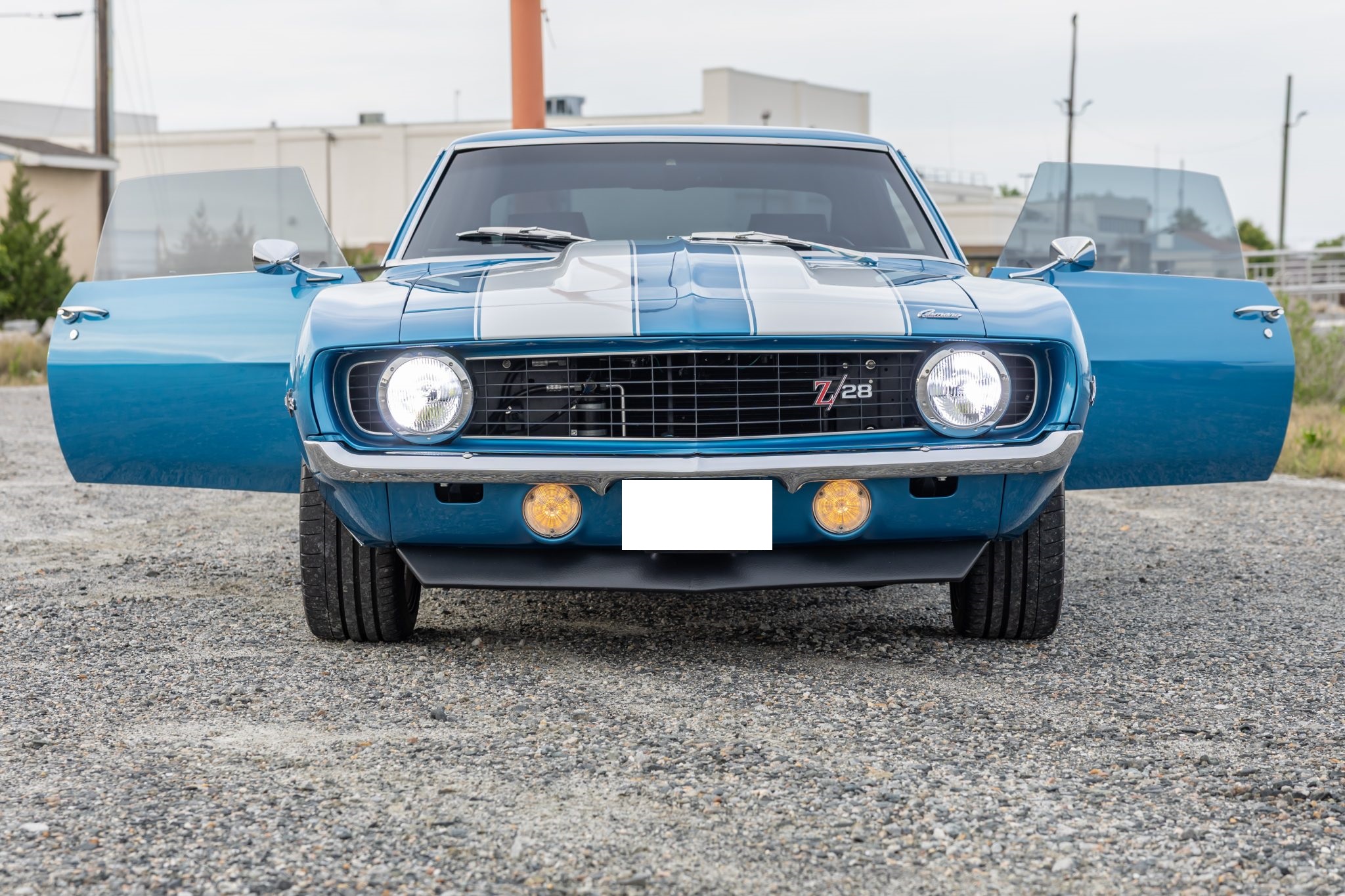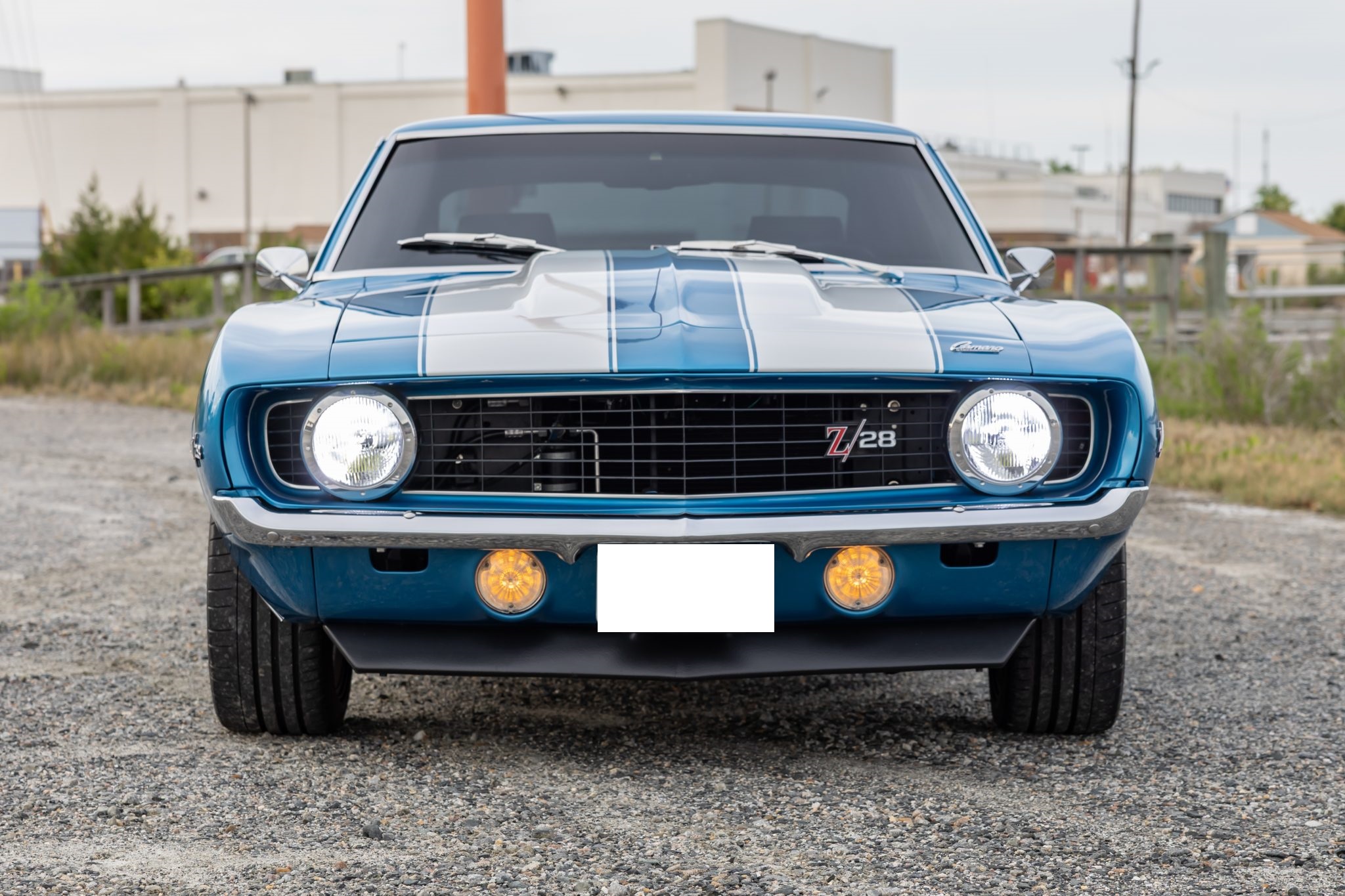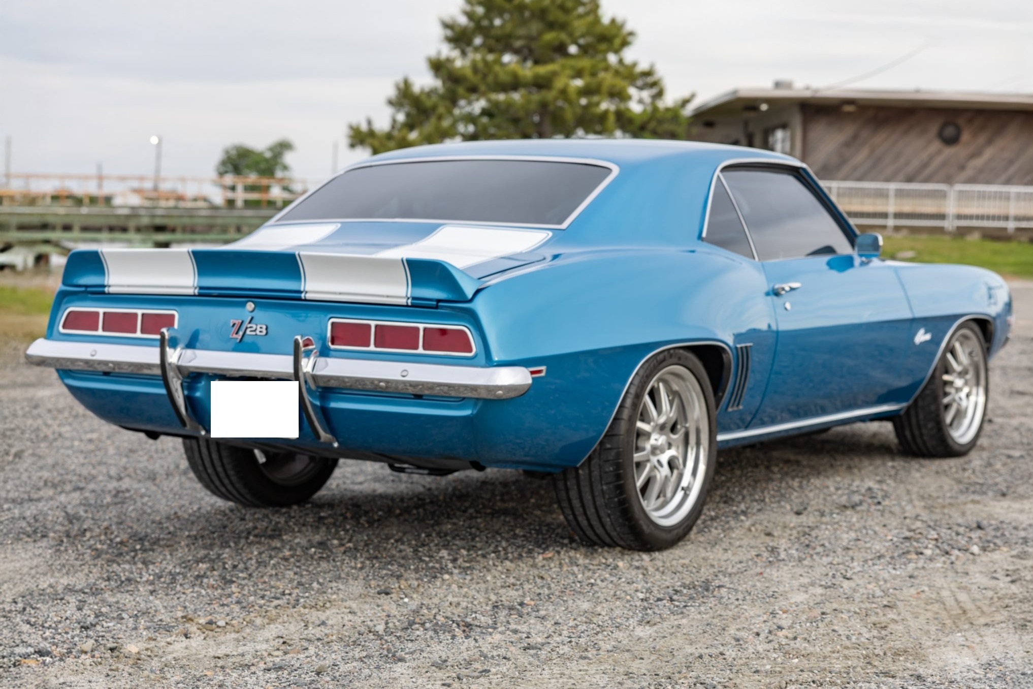 This 1969 Chevrolet Camaro coupe was refurbished and modified during a build completed in 2022 that included the installation of a 6.2-liter LS3 V8 linked to a Tremec five-speed manual transmission and a 10-bolt rear end with a limited-slip differential. The body was repaired and repainted in blue with white stripes, and the interior was re-trimmed using Procar front bucket seats upholstered in black vinyl. A Hotchkis TVS suspension package was fitted with tubular control arms, front and rear sway bars, adjustable shocks, and subframe connectors, while drilled and slotted disc brakes were also installed with a Wilwood master cylinder.