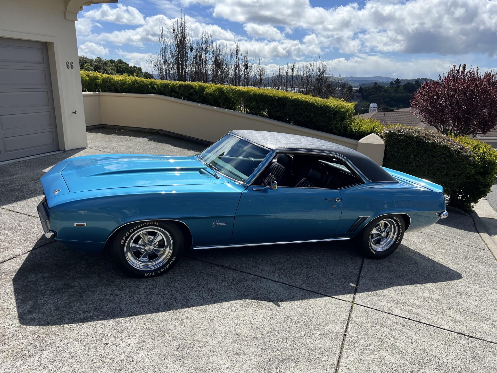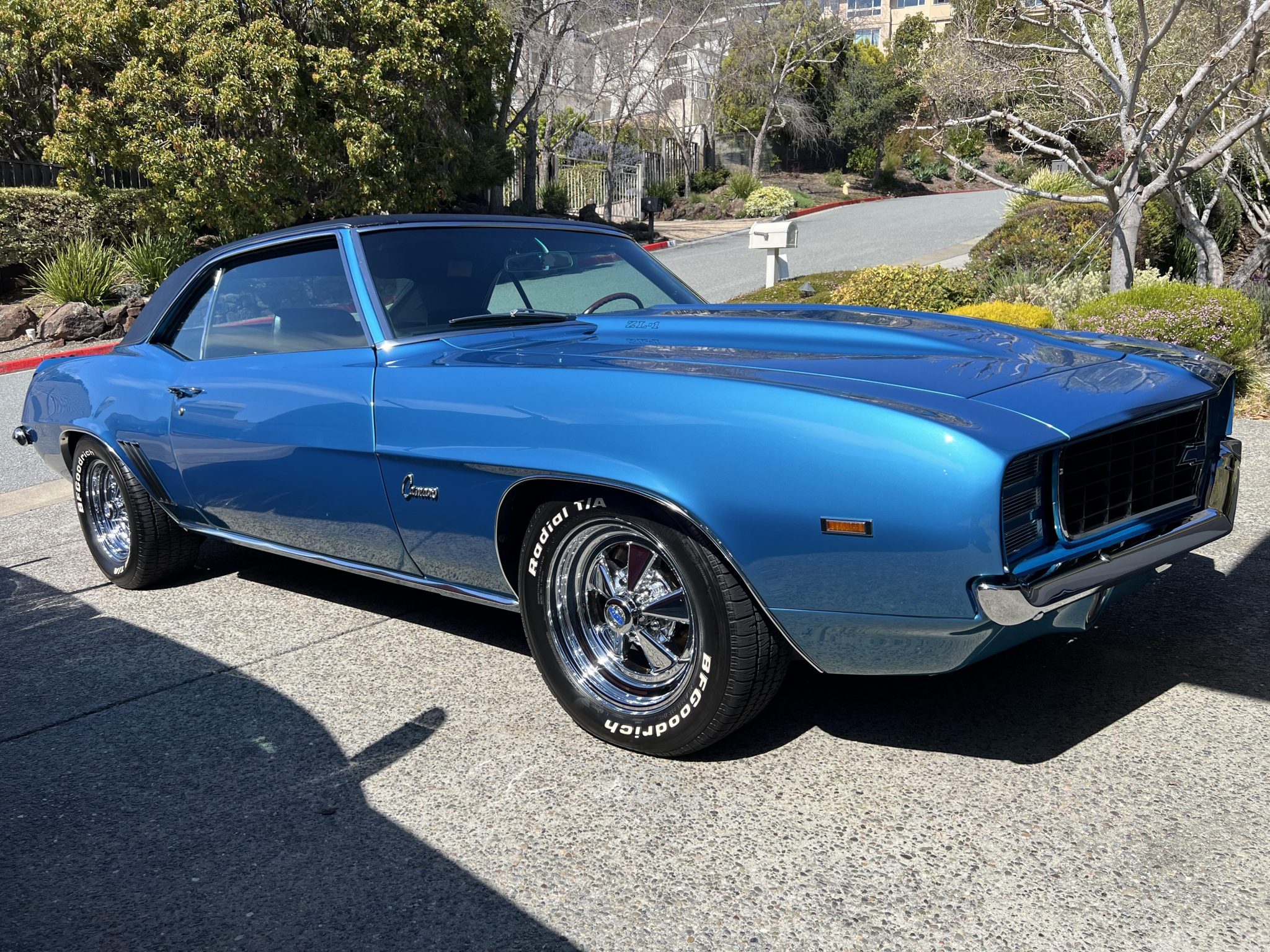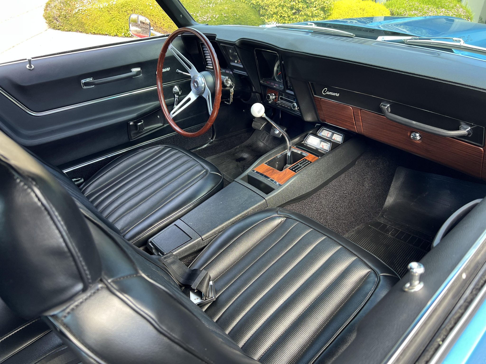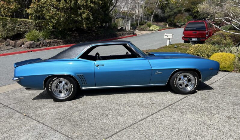 This 1969 Chevrolet Camaro coupe was refurbished and modified with focus on a ZL-1-style theme over a three-year period Work involved the installation of an aluminum 427ci V8 along with a Tremec five-speed manual transmission and a Positraction differential. The car was refinished in blue with a black vinyl roof over a black vinyl interior, and it was fitted with a cowl induction hood, a rear spoiler, ZL-1 badging, a center console, and an aftermarket retro-style digital stereo unit. Additional equipment includes aluminum GM Performance cylinder heads, a tilting steering column, a rear spoiler, retractable headlight covers, power-assisted front disc brakes, 15″ Cragar S/S wheels, and a 12-bolt rear end with a limited-slip differential.