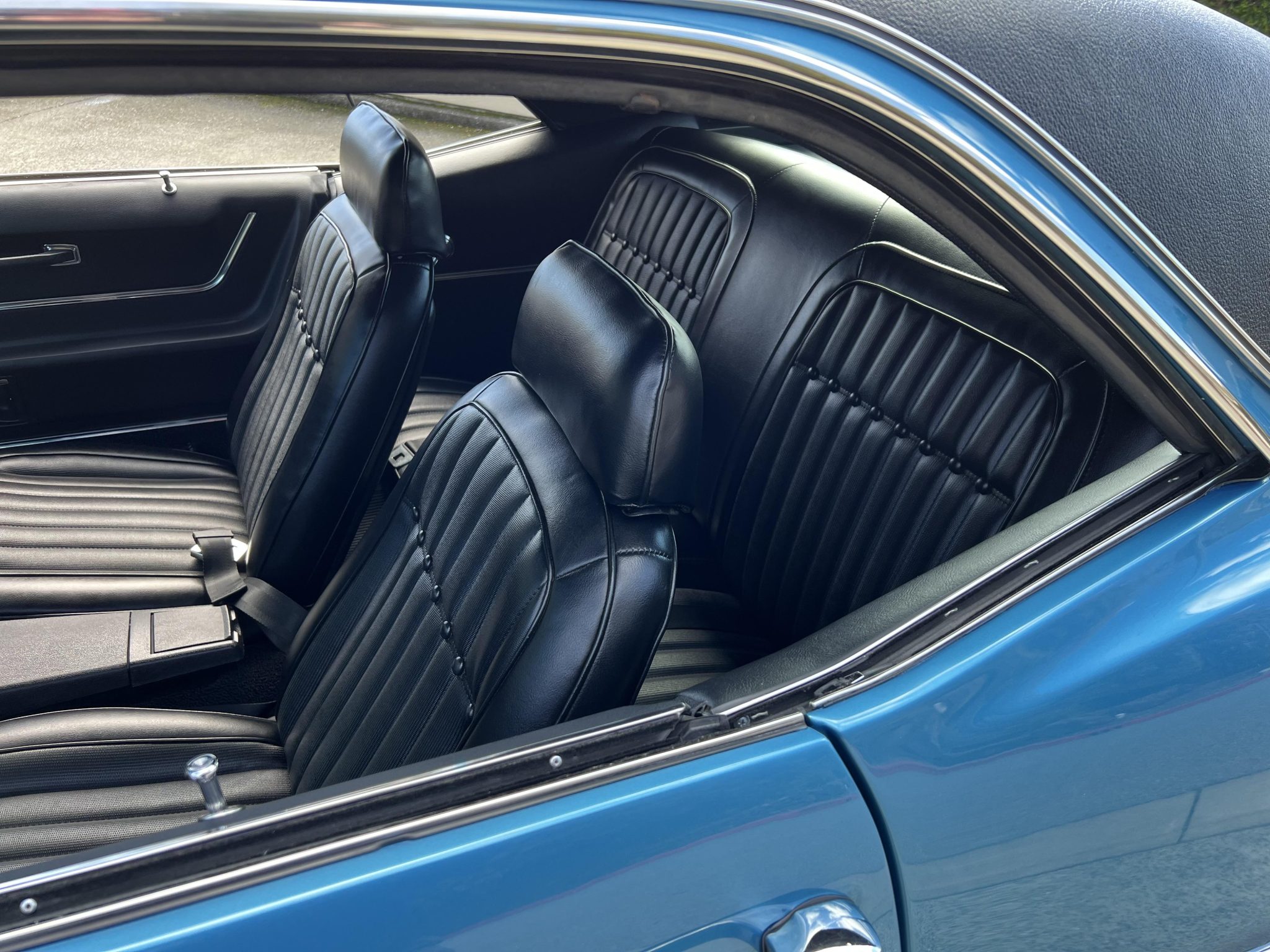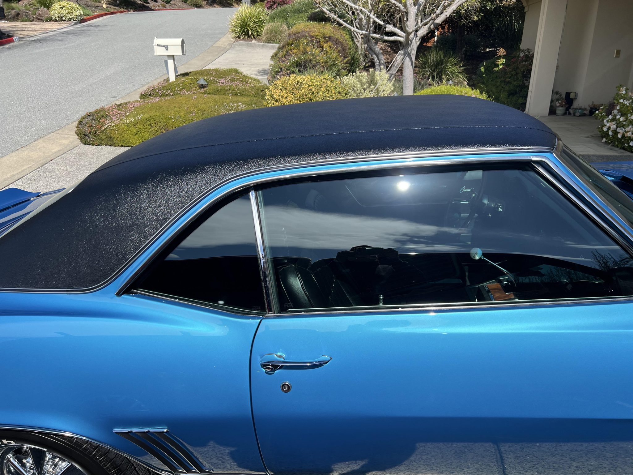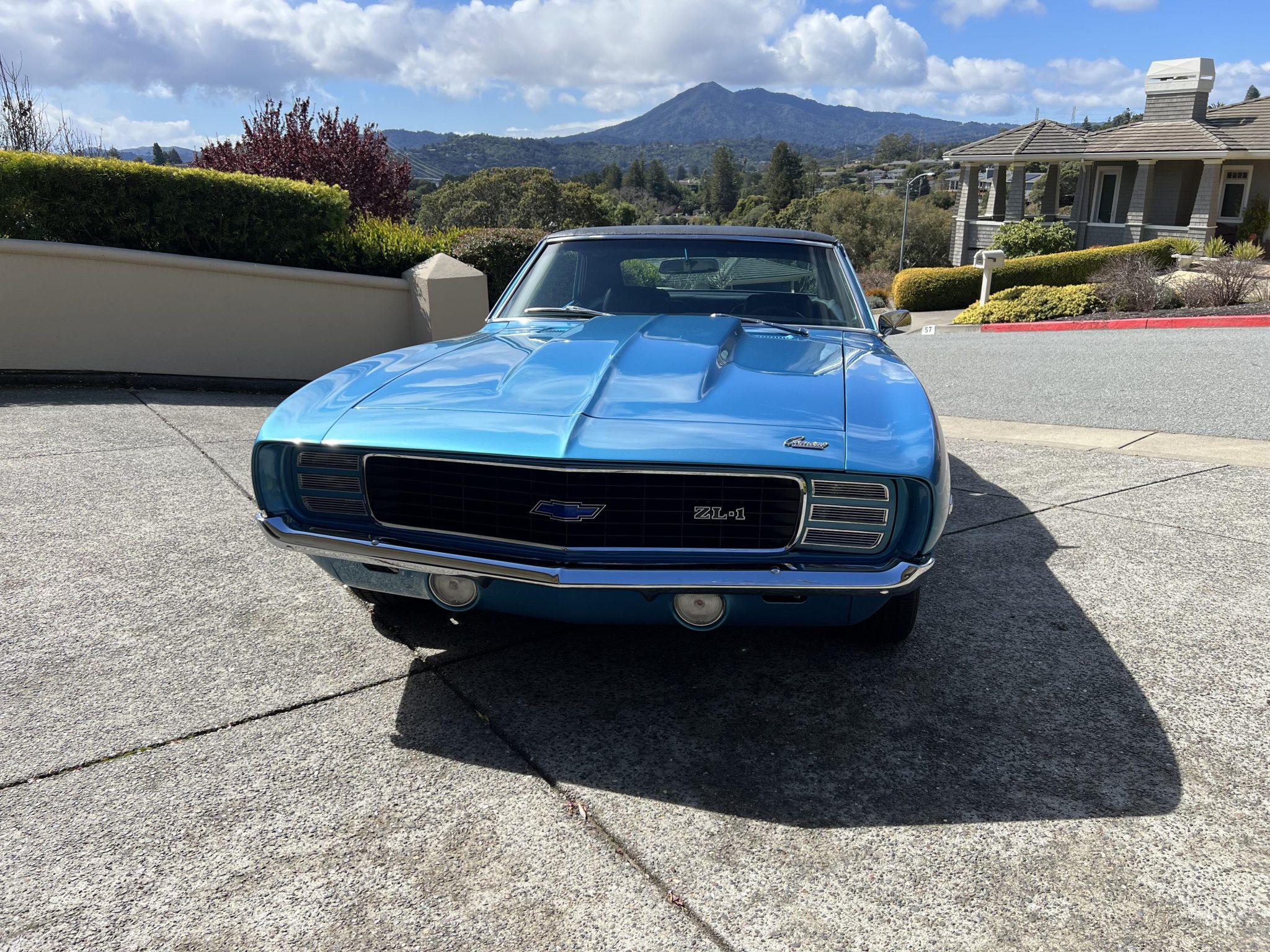 This 1969 Chevrolet Camaro coupe was refurbished and modified with focus on a ZL-1-style theme over a three-year period Work involved the installation of an aluminum 427ci V8 along with a Tremec five-speed manual transmission and a Positraction differential. The car was refinished in blue with a black vinyl roof over a black vinyl interior, and it was fitted with a cowl induction hood, a rear spoiler, ZL-1 badging, a center console, and an aftermarket retro-style digital stereo unit. Additional equipment includes aluminum GM Performance cylinder heads, a tilting steering column, a rear spoiler, retractable headlight covers, power-assisted front disc brakes, 15″ Cragar S/S wheels, and a 12-bolt rear end with a limited-slip differential.