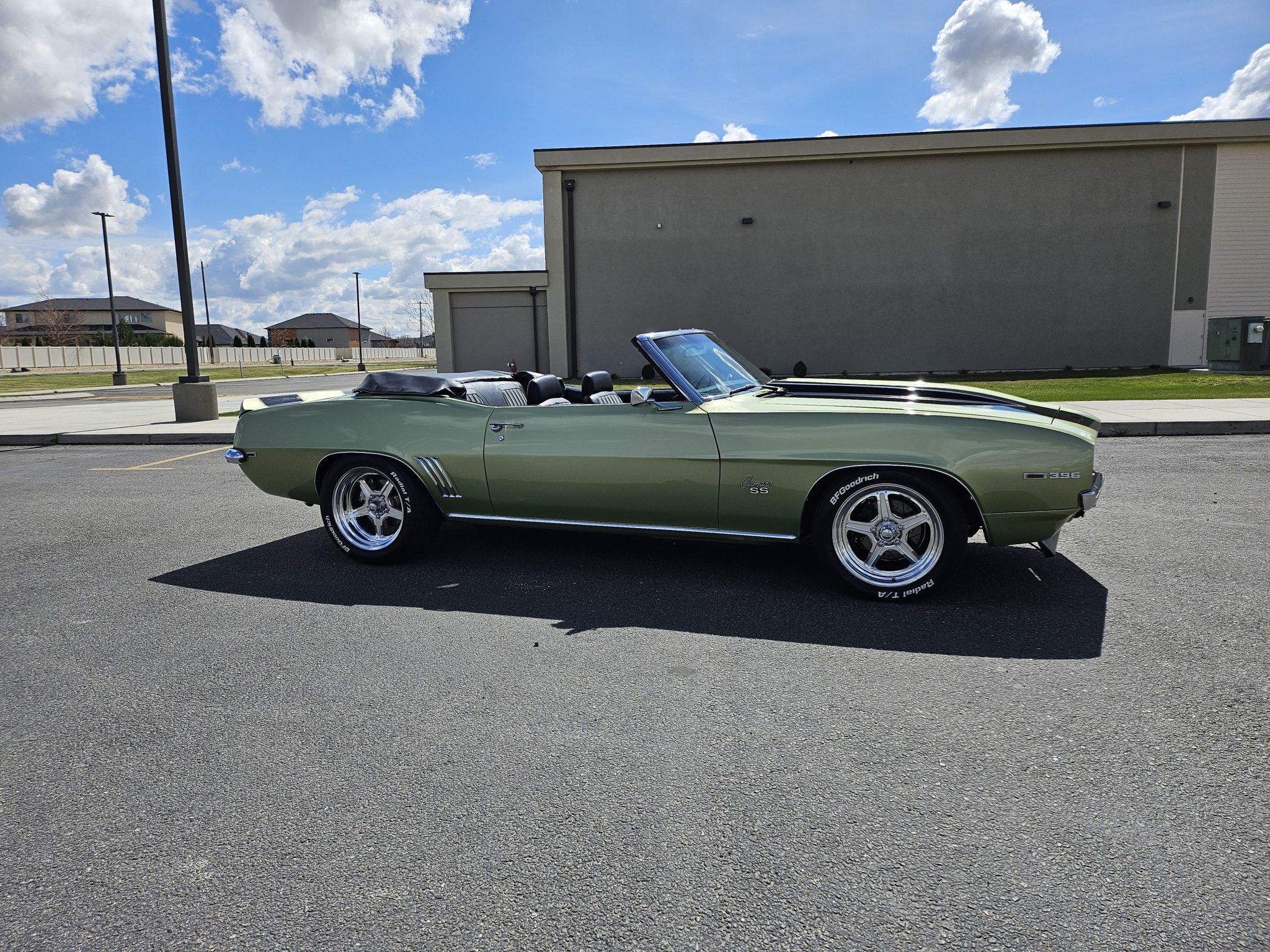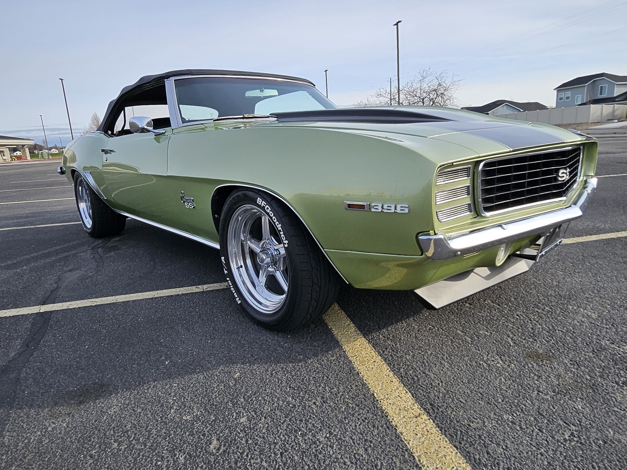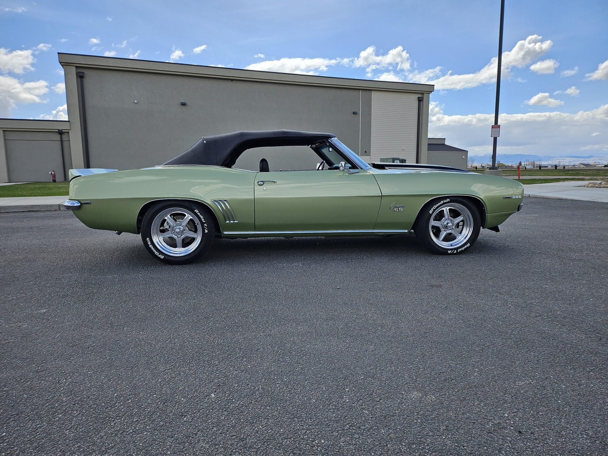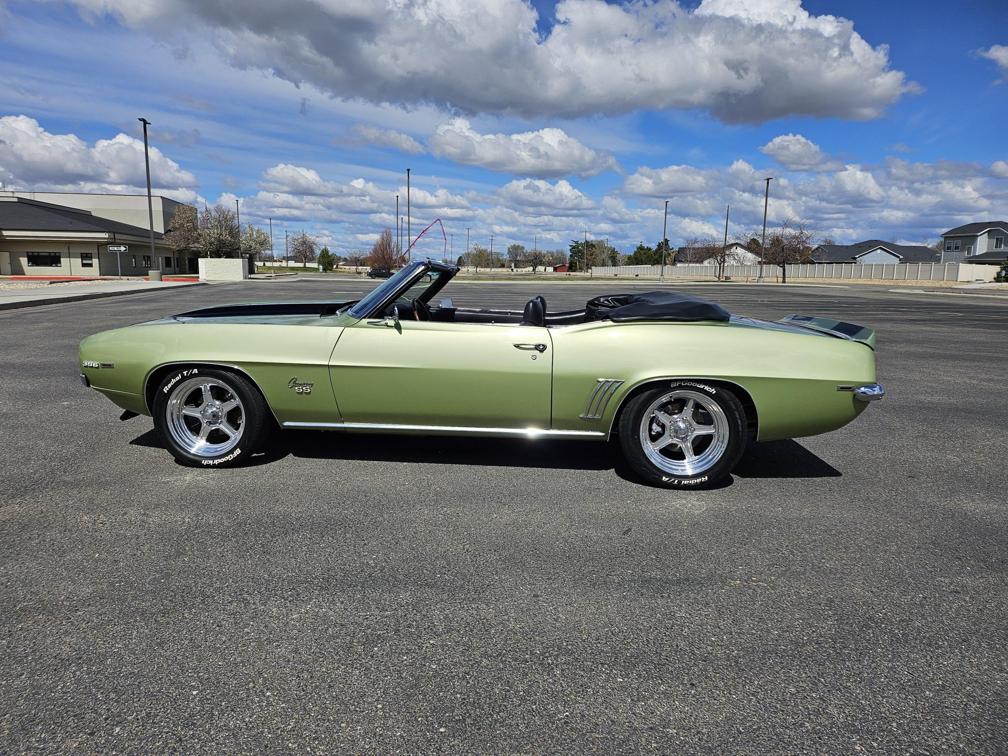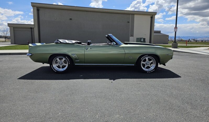 This 1969 Chevrolet Camaro convertible was repainted circa 1998 and underwent a refurbishment which included re-trimming the cabin in black vinyl. Exterior elements include a black soft top, front and rear spoilers, hideaway headlights, and SS badging, while the cabin appointments include a Hurst shifter, a woodgrain steering wheel, an AM/FM radio, and front bucket seats. The replacement 396ci V8 utilizes an Edelbrock intake and carburetor, while the car is further equipped with a four-speed manual transmission, a PosiTraction differential, long-tube headers, Billet Specialties wheels, four-wheel disc brakes, and a lowered suspension.