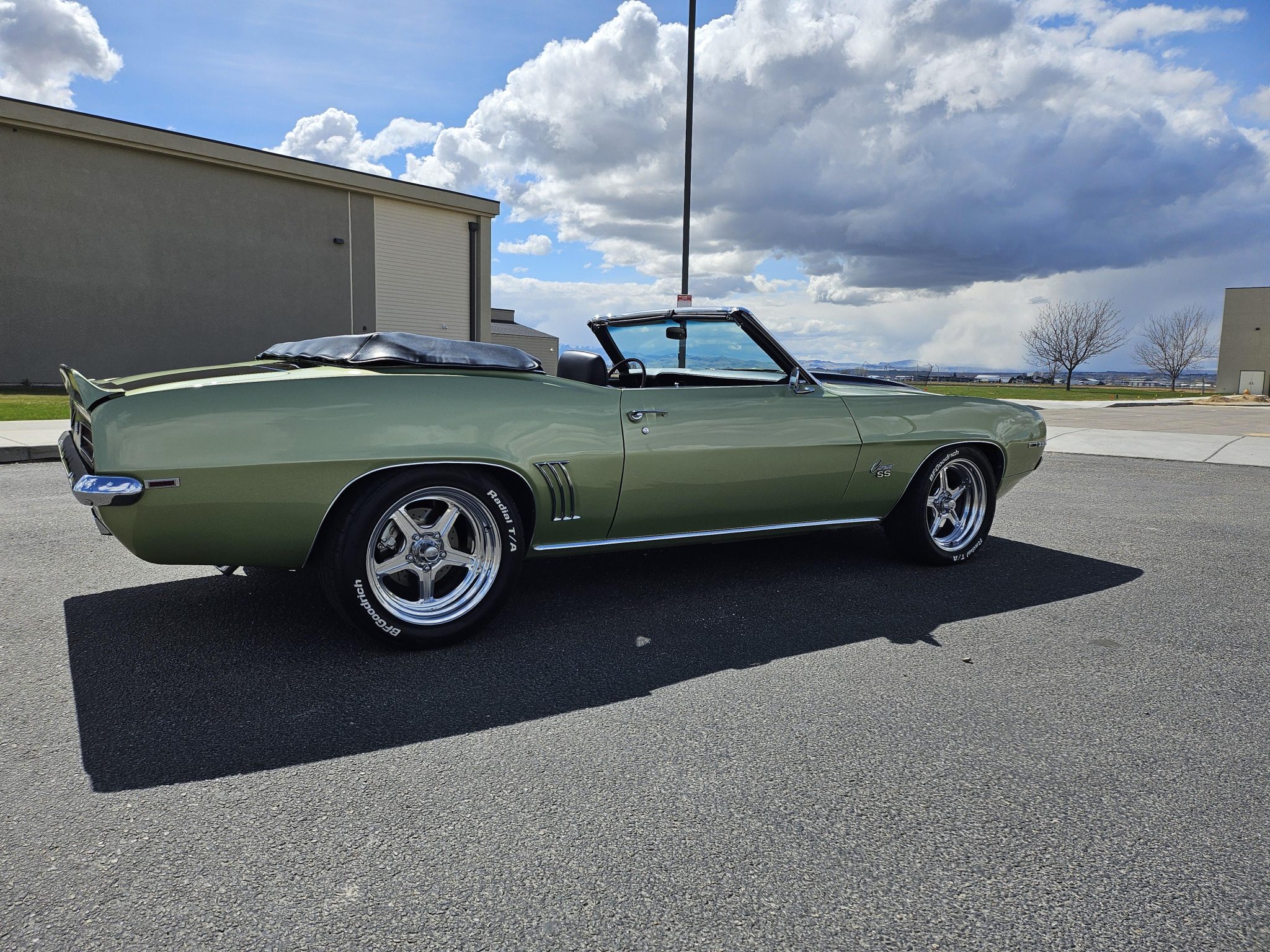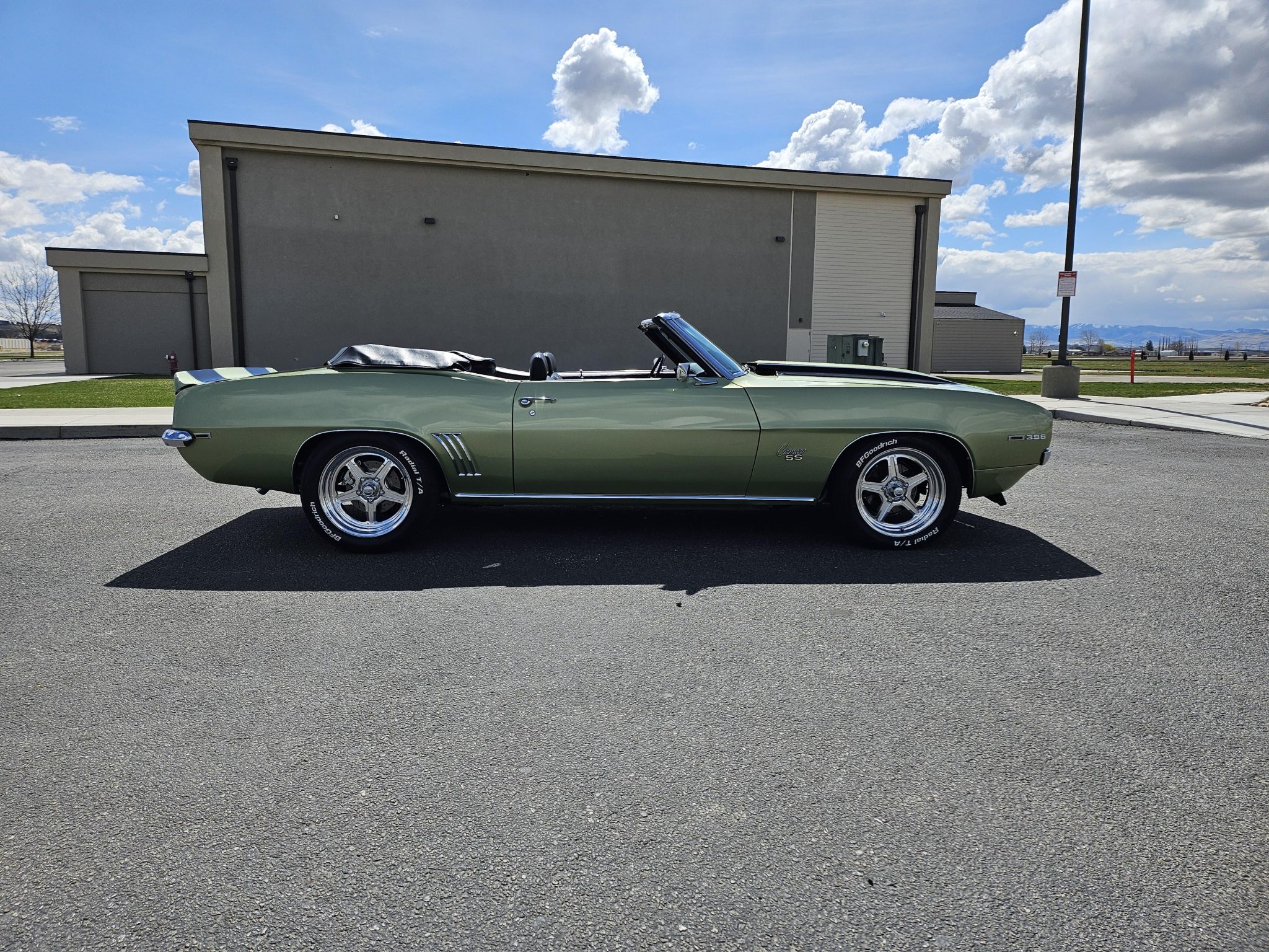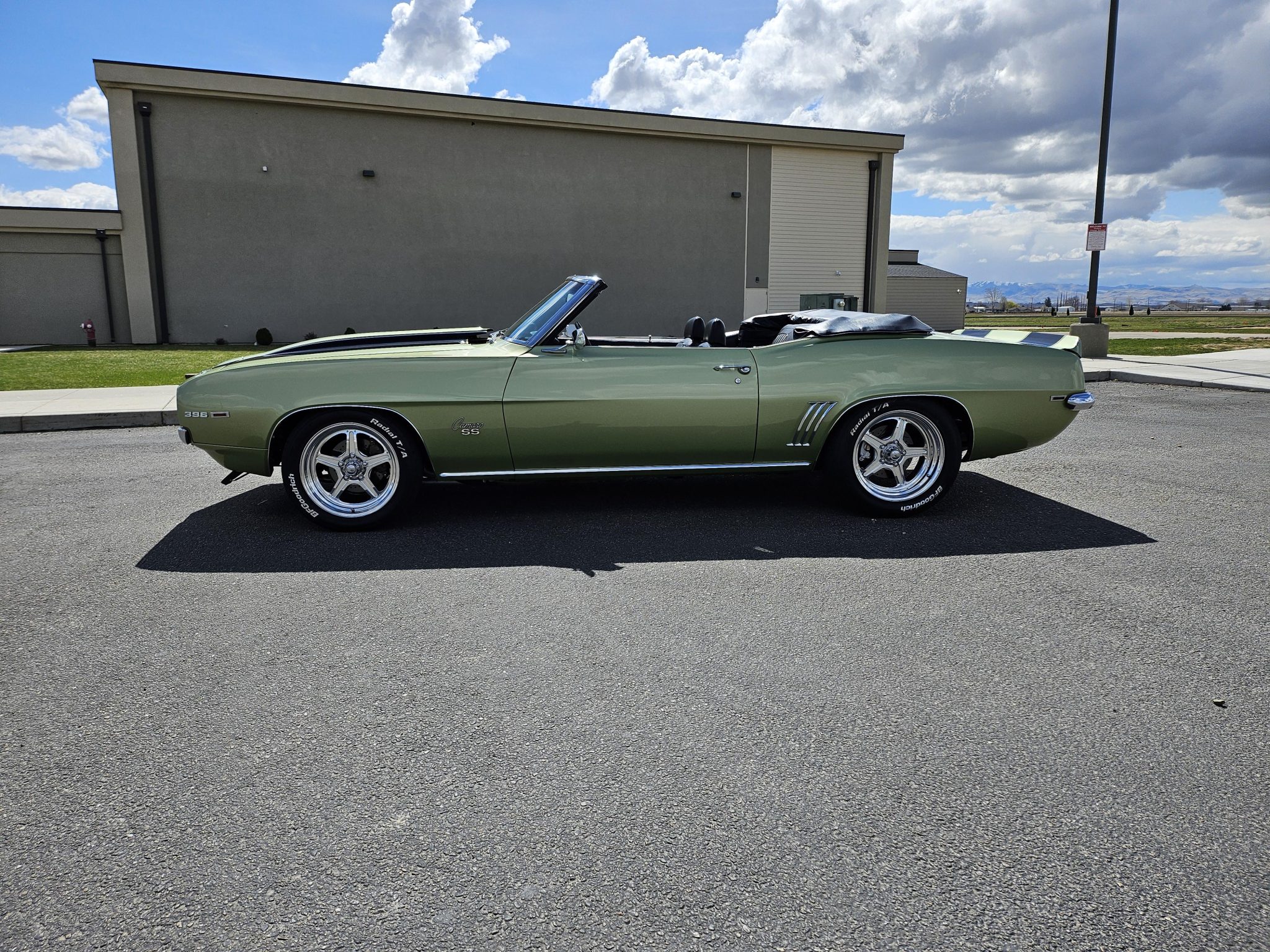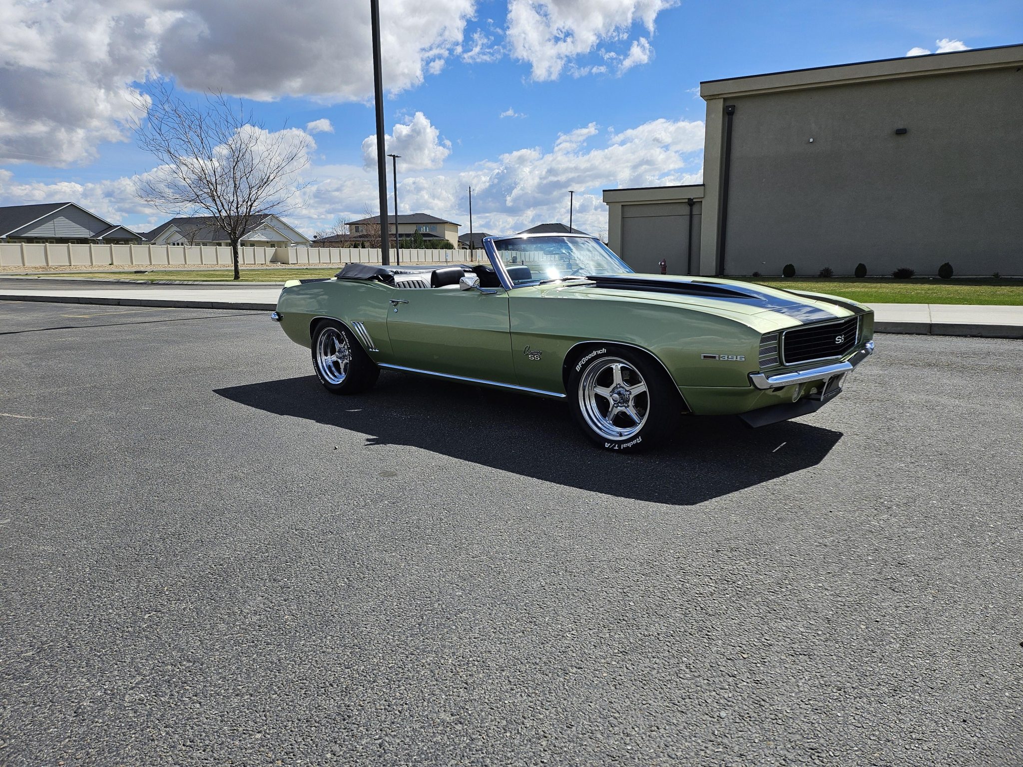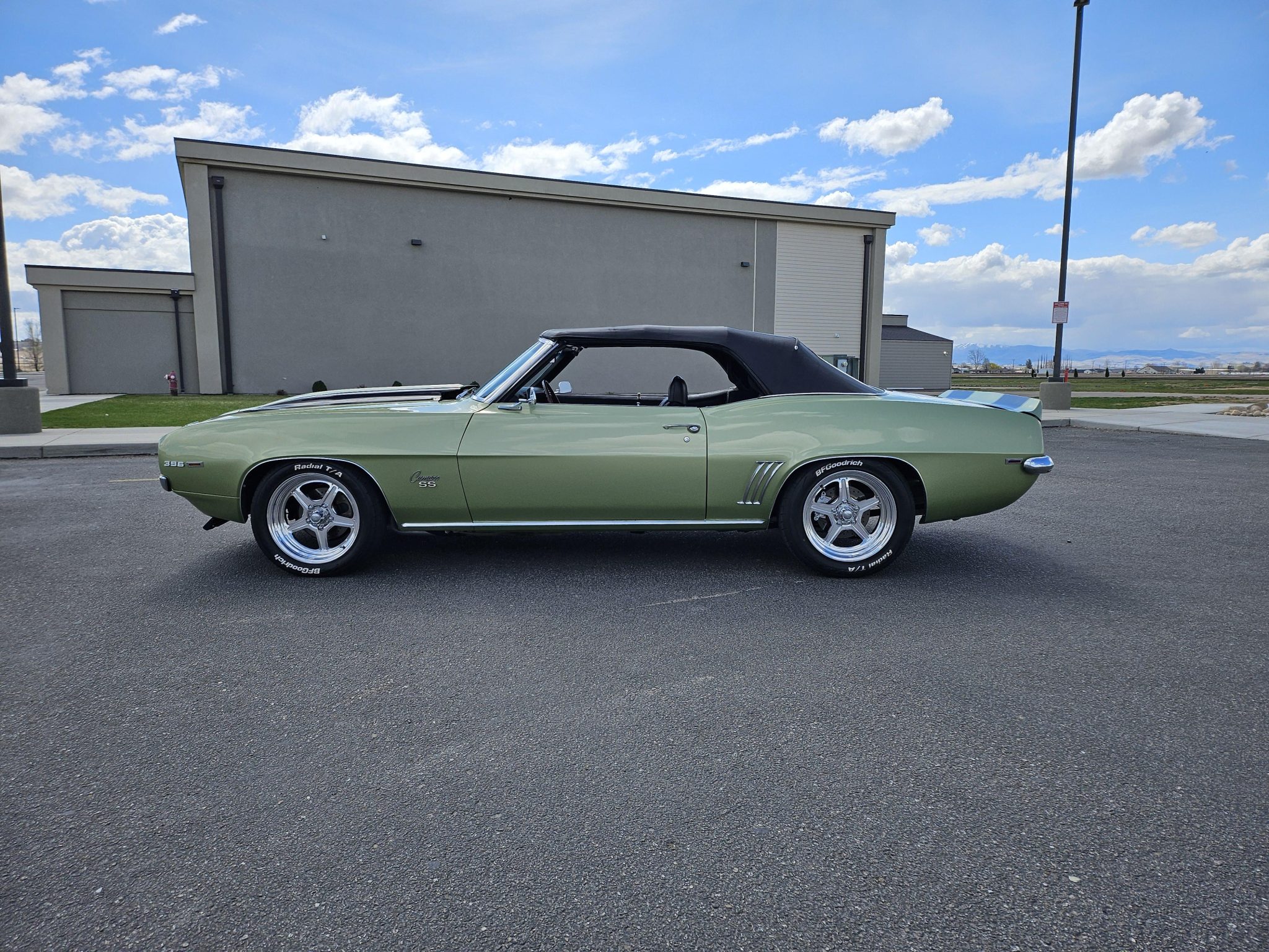 This 1969 Chevrolet Camaro convertible was repainted circa 1998 and underwent a refurbishment which included re-trimming the cabin in black vinyl. Exterior elements include a black soft top, front and rear spoilers, hideaway headlights, and SS badging, while the cabin appointments include a Hurst shifter, a woodgrain steering wheel, an AM/FM radio, and front bucket seats. The replacement 396ci V8 utilizes an Edelbrock intake and carburetor, while the car is further equipped with a four-speed manual transmission, a PosiTraction differential, long-tube headers, Billet Specialties wheels, four-wheel disc brakes, and a lowered suspension.