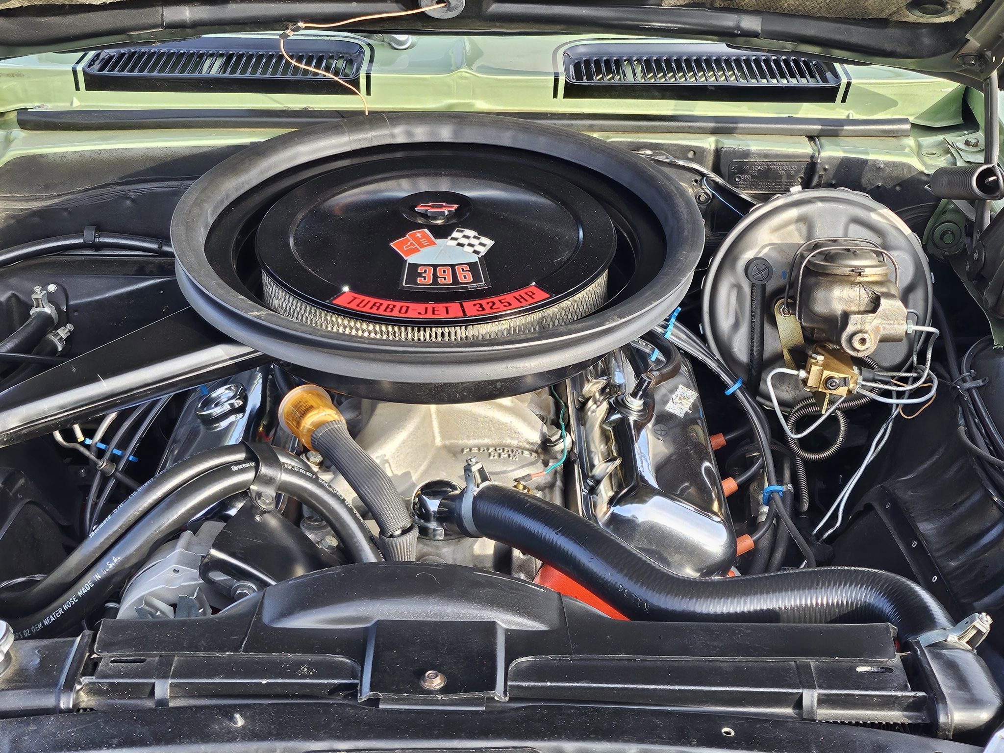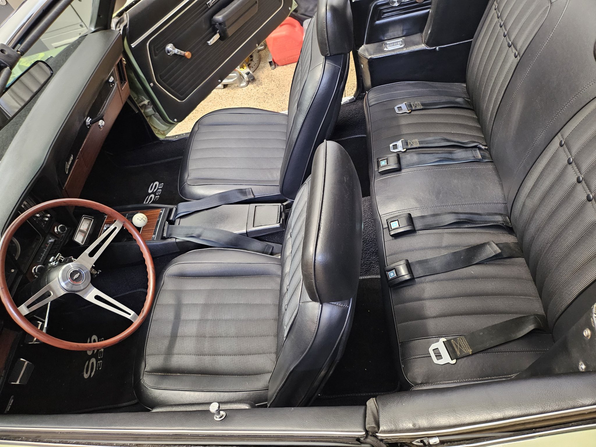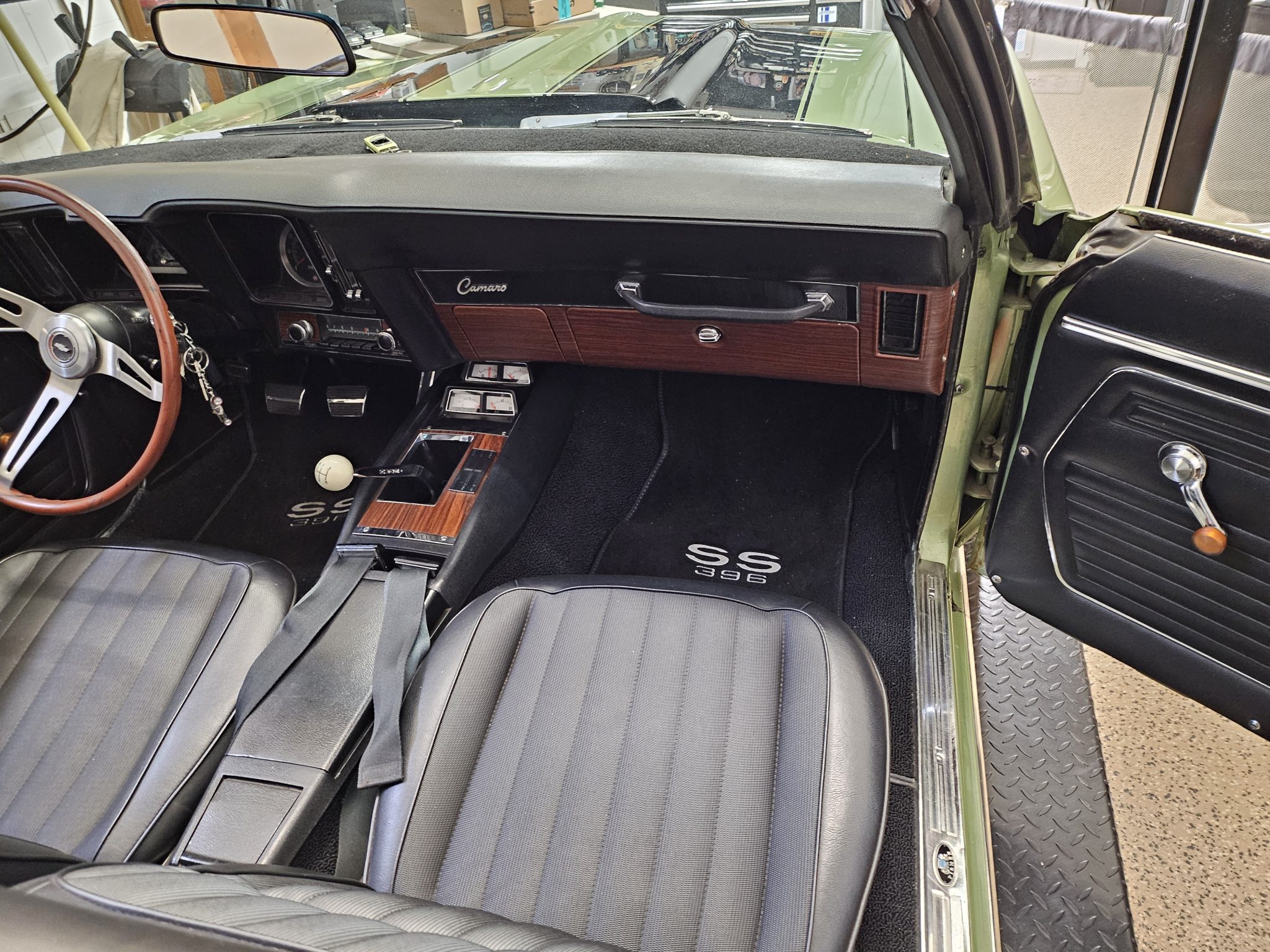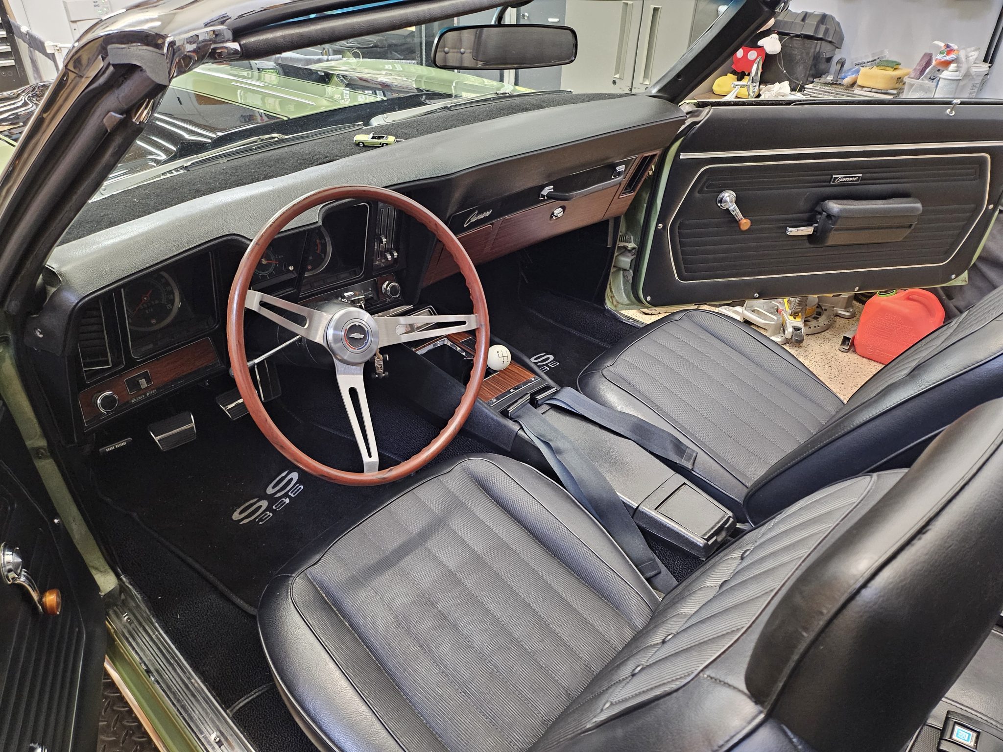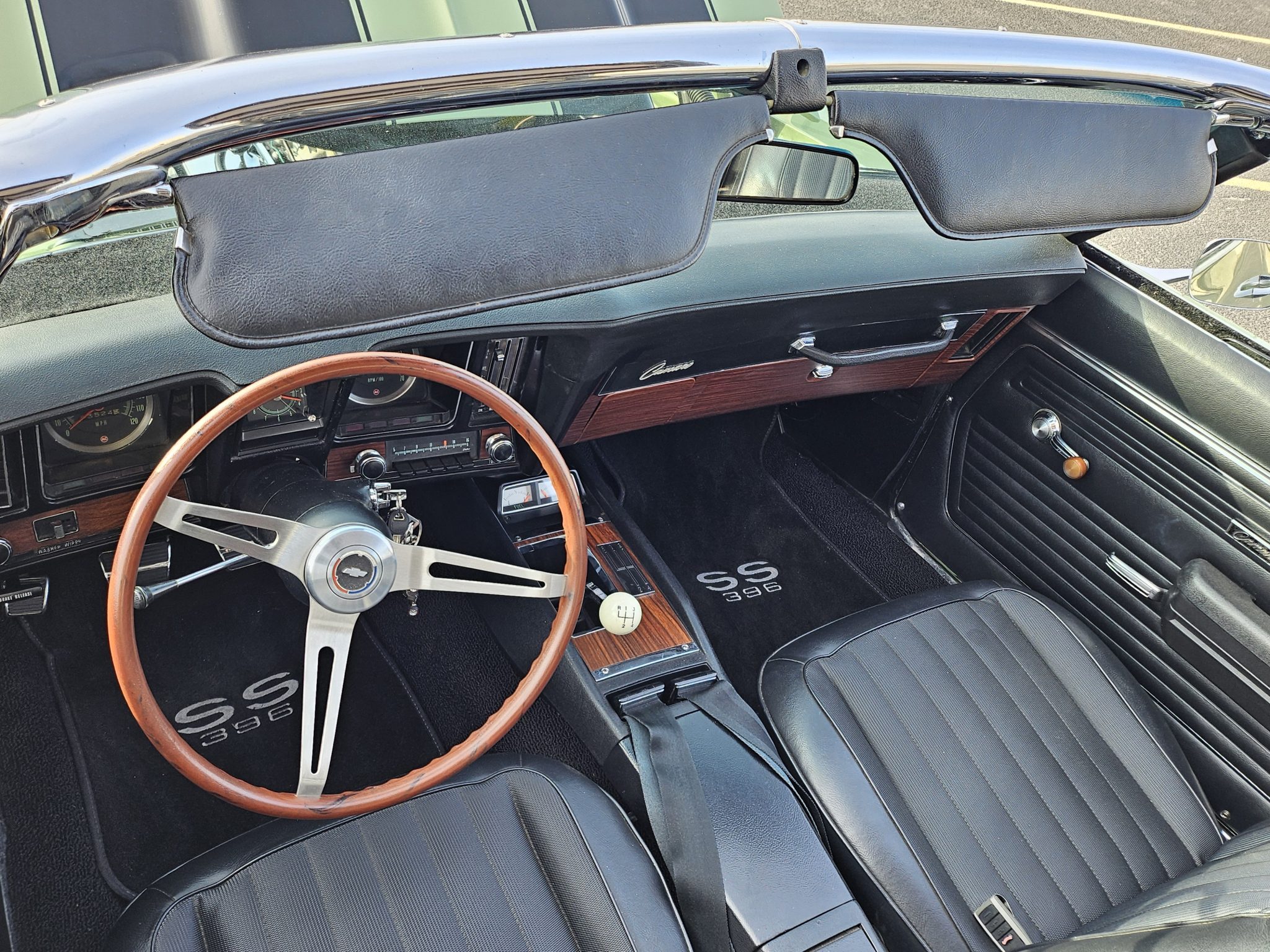 This 1969 Chevrolet Camaro convertible was repainted circa 1998 and underwent a refurbishment which included re-trimming the cabin in black vinyl. Exterior elements include a black soft top, front and rear spoilers, hideaway headlights, and SS badging, while the cabin appointments include a Hurst shifter, a woodgrain steering wheel, an AM/FM radio, and front bucket seats. The replacement 396ci V8 utilizes an Edelbrock intake and carburetor, while the car is further equipped with a four-speed manual transmission, a PosiTraction differential, long-tube headers, Billet Specialties wheels, four-wheel disc brakes, and a lowered suspension.