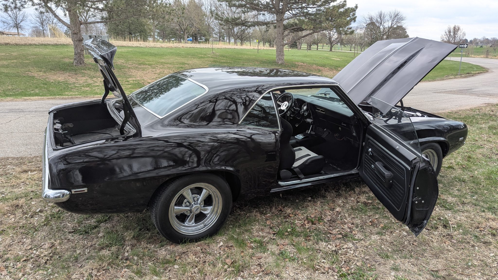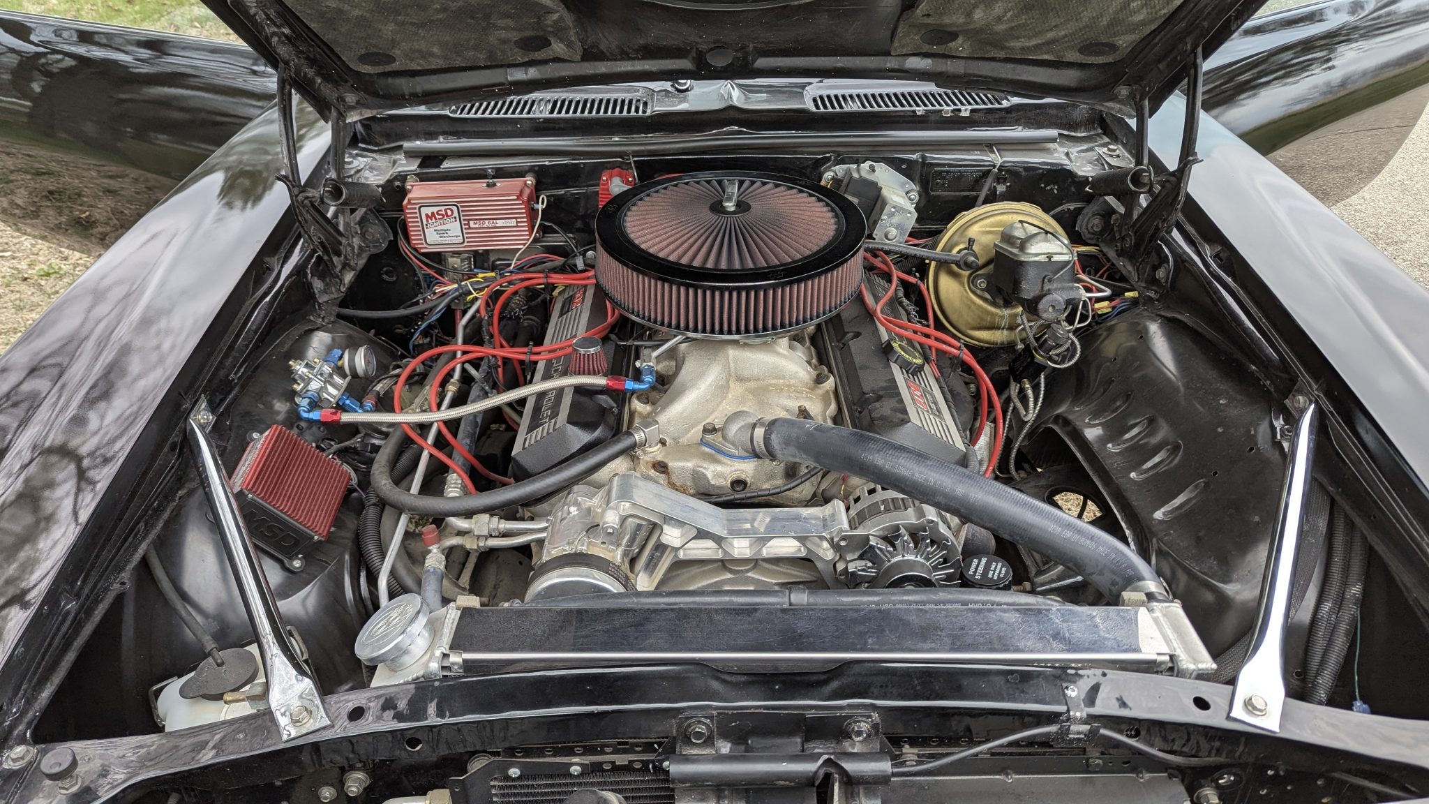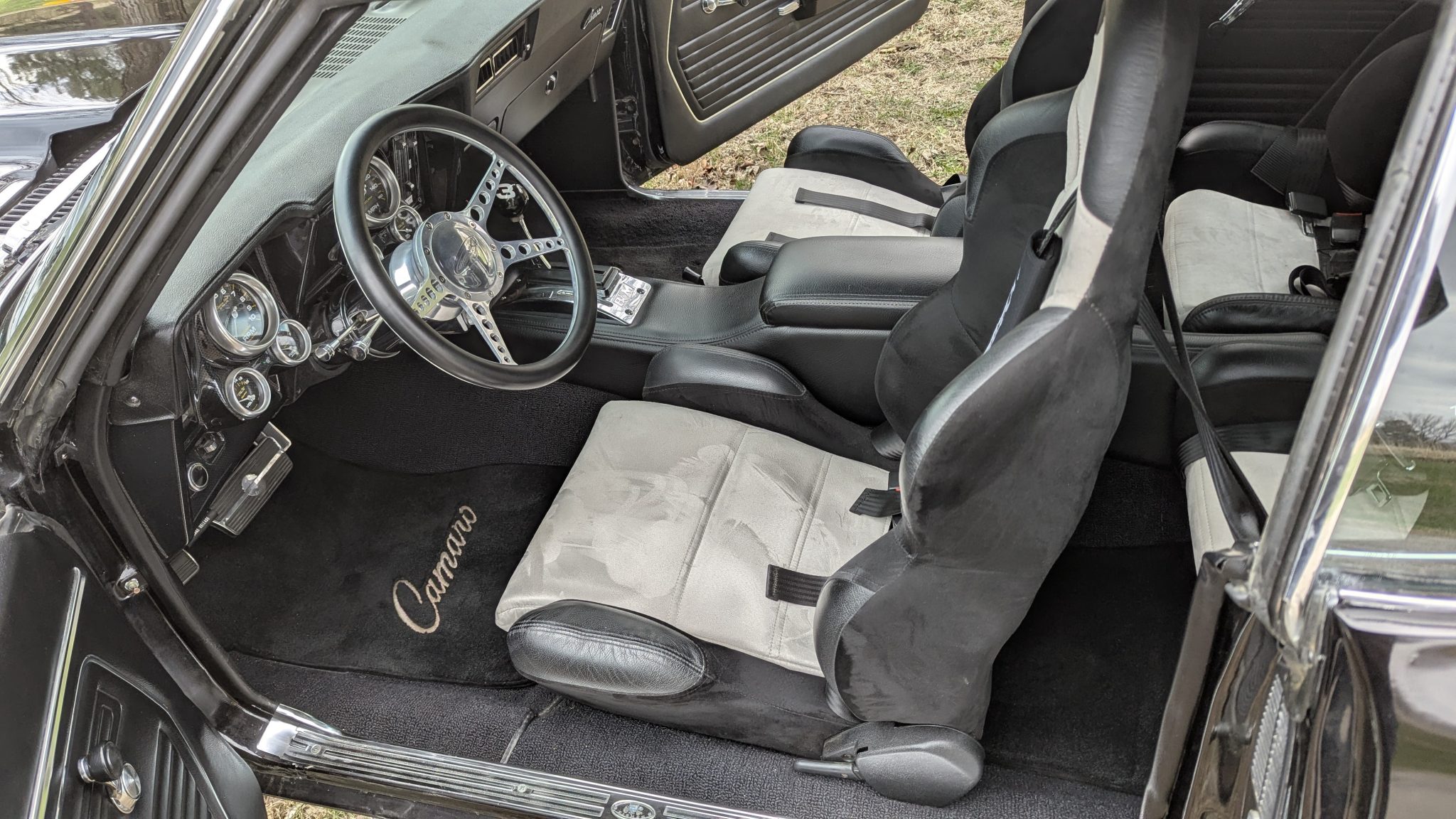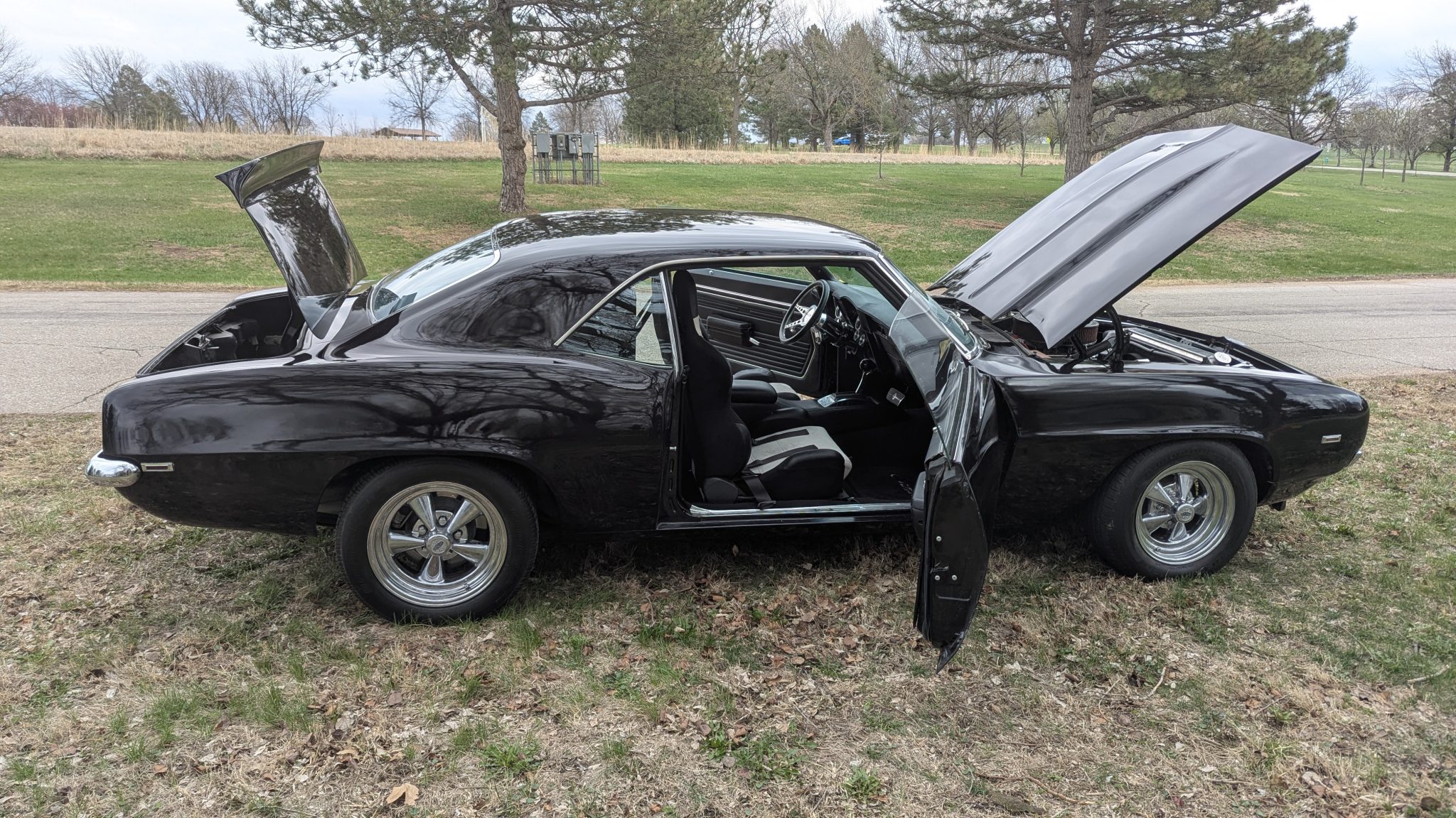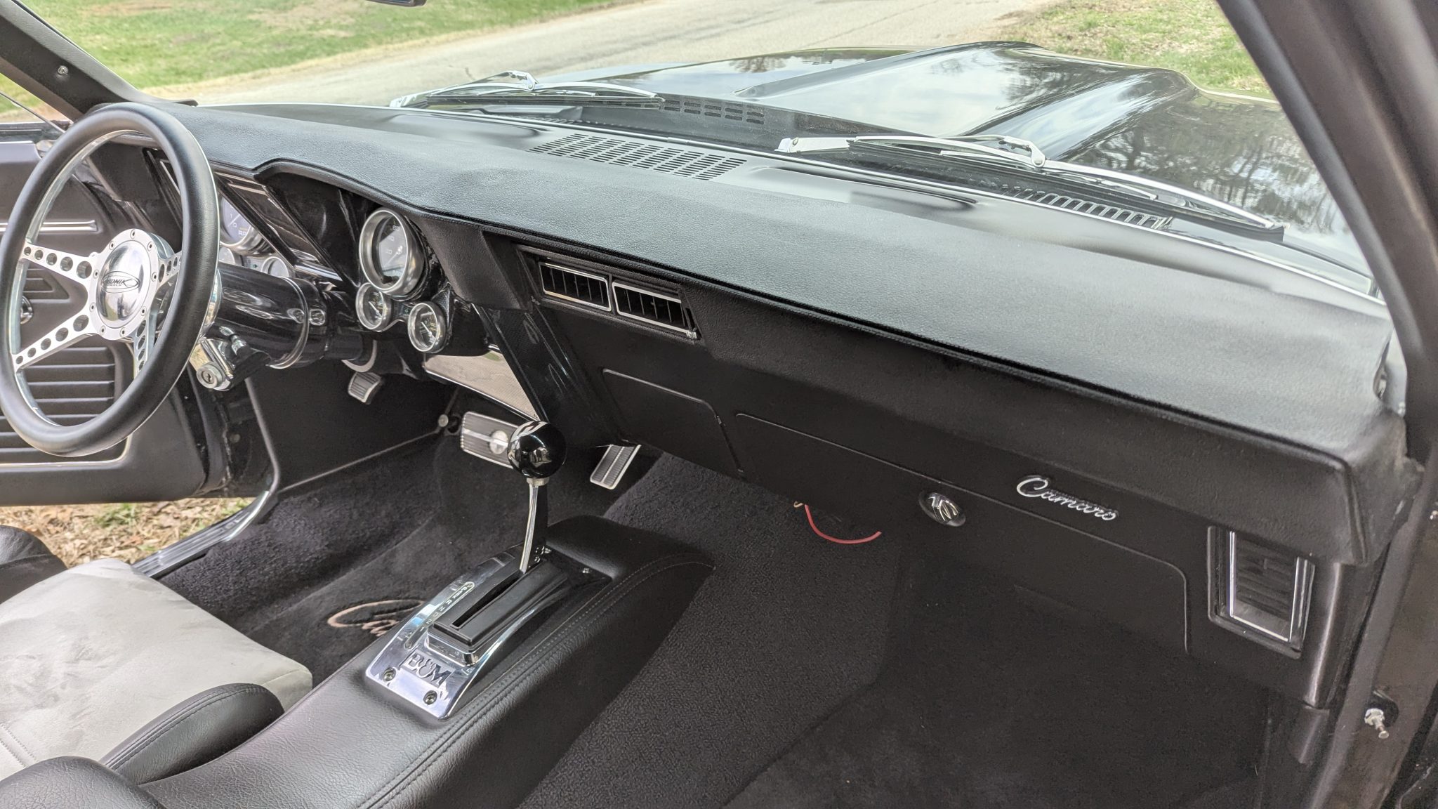 subsequent refurbishment work included a repaint in black as well as the installation of a 502ci V8 crate engine along with a TH400 three-speed automatic transmission and a Ford 9″ rear end with 4.11:1 gearing. Inside, Corbeau bolstered bucket seats are installed front and rear along with a full-length center console, Vintage Air climate control, a B&M shifter, and a Budnik steering wheel mounted to a tilting column. Additional modifications include an RS-style grille with Detroit Speed headlight cover motors, a cowl hood, shaved door handles, remote door poppers, power-assisted four-wheel disc brakes, and 15″ Cragar S/S wheels as well as a Painless Performance wiring kit, an aluminum radiator with electric fans, MSD ignition components, and Hooker exhaust headers.