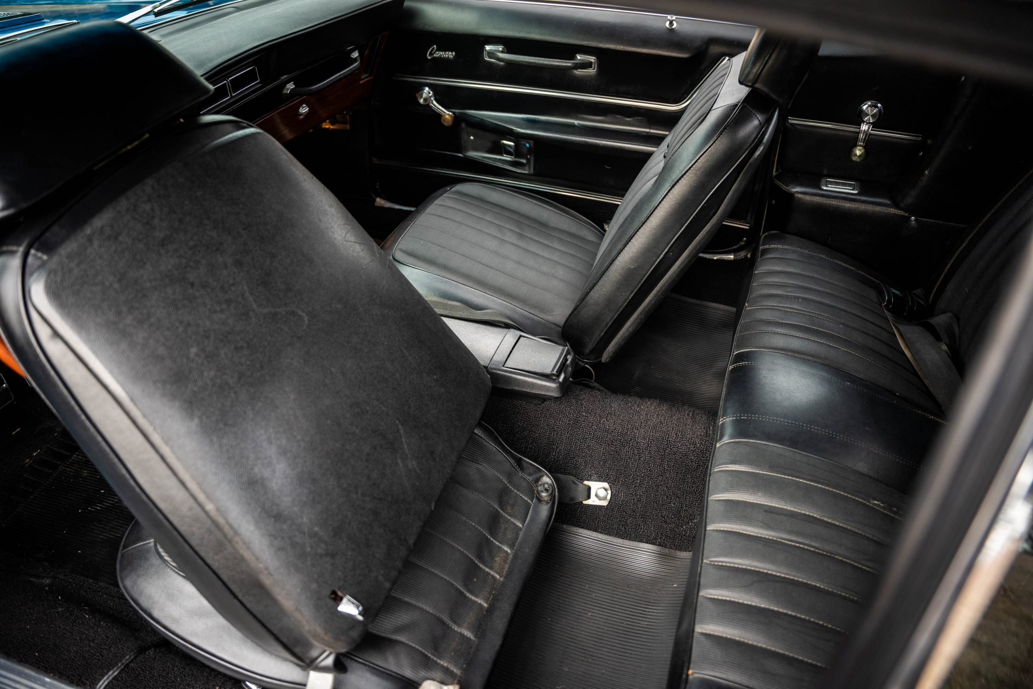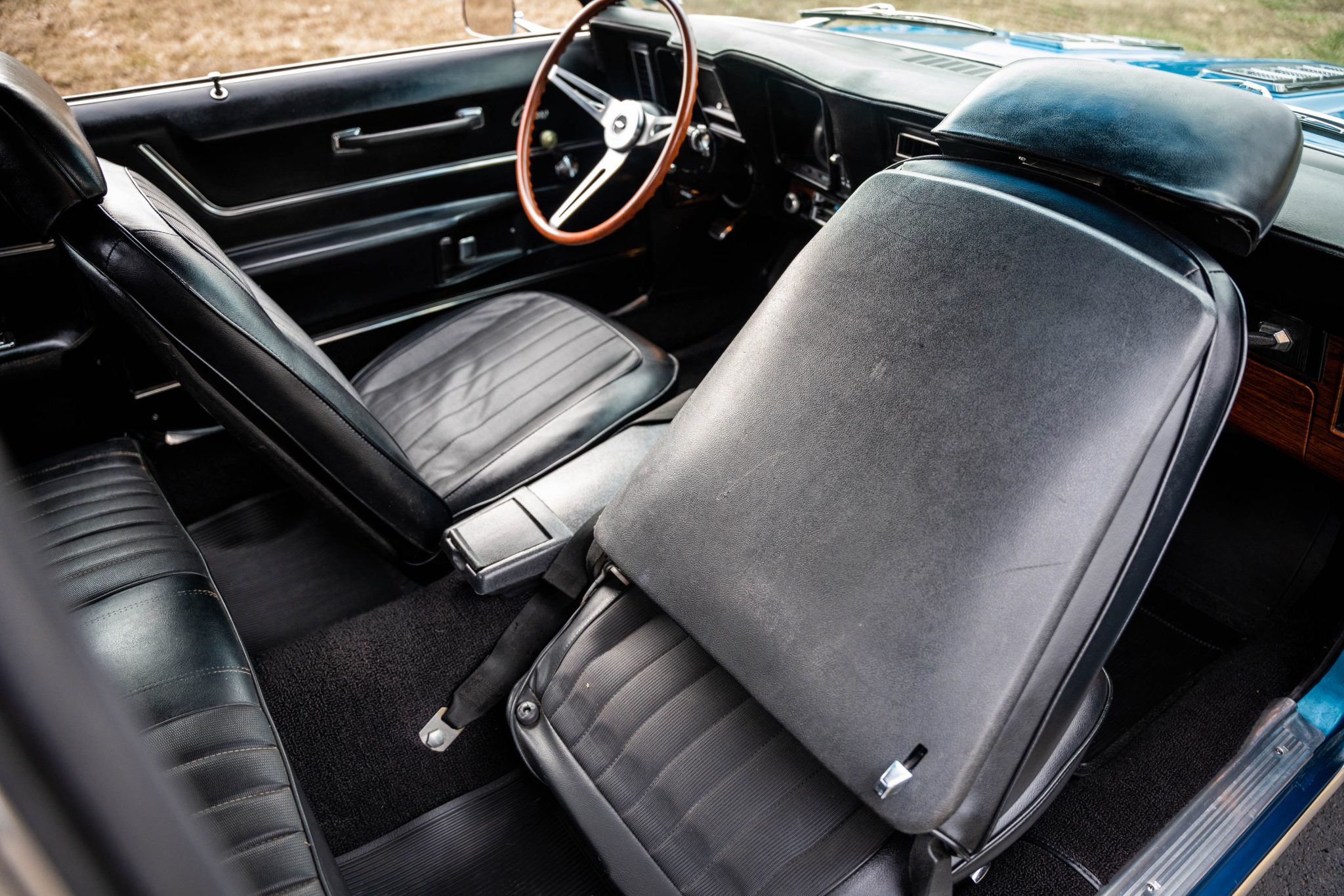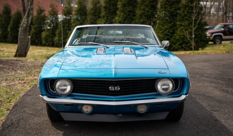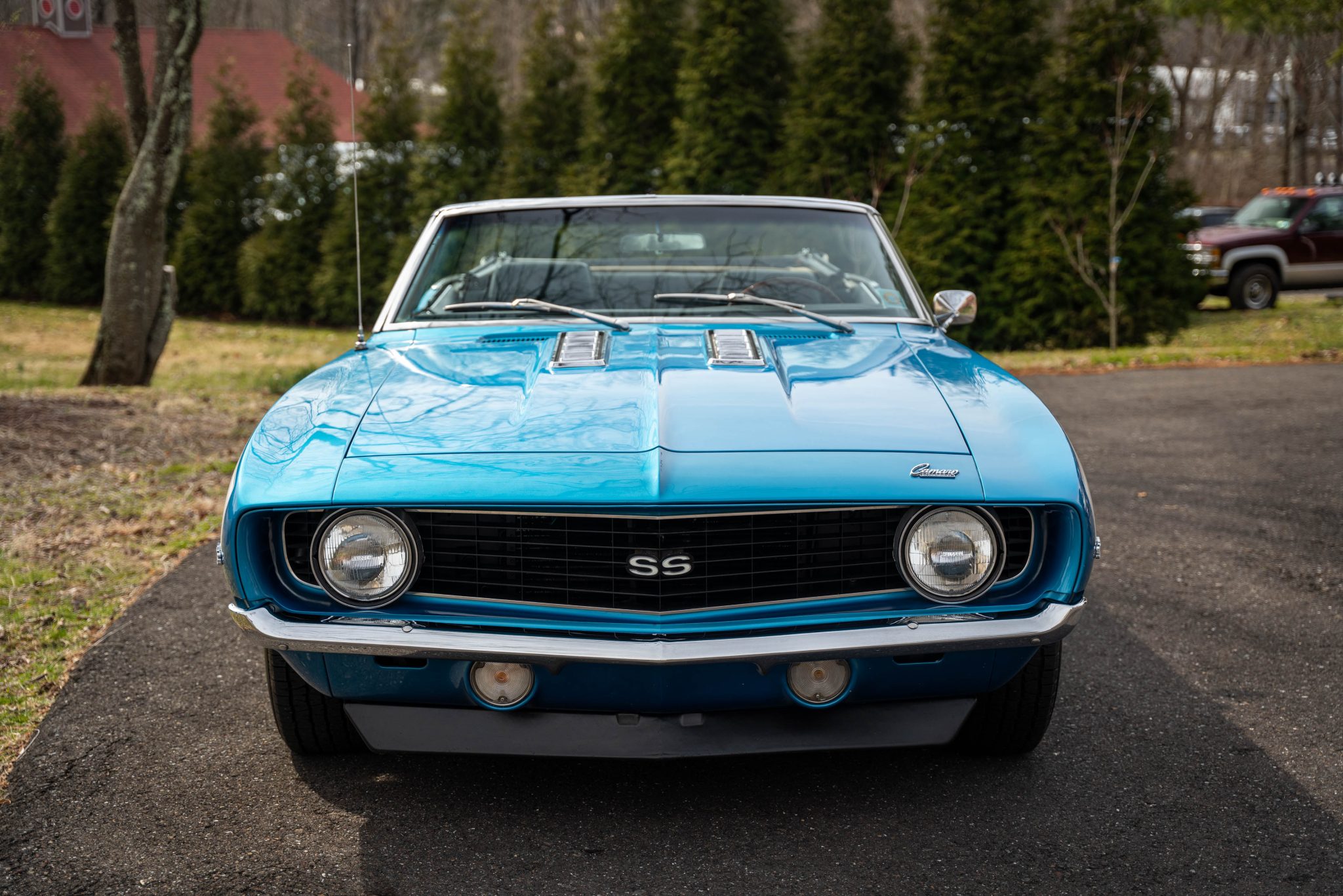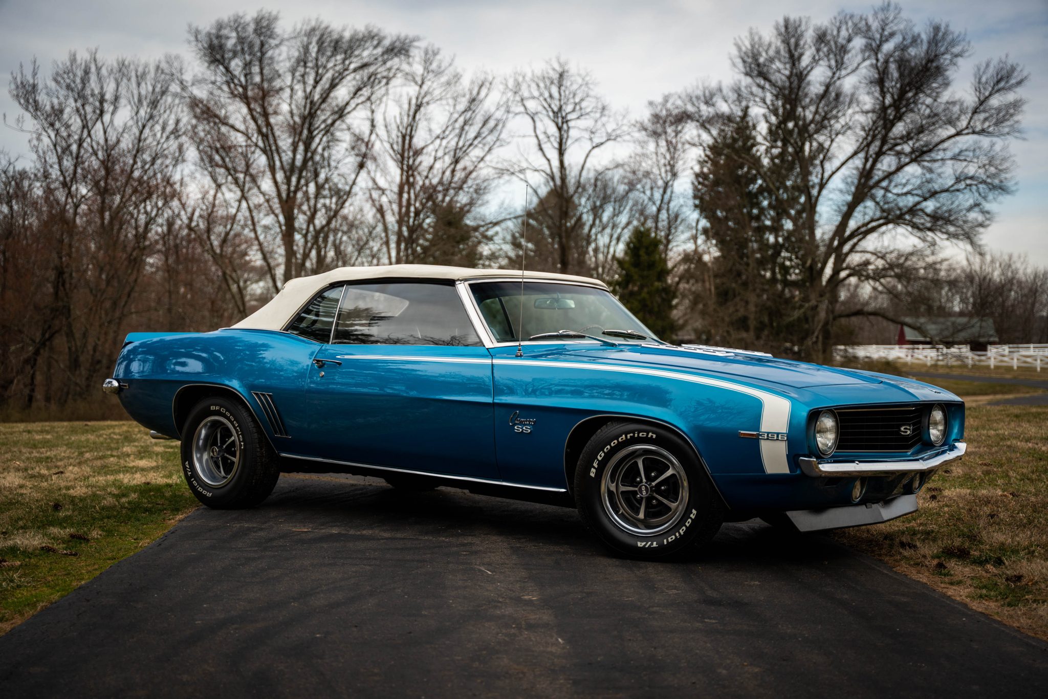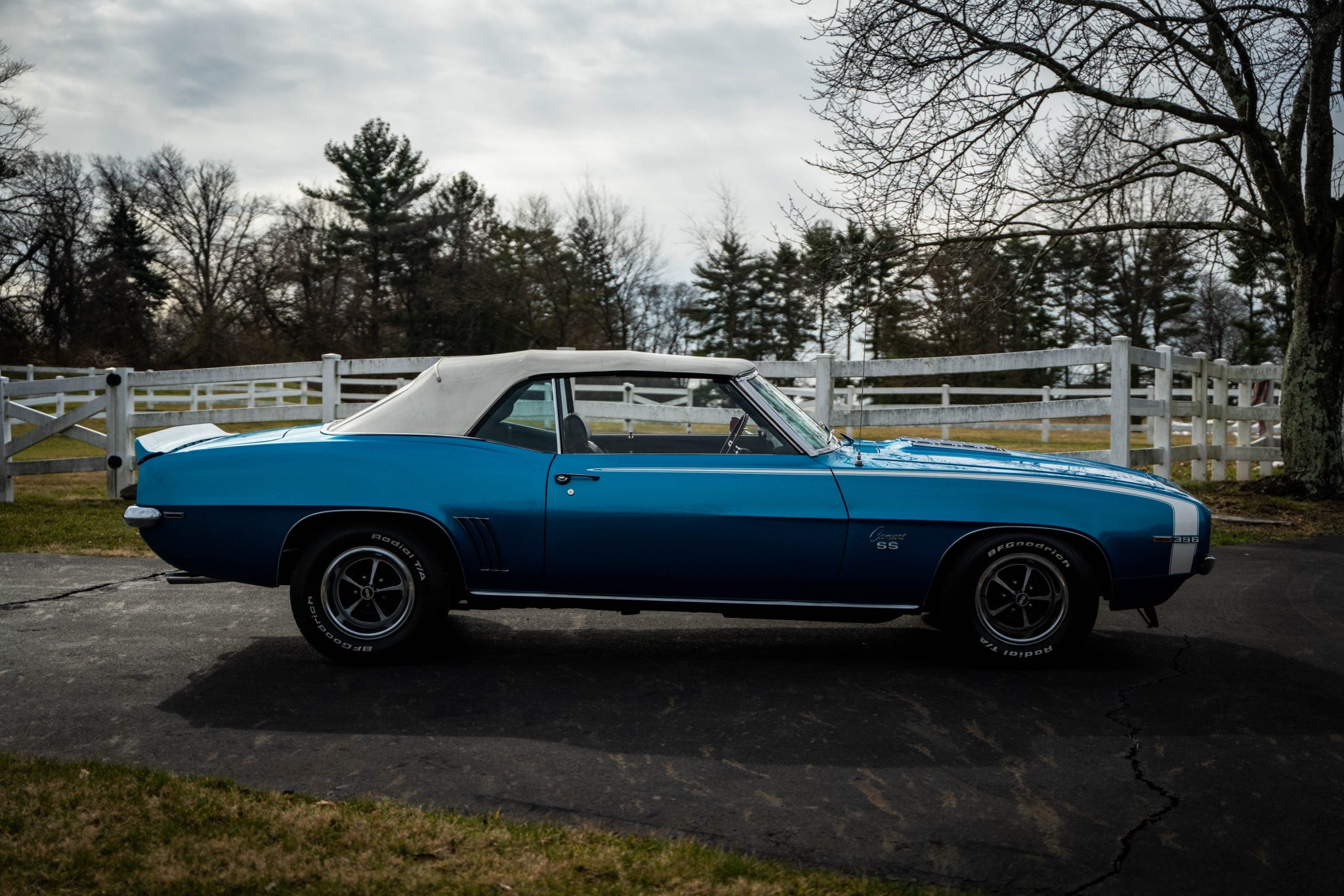 This 1969 Chevrolet Camaro SS convertible is powered by a 396ci V8 mated to a three-speed automatic transmission and is finished in blue over black vinyl upholstery. Additional equipment includes a white power-operated soft top, white side stripes, 14″ wheels, front and rear spoilers, a rosewood steering wheel, air conditioning, an aftermarket AM/FM radio, and a dual exhaust system.