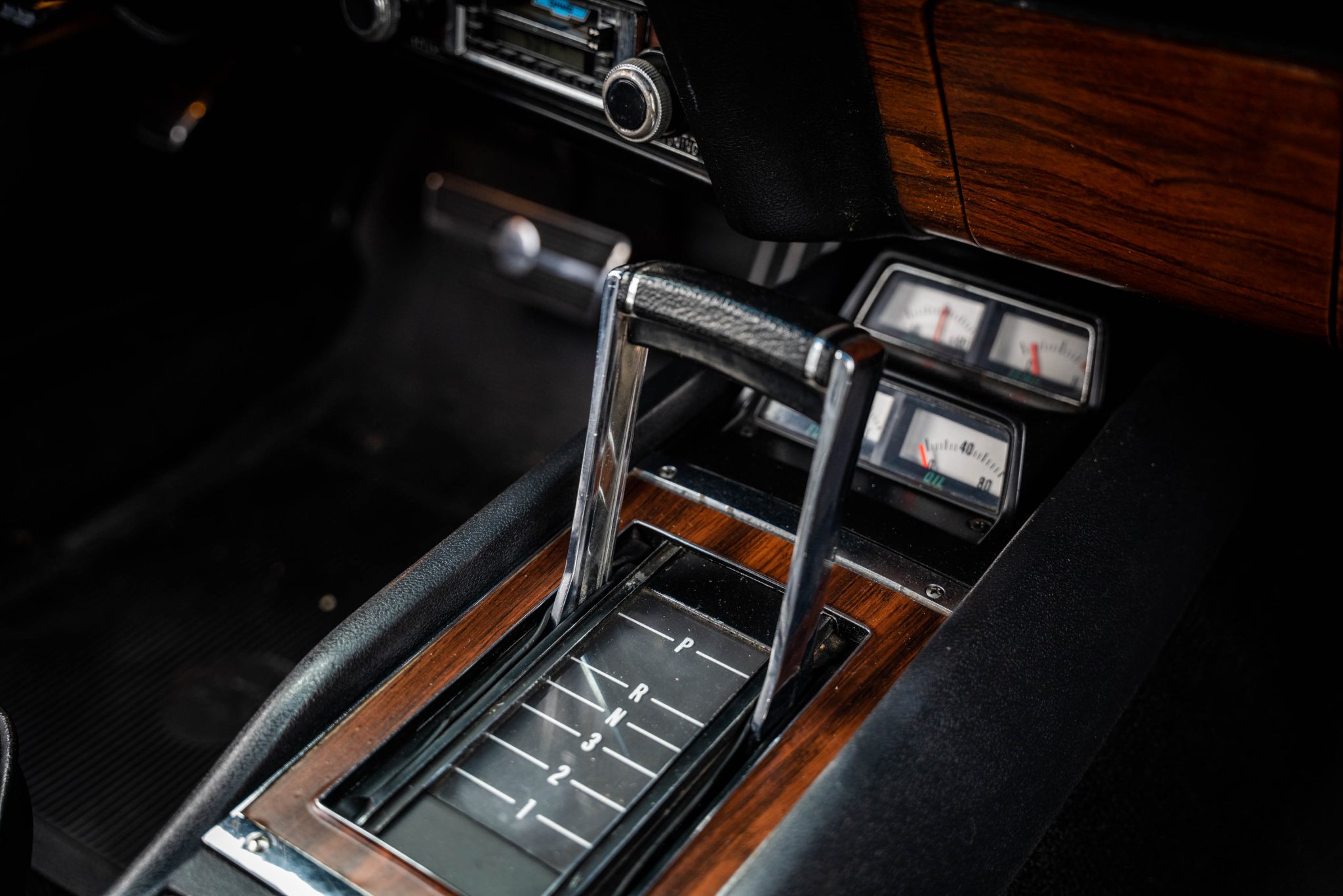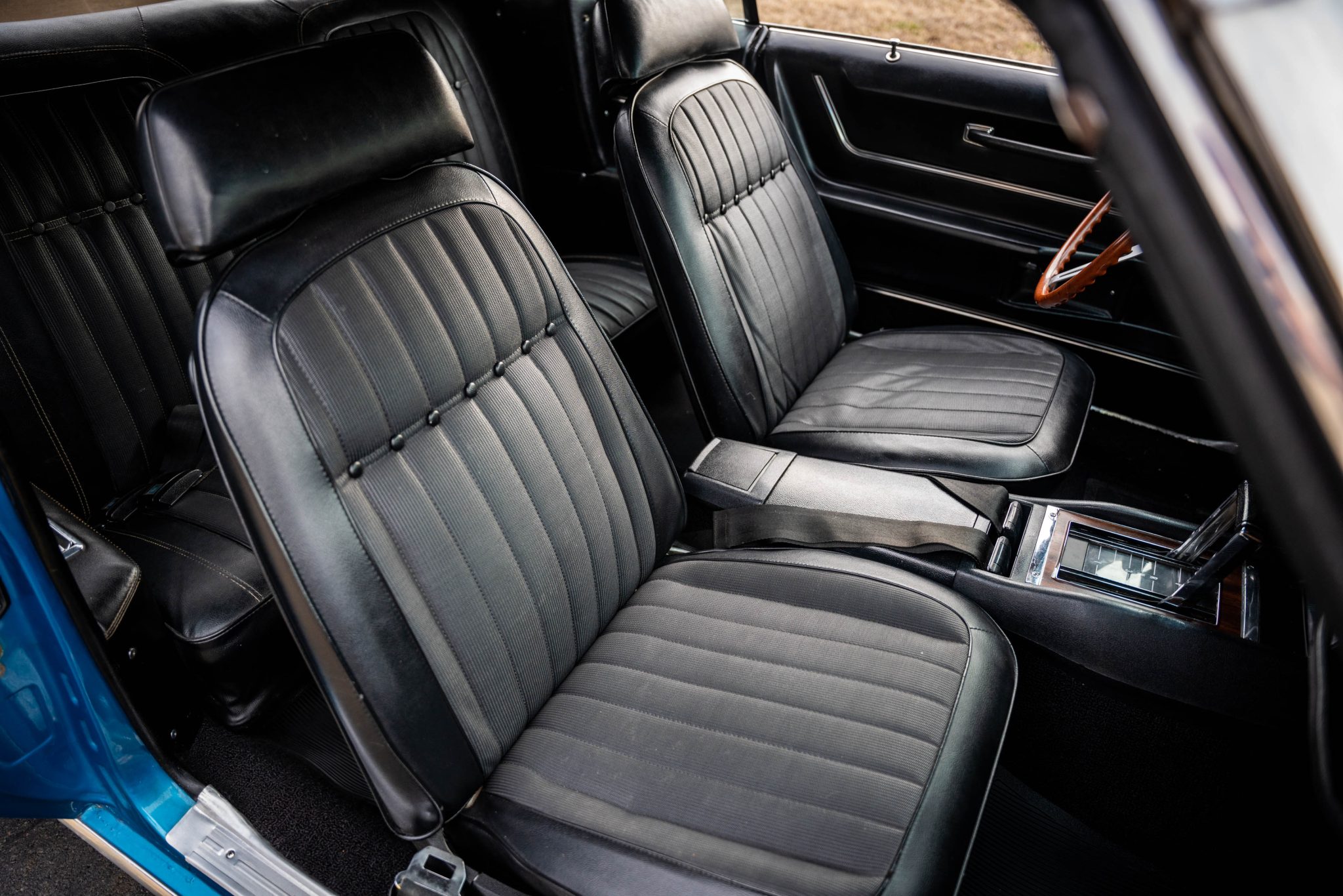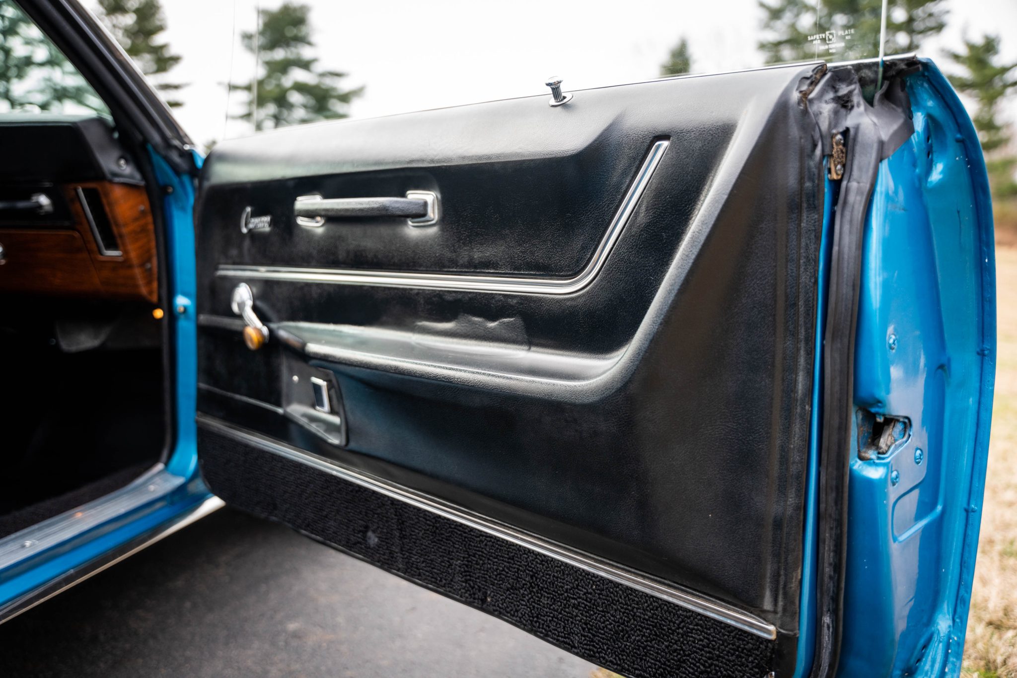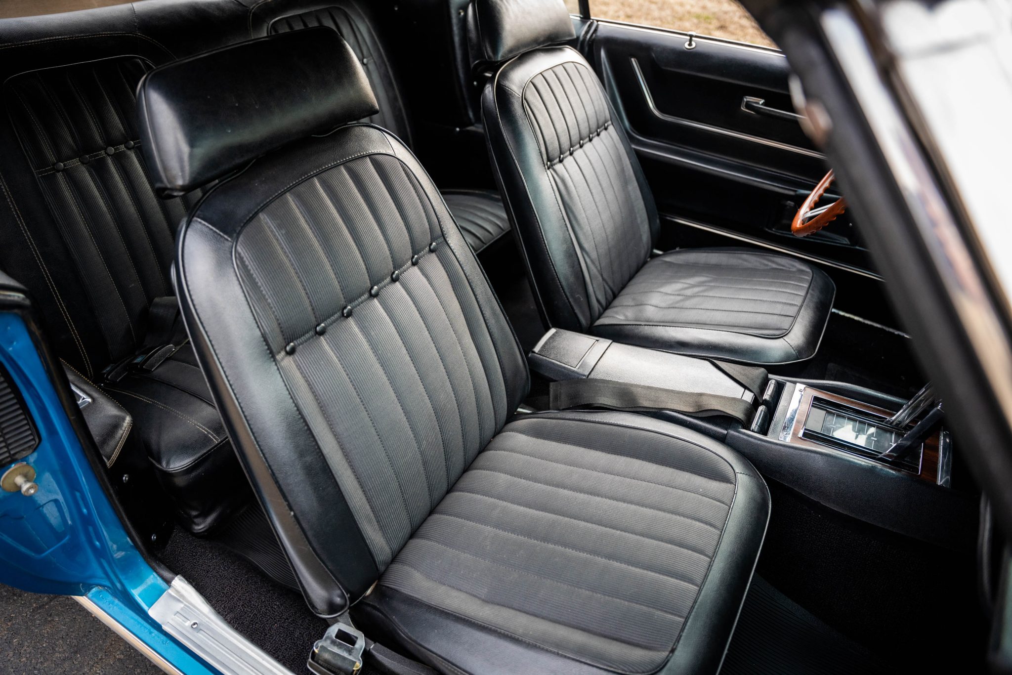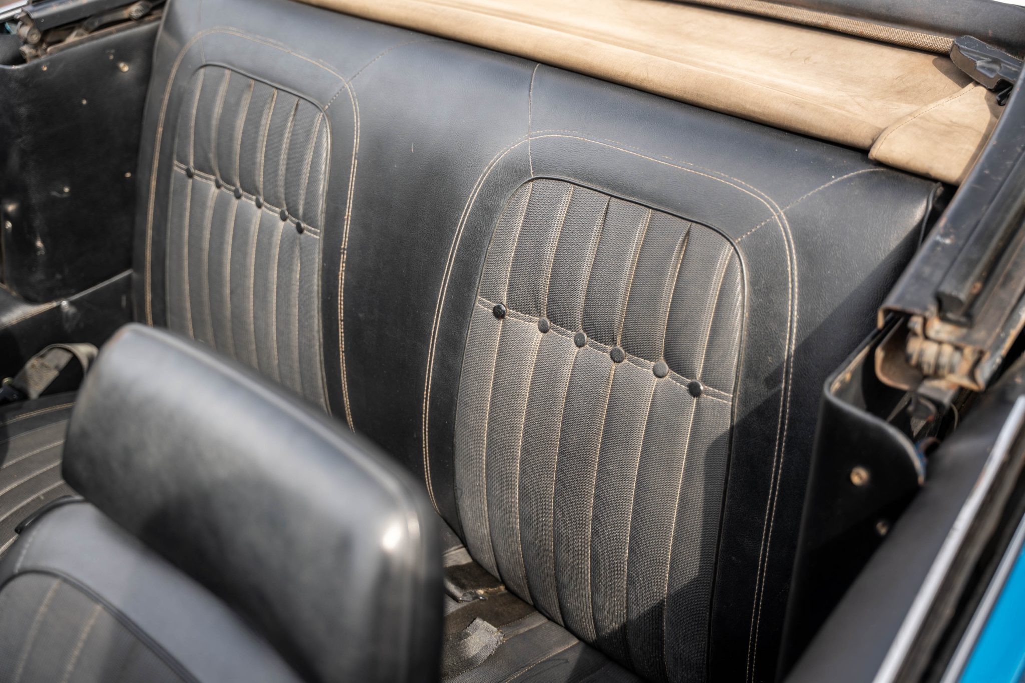 This 1969 Chevrolet Camaro SS convertible is powered by a 396ci V8 mated to a three-speed automatic transmission and is finished in blue over black vinyl upholstery. Additional equipment includes a white power-operated soft top, white side stripes, 14″ wheels, front and rear spoilers, a rosewood steering wheel, air conditioning, an aftermarket AM/FM radio, and a dual exhaust system.
