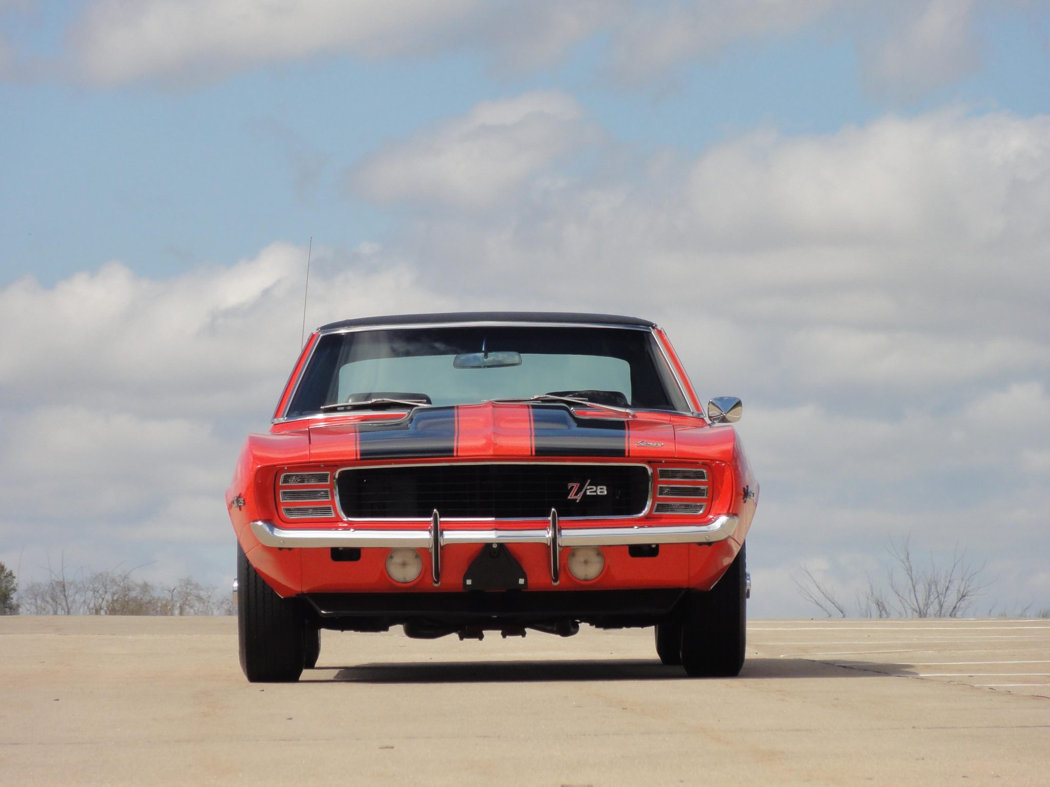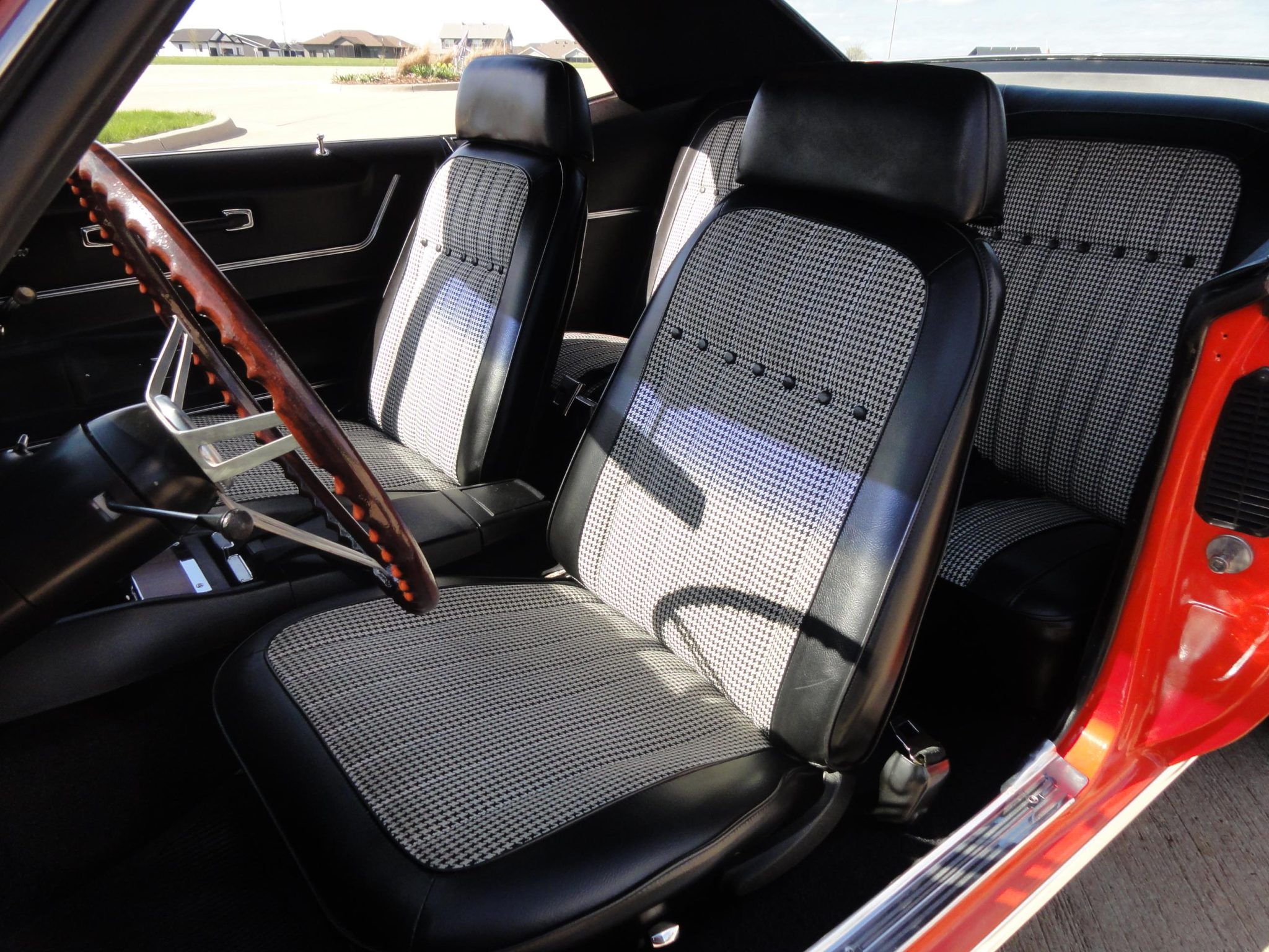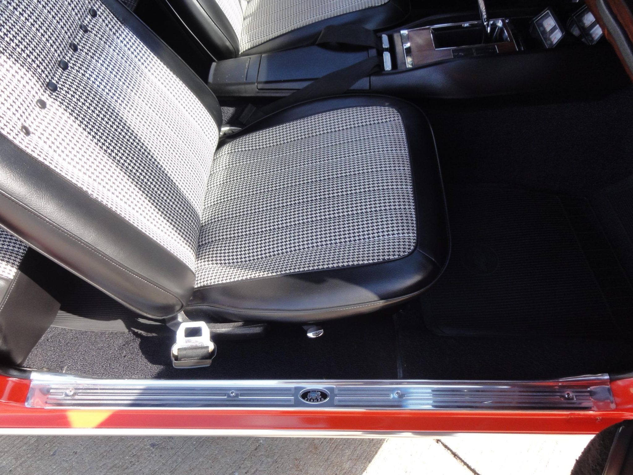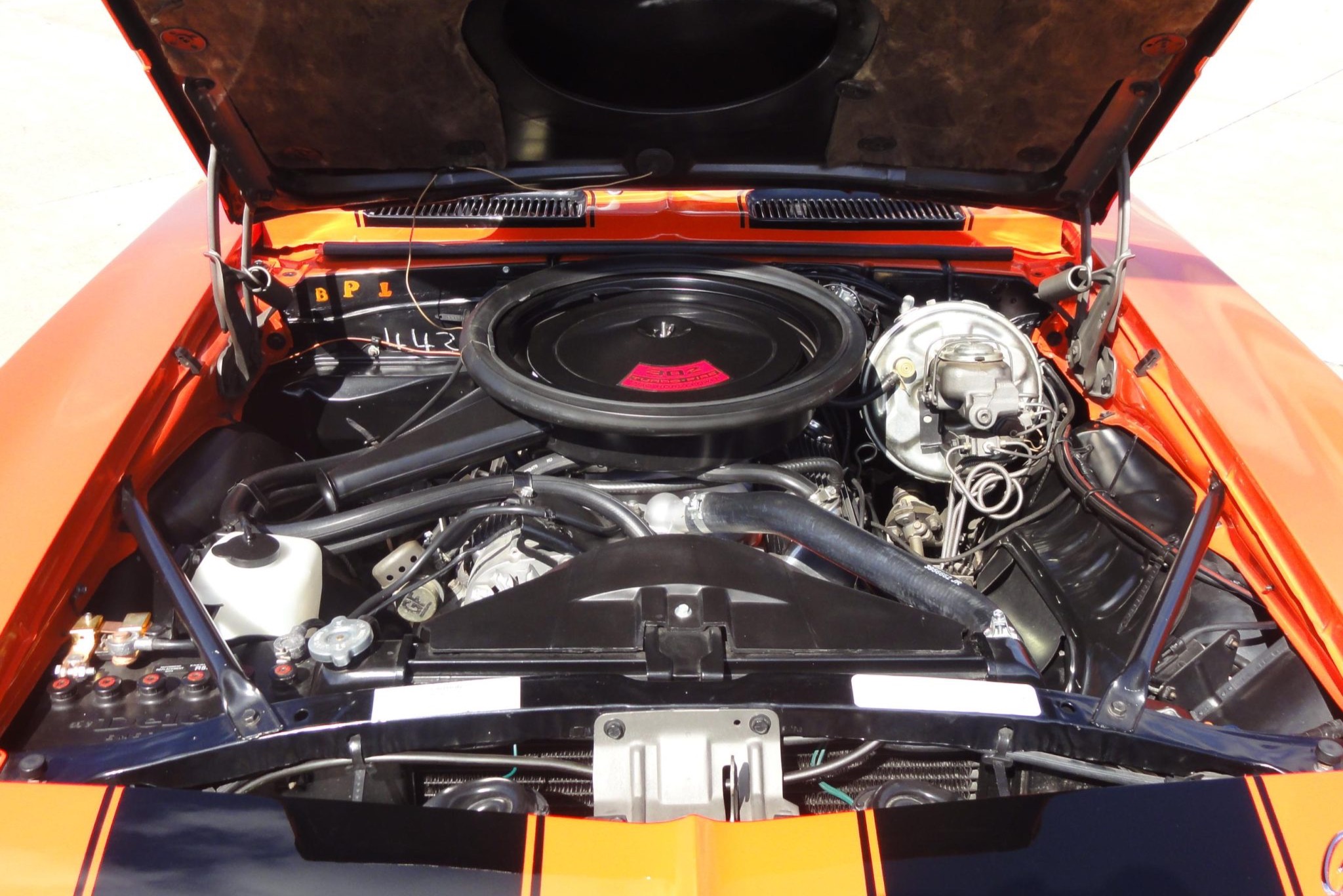 was refurbished in 2008 with work that included refinishing the body in Hugger orange with black stripes and a black vinyl roof as well as re-trimming the interior with black and ivory houndstooth upholstery. Power is provided by a 302ci V8 linked to a four-speed manual transmission and a Positraction differential. Equipment includes a cowl induction hood, an RS-style grille with concealed headlamps, a center console, an AM/FM radio, power-assisted front disc brakes, 15″ Rally wheels, and a dual exhaust system.
