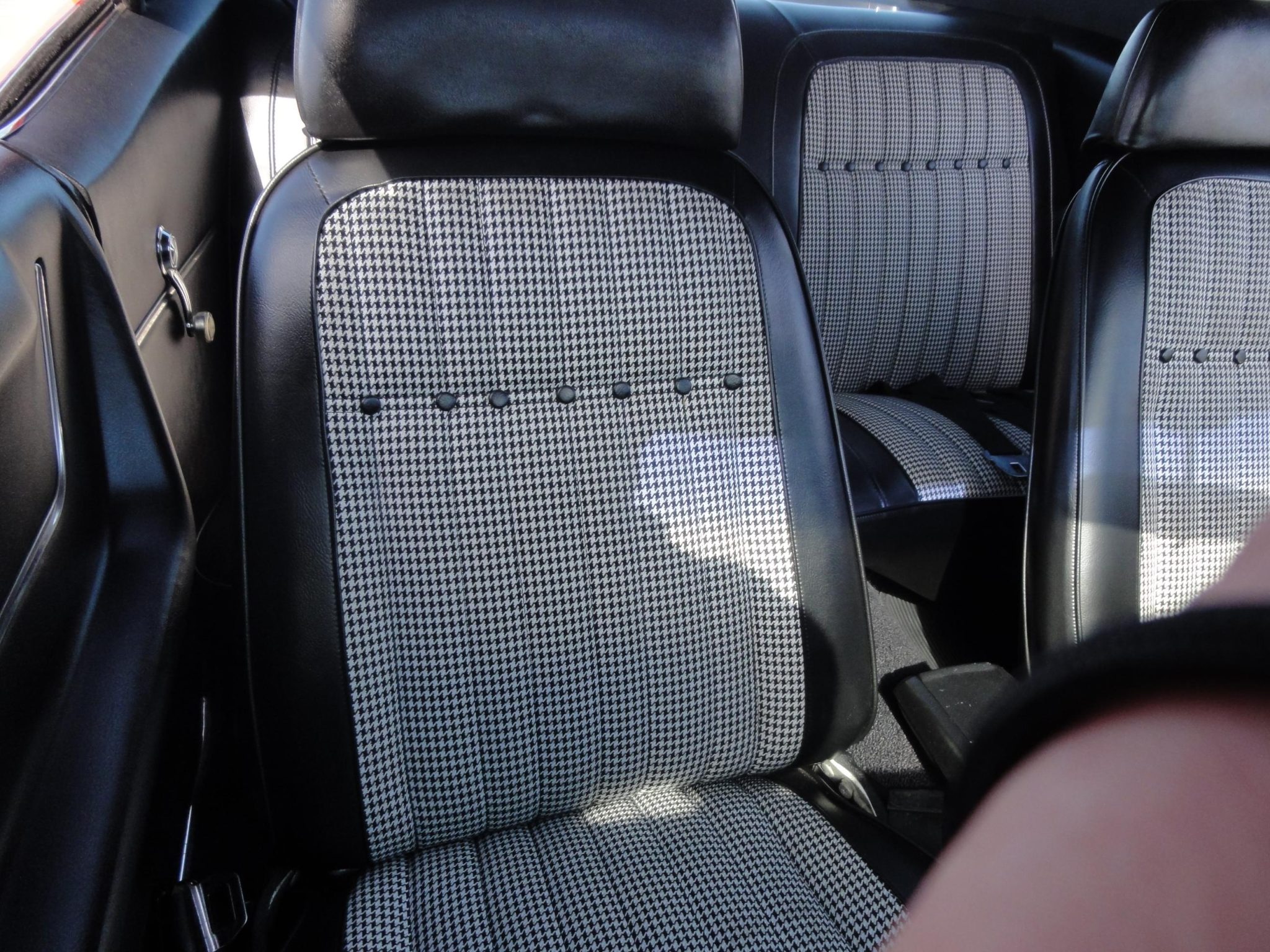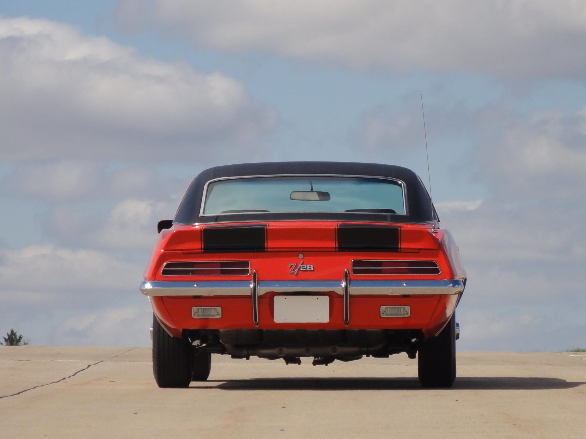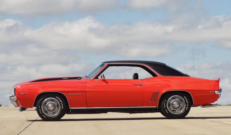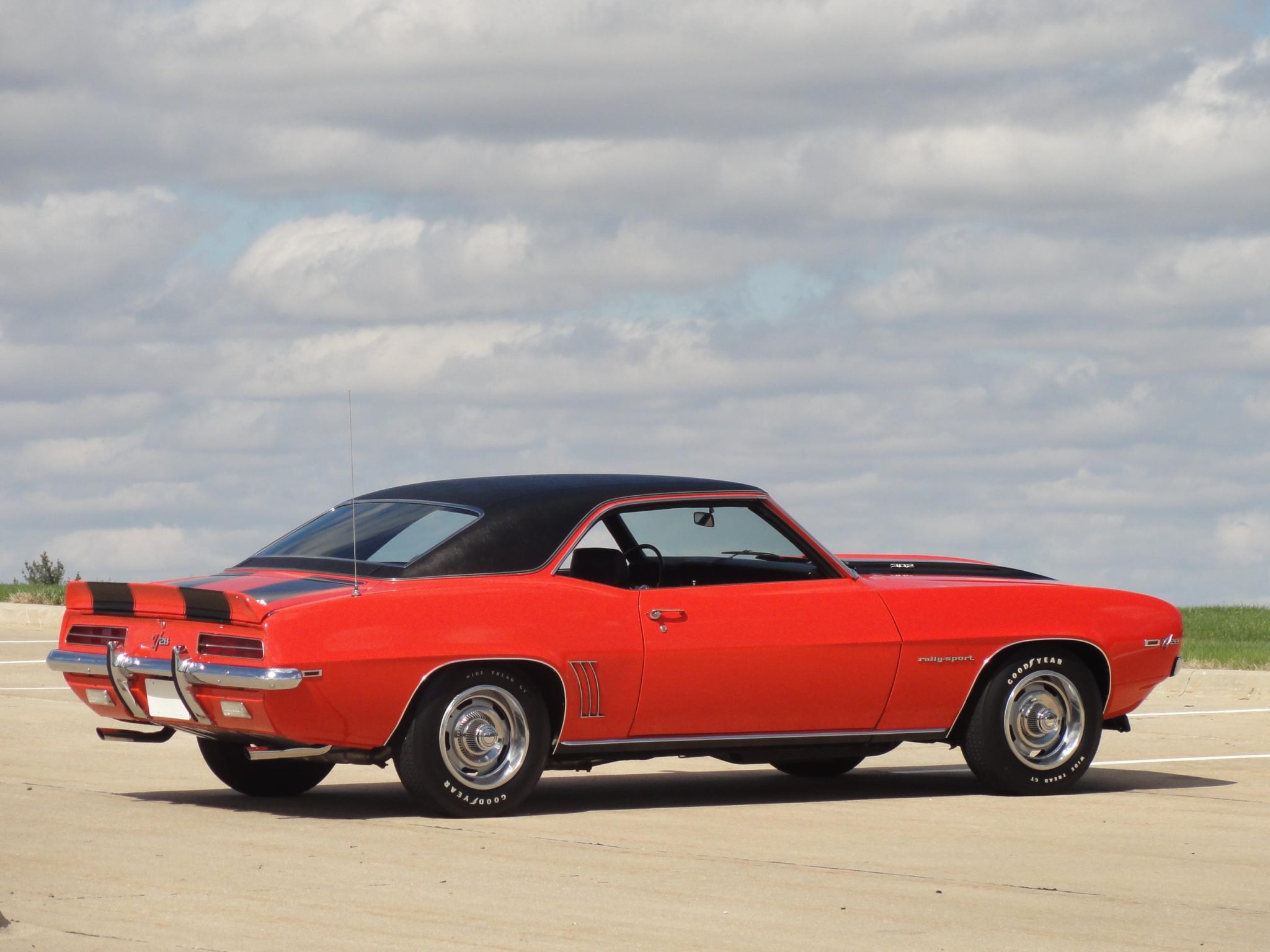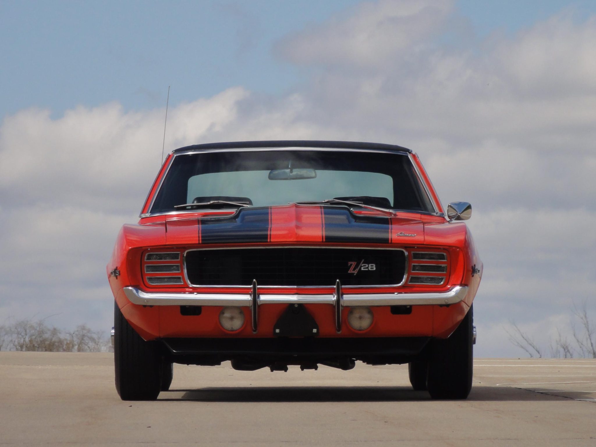 was refurbished in 2008 with work that included refinishing the body in Hugger orange with black stripes and a black vinyl roof as well as re-trimming the interior with black and ivory houndstooth upholstery. Power is provided by a 302ci V8 linked to a four-speed manual transmission and a Positraction differential. Equipment includes a cowl induction hood, an RS-style grille with concealed headlamps, a center console, an AM/FM radio, power-assisted front disc brakes, 15″ Rally wheels, and a dual exhaust system.