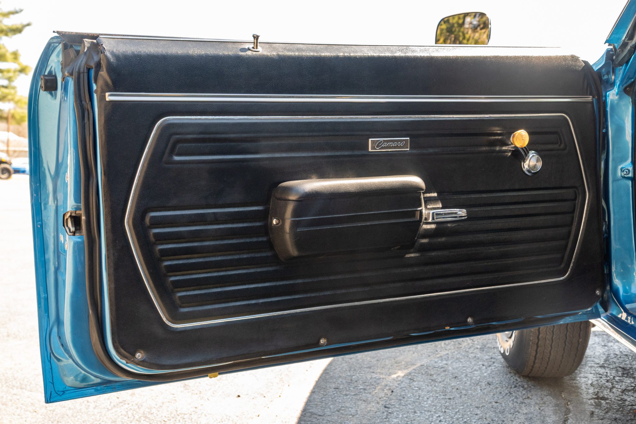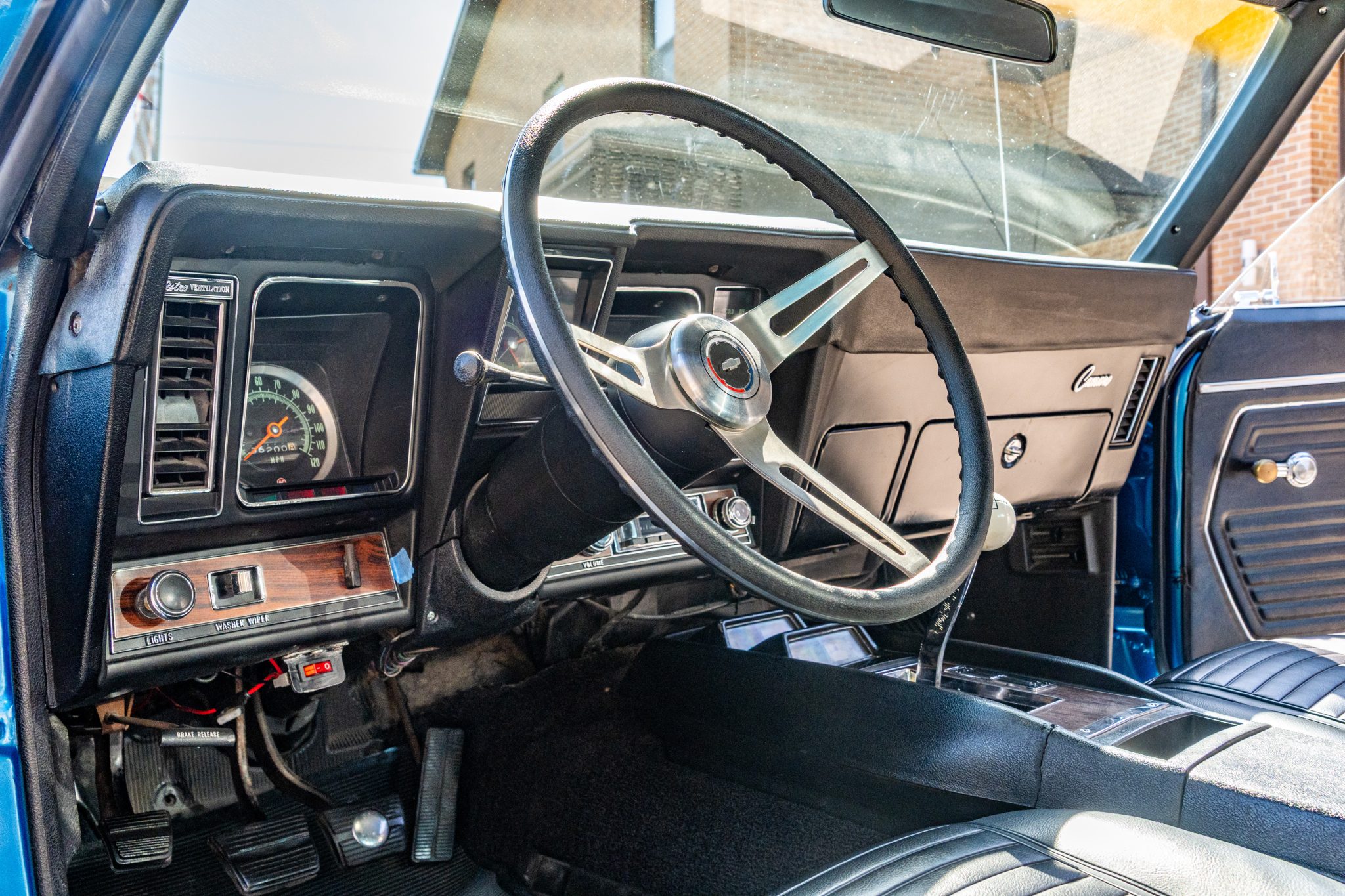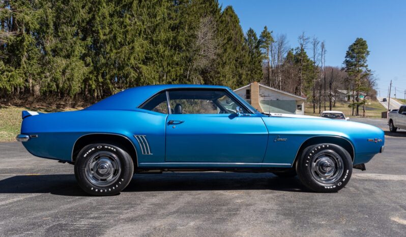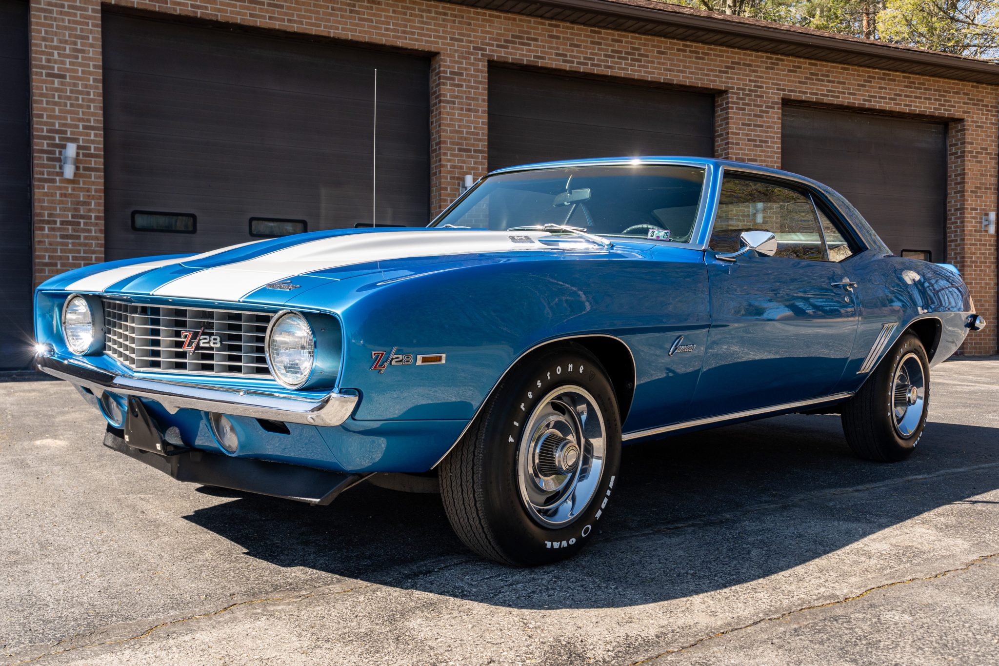This 1969 Chevrolet Camaro Z/28 coupe was refinished in blue with white and it is powered by a 302ci V8 linked with a four-speed manual transmission and a limited-slip differential. The interior has front bucket seats trimmed in black vinyl as well as a center console, a Hurst shifter, and a Custom Autosound stereo. Additional equipment includes front and rear spoilers, 15″ Rally wheels, power steering, and power-assisted front disc brakes.