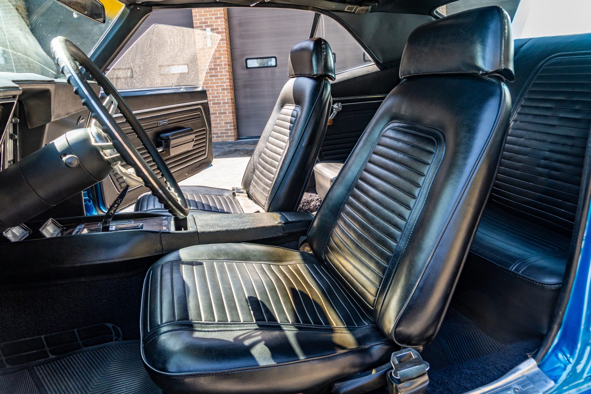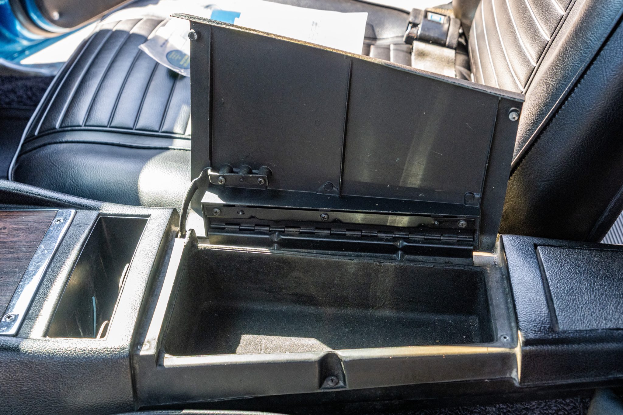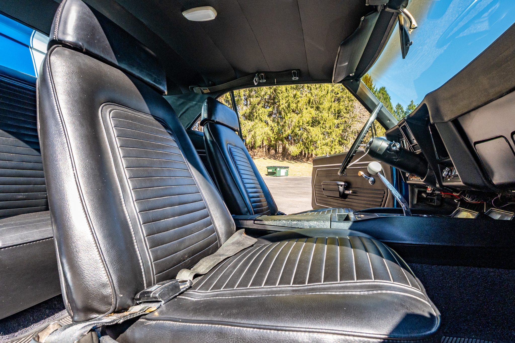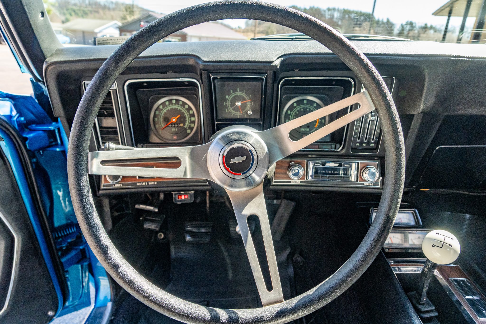 This 1969 Chevrolet Camaro Z/28 coupe was refinished in blue with white and it is powered by a 302ci V8 linked with a four-speed manual transmission and a limited-slip differential. The interior has front bucket seats trimmed in black vinyl as well as a center console, a Hurst shifter, and a Custom Autosound stereo. Additional equipment includes front and rear spoilers, 15″ Rally wheels, power steering, and power-assisted front disc brakes.