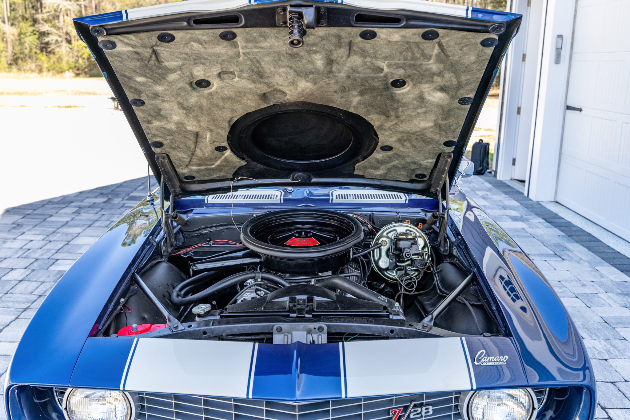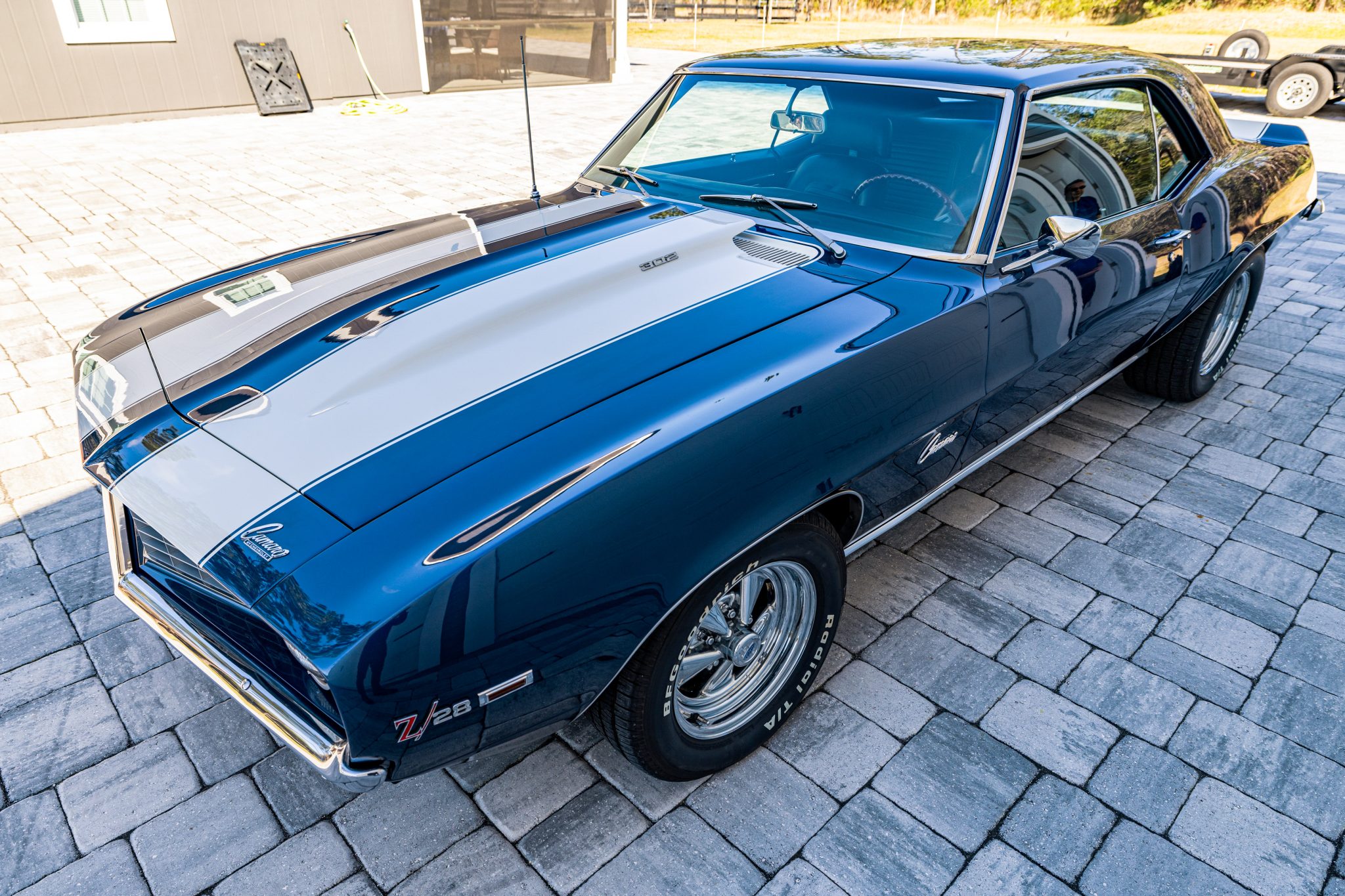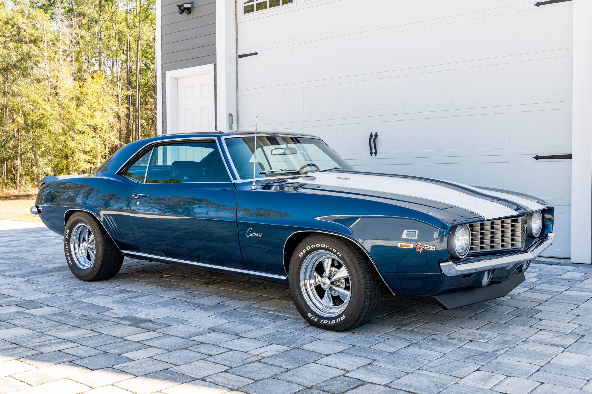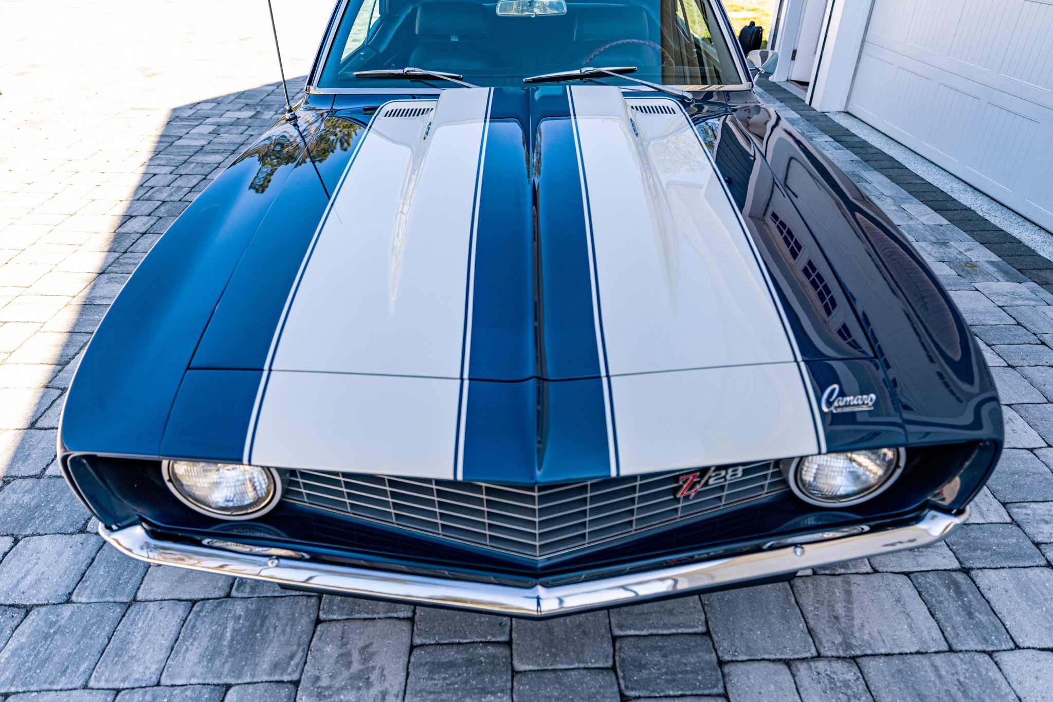 This 1969 Chevrolet Camaro Z/28 was refurbished and is powered by a rebuilt 302ci V8 linked with a four-speed manual transmission and a Positraction differential. The body was refinished in blue with white stripes, and the interior was re-trimmed in black vinyl. Details include a cowl induction hood, front and rear spoilers, a center console, a RetroSound digital stereo, Cragar S/S wheels, and power-assisted front disc brakes. Ridetech adjustable shocks are installed at the front, while QA1 adjustable shocks are mounted at the rear.