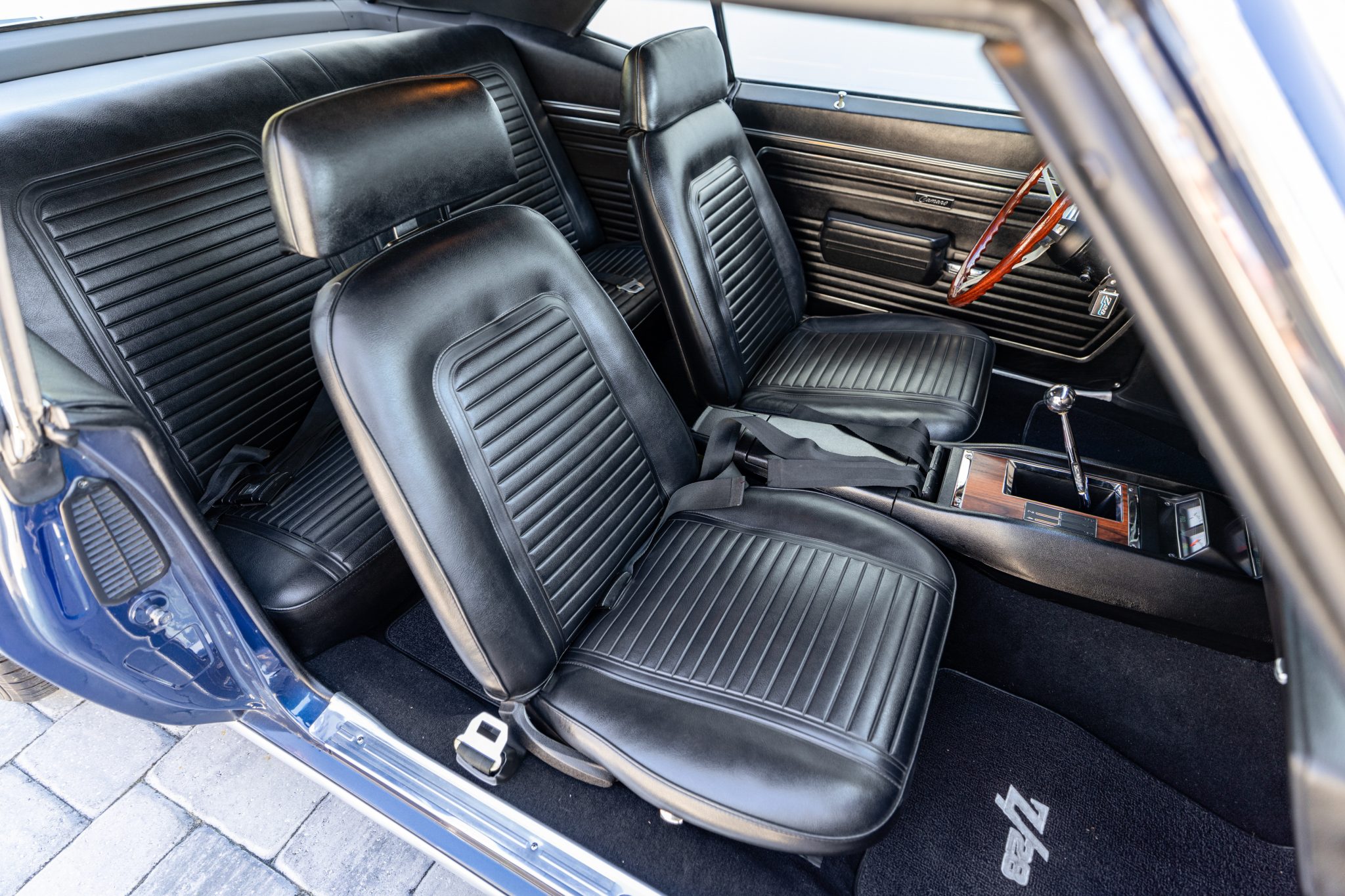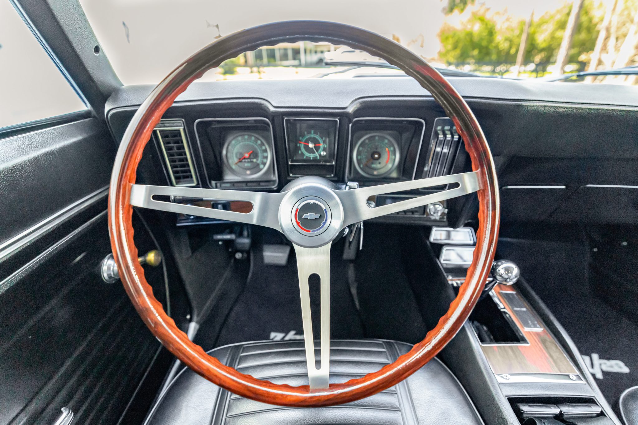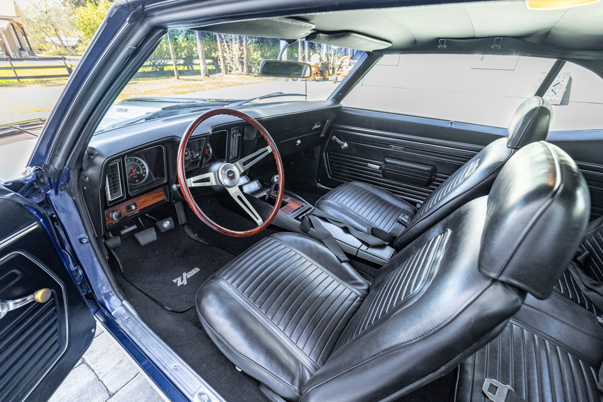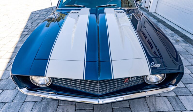 This 1969 Chevrolet Camaro Z/28 was refurbished and is powered by a rebuilt 302ci V8 linked with a four-speed manual transmission and a Positraction differential. The body was refinished in blue with white stripes, and the interior was re-trimmed in black vinyl. Details include a cowl induction hood, front and rear spoilers, a center console, a RetroSound digital stereo, Cragar S/S wheels, and power-assisted front disc brakes. Ridetech adjustable shocks are installed at the front, while QA1 adjustable shocks are mounted at the rear.
