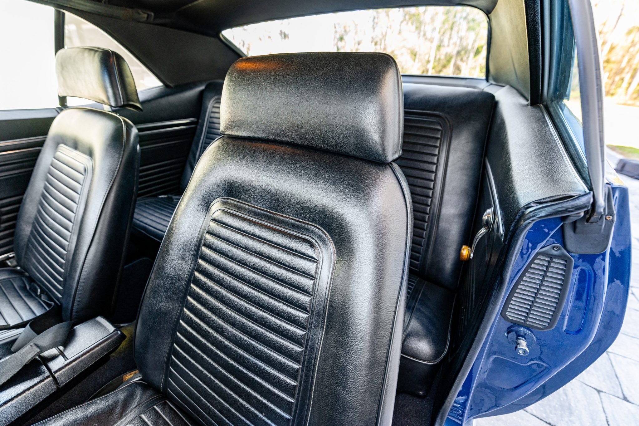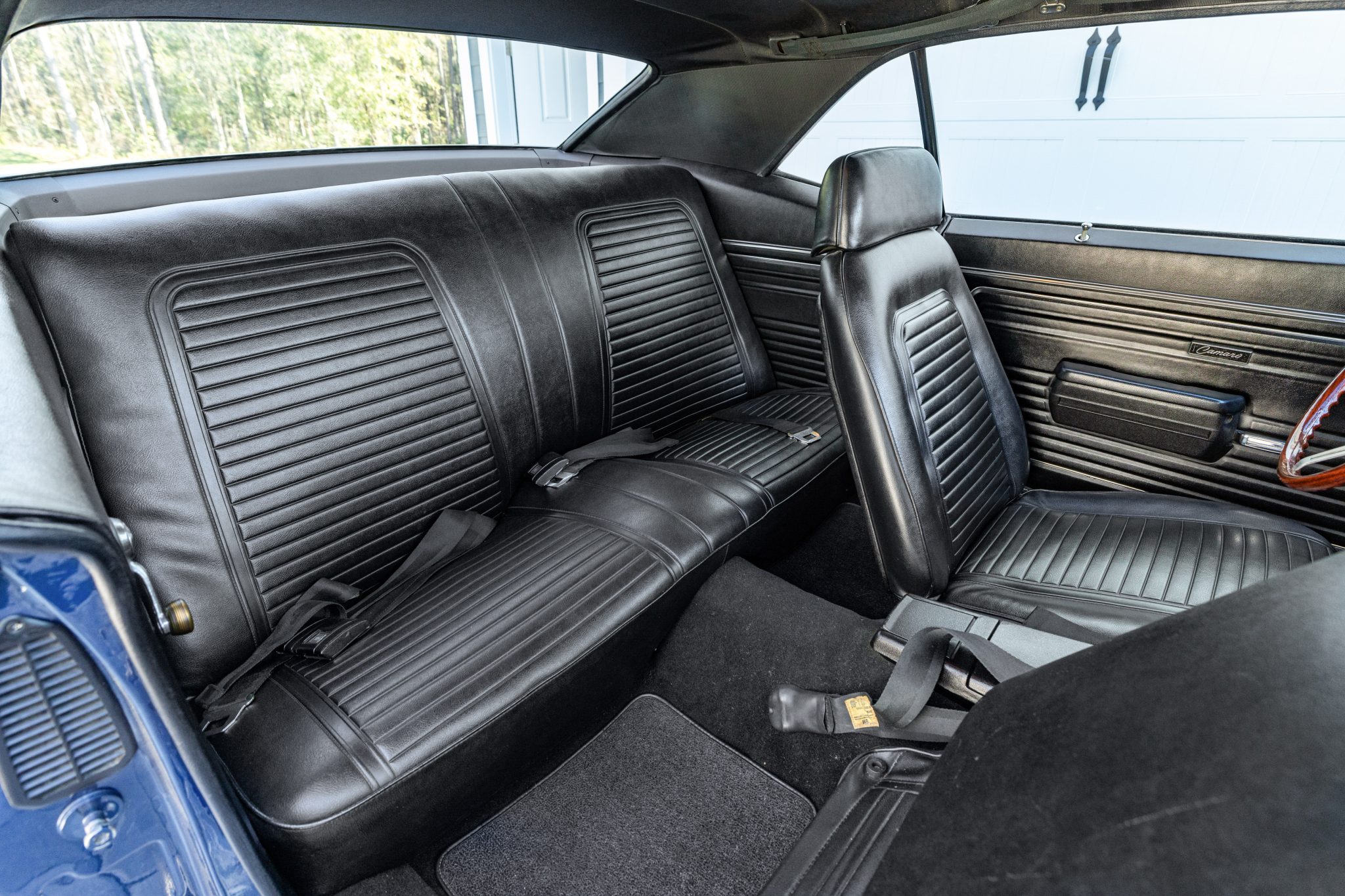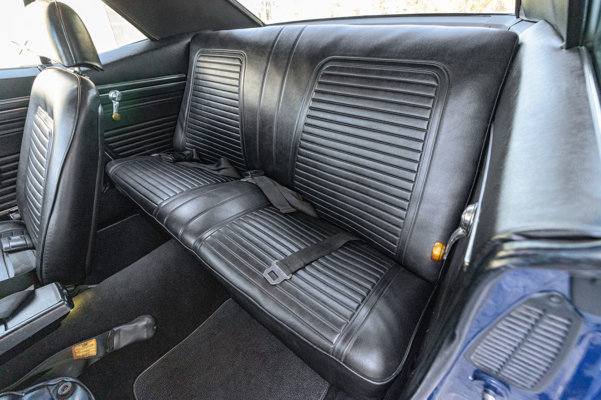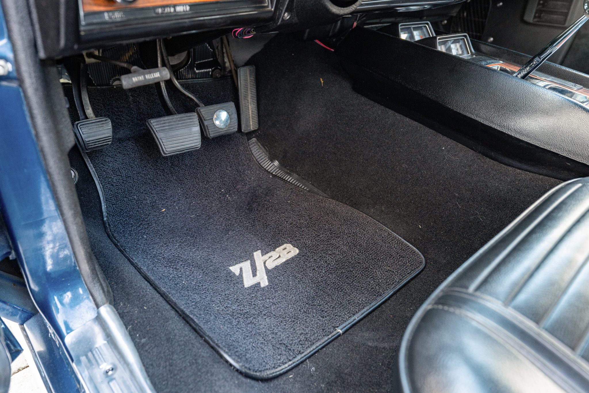 This 1969 Chevrolet Camaro Z/28 was refurbished and is powered by a rebuilt 302ci V8 linked with a four-speed manual transmission and a Positraction differential. The body was refinished in blue with white stripes, and the interior was re-trimmed in black vinyl. Details include a cowl induction hood, front and rear spoilers, a center console, a RetroSound digital stereo, Cragar S/S wheels, and power-assisted front disc brakes. Ridetech adjustable shocks are installed at the front, while QA1 adjustable shocks are mounted at the rear.