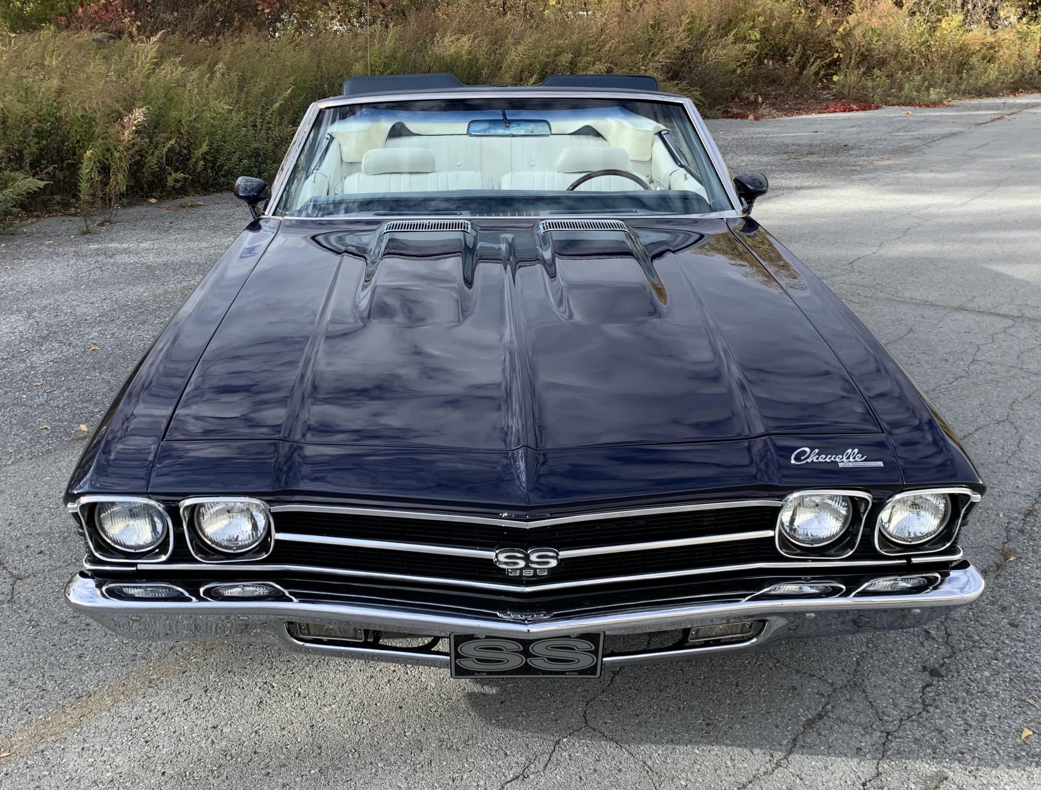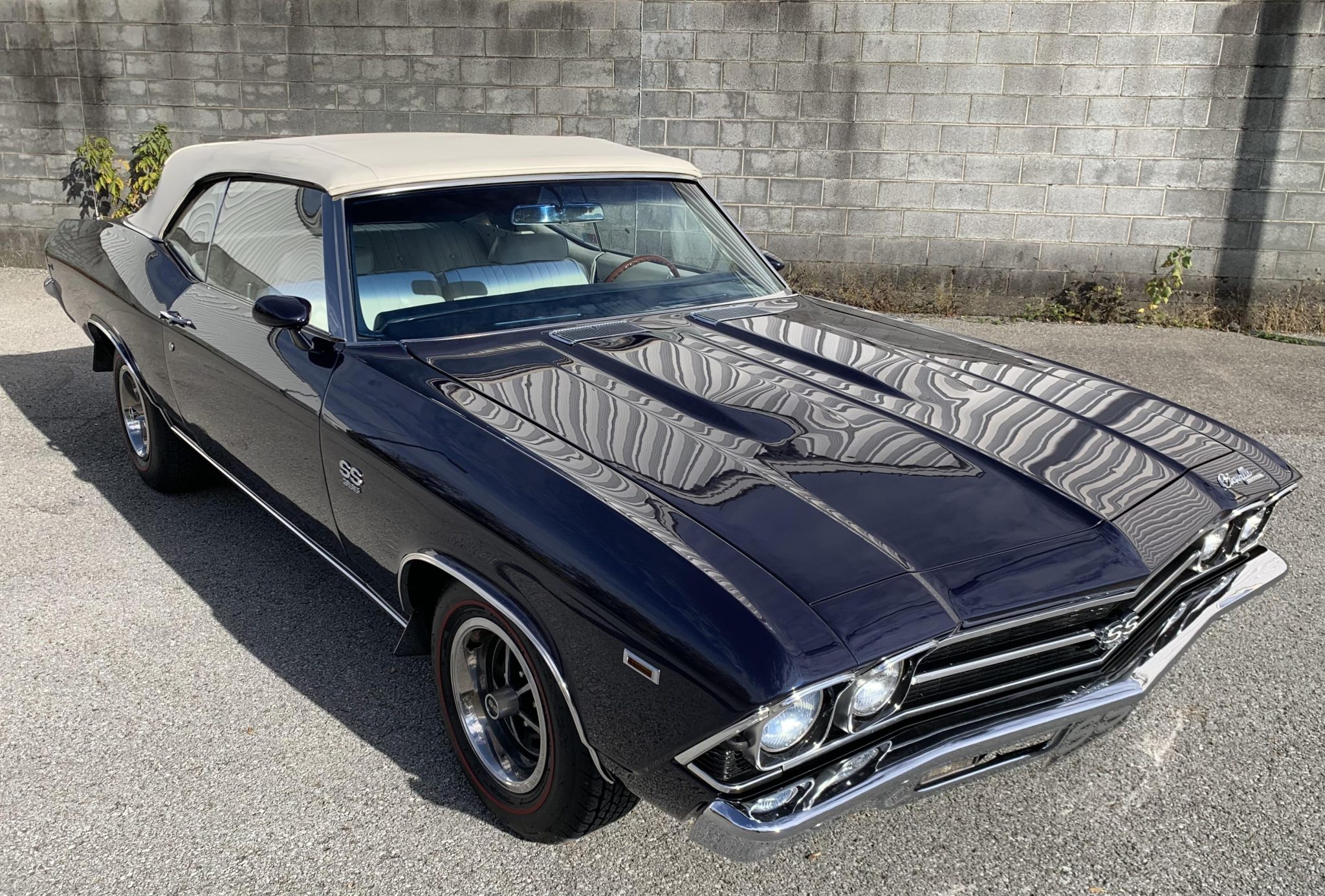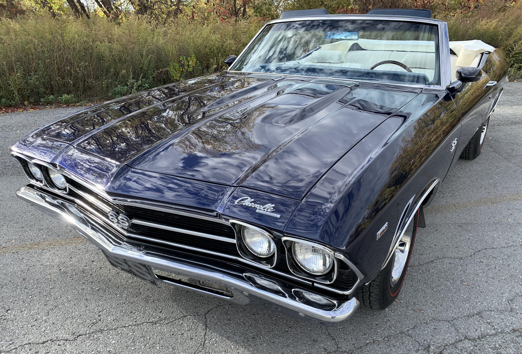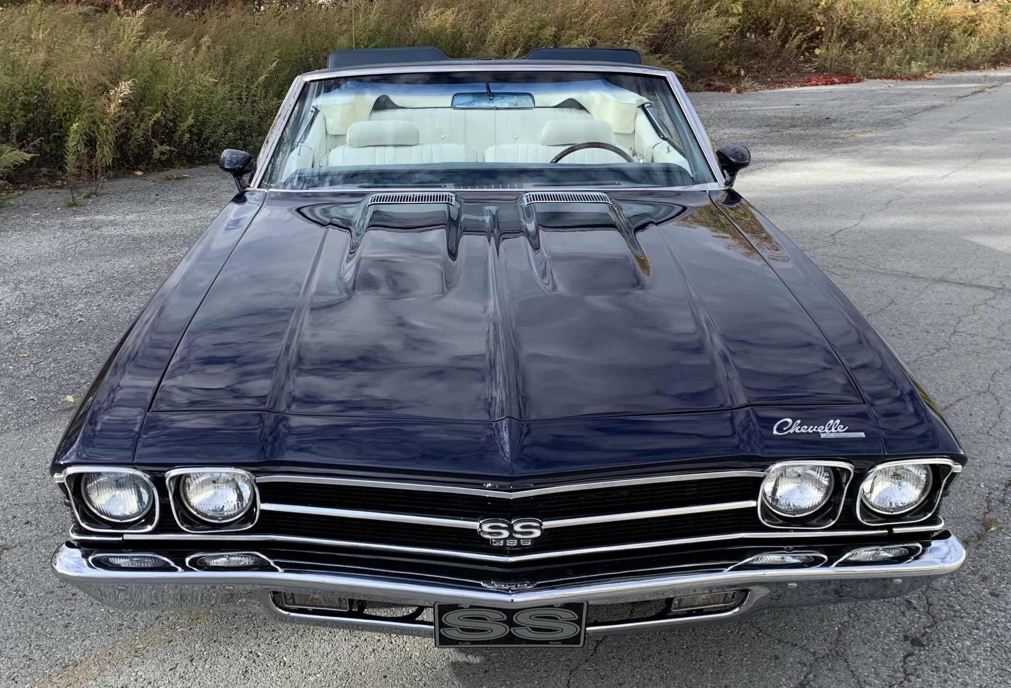 This 1969 Chevrolet Chevelle SS 396 convertible was refurbished in the early 2000s and is powered by a replacement 396ci V8 linked with a three-speed automatic transmission and a 12-bolt PosiTraction rear axle. It is finished in dark blue with a white soft top, and details include SS-style trim and emblems, chrome wheel arch moldings, a dual exhaust system, 14″ Sport wheels, front and rear sway bars, power steering, and front disc brakes. Inside, the bench seats are trimmed in white vinyl and are joined by blue carpets, a push-button radio, a tilting wood-rimmed steering wheel, and a heater.