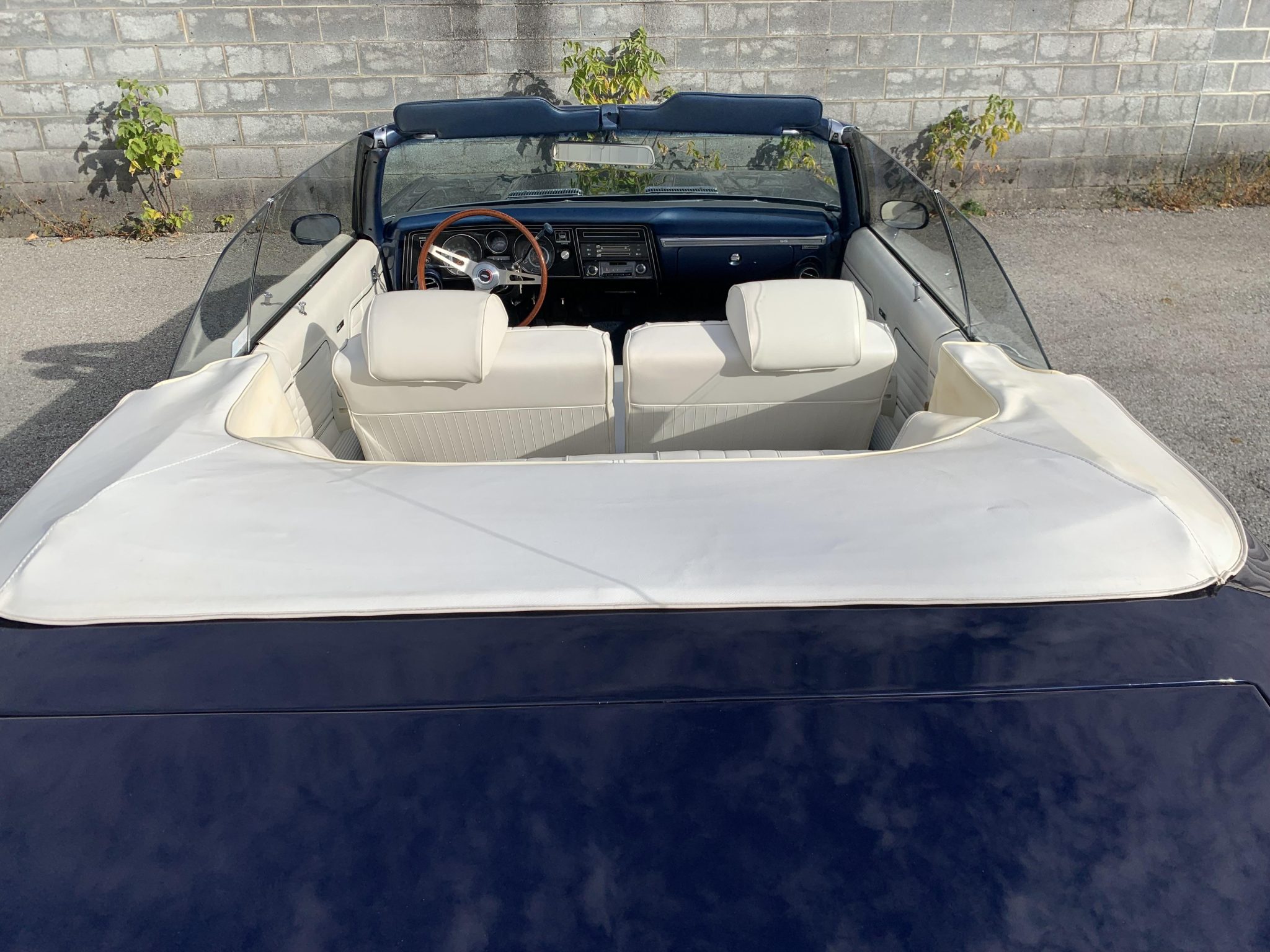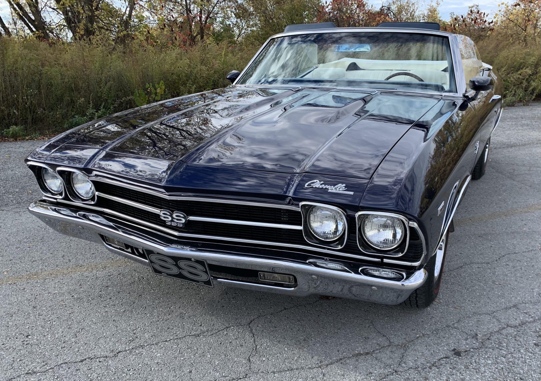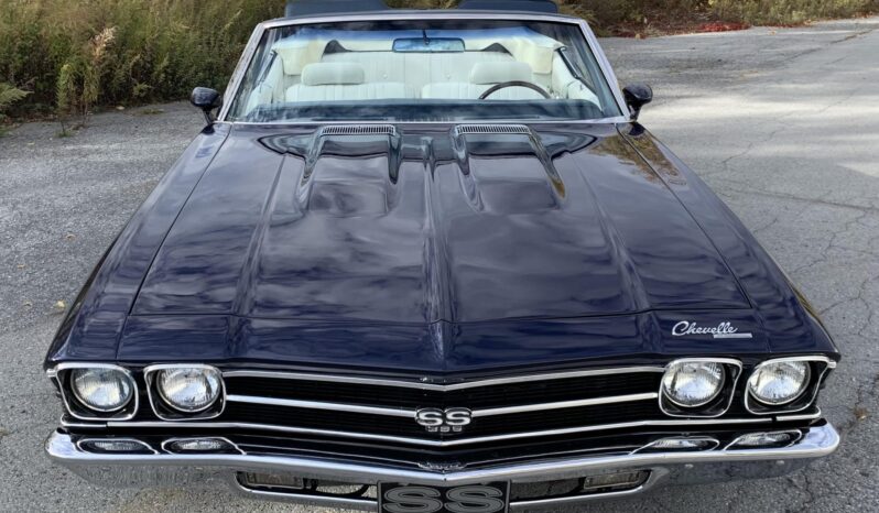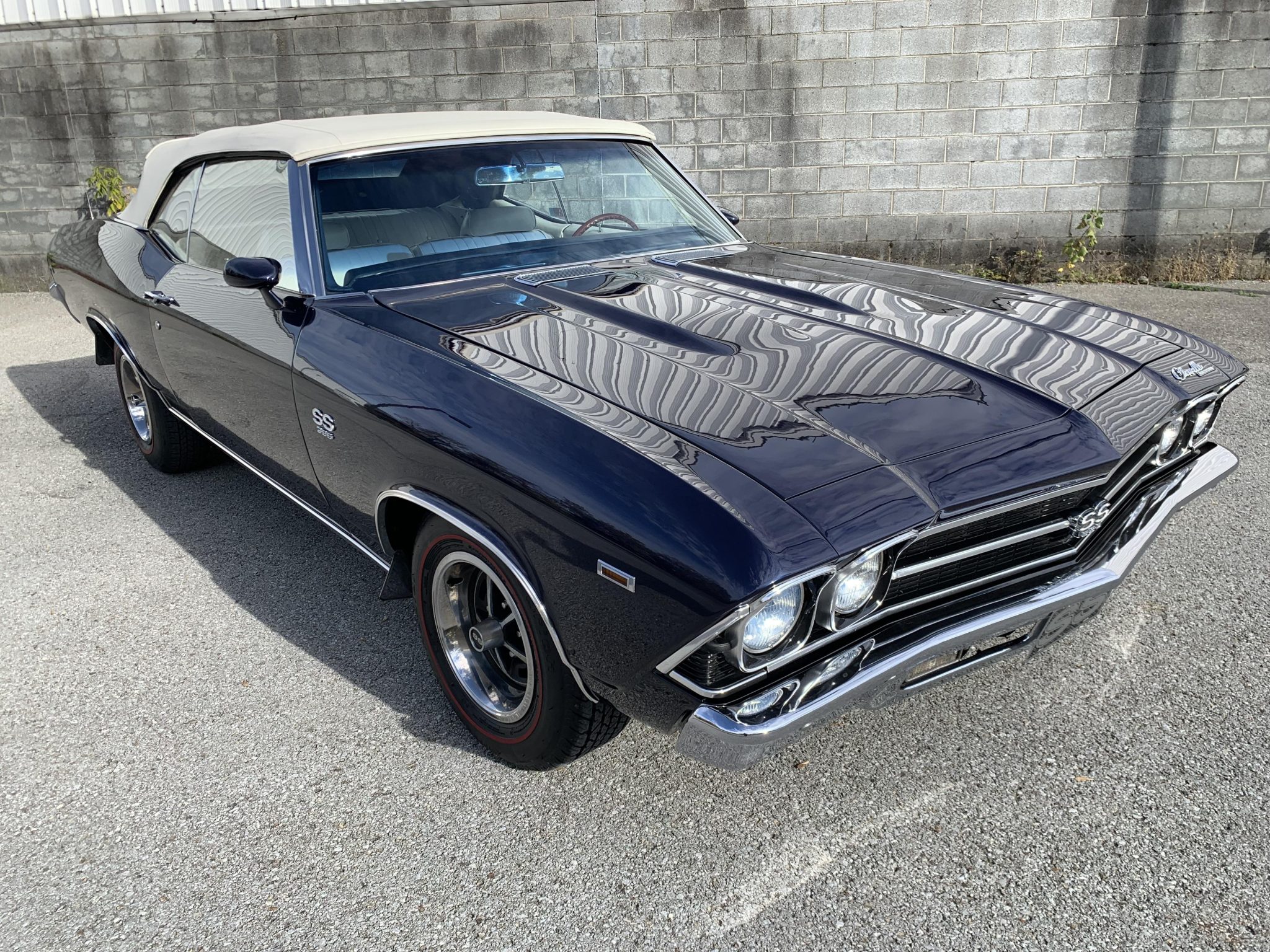 This 1969 Chevrolet Chevelle SS 396 convertible was refurbished in the early 2000s and is powered by a replacement 396ci V8 linked with a three-speed automatic transmission and a 12-bolt PosiTraction rear axle. It is finished in dark blue with a white soft top, and details include SS-style trim and emblems, chrome wheel arch moldings, a dual exhaust system, 14″ Sport wheels, front and rear sway bars, power steering, and front disc brakes. Inside, the bench seats are trimmed in white vinyl and are joined by blue carpets, a push-button radio, a tilting wood-rimmed steering wheel, and a heater.