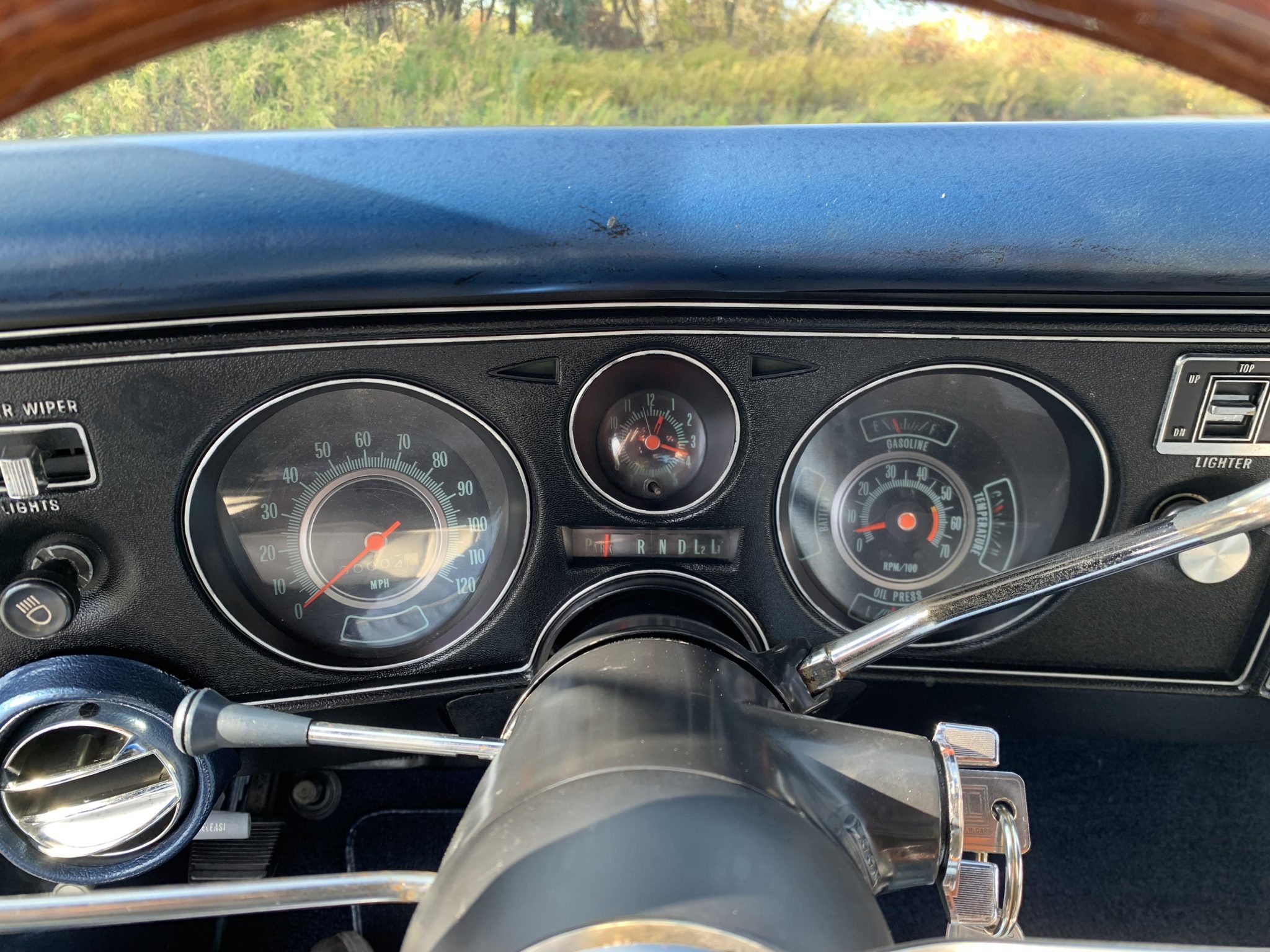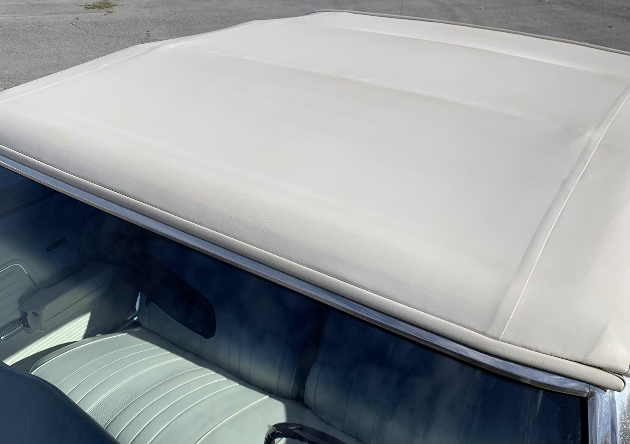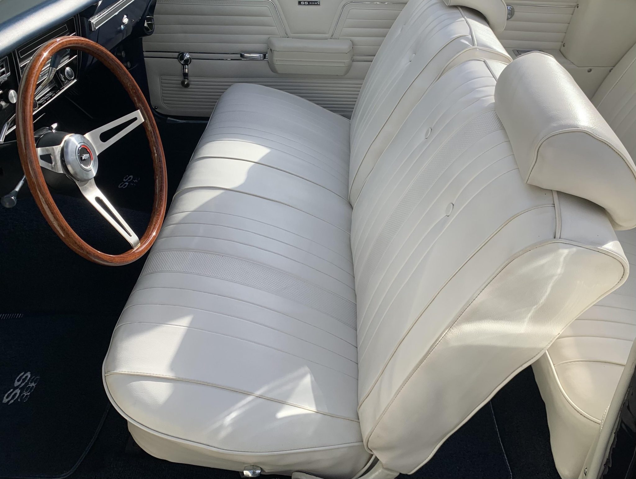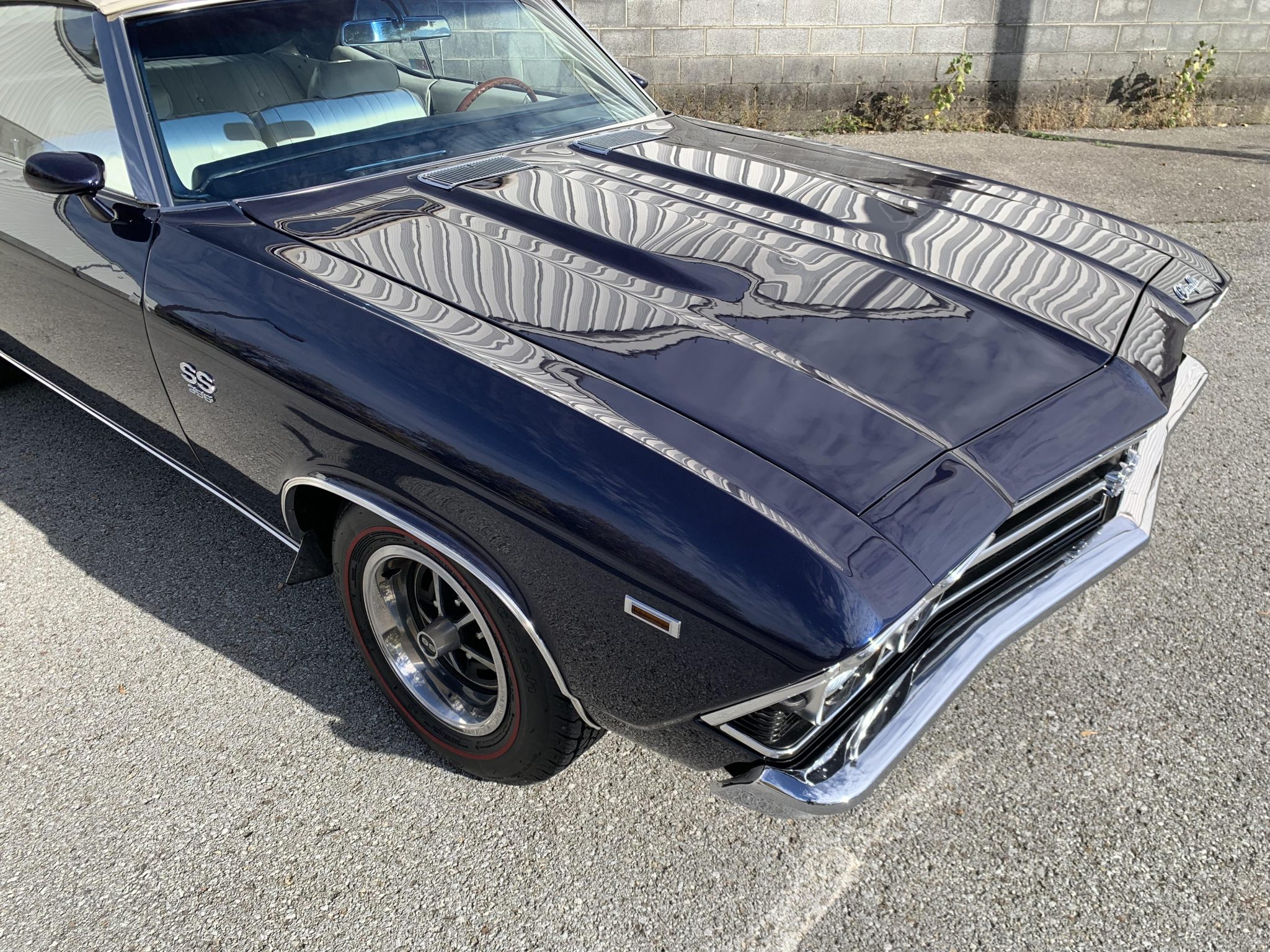 This 1969 Chevrolet Chevelle SS 396 convertible was refurbished in the early 2000s and is powered by a replacement 396ci V8 linked with a three-speed automatic transmission and a 12-bolt PosiTraction rear axle. It is finished in dark blue with a white soft top, and details include SS-style trim and emblems, chrome wheel arch moldings, a dual exhaust system, 14″ Sport wheels, front and rear sway bars, power steering, and front disc brakes. Inside, the bench seats are trimmed in white vinyl and are joined by blue carpets, a push-button radio, a tilting wood-rimmed steering wheel, and a heater.