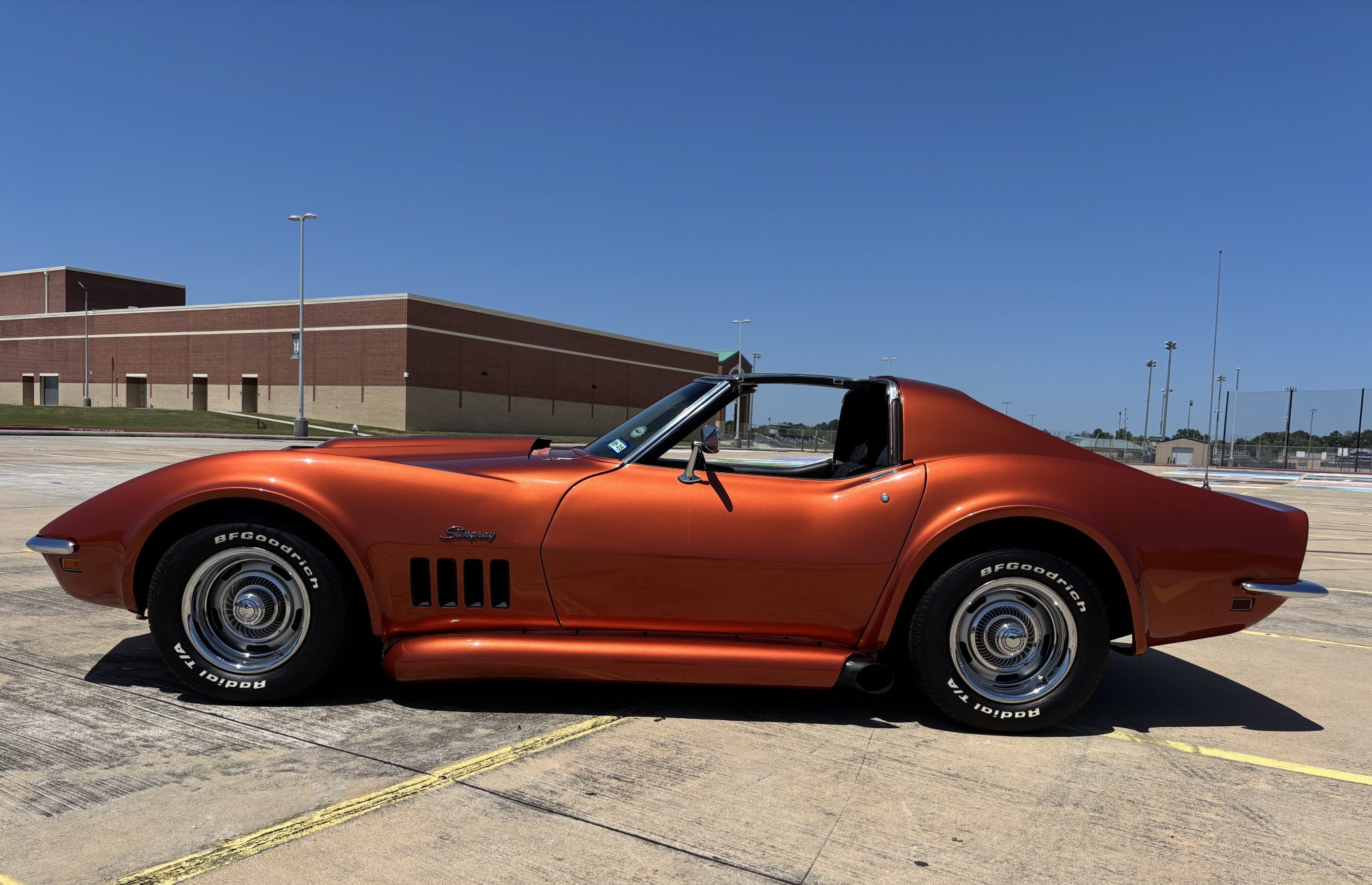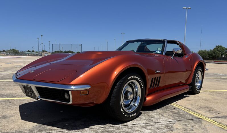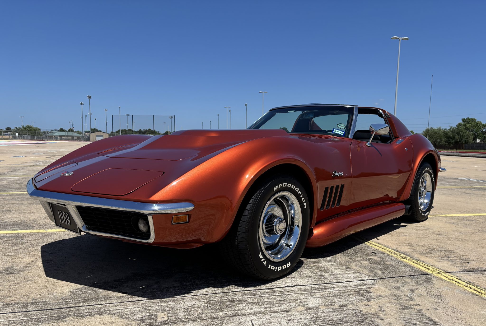 This 1969 Chevrolet Corvette coupe is powered by a 350ci L46 V8 paired with a four-speed manual transmission. Additional equipment includes a domed hood, removable roof panels, 15″ Rally wheels, four-wheel disc brakes, an AM/FM radio, chrome bumpers, and hideaway headlights.
