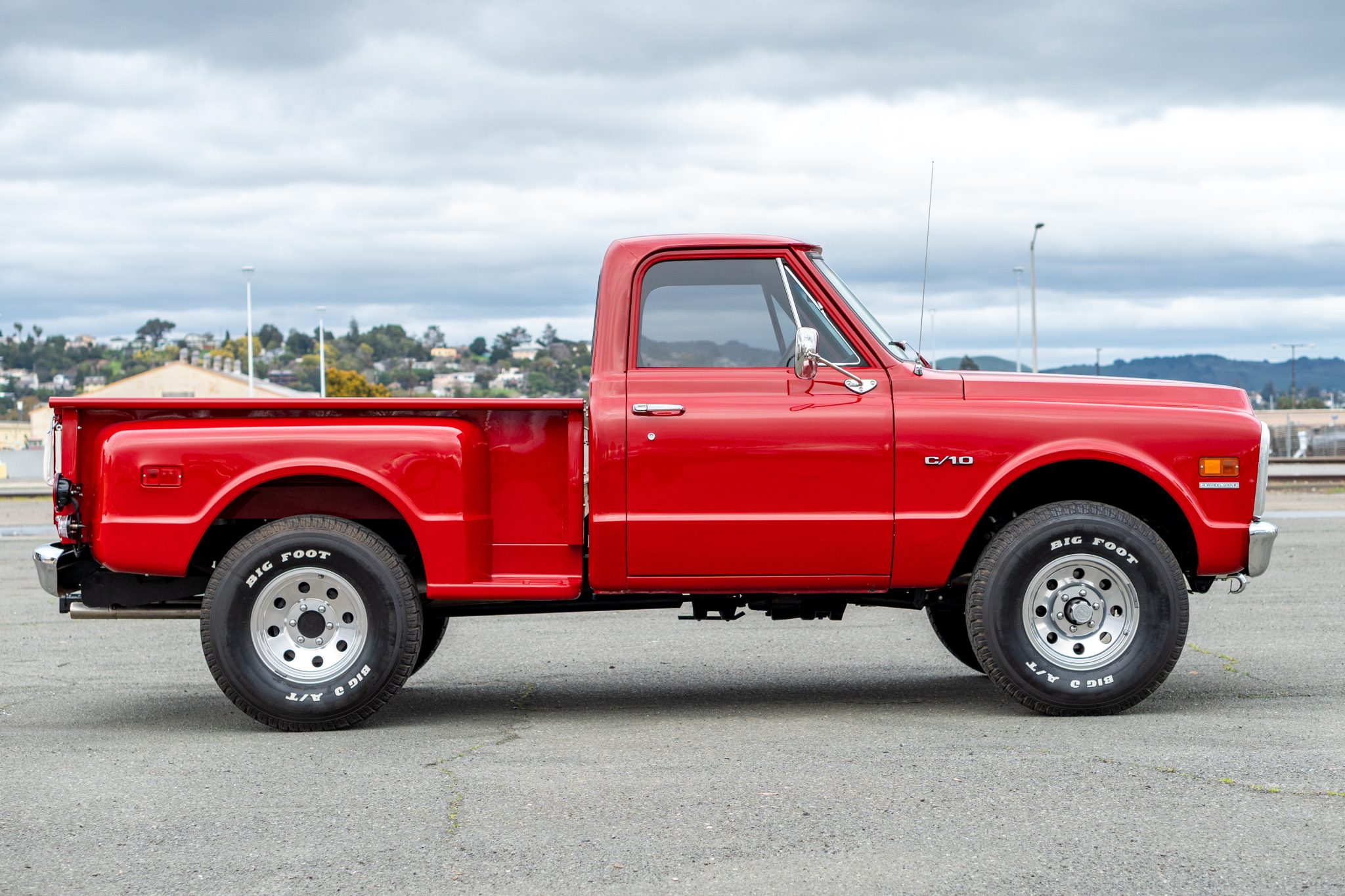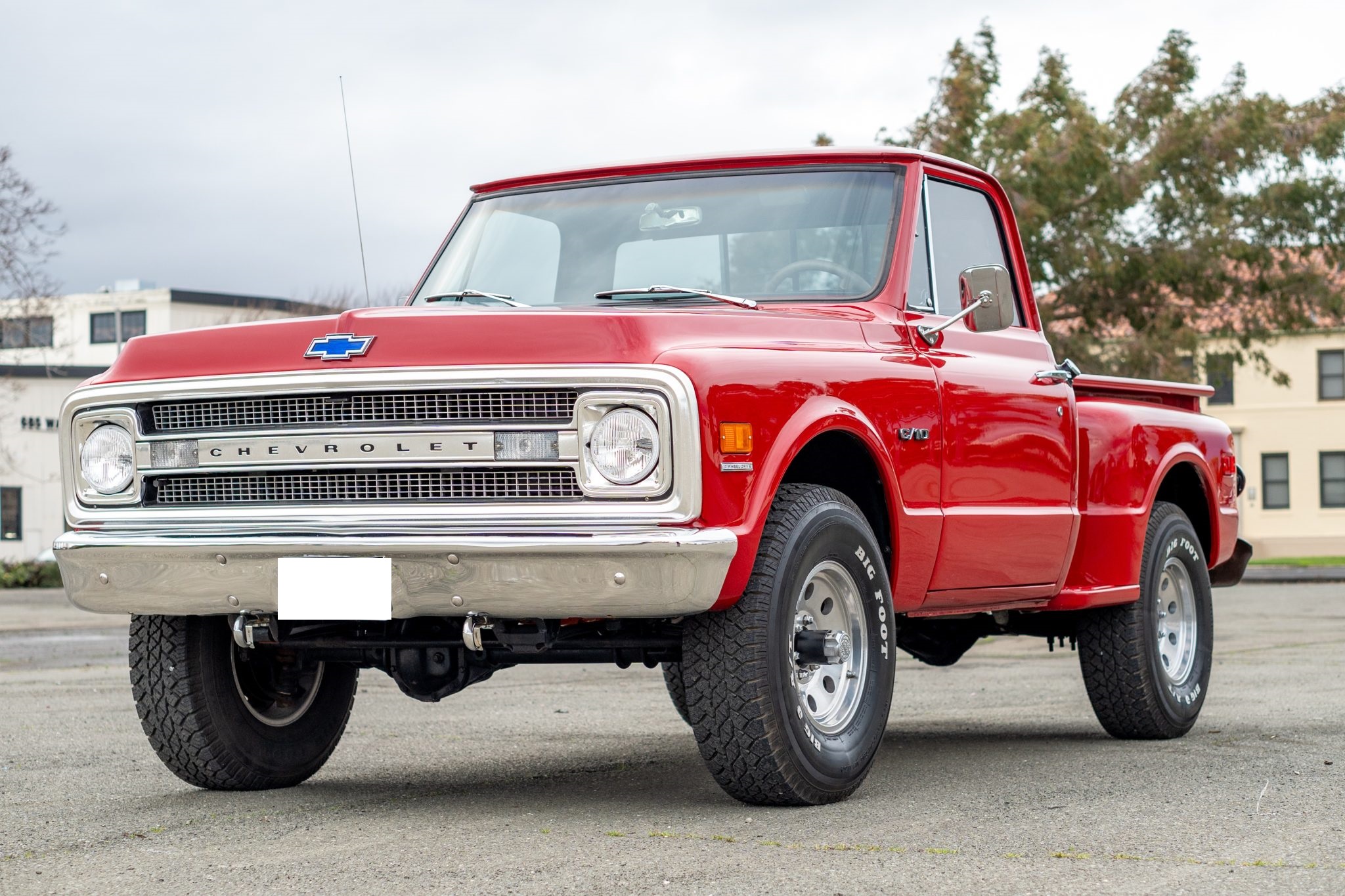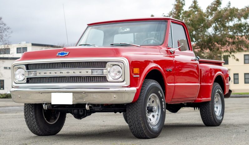 This 1969 Chevrolet K10 Custom 4×4 Stepside pickup was repainted in red and subsequently refurbished. Work is said to have involved replacing the carburetor and overhauling the transfer case in addition to reupholstering the bench seat in black vinyl. The truck is further equipped with a four-speed manual transmission, 16″ alloy wheels, front disc brakes, power steering, a receiver hitch, a sliding rear window, and a Bluetooth-capable stereo.