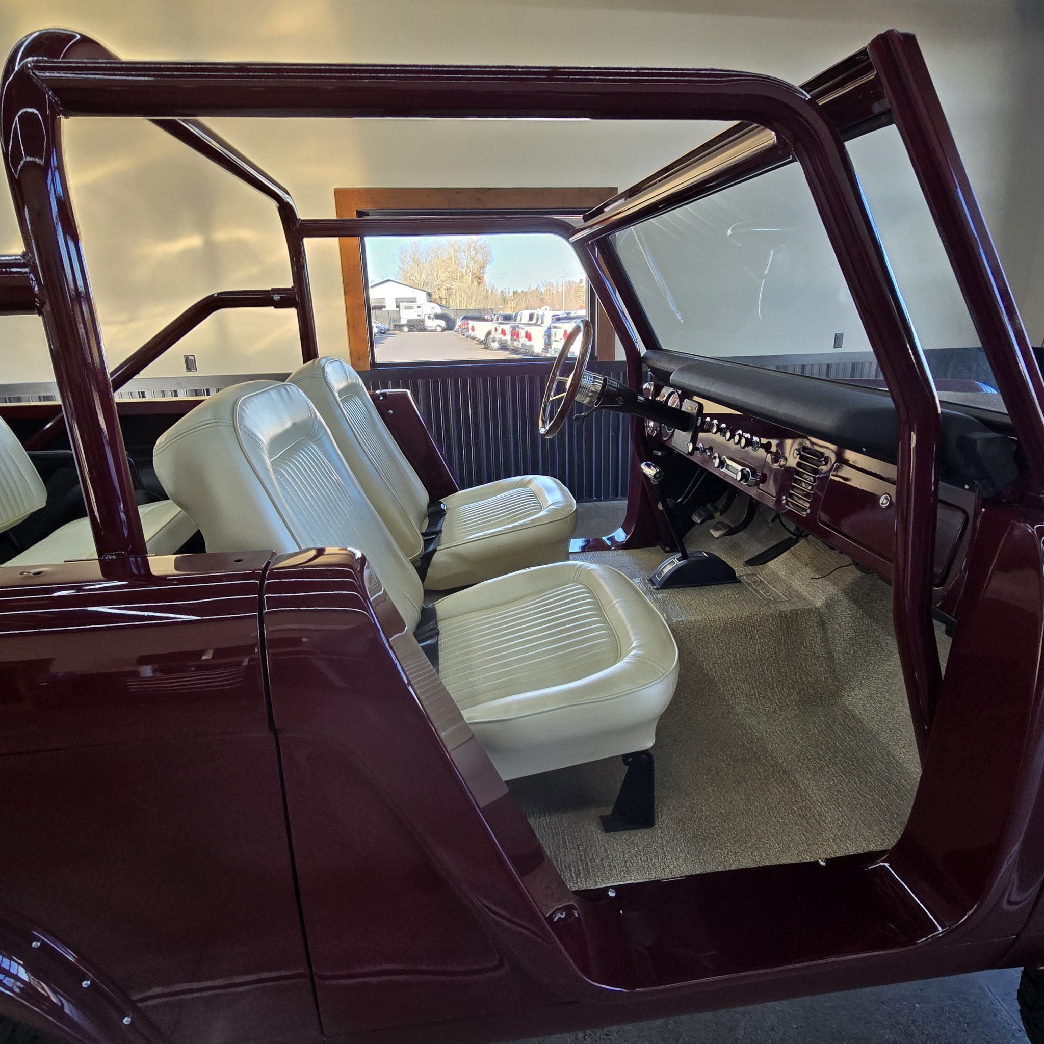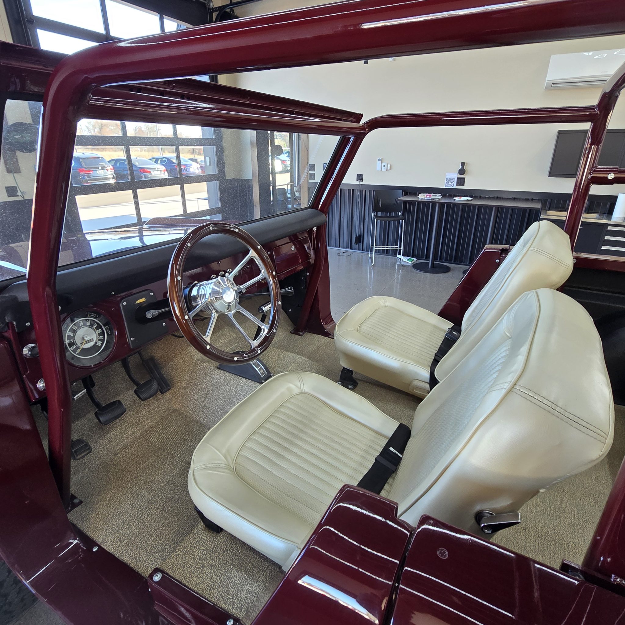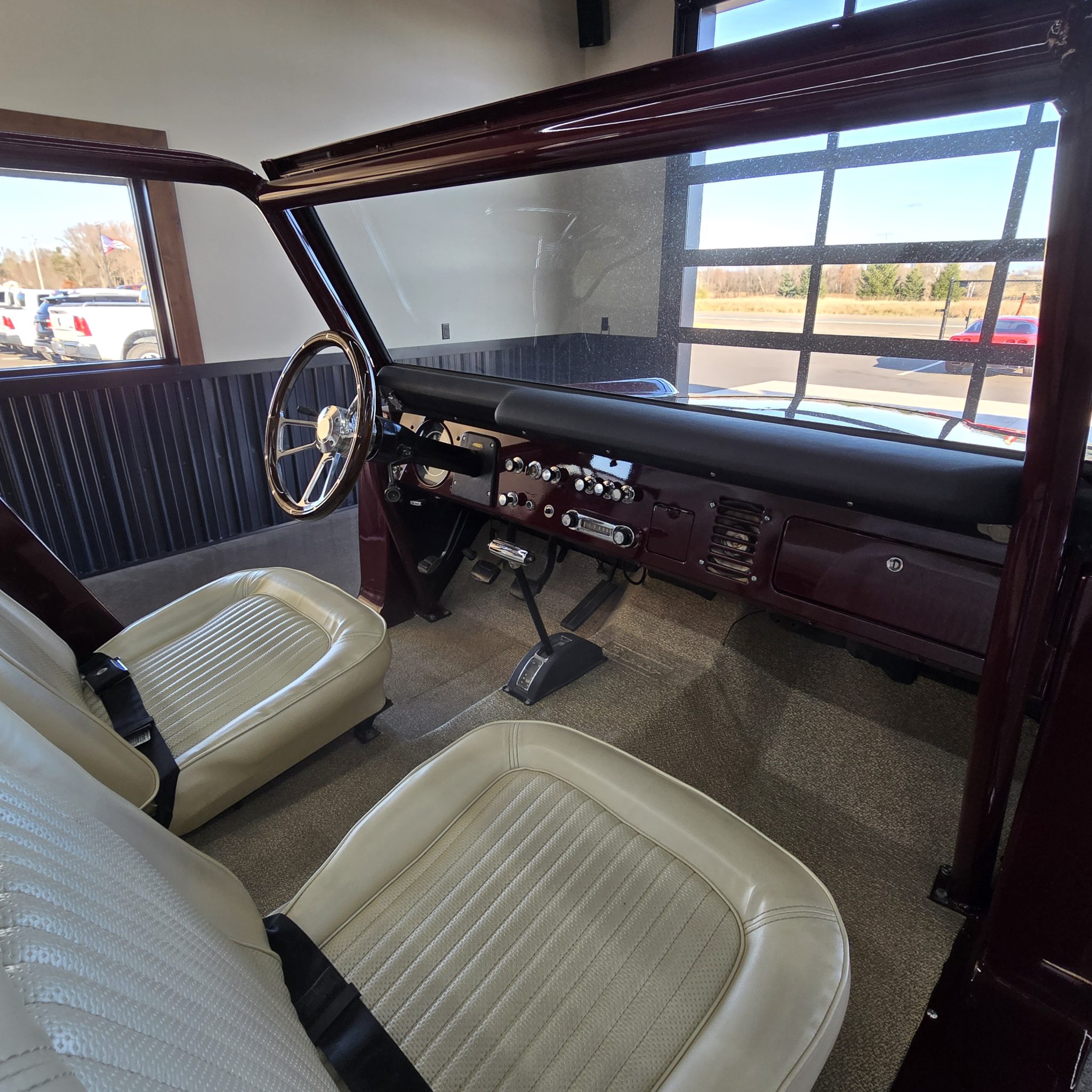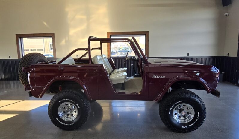 This 1969 Ford Bronco was refurbished under prior ownership, and it rides on a 5″ suspension lift with Skyjacker springs and shocks over 15″ American Racing wheels mounted with 35×12.5″ BFGoodrich All-Terrain T/A KO2 tires. The truck is finished in maroon over white vinyl upholstery and is powered by a 302ci V8 linked to a three-speed manual transmission and a dual-range transfer case. Additional equipment includes manually locking front hubs, a roll bar, an AM/FM radio, and lap belts.