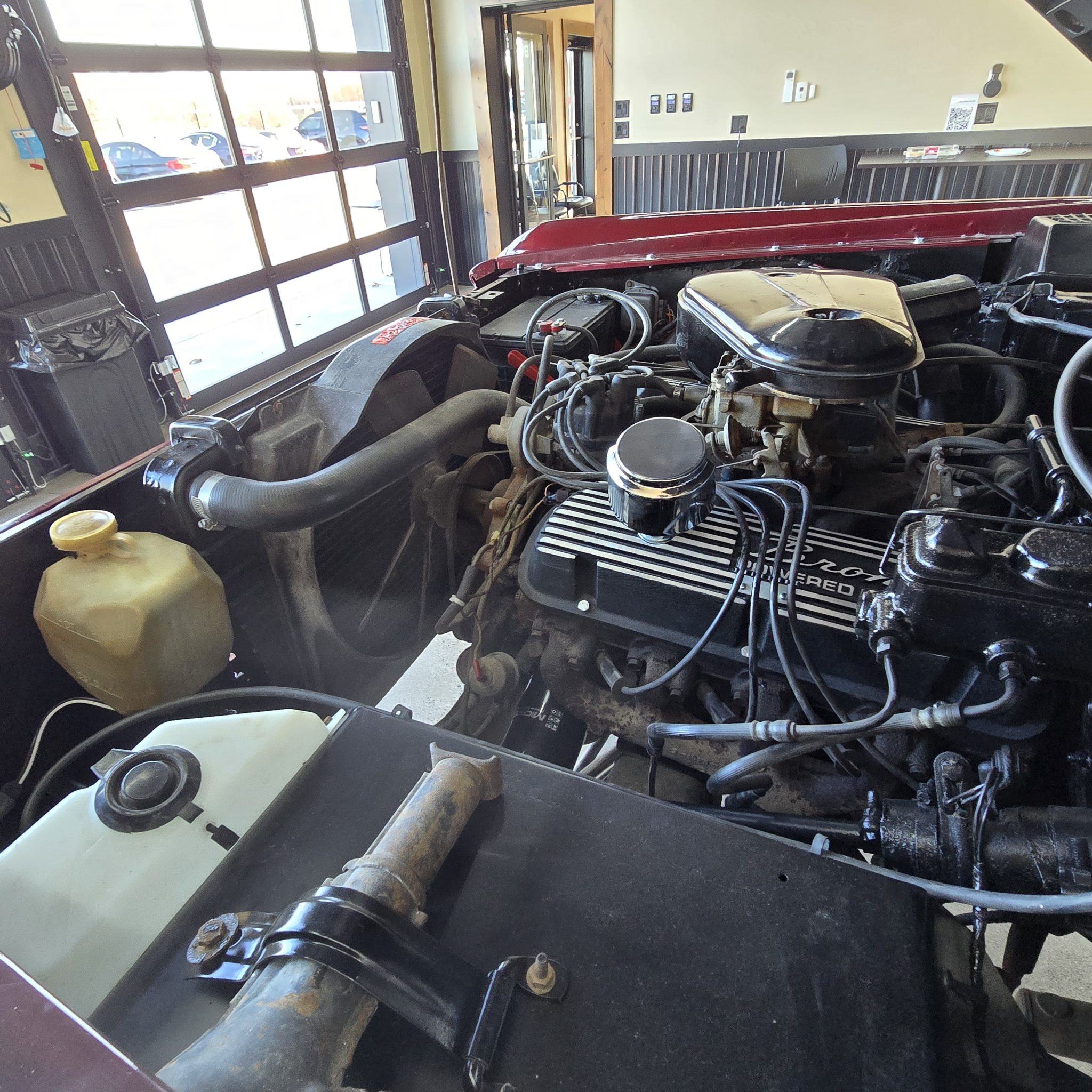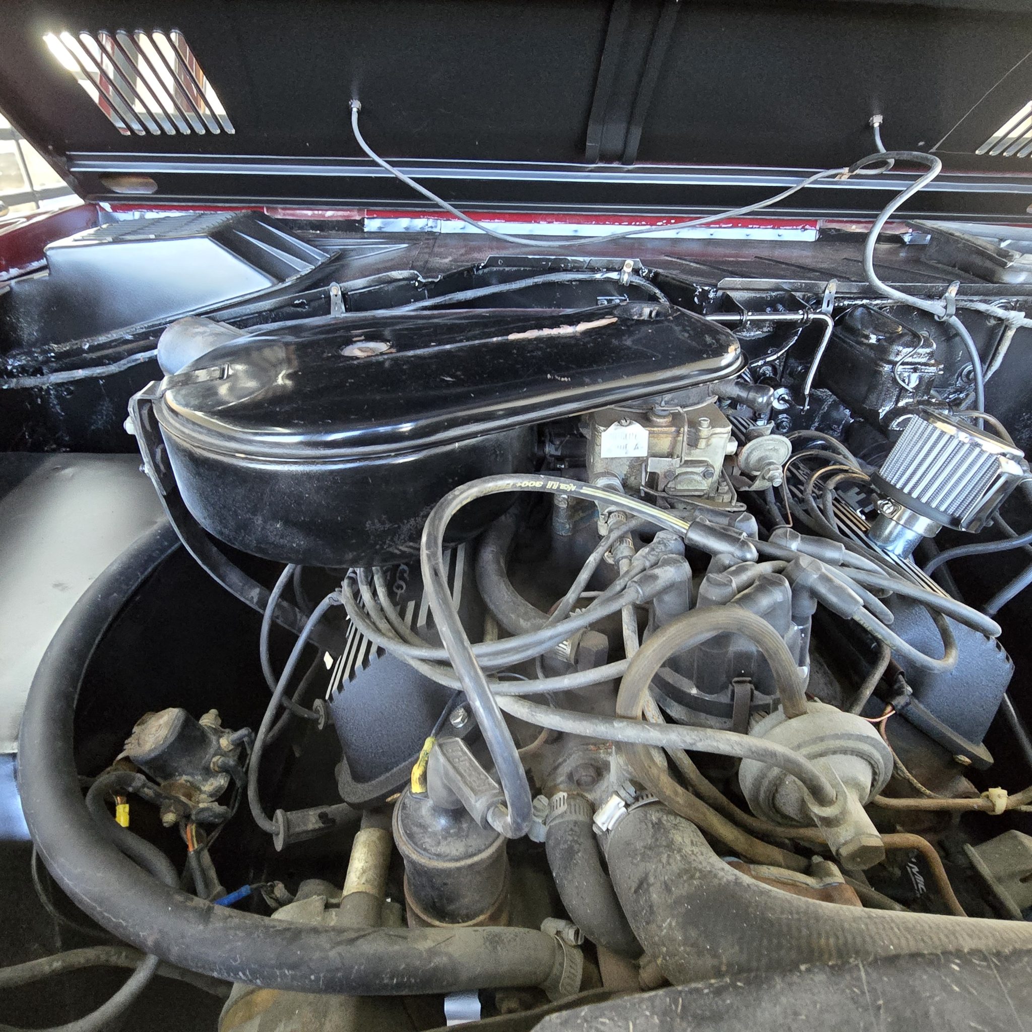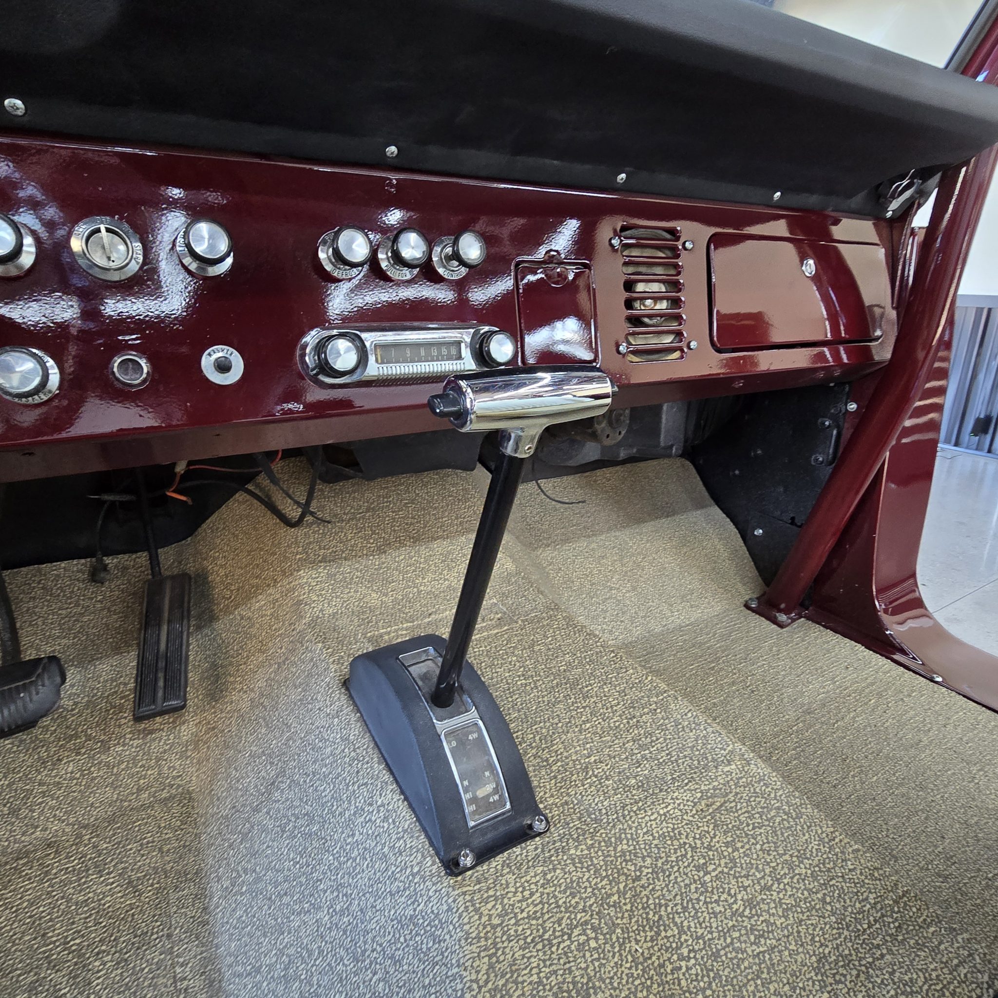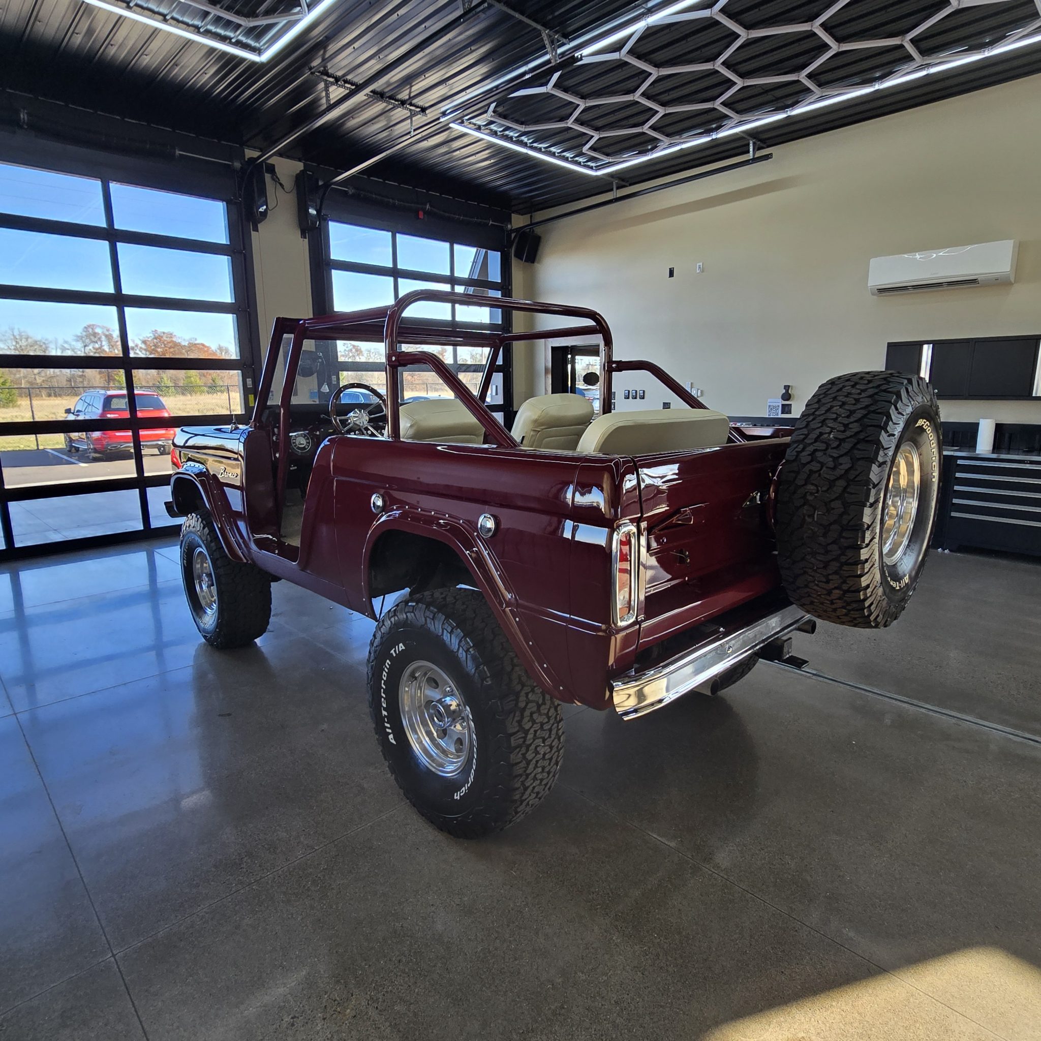 This 1969 Ford Bronco was refurbished under prior ownership, and it rides on a 5″ suspension lift with Skyjacker springs and shocks over 15″ American Racing wheels mounted with 35×12.5″ BFGoodrich All-Terrain T/A KO2 tires. The truck is finished in maroon over white vinyl upholstery and is powered by a 302ci V8 linked to a three-speed manual transmission and a dual-range transfer case. Additional equipment includes manually locking front hubs, a roll bar, an AM/FM radio, and lap belts.