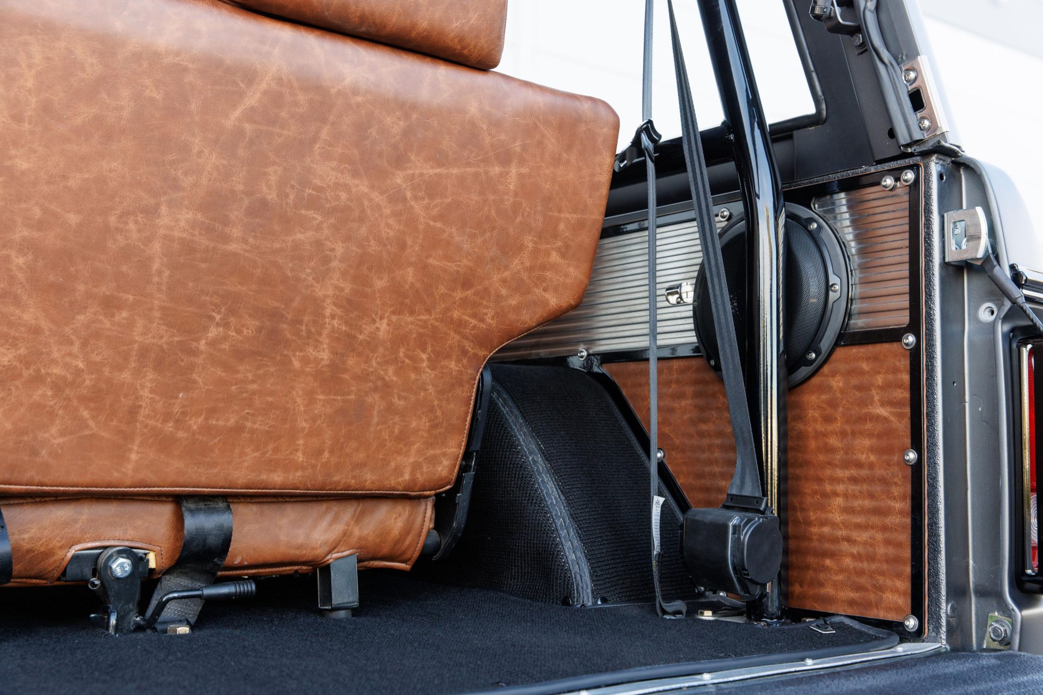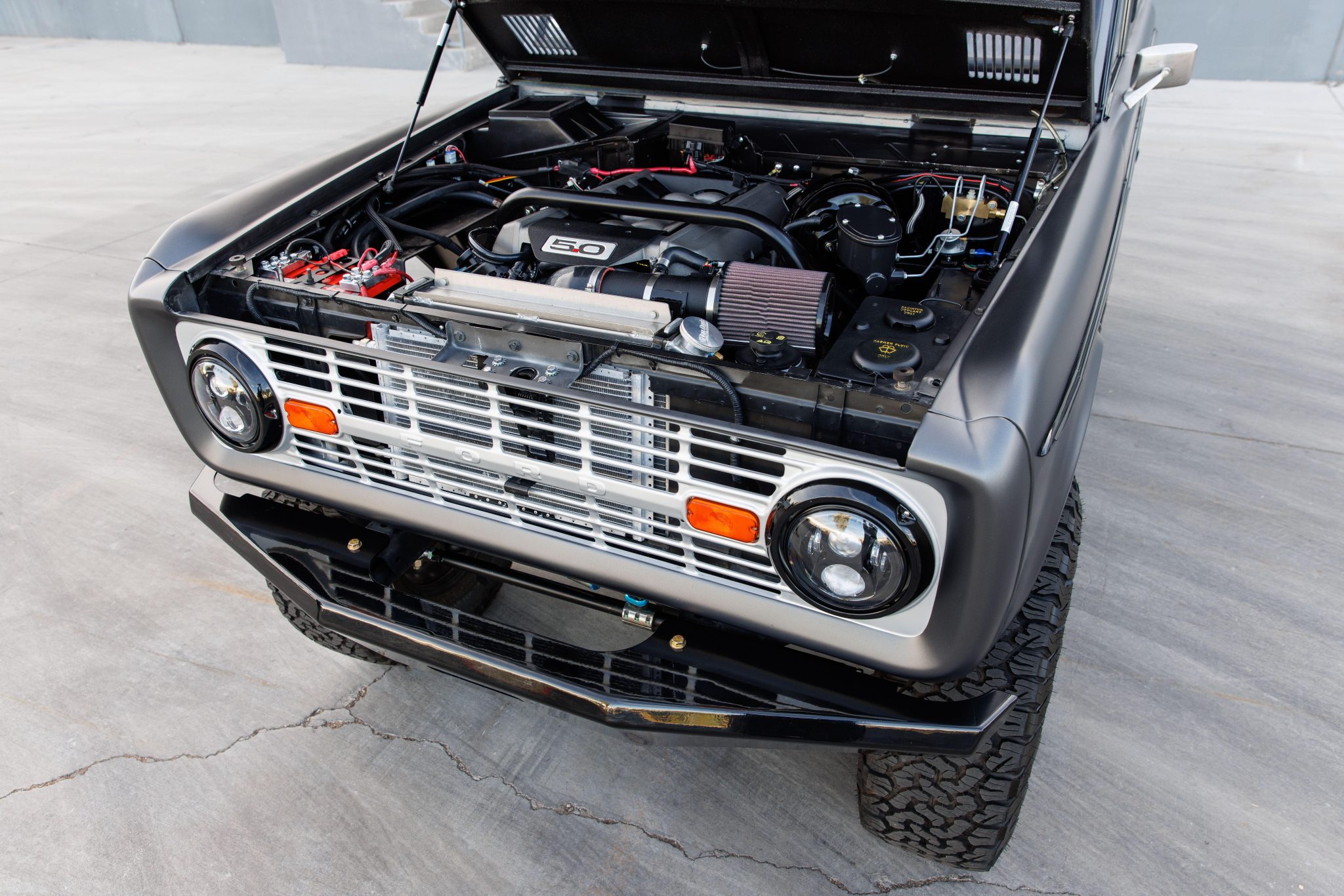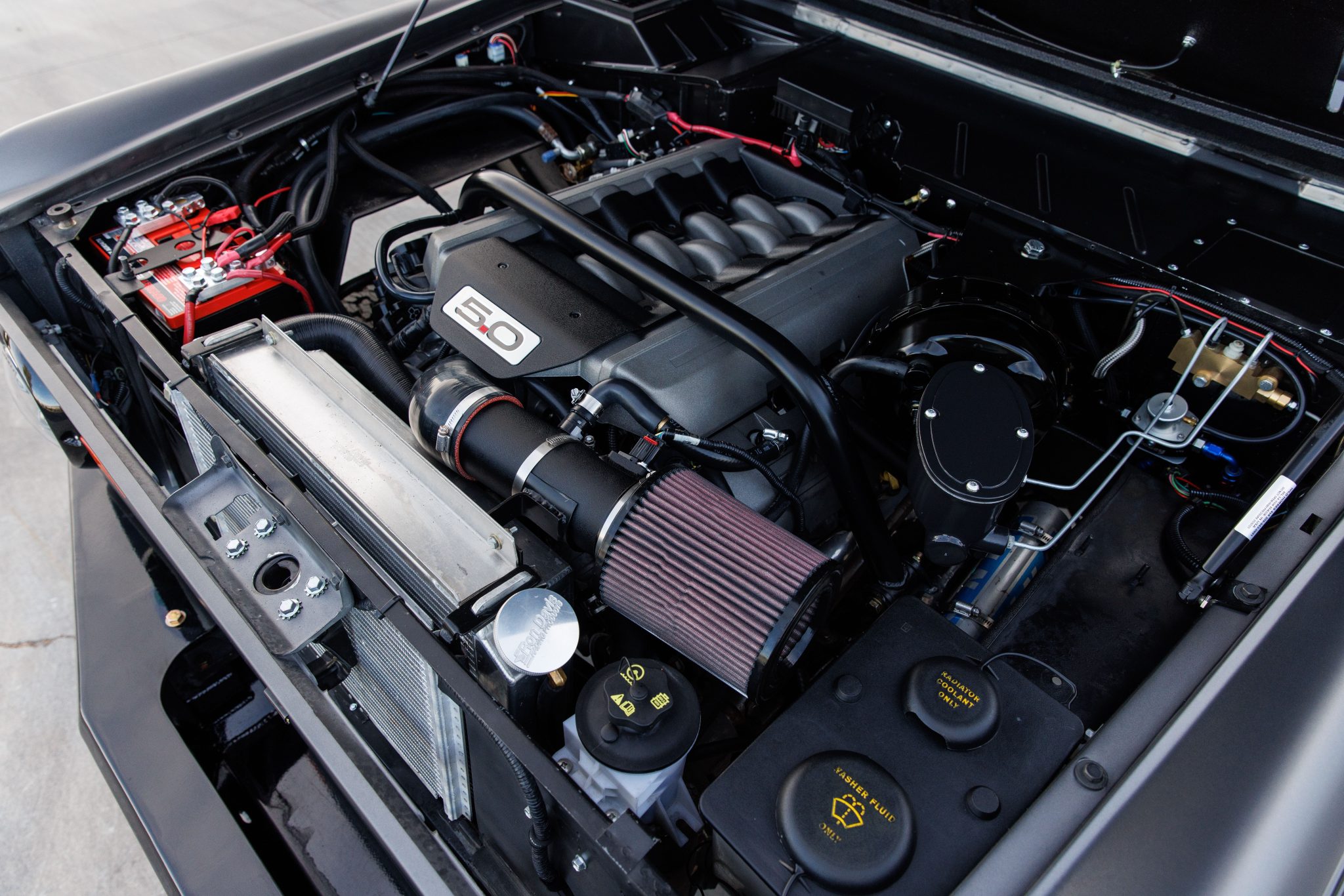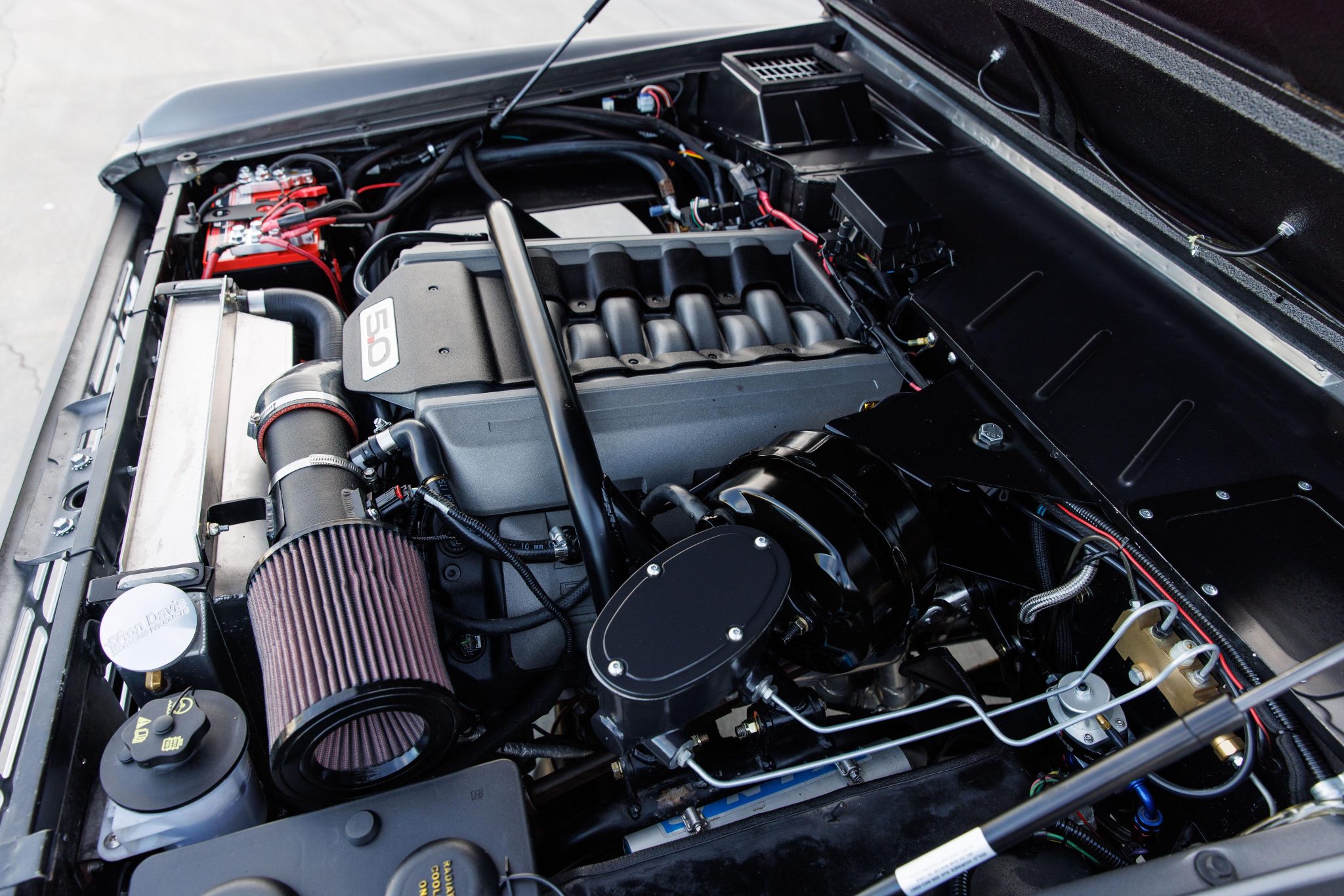 The truck was refinished in matte gray with metallic flake over custom brown Relicate leather upholstery, and a 5.0-liter Coyote V8 crate engine was installed along with a six-speed automatic transmission and a twin-stick dual-range transfer case. Both body and suspension lifts were installed along with four-wheel disc brakes, King remote-reservoir shocks, Warn manually locking front hubs, and 17″ Method wheels. Inside, ICON 4×4 trim pieces are fitted along with a family roll bar, a center console, Air Hurricane air conditioning, a Pioneer infotainment system, aftermarket audio components, power windows, and Dakota Digital gauges.