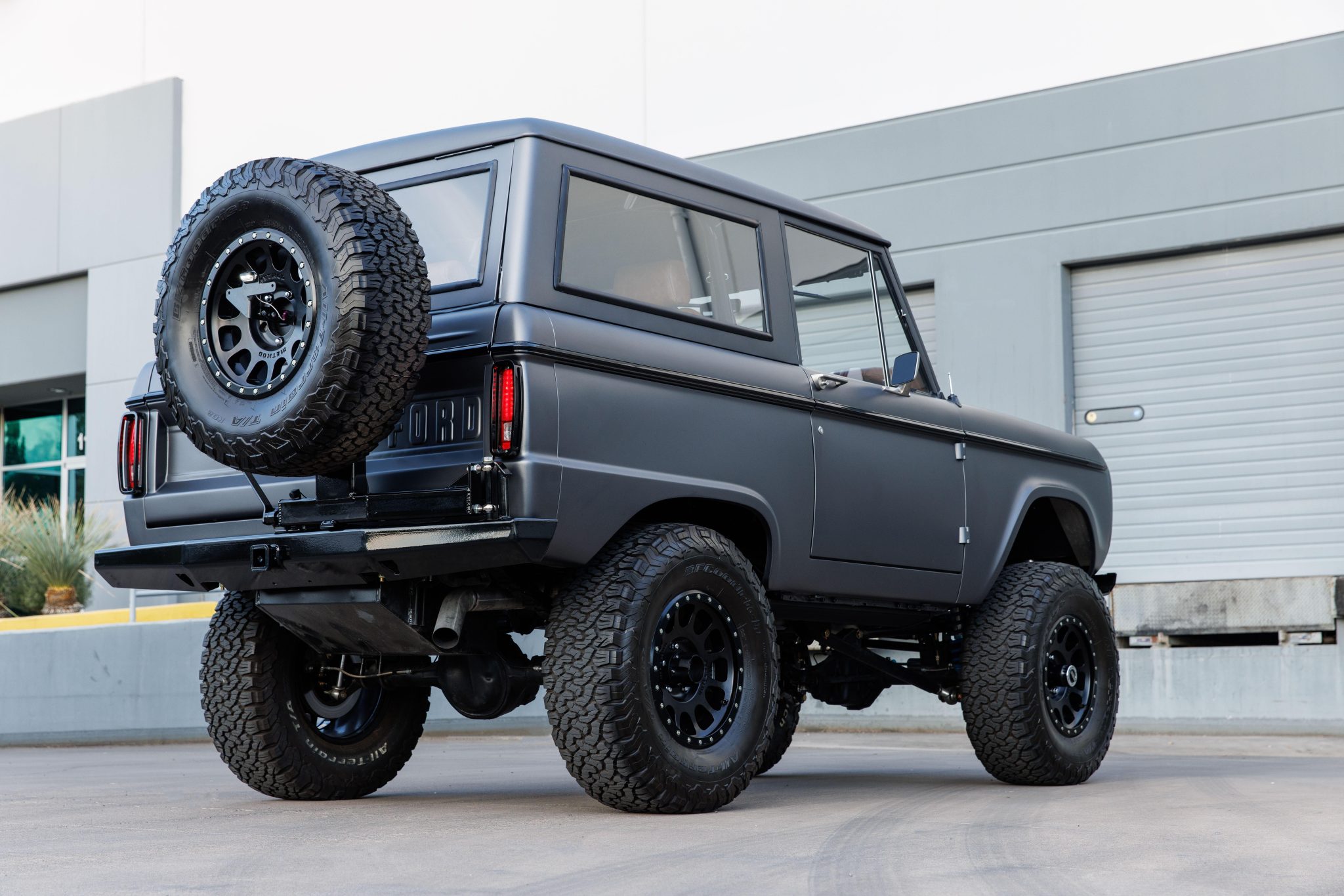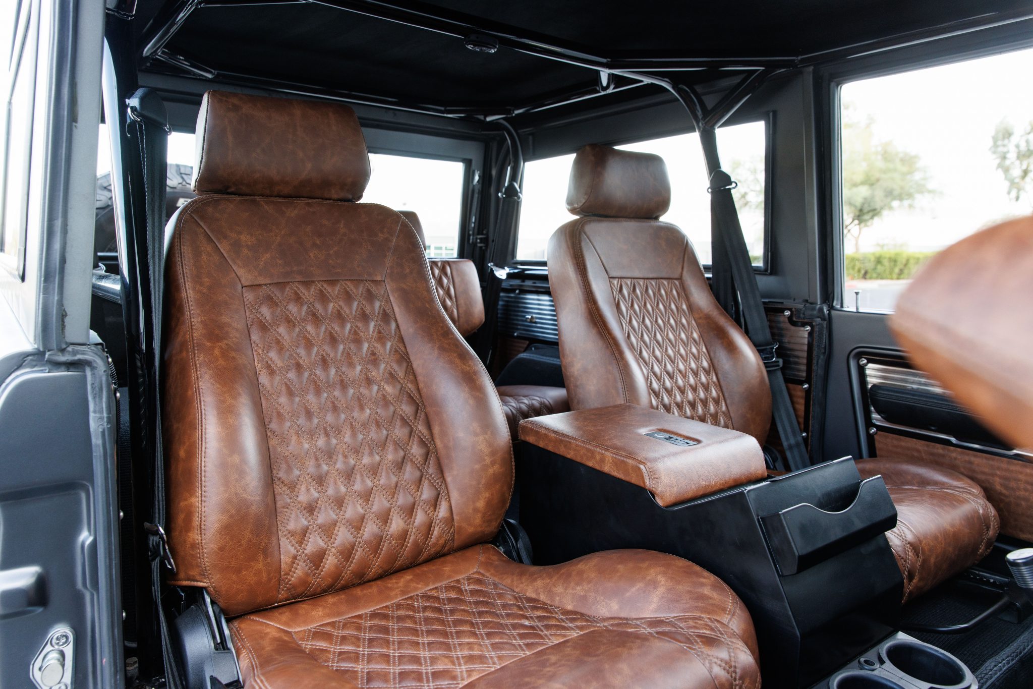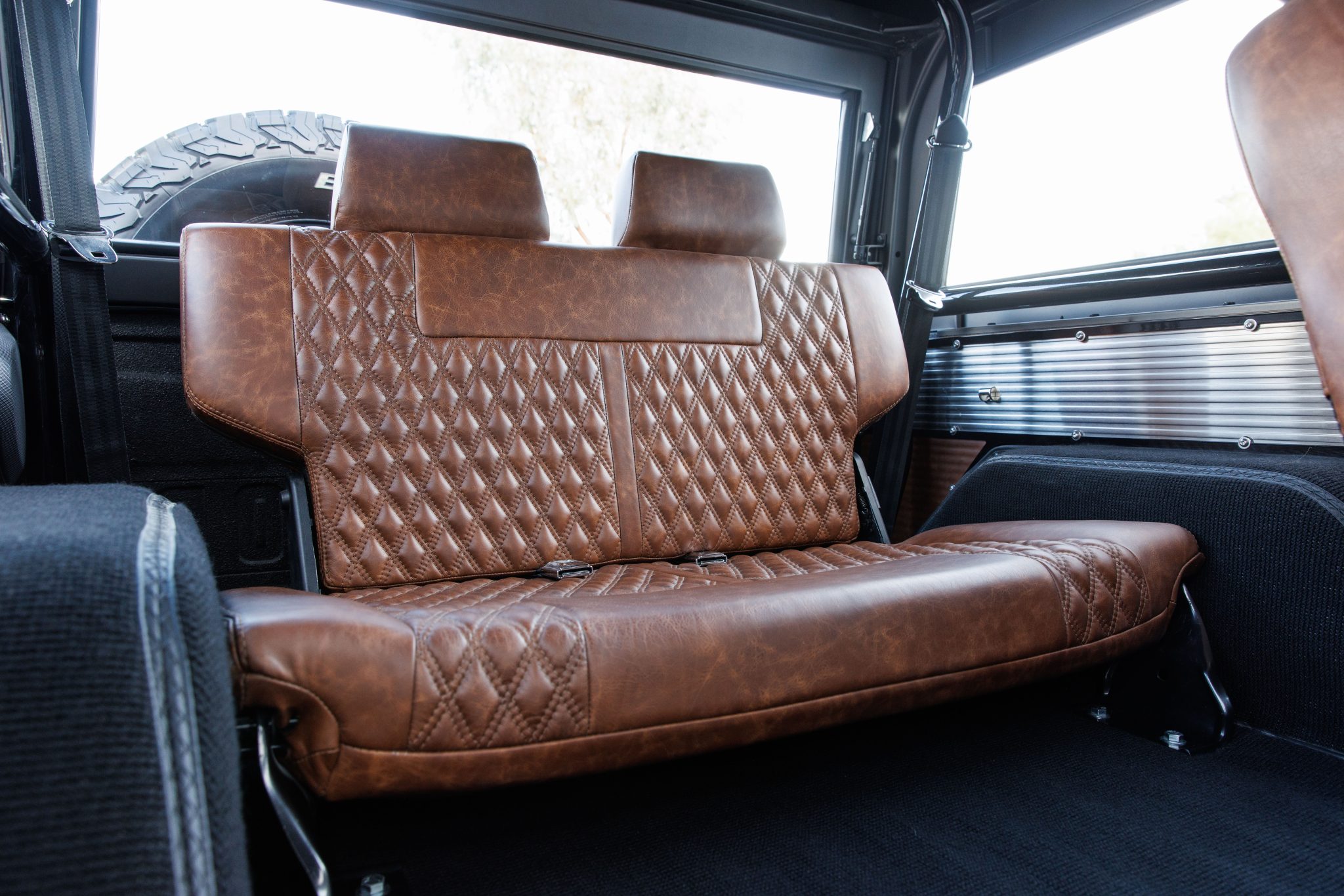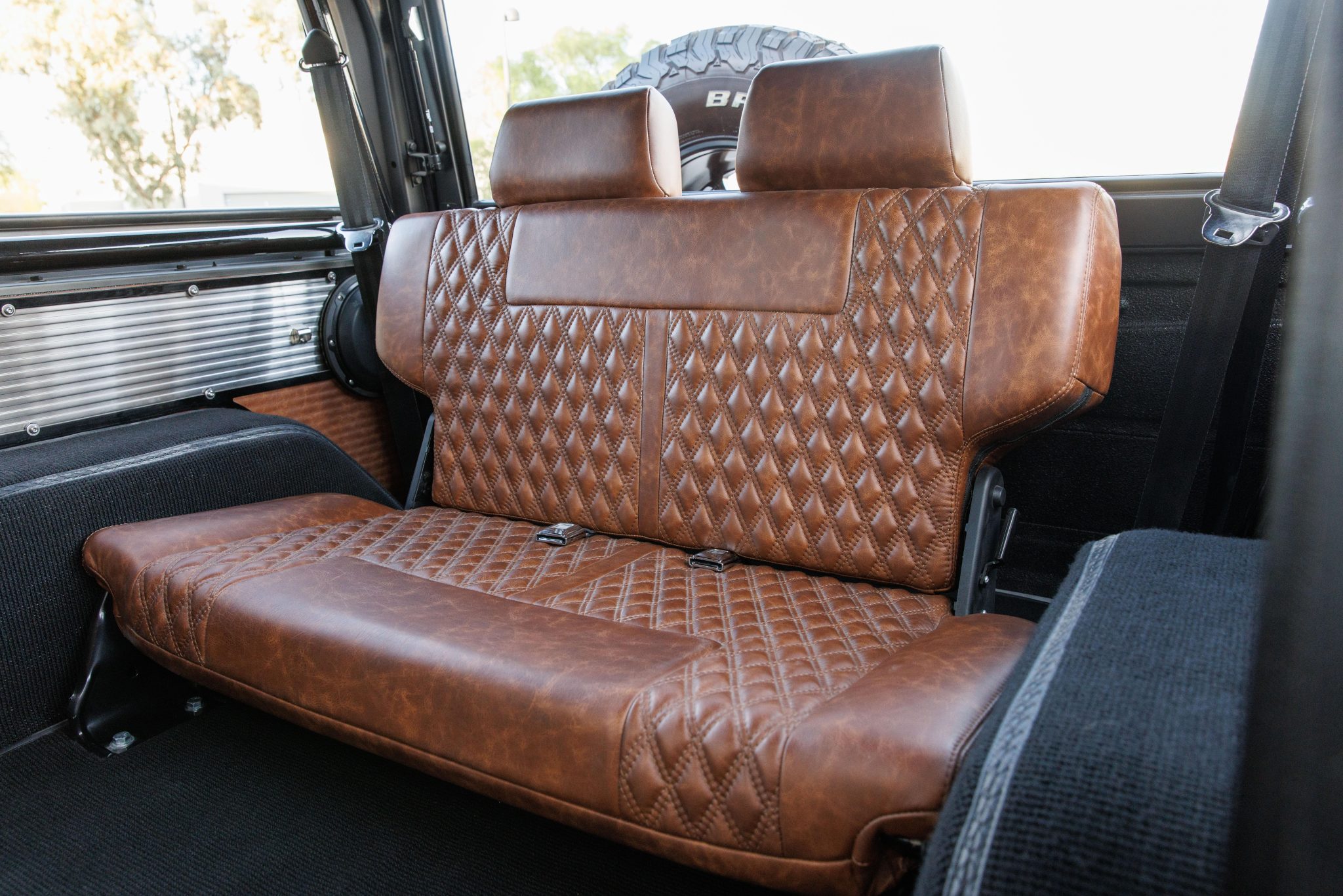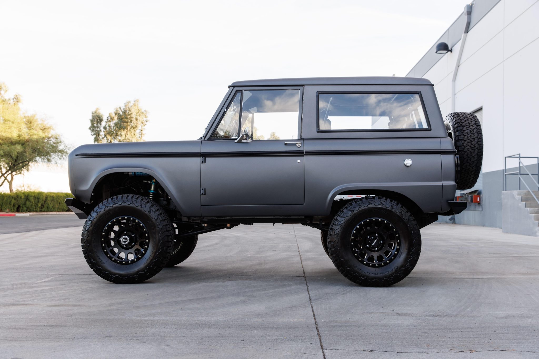 The truck was refinished in matte gray with metallic flake over custom brown Relicate leather upholstery, and a 5.0-liter Coyote V8 crate engine was installed along with a six-speed automatic transmission and a twin-stick dual-range transfer case. Both body and suspension lifts were installed along with four-wheel disc brakes, King remote-reservoir shocks, Warn manually locking front hubs, and 17″ Method wheels. Inside, ICON 4×4 trim pieces are fitted along with a family roll bar, a center console, Air Hurricane air conditioning, a Pioneer infotainment system, aftermarket audio components, power windows, and Dakota Digital gauges.