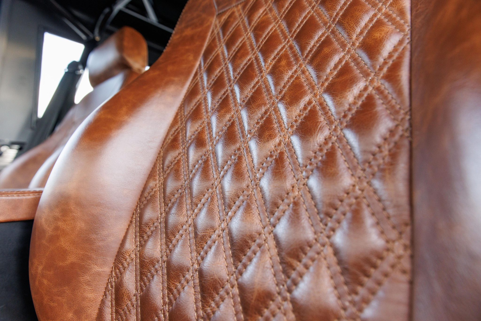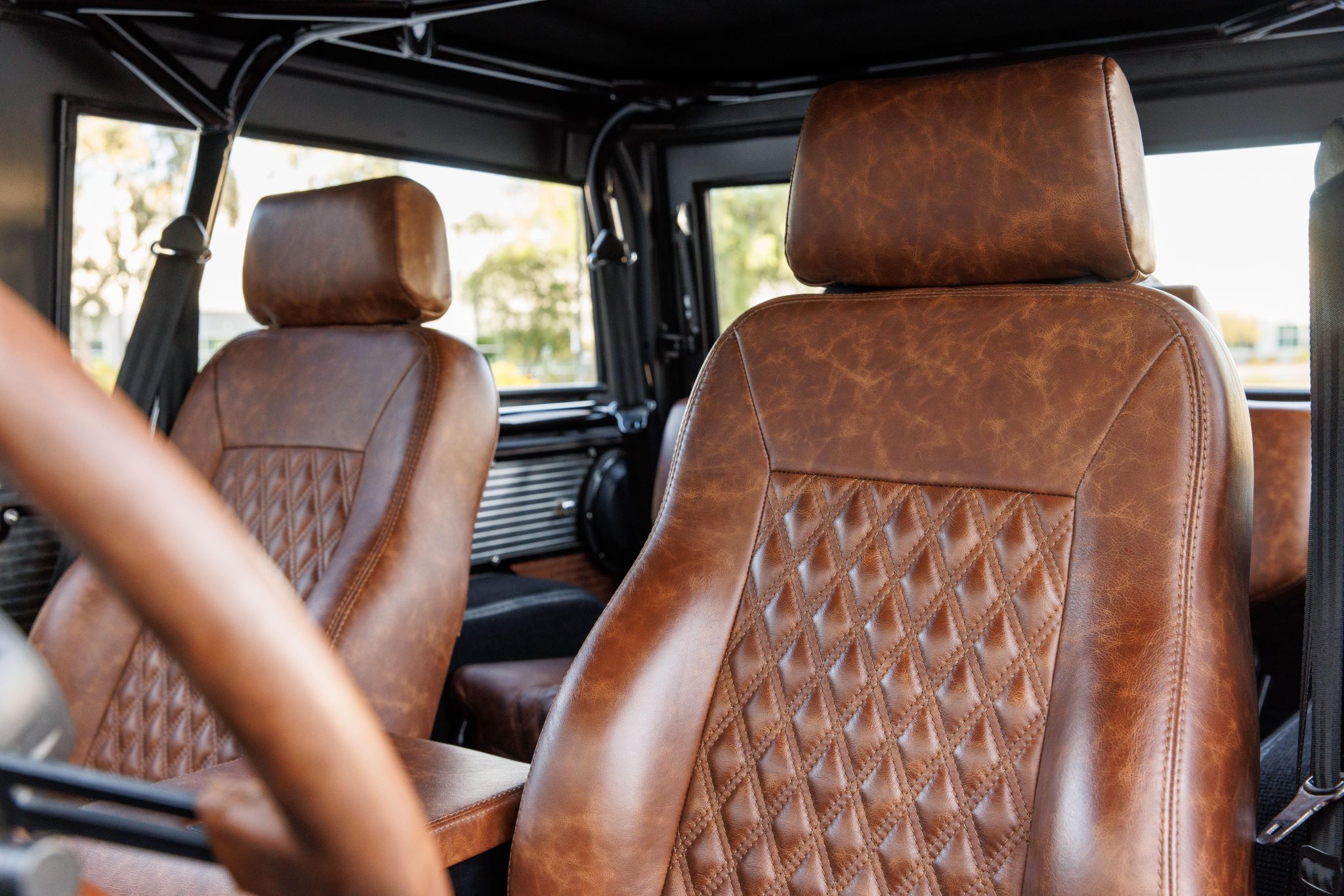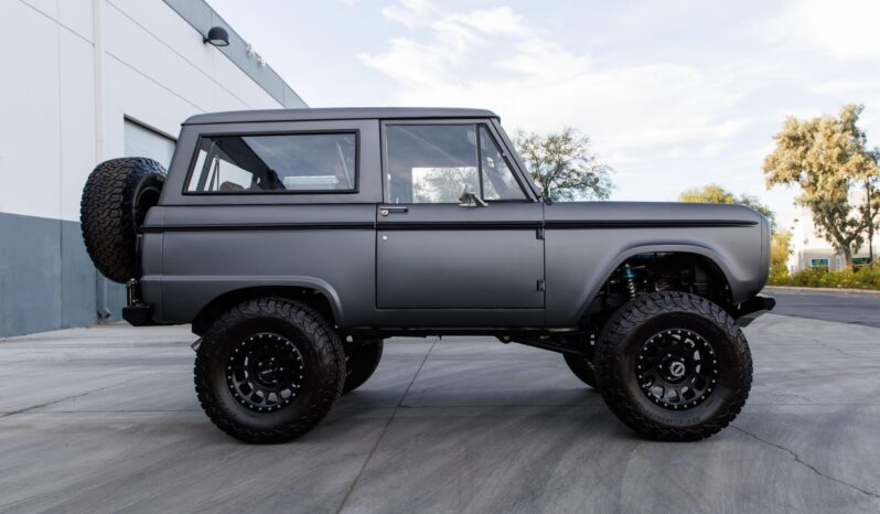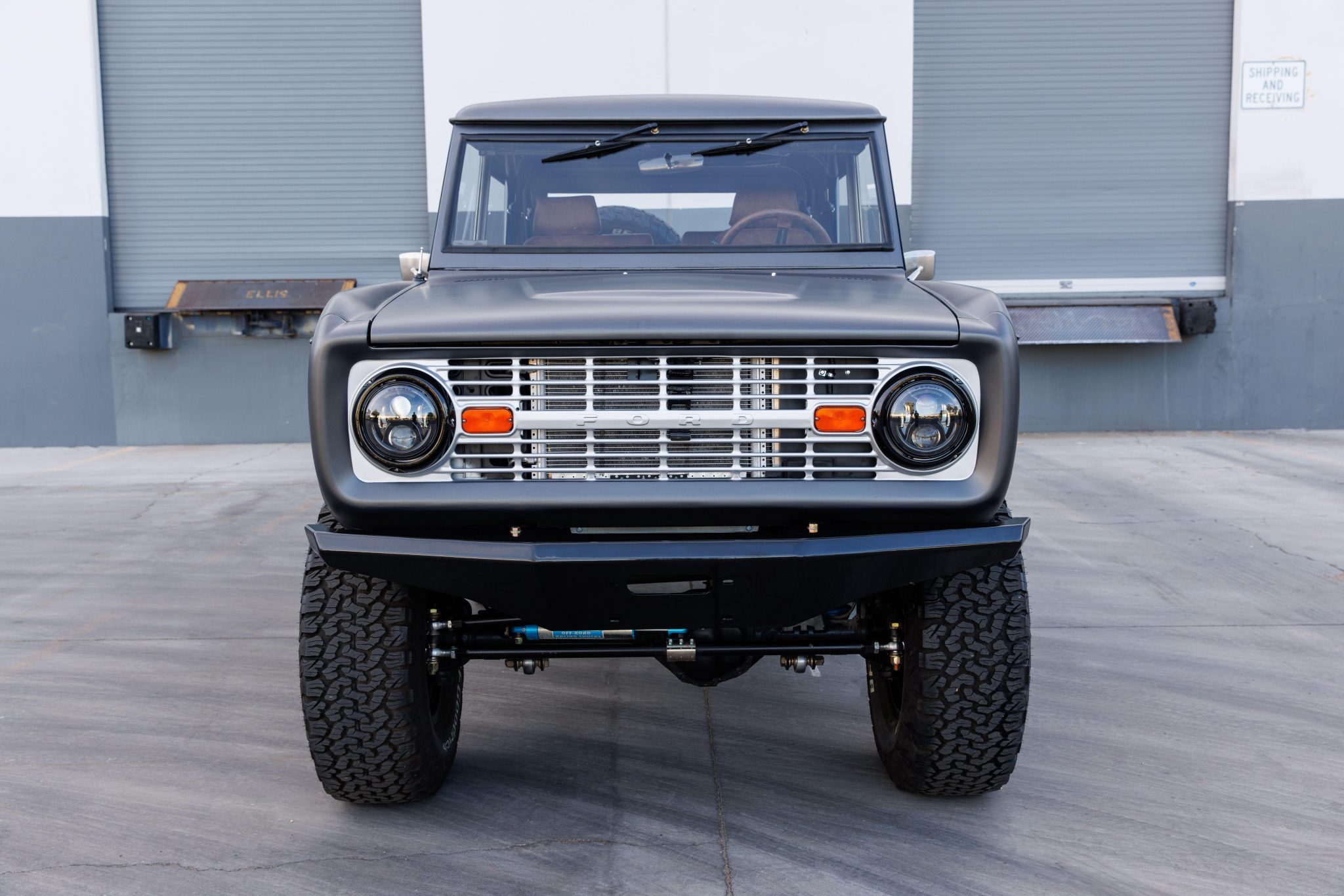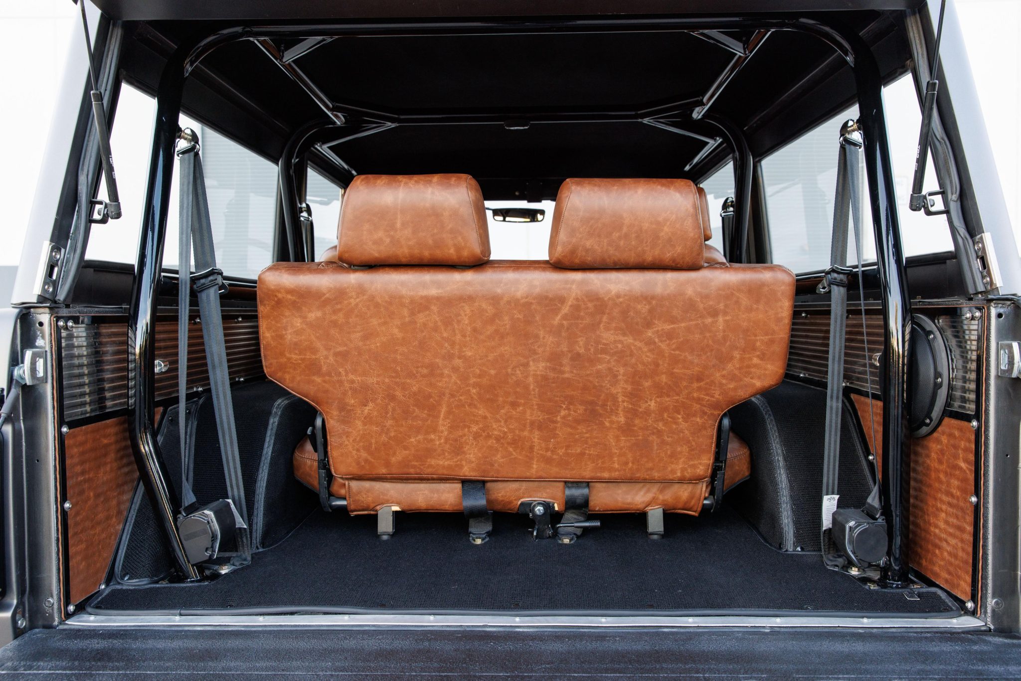 The truck was refinished in matte gray with metallic flake over custom brown Relicate leather upholstery, and a 5.0-liter Coyote V8 crate engine was installed along with a six-speed automatic transmission and a twin-stick dual-range transfer case. Both body and suspension lifts were installed along with four-wheel disc brakes, King remote-reservoir shocks, Warn manually locking front hubs, and 17″ Method wheels. Inside, ICON 4×4 trim pieces are fitted along with a family roll bar, a center console, Air Hurricane air conditioning, a Pioneer infotainment system, aftermarket audio components, power windows, and Dakota Digital gauges.