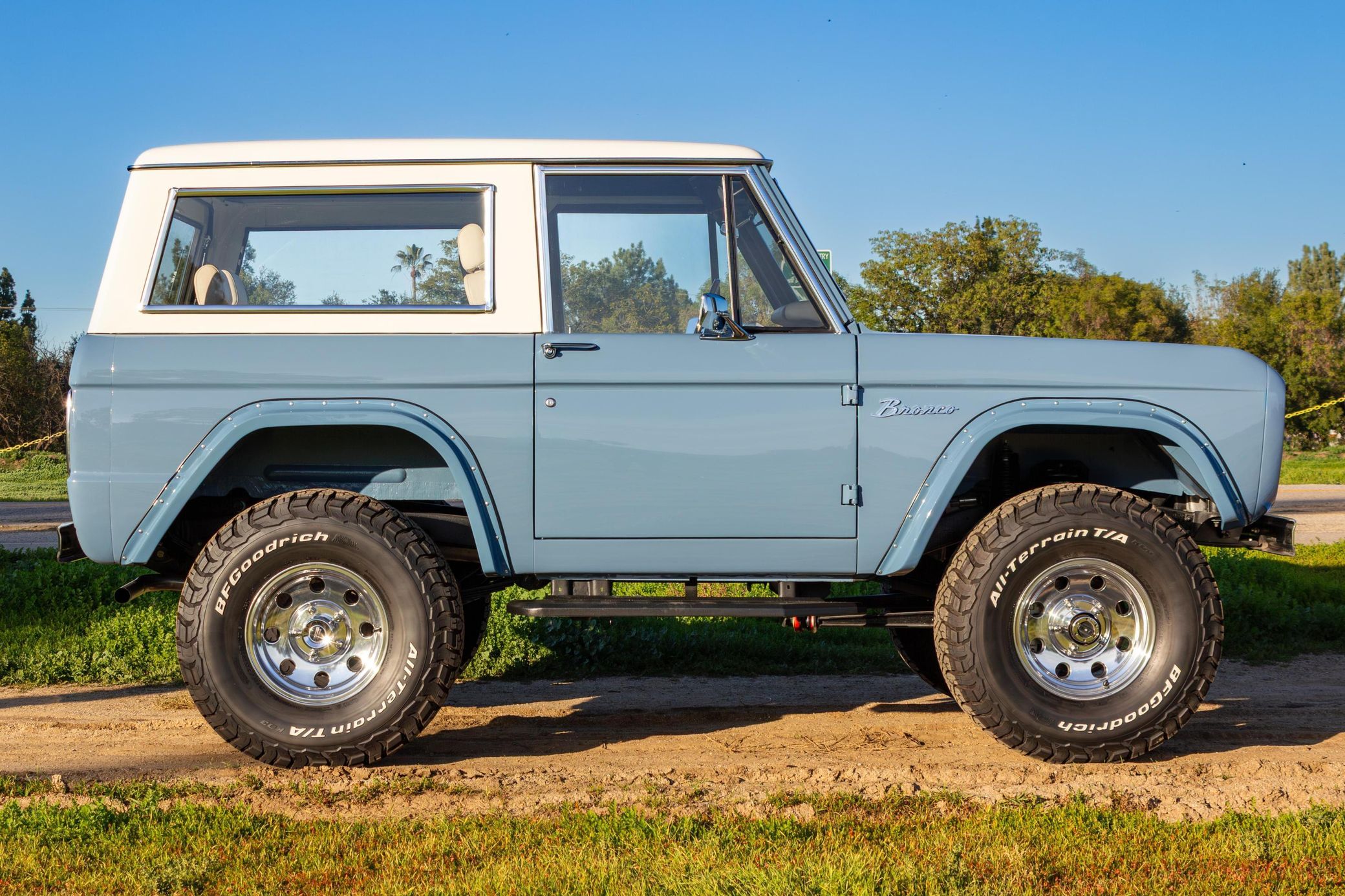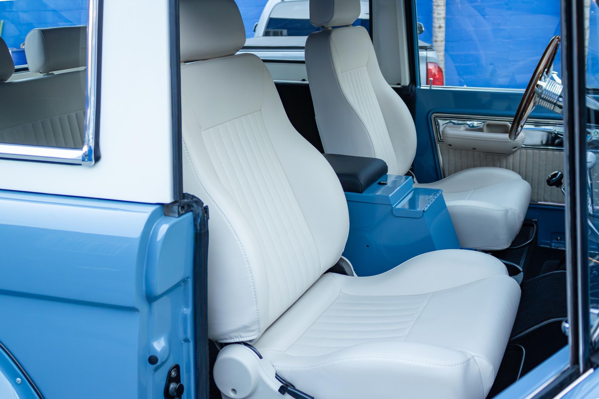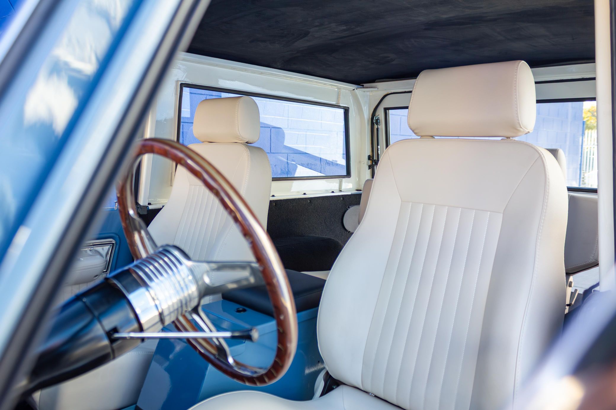 It boasts a 302-cubic-inch V8, a 3-speed manual transmission, and 4-wheel drive. It's been refinished in gorgeous color called China Blue and also touts some great features – including a removable hardtop, 16-inch American Racing wheels, side steps, and a touchscreen infotainment system. Power comes from a 302-cubic-inch V8, rated at about 205 horsepower and 300 lb-ft of torque. Output is sent to the rear or all four wheels via a 3-speed manual transmission and a 2-speed transfer case.