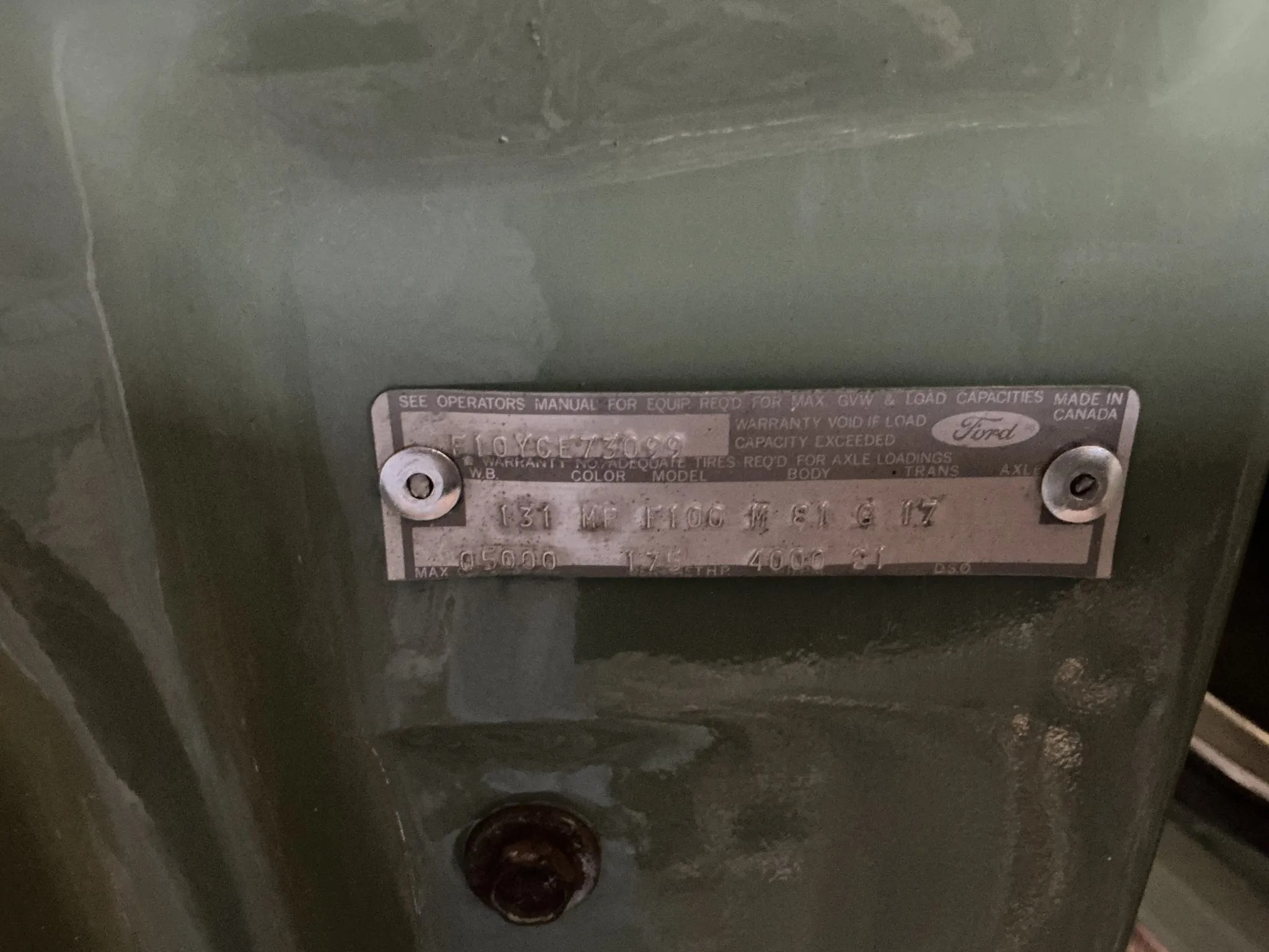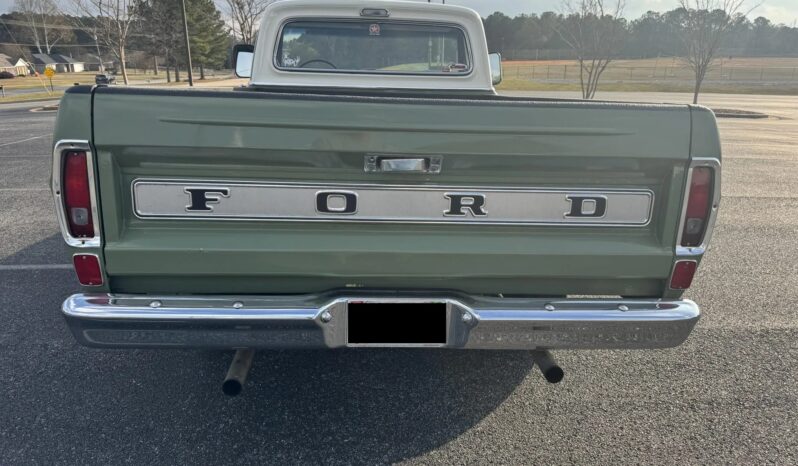 This 1969 Ford F-100 Ranger 360ci V8 has since been modified with Holley Sniper electronic fuel injection, an RV camshaft, and an Edelbrock intake manifold. The truck wears a repaint in green with white accents over a black vinyl interior, and additional equipment includes a three-speed automatic transmission, an aluminum radiator, 15″ steel wheels, front disc brakes, a spray-in bed liner, a retro-style stereo, and a heater.
