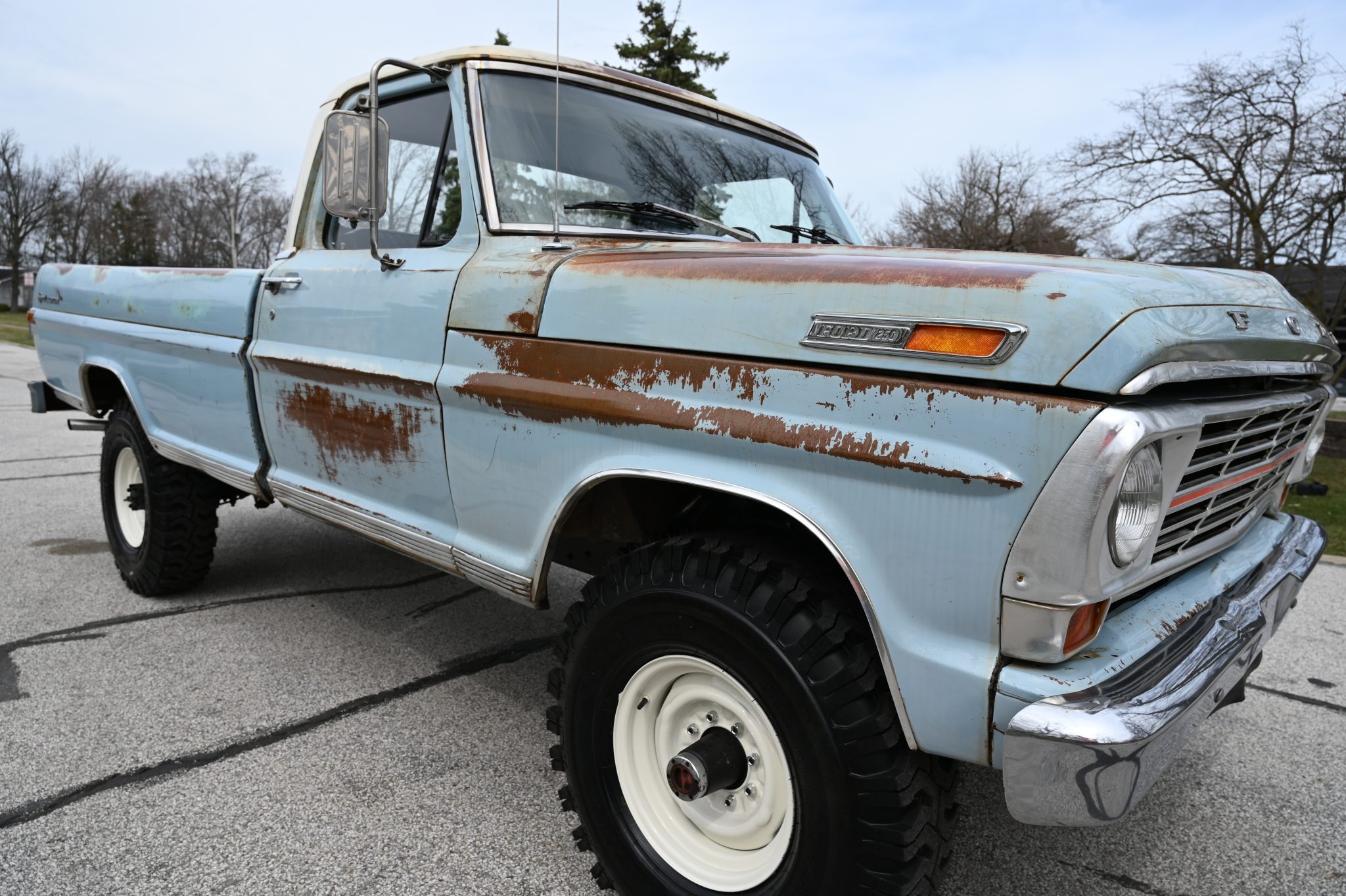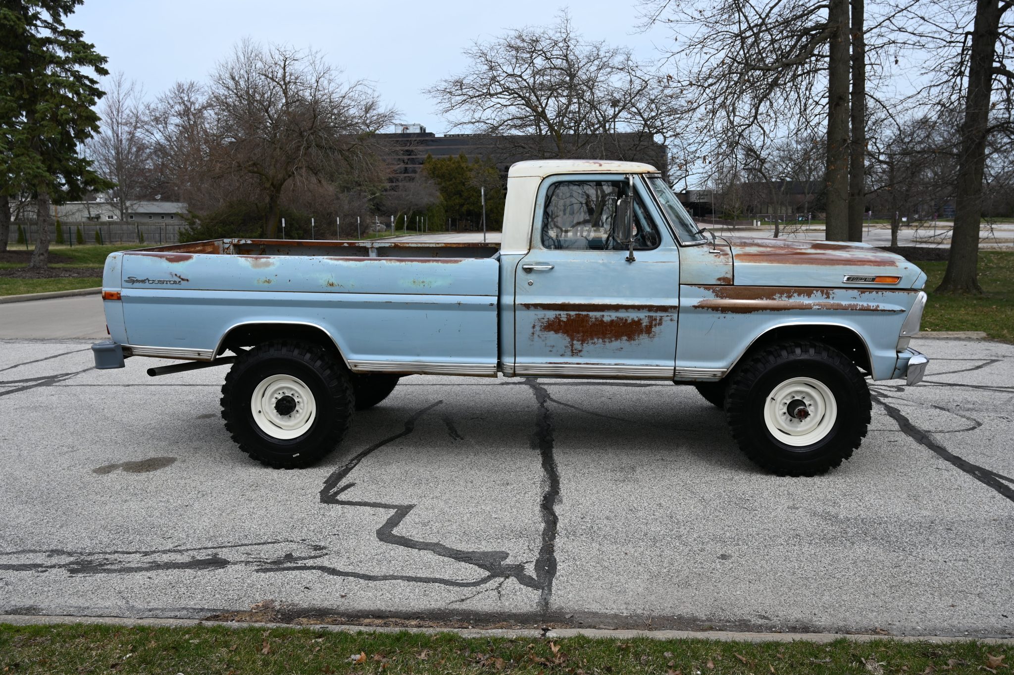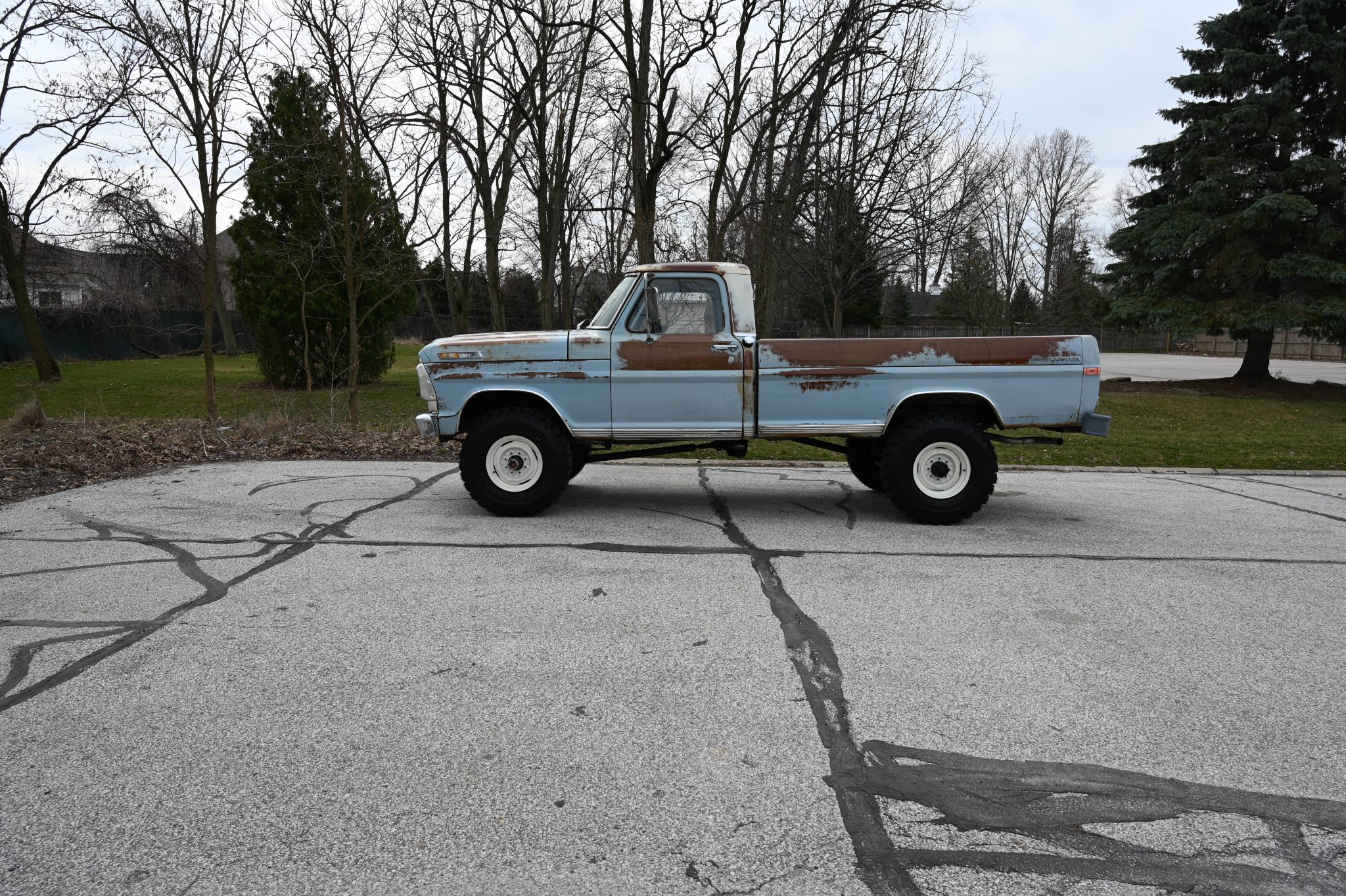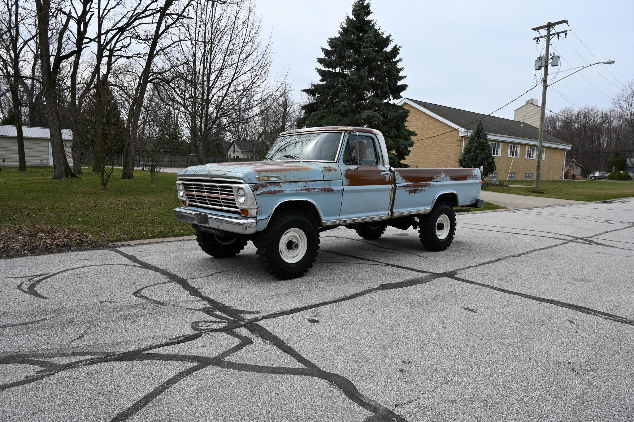 This 1969 Ford F-250 4×4 four-speed was re-bodied with an F-100 Sport Custom refinished its frame during the swap. Its 360ci V8 was also refurbished and the cab was refreshed with a replacement bench and floor cover. Other work involved replacing the exhaust system along with the wheels and tires.
