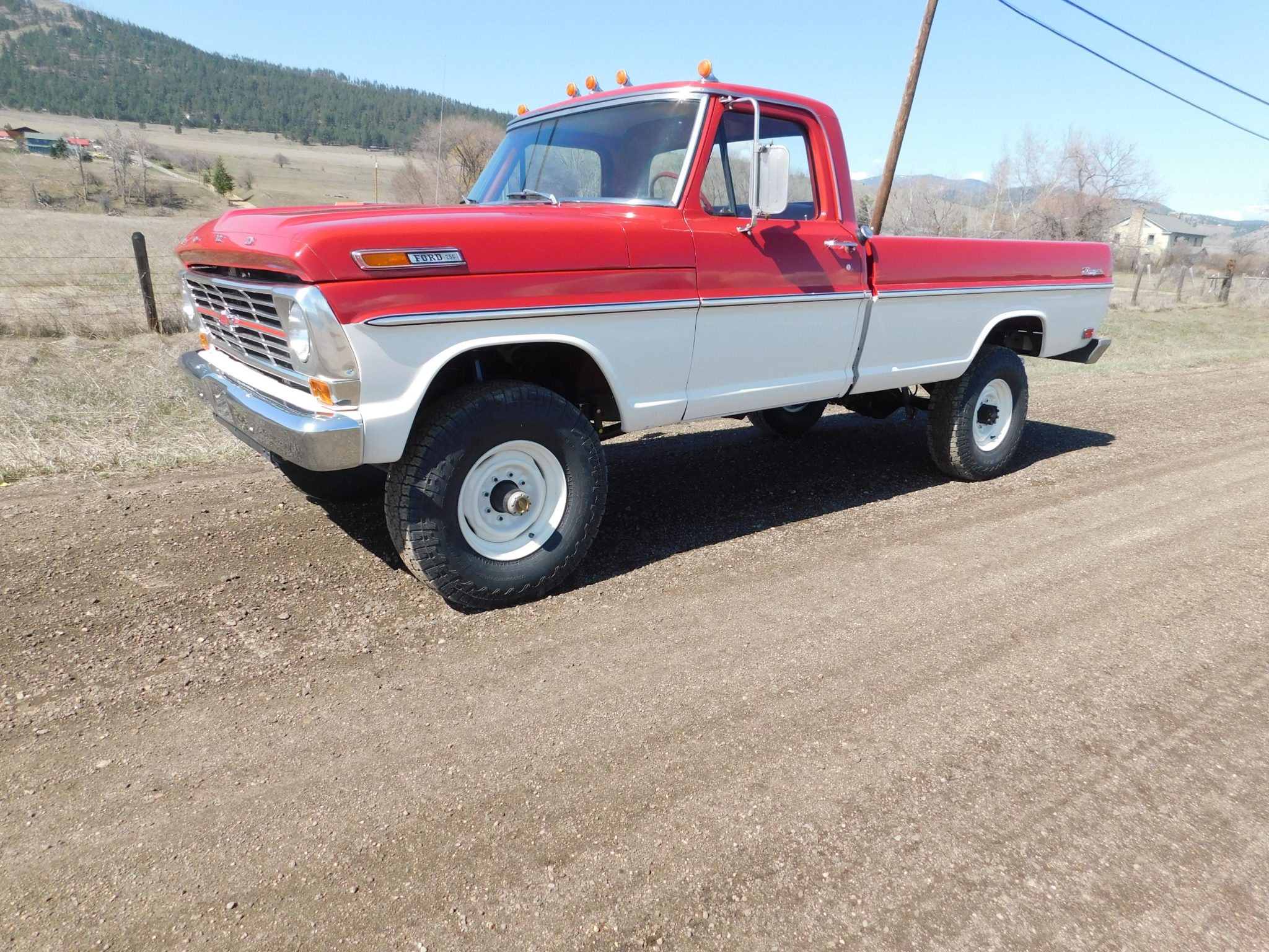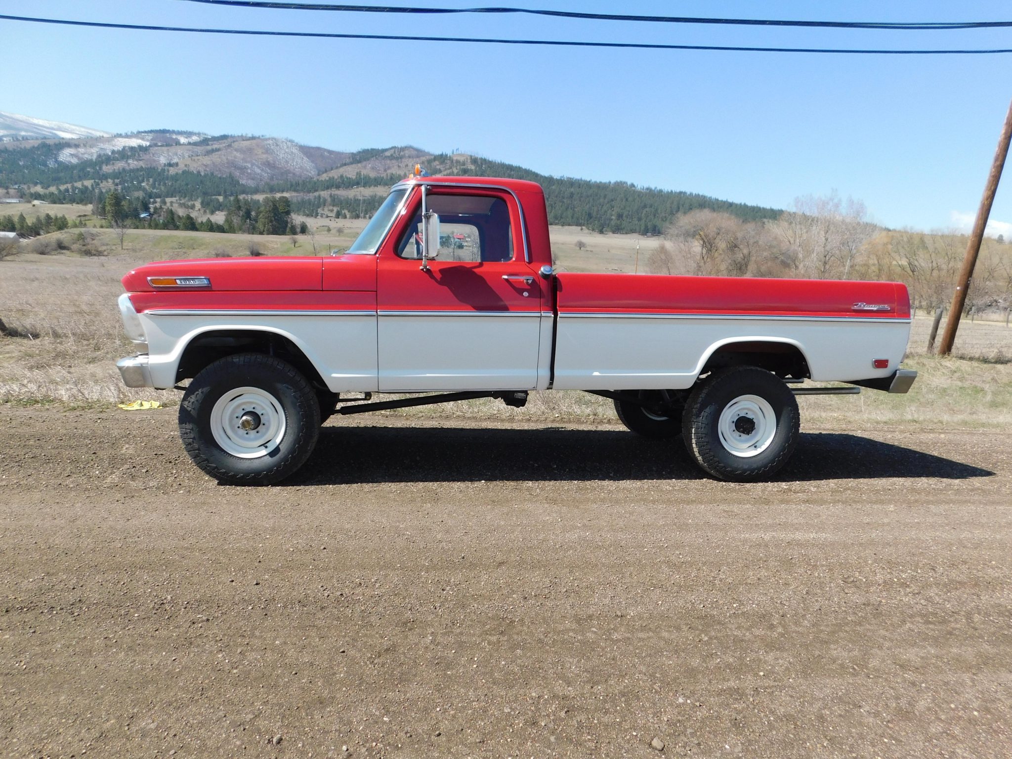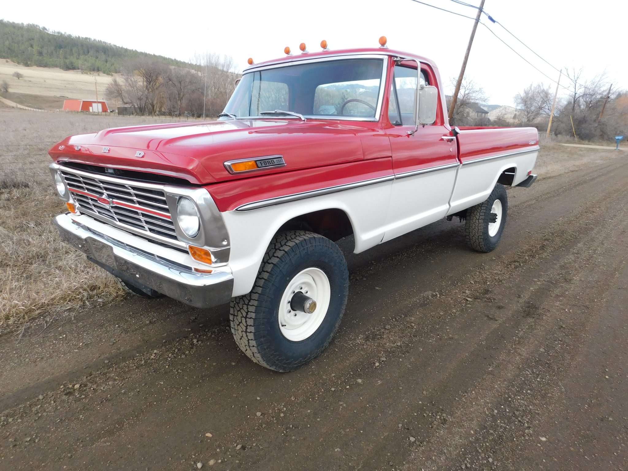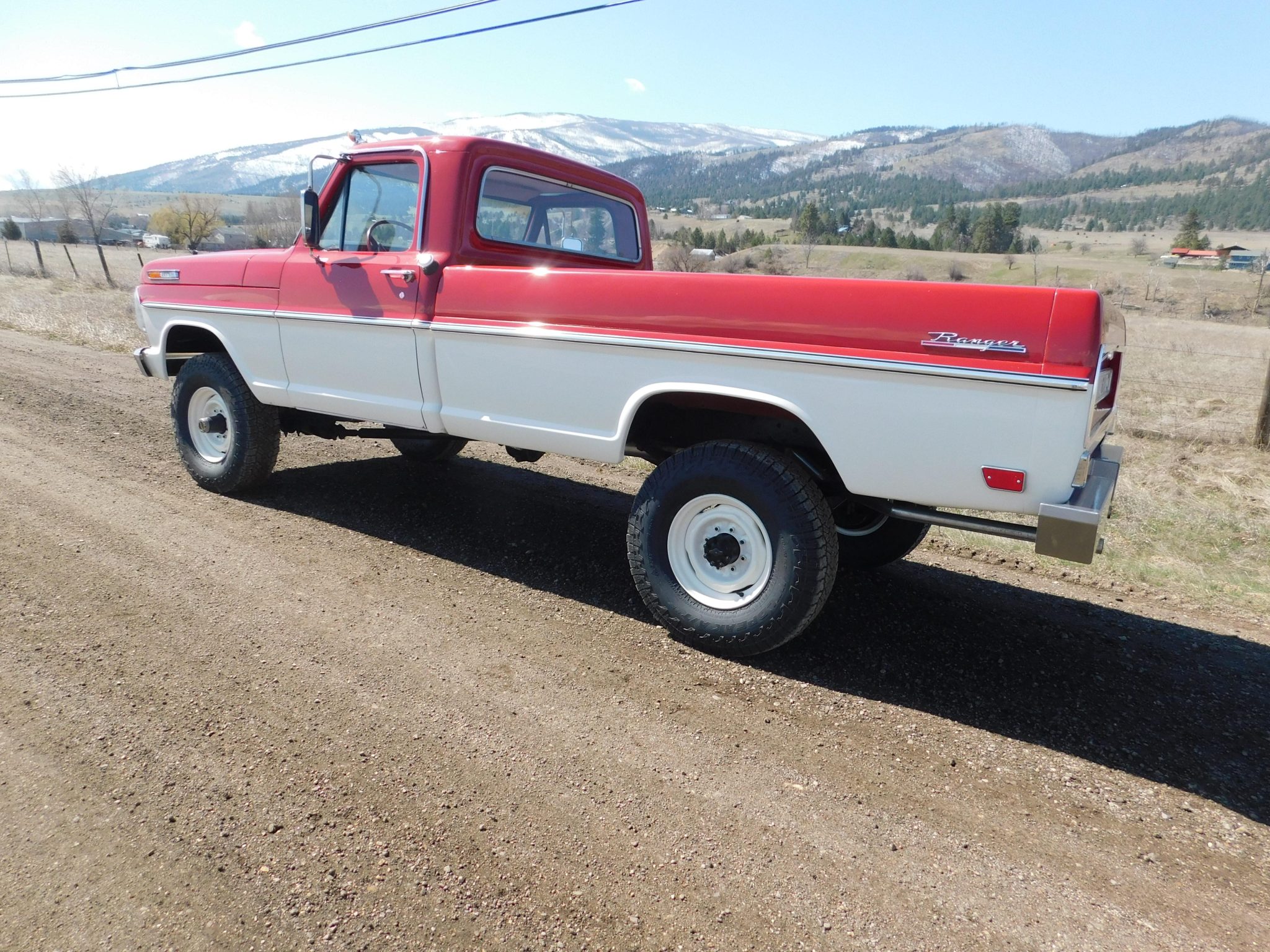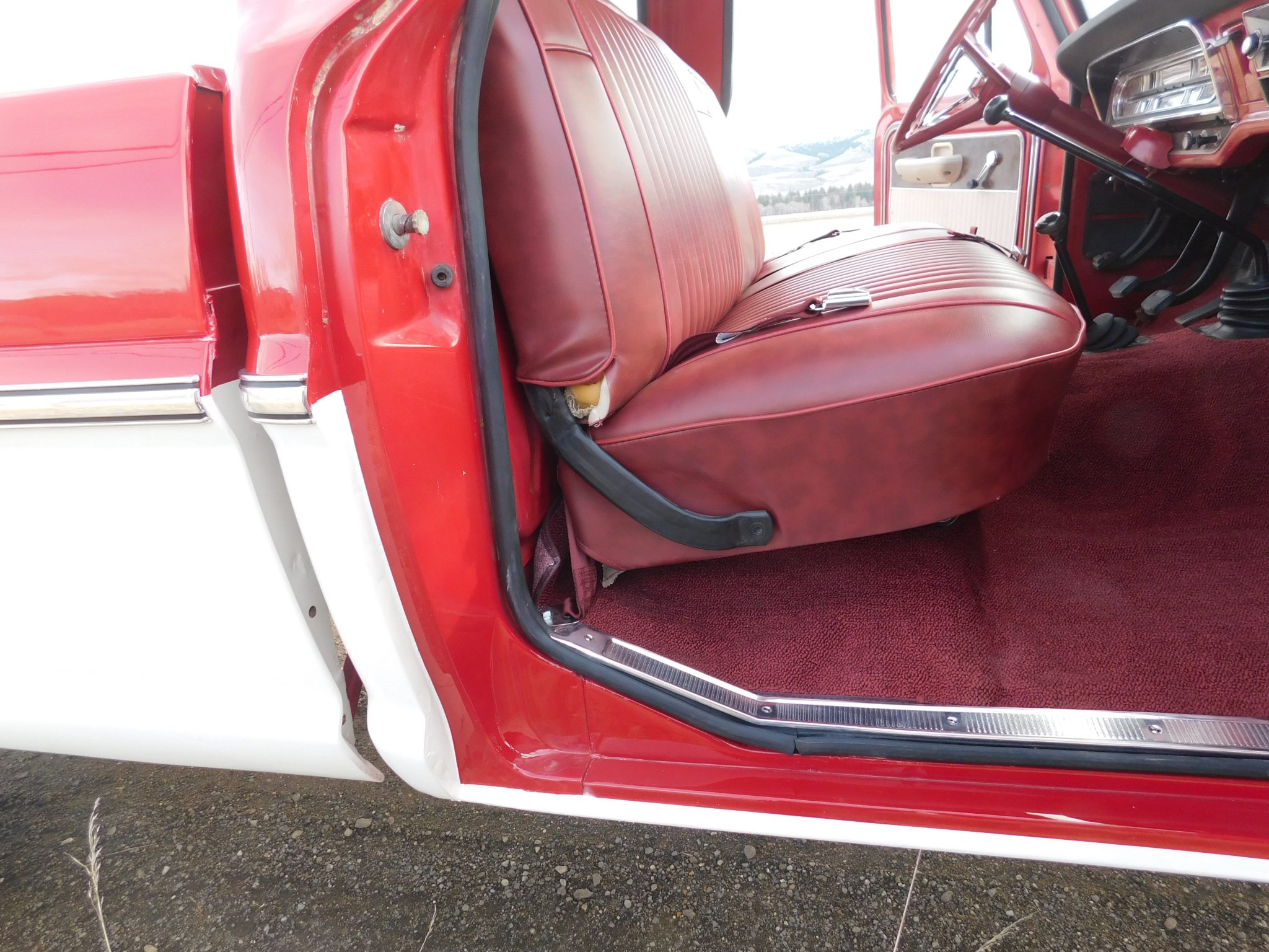 Work is said to have included rebuilding the 360ci V8 and modifying it to displace 390ci, resealing the four-speed manual transmission and the dual-range transfer case, rebuilding the axles, and replacing braking, suspension, and exhaust components. The truck was repainted red and white and the cab was refreshed with an aftermarket seat trimmed in red vinyl as well as a replacement dash pad and carpets. Additional equipment includes 16″ steel wheels, manually locking front hubs, Western-style mirrors, amber clearance lights, and a spray-on bedliner.
