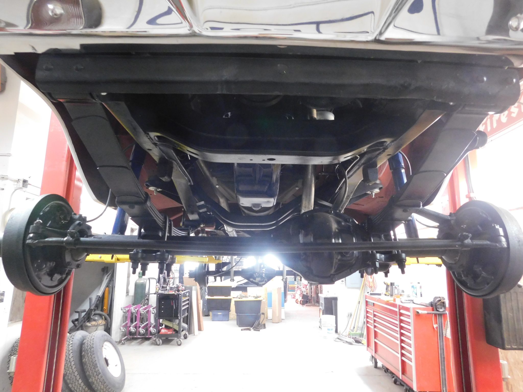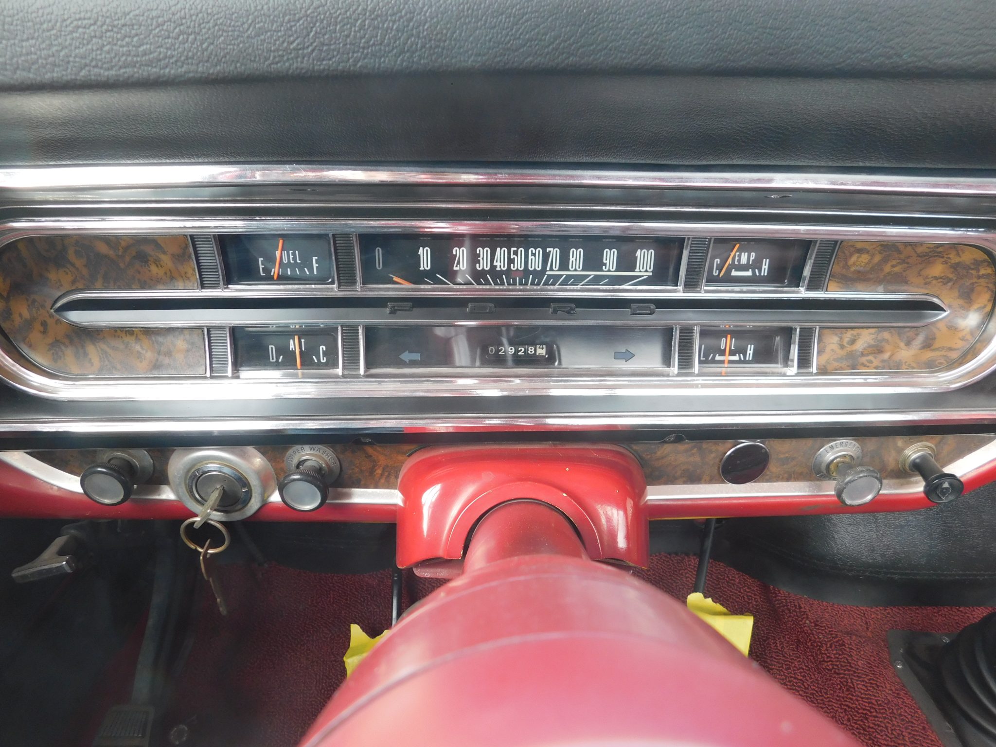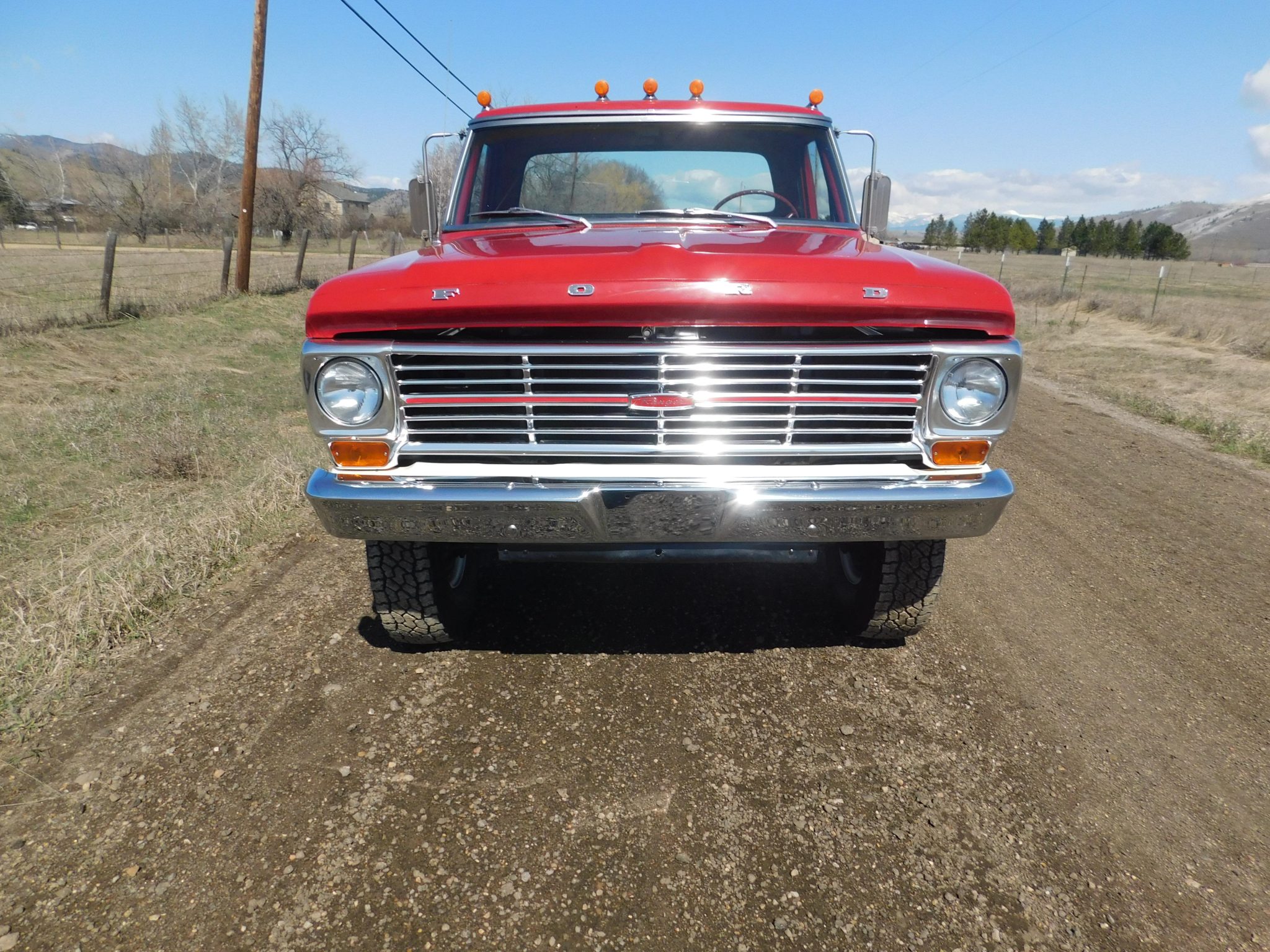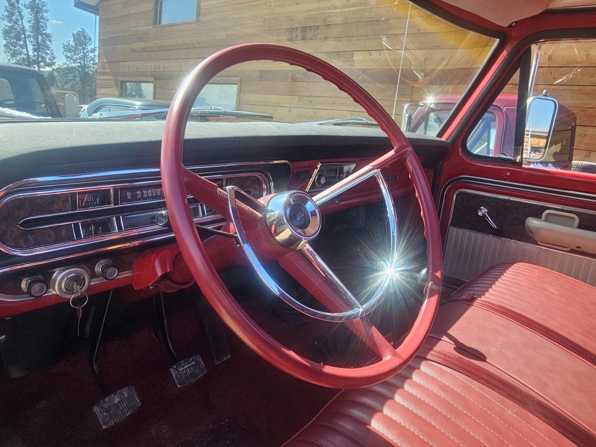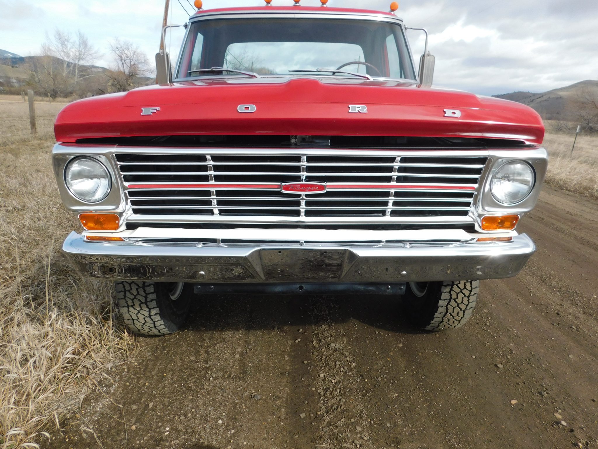 Work is said to have included rebuilding the 360ci V8 and modifying it to displace 390ci, resealing the four-speed manual transmission and the dual-range transfer case, rebuilding the axles, and replacing braking, suspension, and exhaust components. The truck was repainted red and white and the cab was refreshed with an aftermarket seat trimmed in red vinyl as well as a replacement dash pad and carpets. Additional equipment includes 16″ steel wheels, manually locking front hubs, Western-style mirrors, amber clearance lights, and a spray-on bedliner.