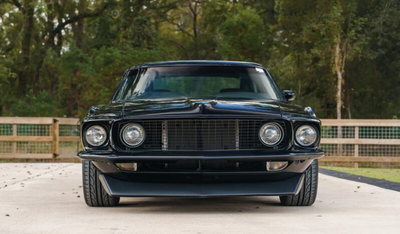This 1969 Ford Mustang was built as a 351 Mach 1 with an FMX automatic transmission The car has been fitted with a 302ci V8, which is equipped with a fuel injection system and a Powerdyne supercharger, and the engine is linked to a Tremec five-speed manual transmission and a 9″ rear end with 3.70 gears. The body has been smoothed and painted black, and it rides on Rushforth wheels with four-wheel disc brakes, traction bars, rack-and-pinion steering, tubular control arms, relocated front strut upper mounts, and lowering blocks. The interior has also been redone with bucket seats, a Pioneer stereo, a Hurst shifter, AutoMeter gauges, and a four-point roll bar.