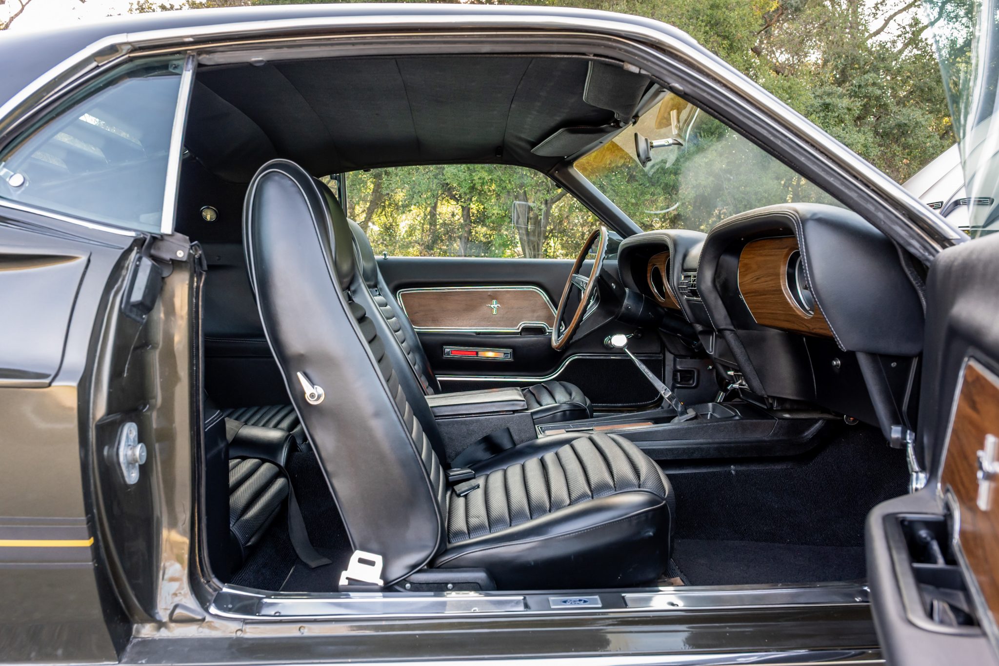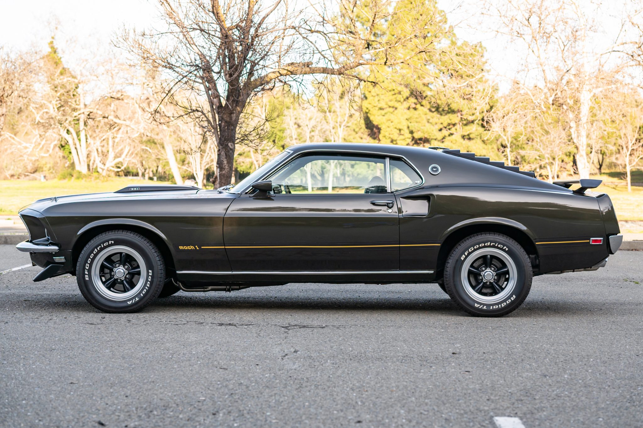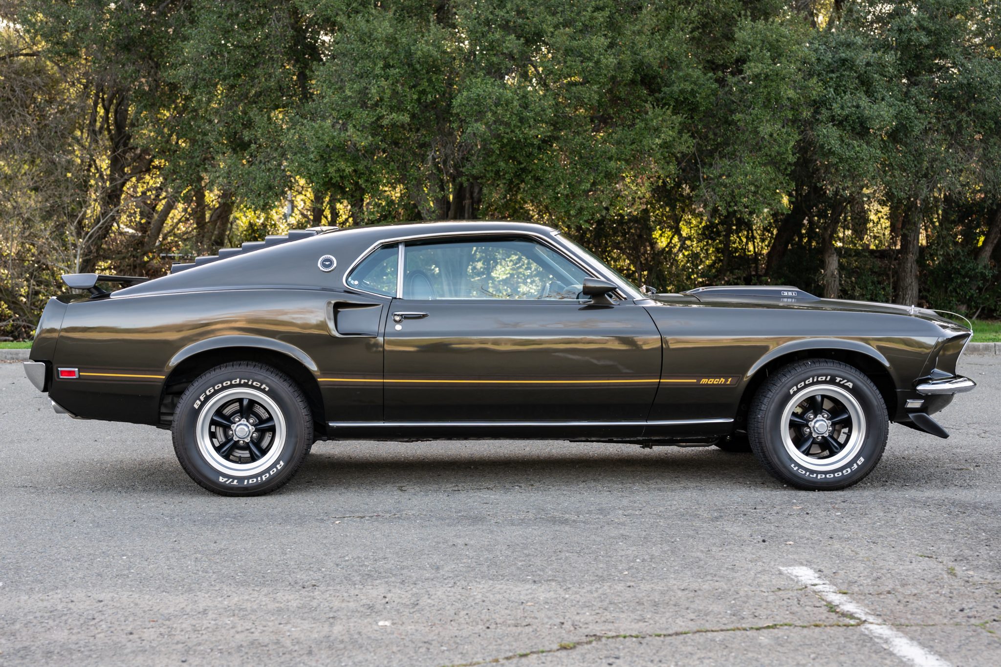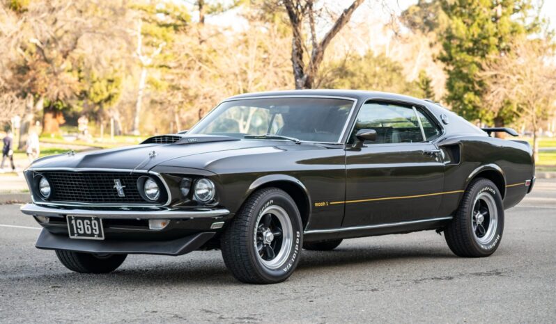 This 1969 Ford Mustang Mach 1 was the subject of a refurbishment and modifications that were completed in 2016, which included repainting the body in Black Jade and fitting a replacement 408ci stroker V8 linked to a Tremec TKO-600 five-speed manual transmission and a limited-slip differential. Additional modifications include an Edelbrock intake manifold and cylinder heads, a COMP Cams camshaft, a Brawler carburetor, and MSD ignition components as well as a Hurst shifter, a headlight relay kit, Hedman Hedders exhaust headers, and Flowmaster mufflers. Black vinyl upholstery is accompanied by a center console, a blacked-out hood, front and rear spoilers, rear window louvers, and quad exhaust outlets.