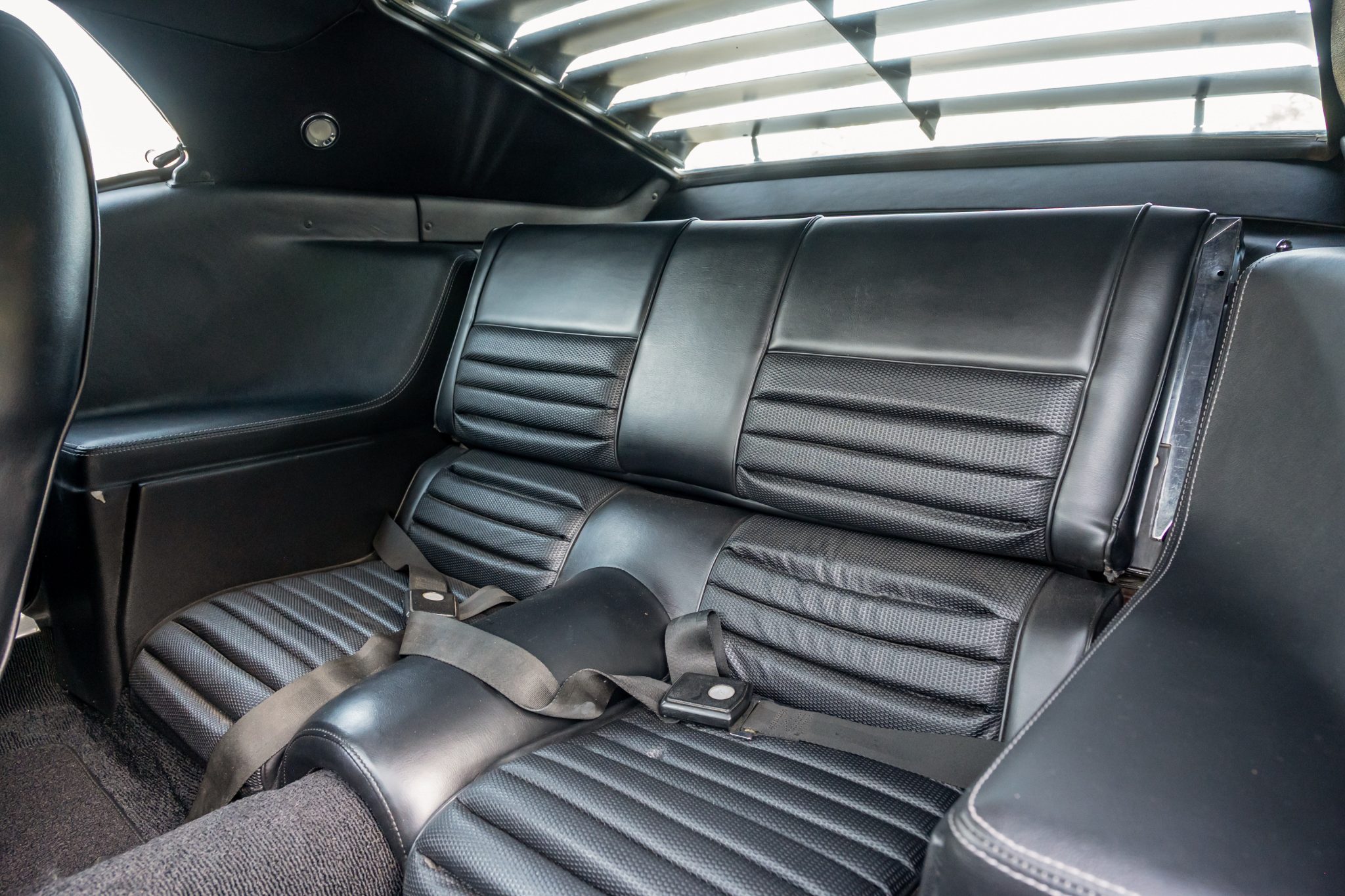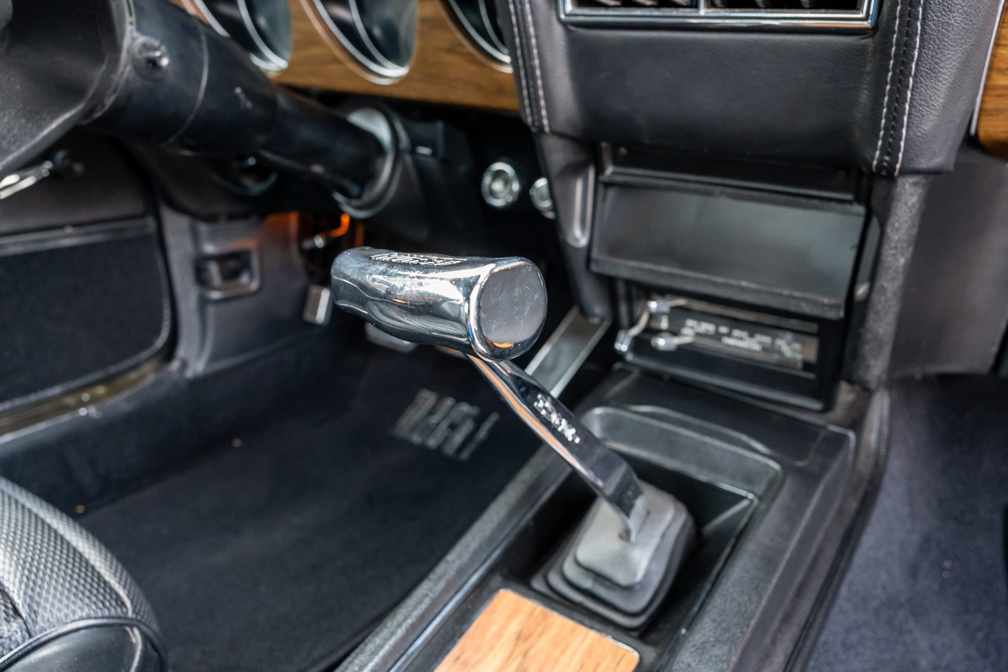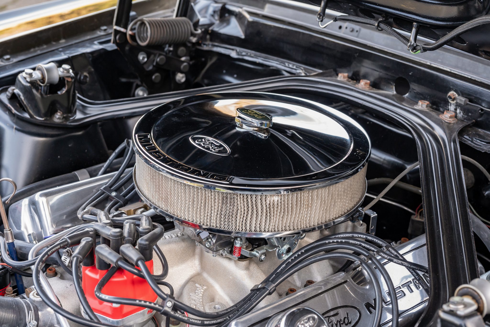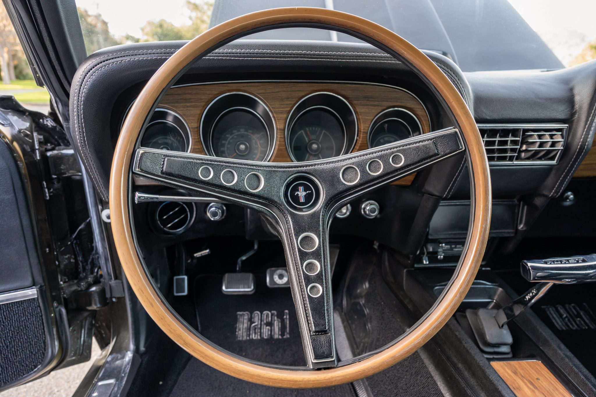This 1969 Ford Mustang Mach 1 was the subject of a refurbishment and modifications that were completed in 2016, which included repainting the body in Black Jade and fitting a replacement 408ci stroker V8 linked to a Tremec TKO-600 five-speed manual transmission and a limited-slip differential. Additional modifications include an Edelbrock intake manifold and cylinder heads, a COMP Cams camshaft, a Brawler carburetor, and MSD ignition components as well as a Hurst shifter, a headlight relay kit, Hedman Hedders exhaust headers, and Flowmaster mufflers. Black vinyl upholstery is accompanied by a center console, a blacked-out hood, front and rear spoilers, rear window louvers, and quad exhaust outlets.