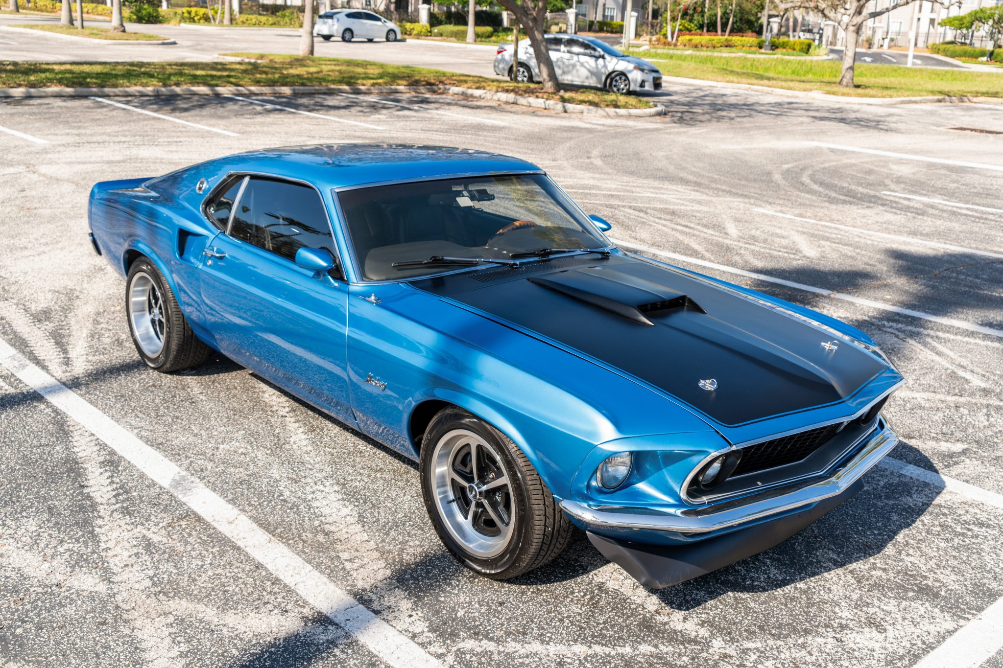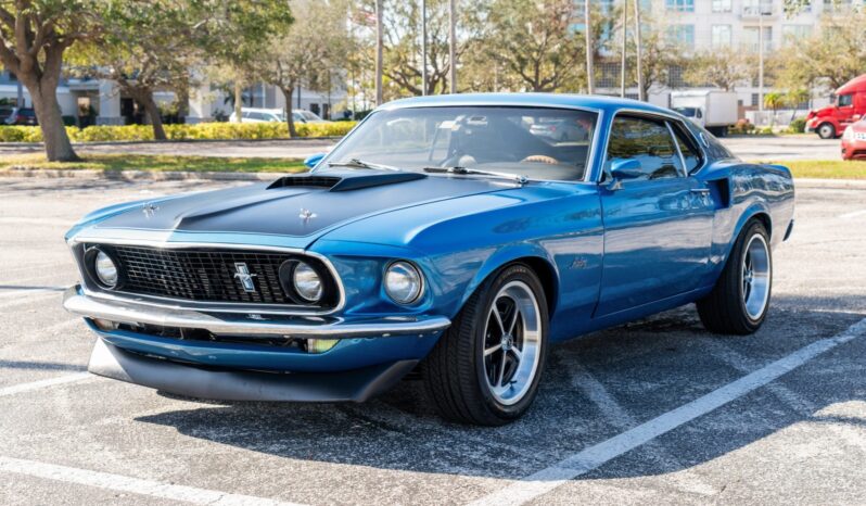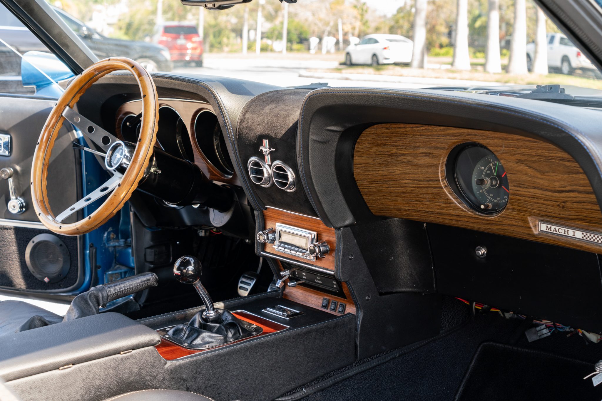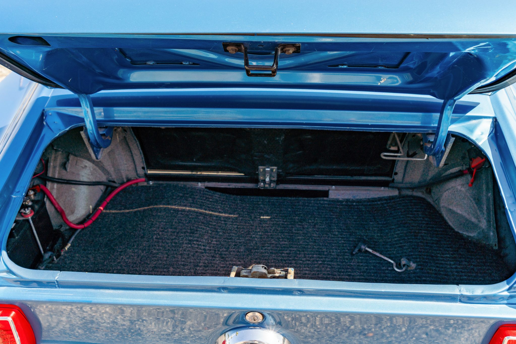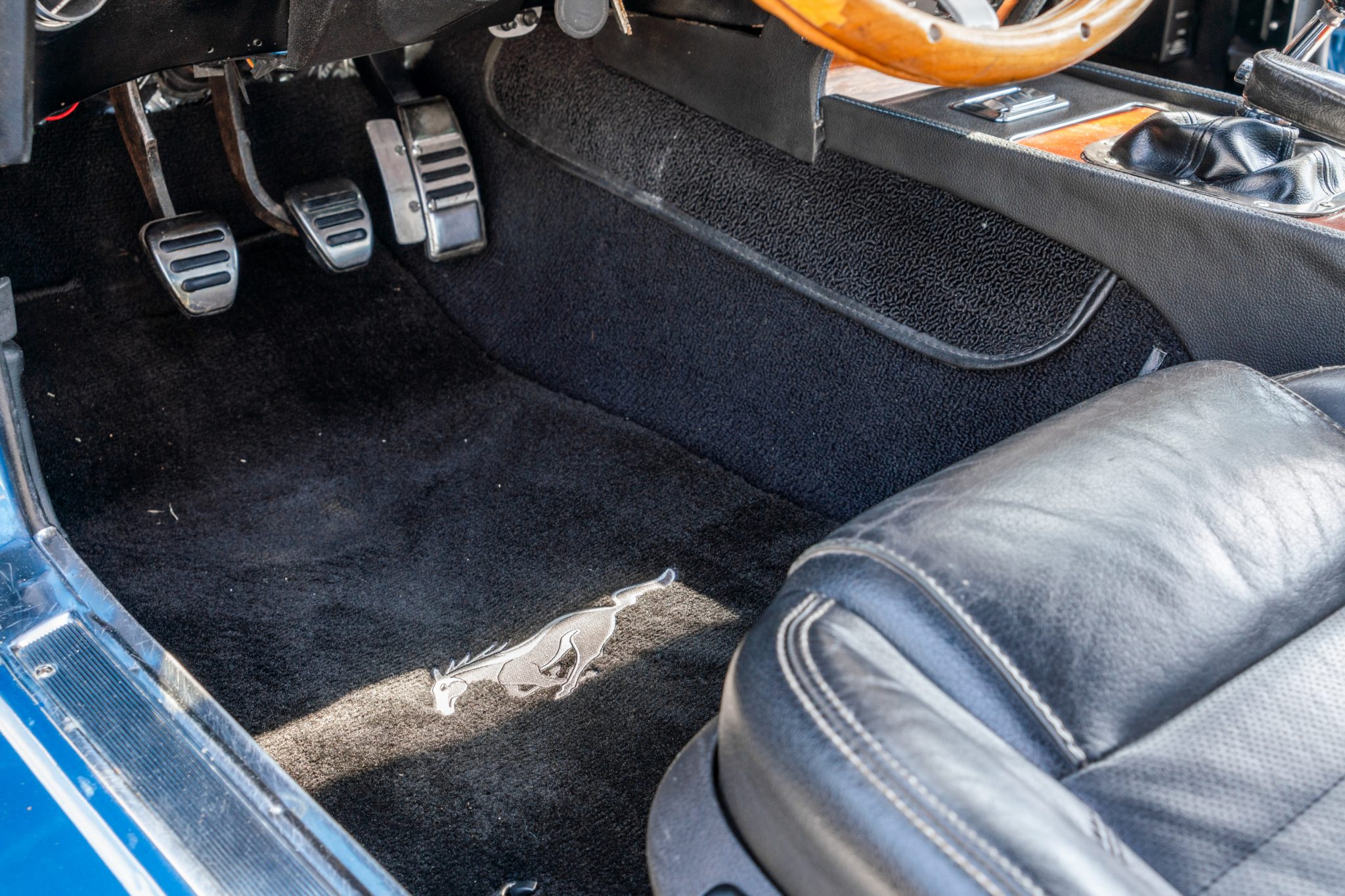 A 4.6-liter V8 and a Tremec six-speed manual transmission were installed, the car was painted Acapulco Blue, and the black interior was refreshed. Components also include a Ford 8″ rear end with a limited-slip differential and 3.25:1 gears as well as Baer four-wheel disc brakes, coilovers, and 17″ Magnum 500-style wheels. The interior features high-back front bucket seats and a folding rear bench, a power-adjustable driver’s seat, air conditioning, a Retrosound head unit, and Dakota Digital gauges.