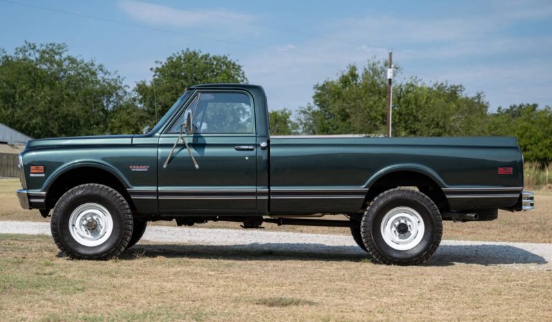 This 1969 GMC K2500 Custom is a regular-cab 3/4-ton pickup Power is provided by a 350ci V8 linked with a four-speed manual transmission and a dual-range transfer case. It is equipped with an Edelbrock carburetor and intake manifold, a dual exhaust system, power-assisted brakes, power steering, Warn manually locking front hubs, and 16″ steel wheels. The truck is finished in dark green over black vinyl, and features include chrome bumpers, quad headlights, Western-style side mirrors, bucket seats, a Kenwood head unit, a rear rack, and a cabin heater.