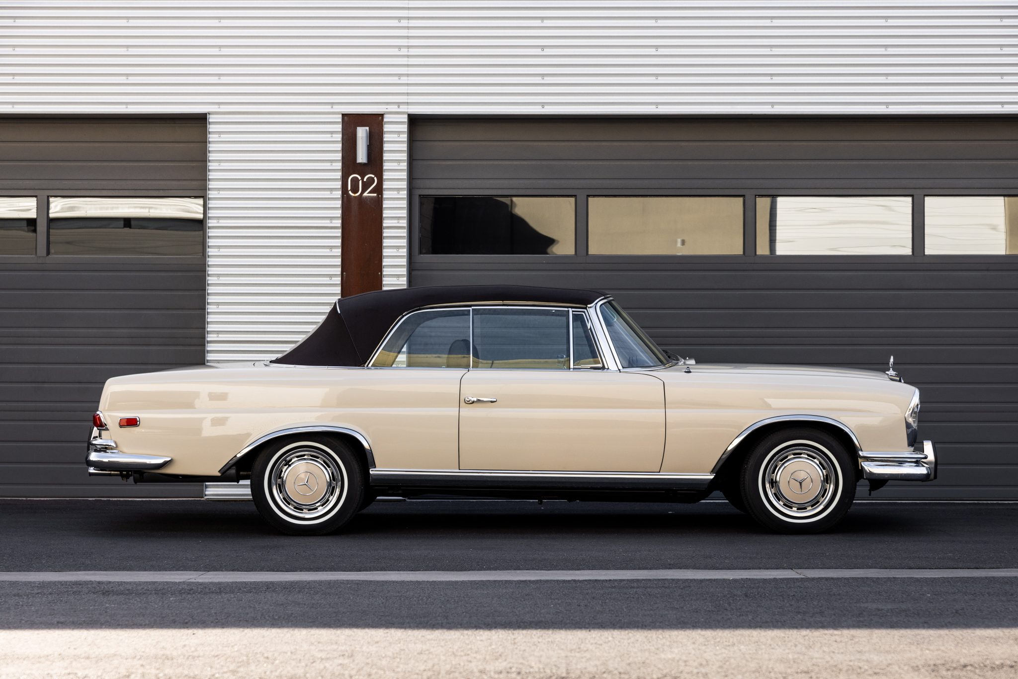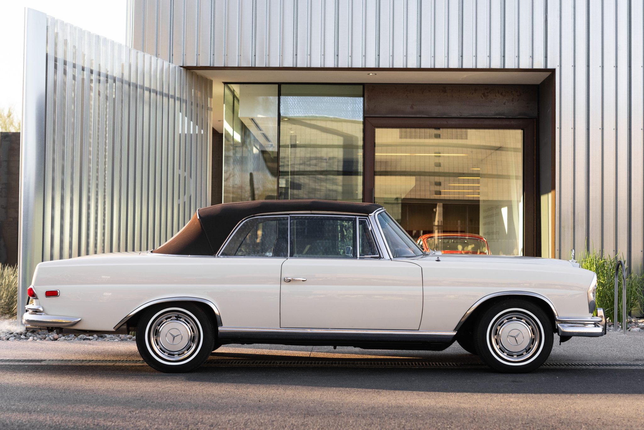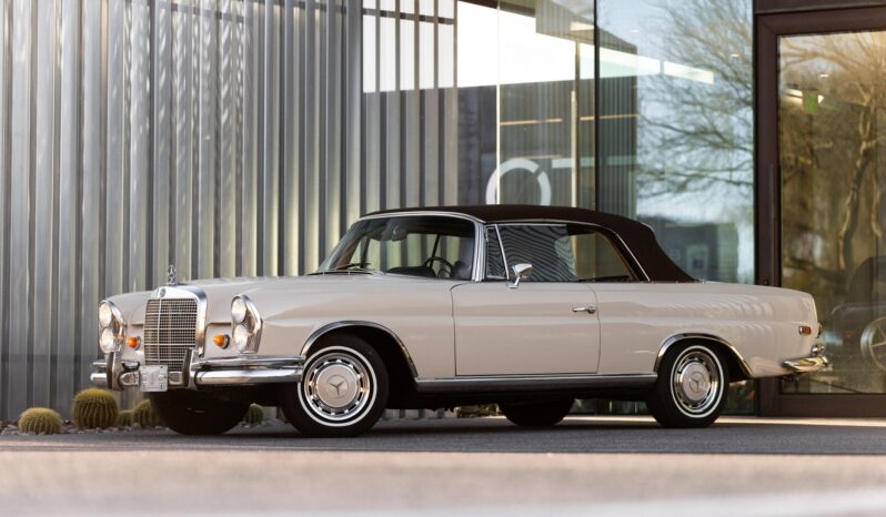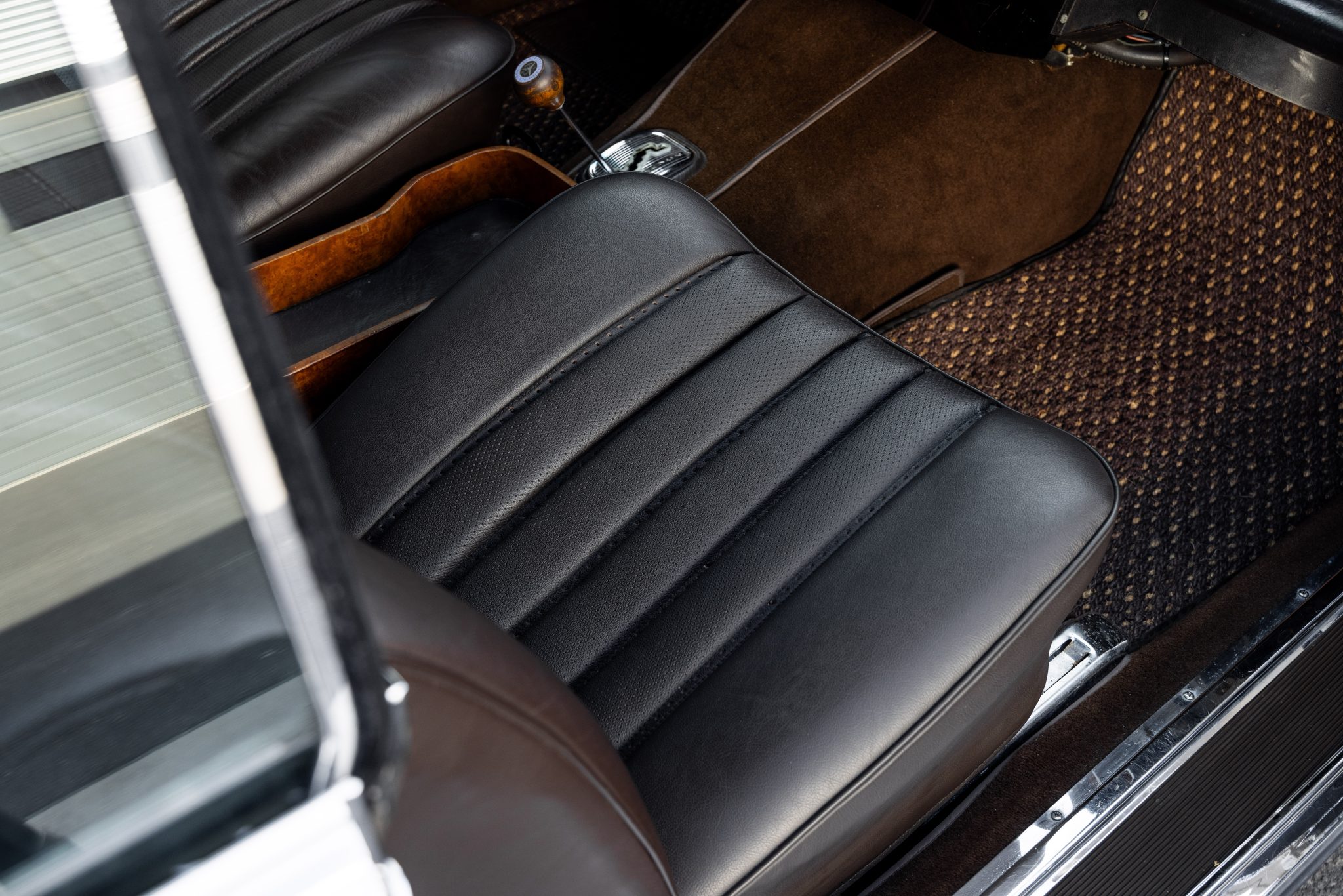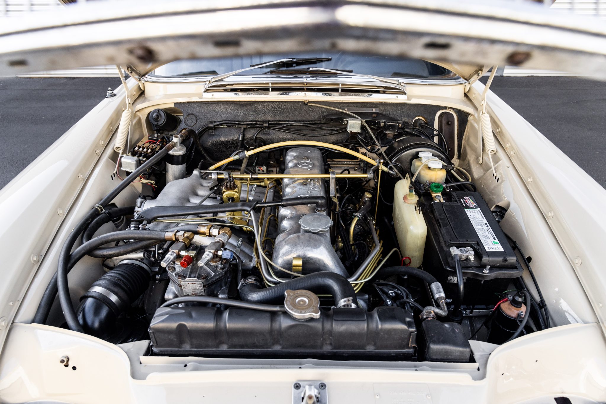 The car is finished in Light Beige over Dark Brown leather and is powered by a 2.8-liter inline-six paired with a four-speed automatic transmission. Equipment includes a brown convertible top, 14″ steel wheels with covers, disc brakes, three-point seat belts, power windows, a rear window defroster, a Becker radio, and air conditioning.