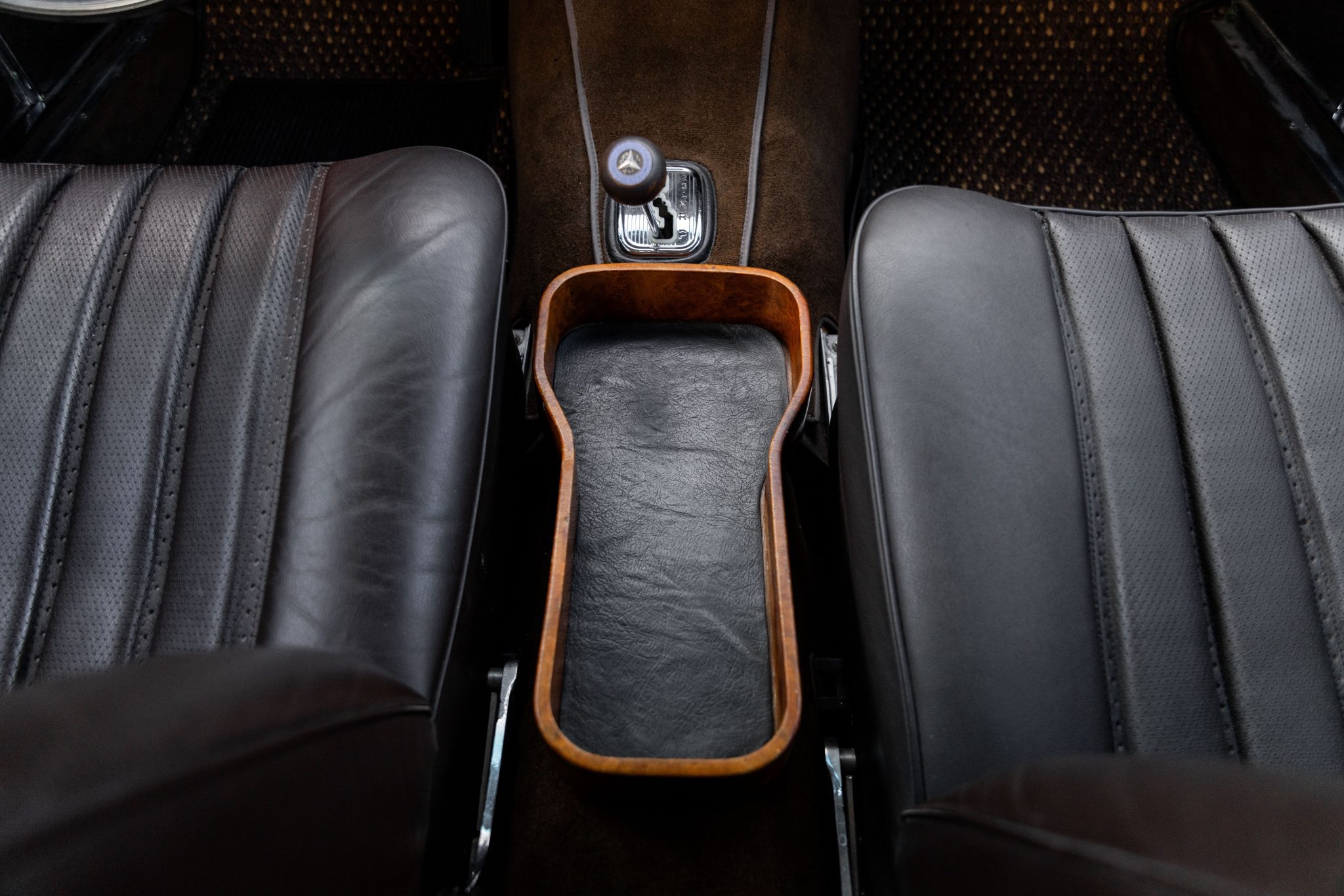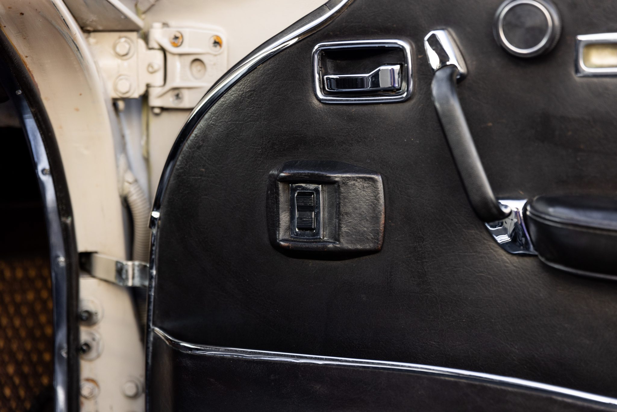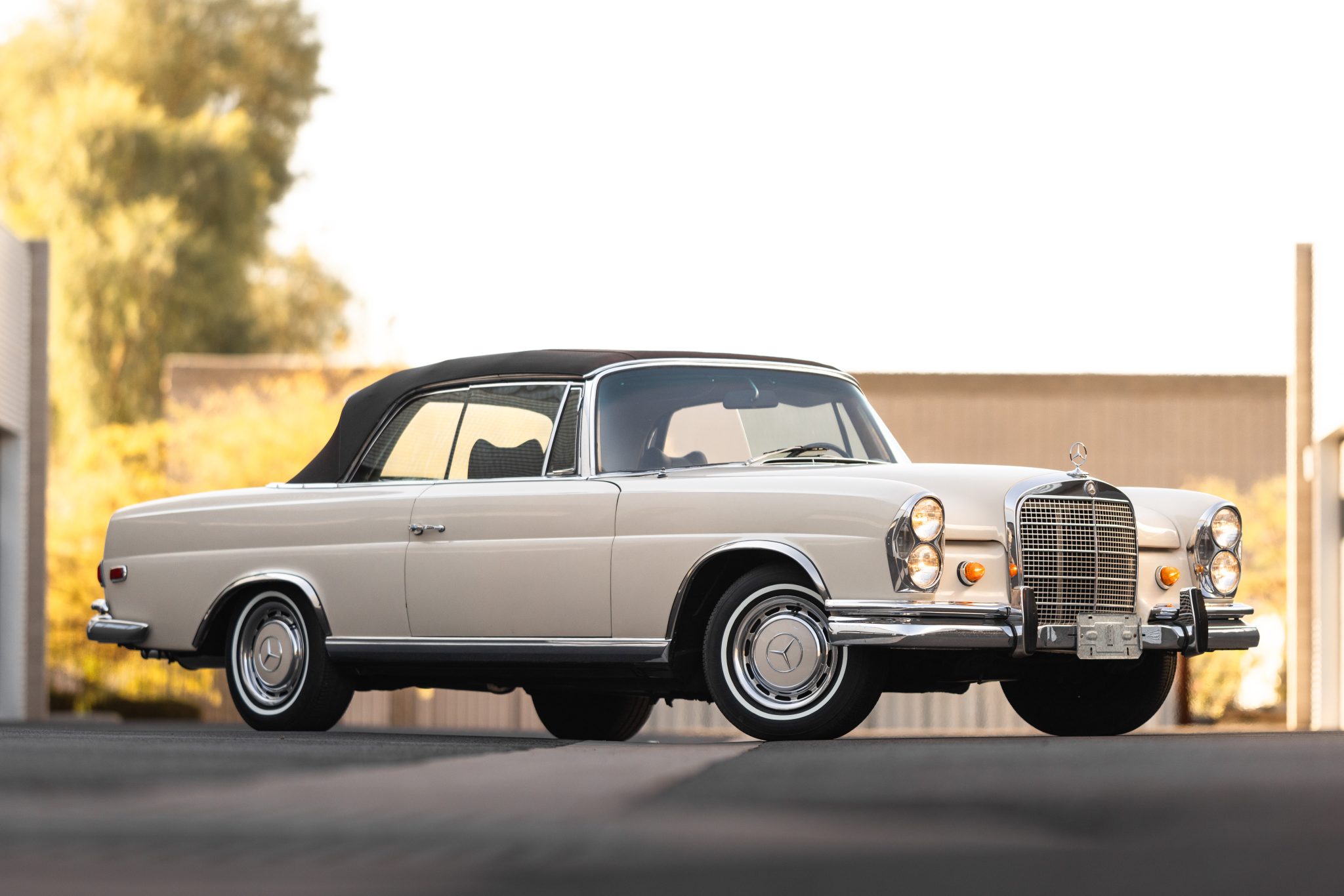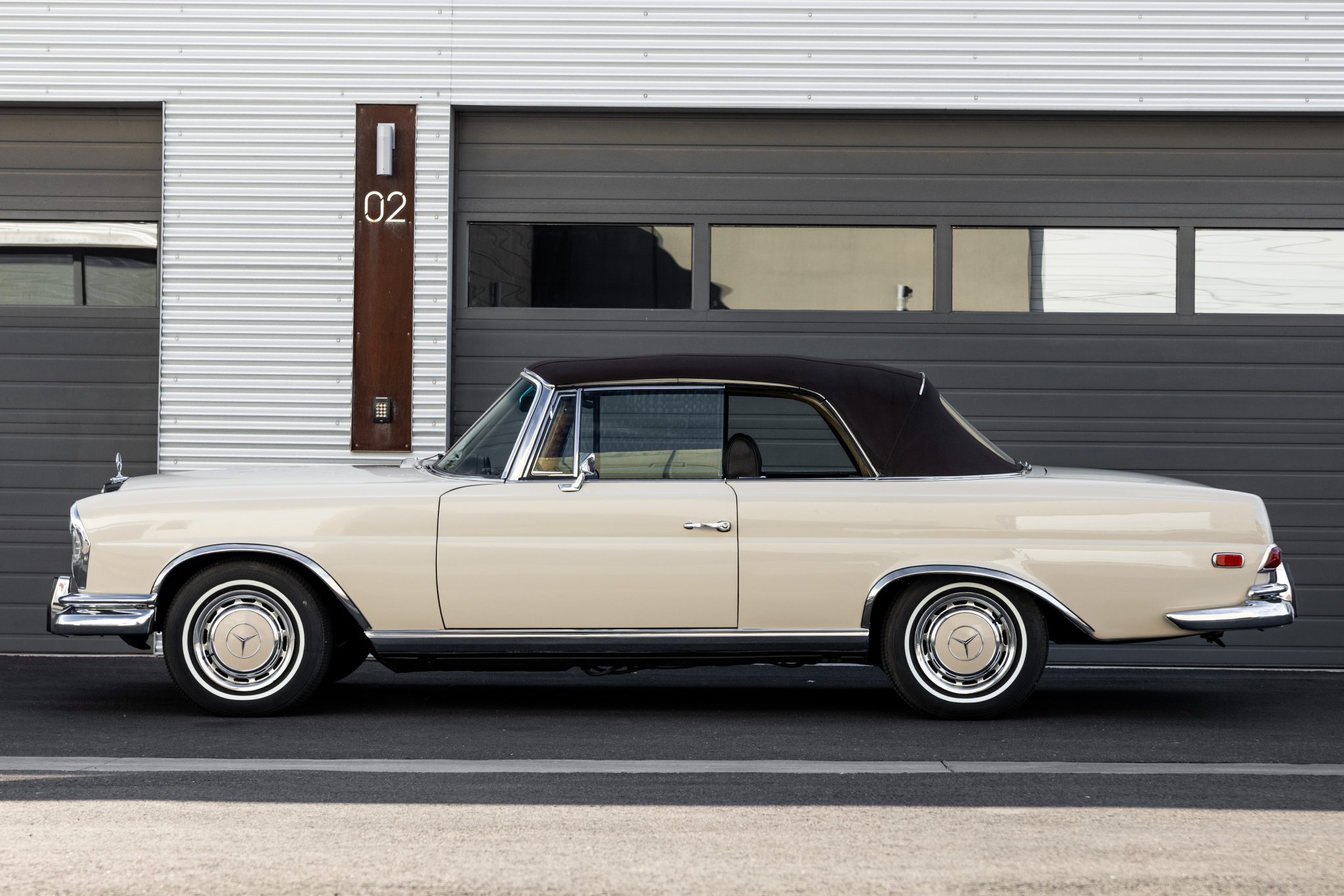 The car is finished in Light Beige over Dark Brown leather and is powered by a 2.8-liter inline-six paired with a four-speed automatic transmission. Equipment includes a brown convertible top, 14″ steel wheels with covers, disc brakes, three-point seat belts, power windows, a rear window defroster, a Becker radio, and air conditioning.