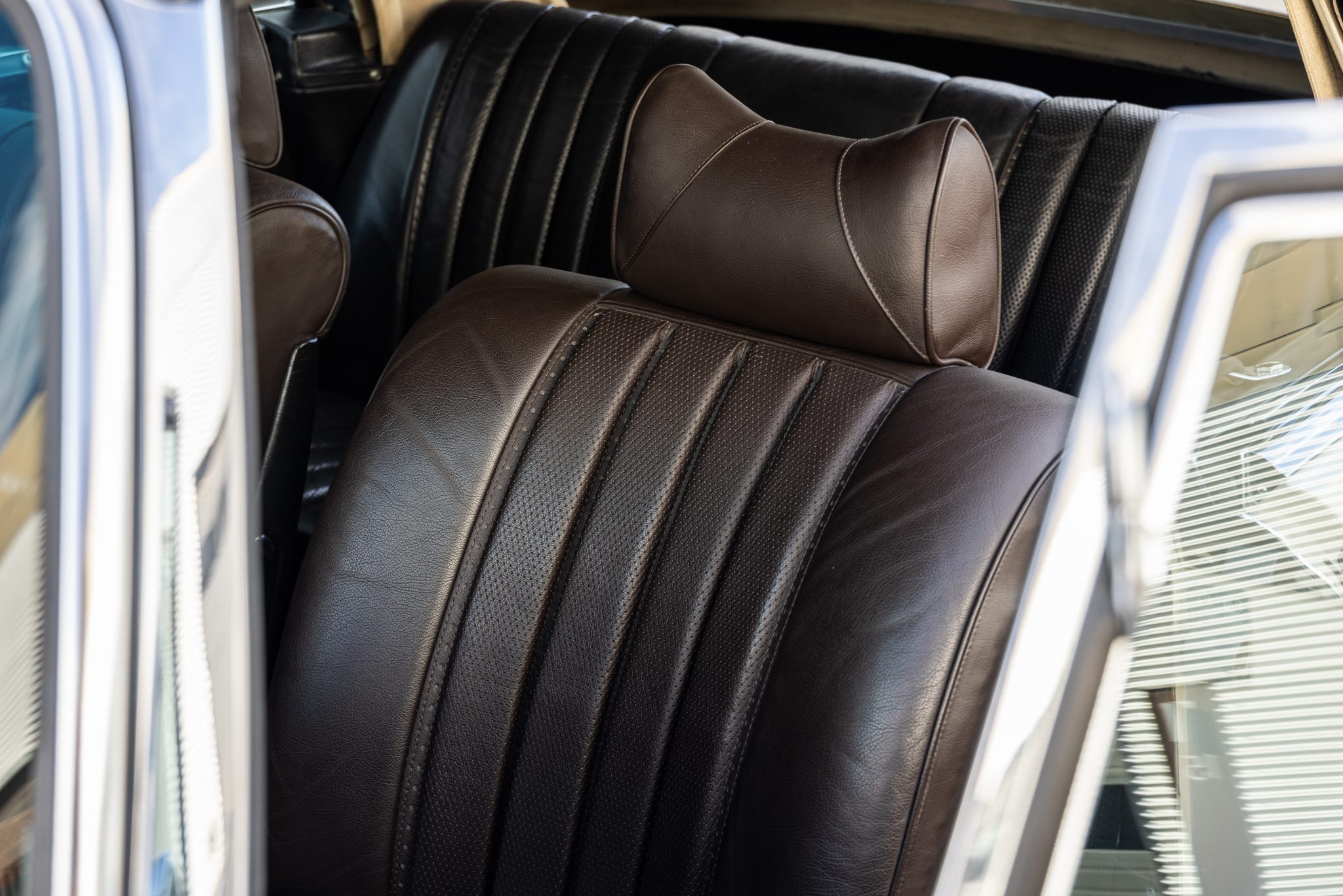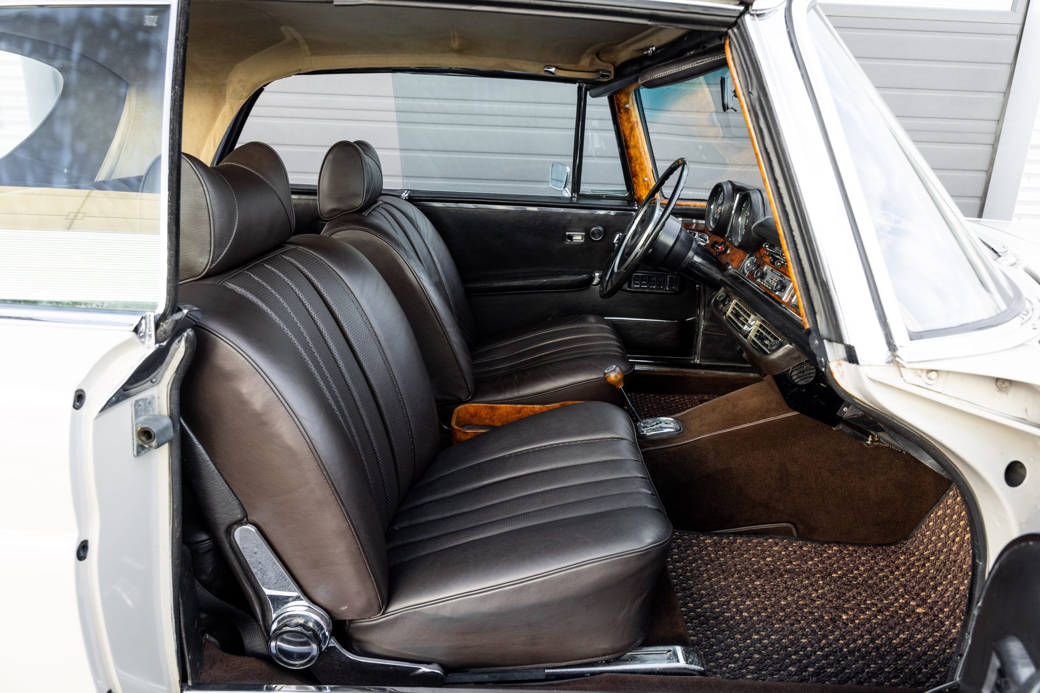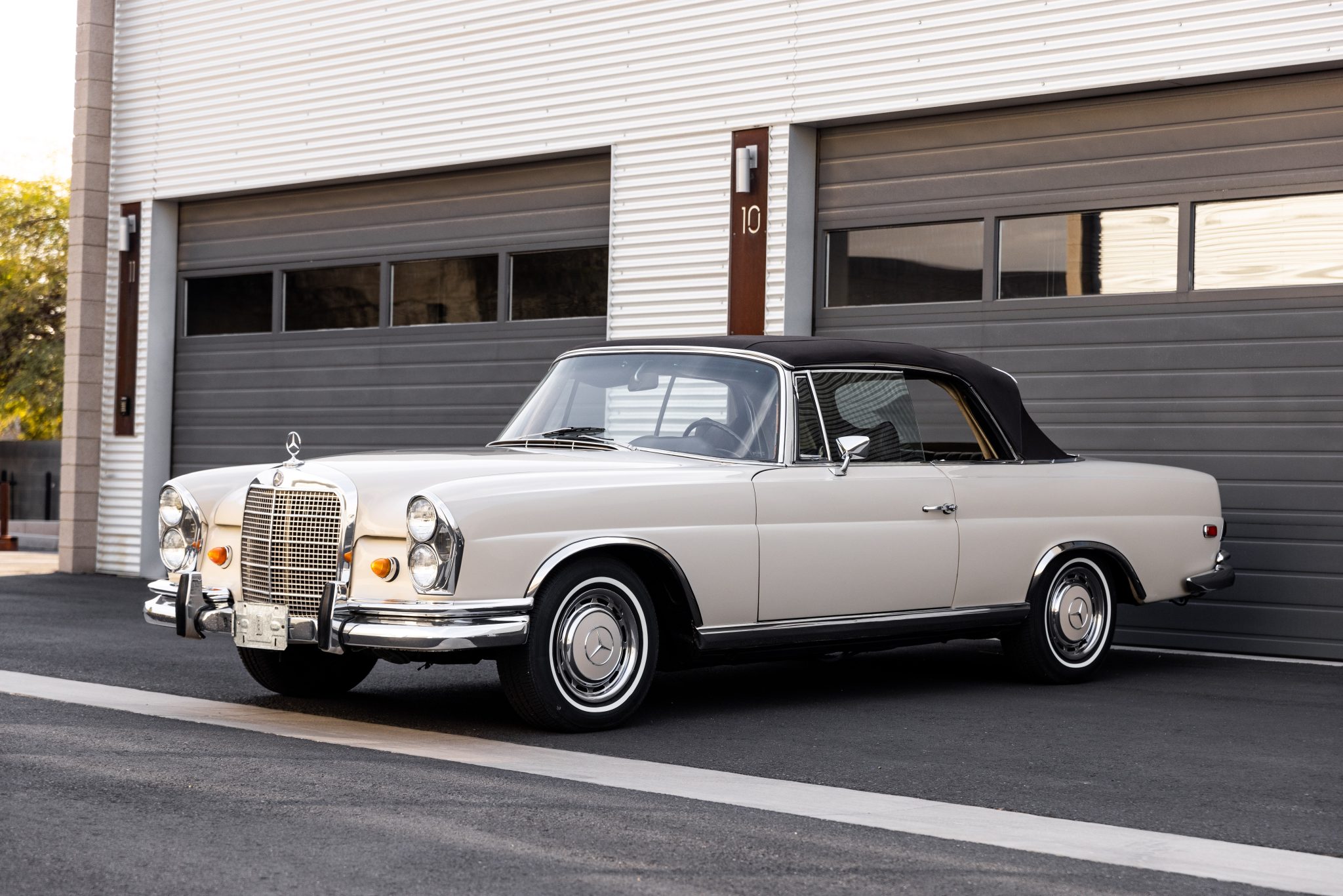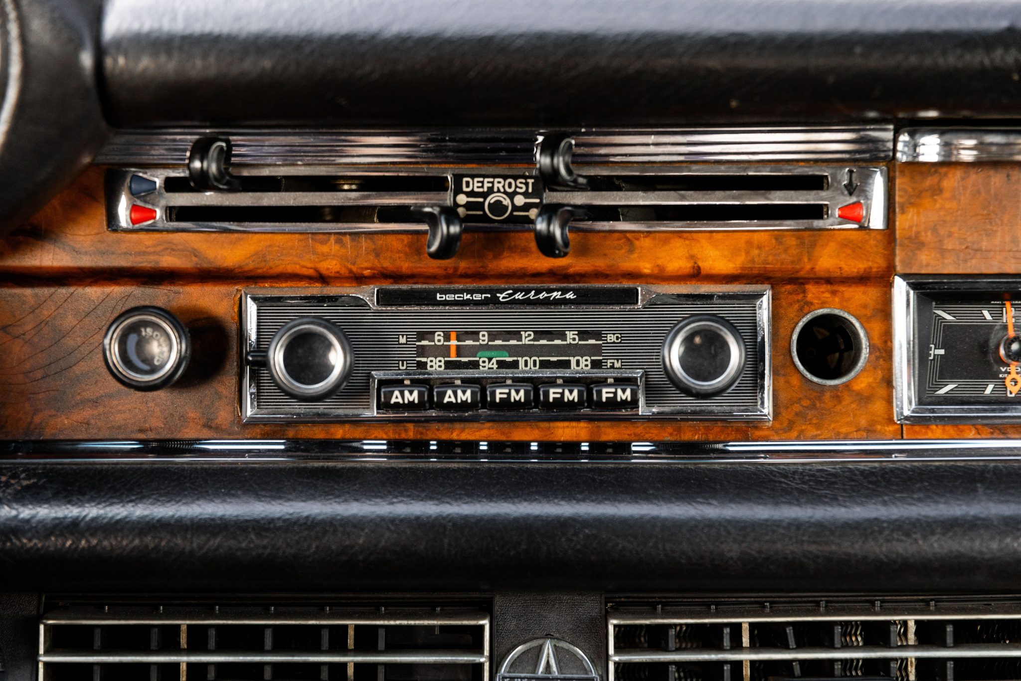 The car is finished in Light Beige over Dark Brown leather and is powered by a 2.8-liter inline-six paired with a four-speed automatic transmission. Equipment includes a brown convertible top, 14″ steel wheels with covers, disc brakes, three-point seat belts, power windows, a rear window defroster, a Becker radio, and air conditioning.