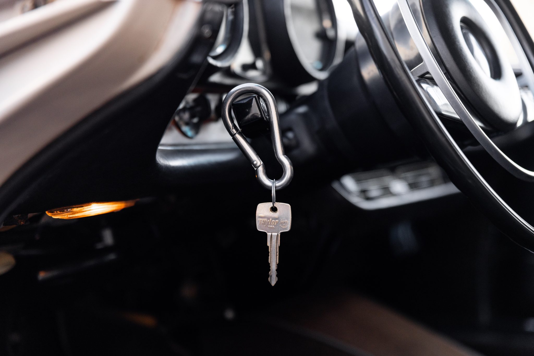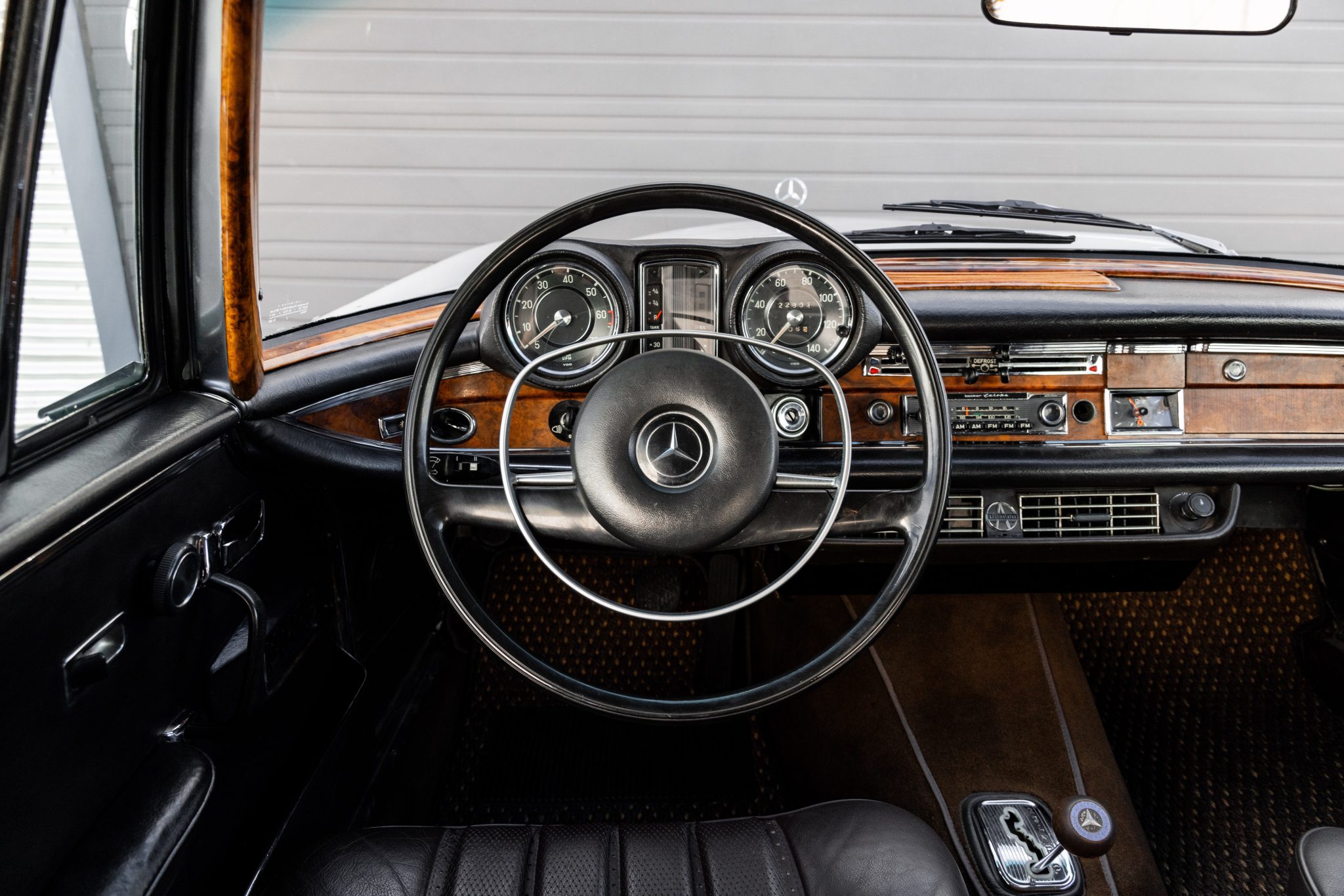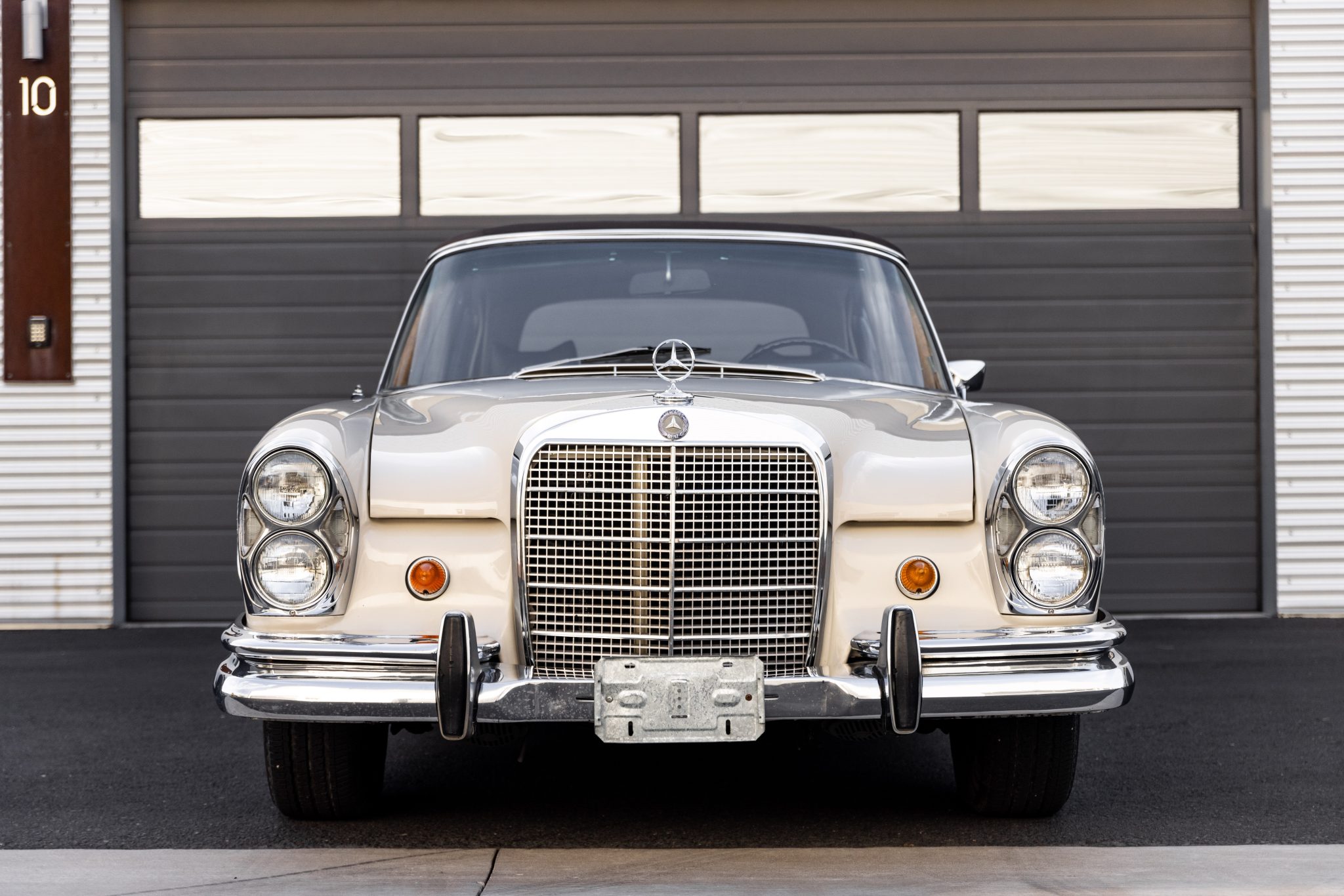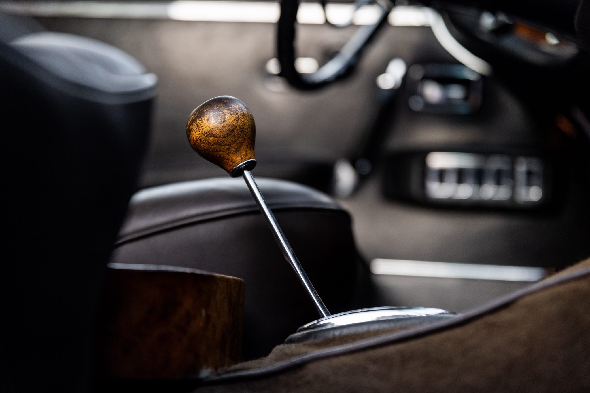 The car is finished in Light Beige over Dark Brown leather and is powered by a 2.8-liter inline-six paired with a four-speed automatic transmission. Equipment includes a brown convertible top, 14″ steel wheels with covers, disc brakes, three-point seat belts, power windows, a rear window defroster, a Becker radio, and air conditioning.