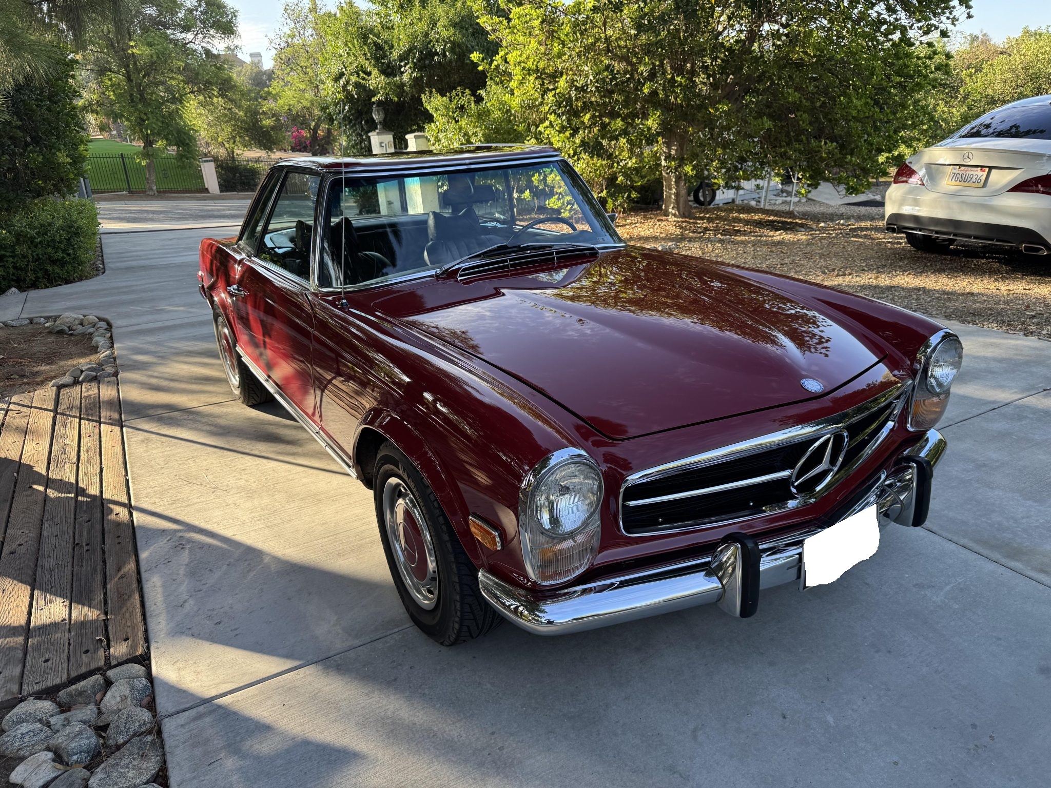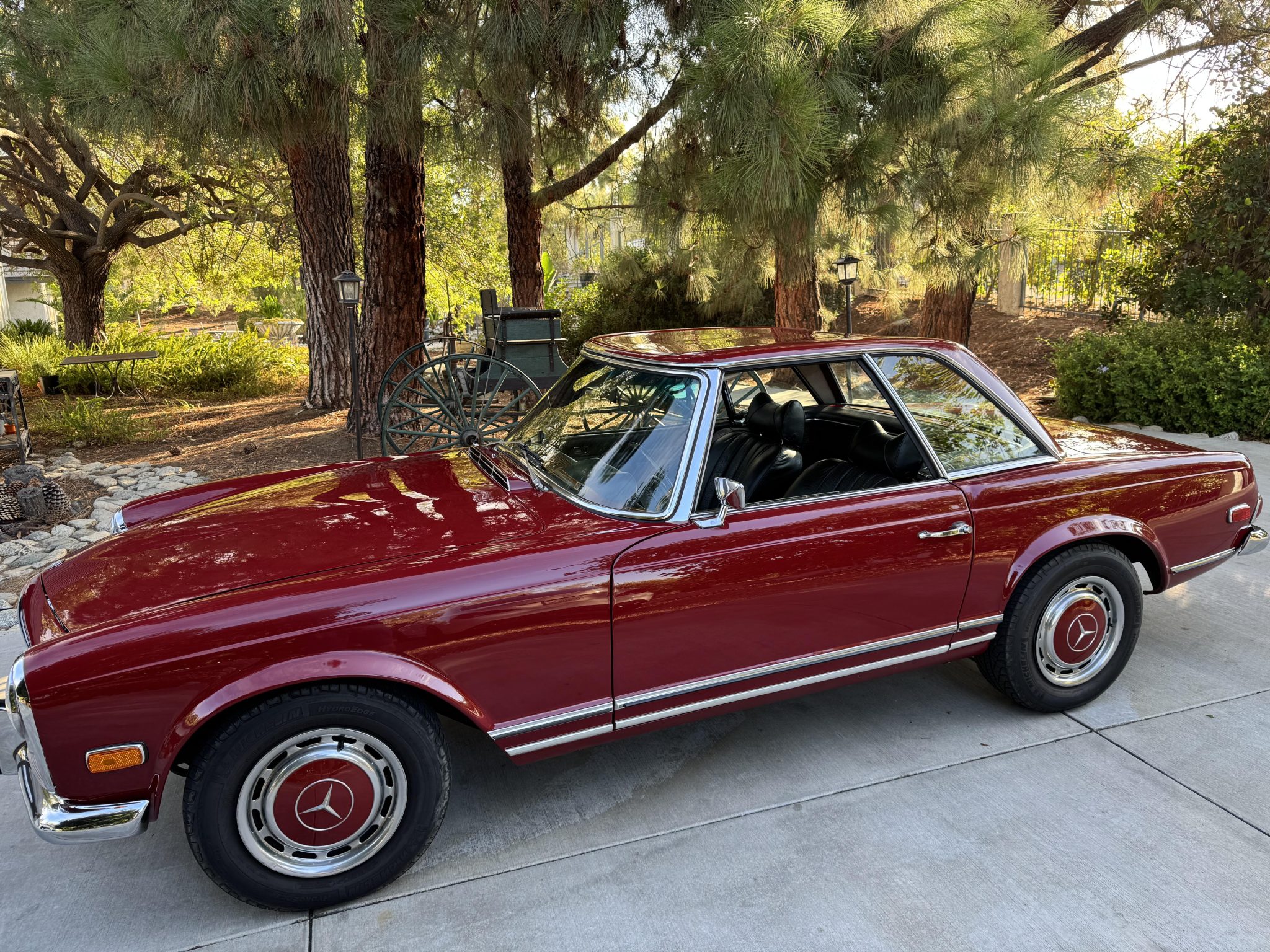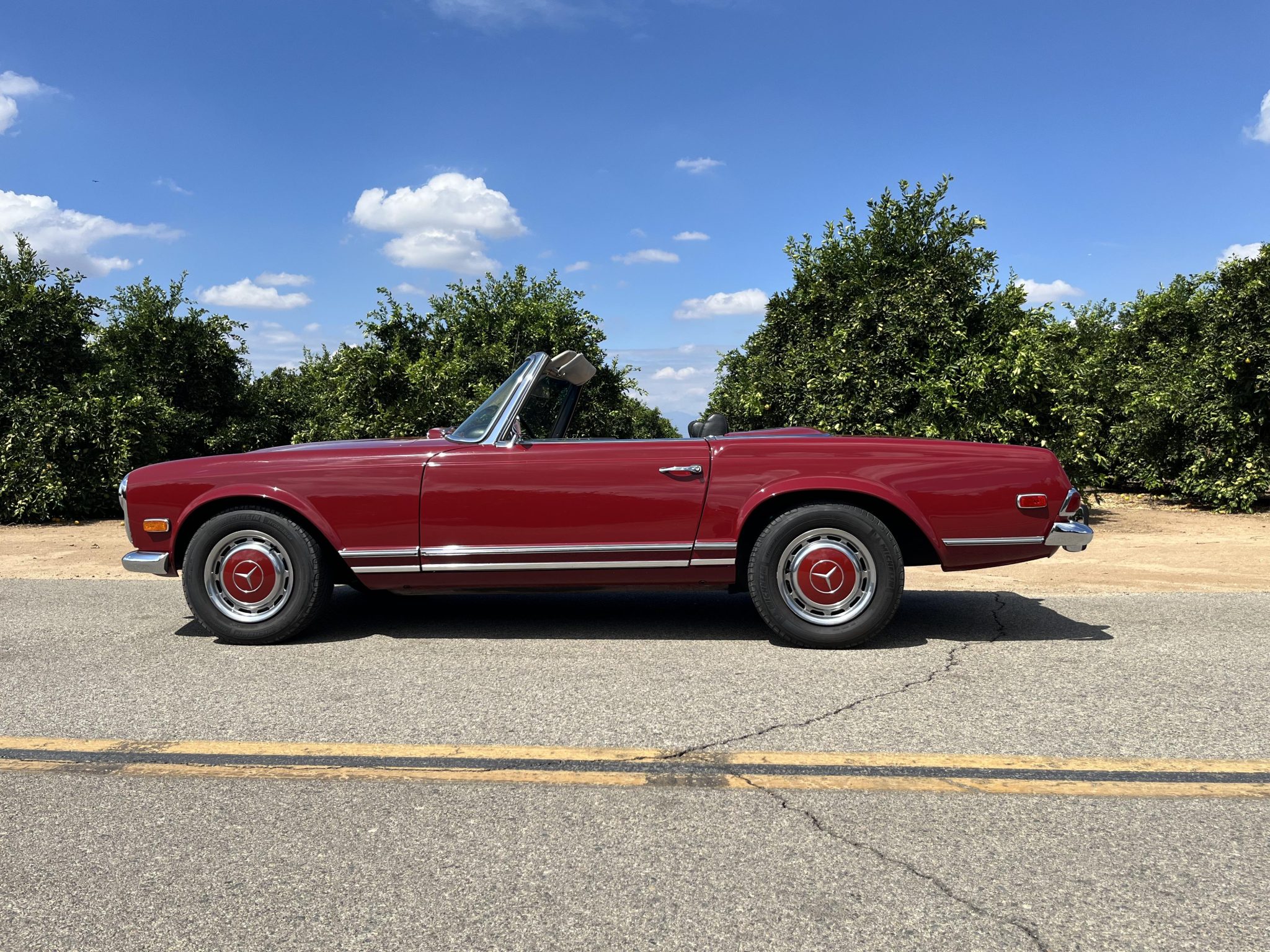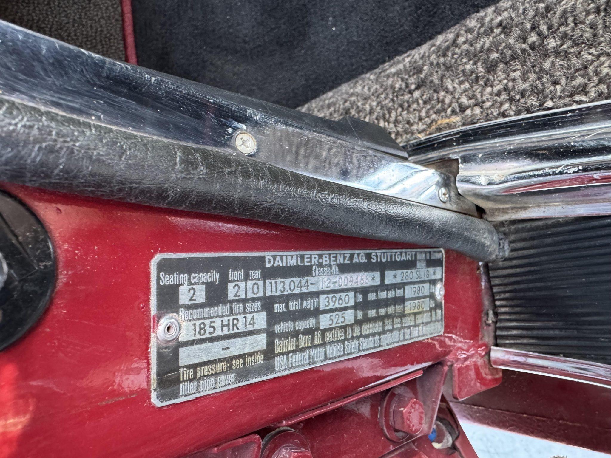 It is powered by a 2.8-liter inline-six paired with a four-speed automatic transmission. The car is finished in red over black MB-Tex and is equipped with a black convertible top, a removable hardtop, power steering, 14″ steel wheels with painted covers, a CD stereo, and air conditioning. The engine was rebuilt in 2021, and the transmission was overhauled in 2022. This is W113 SL