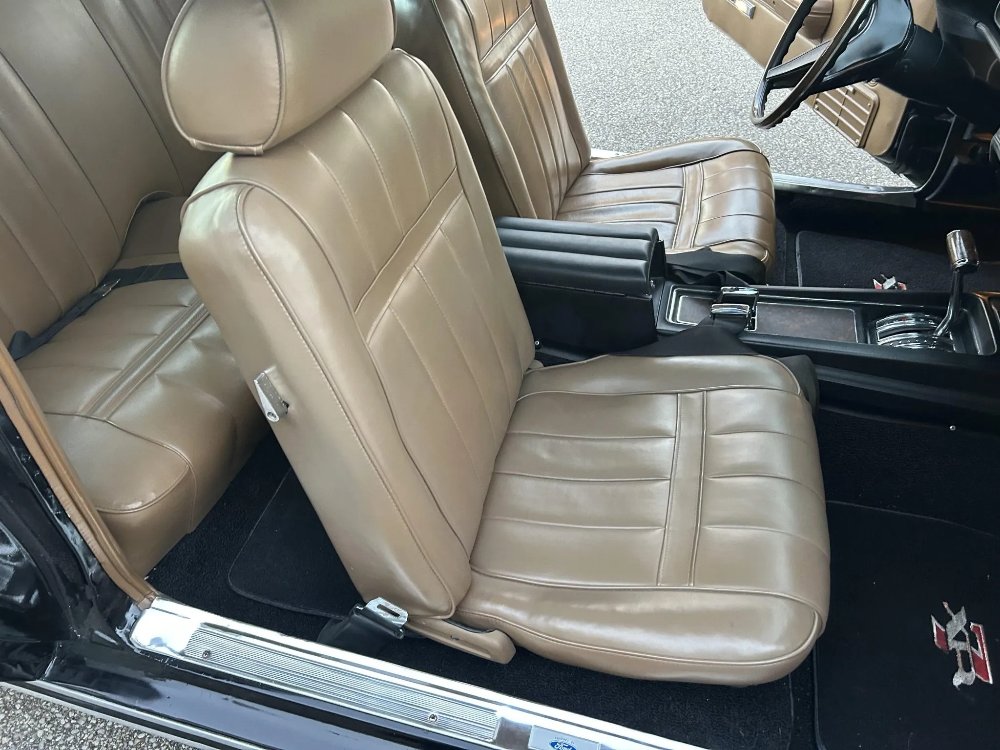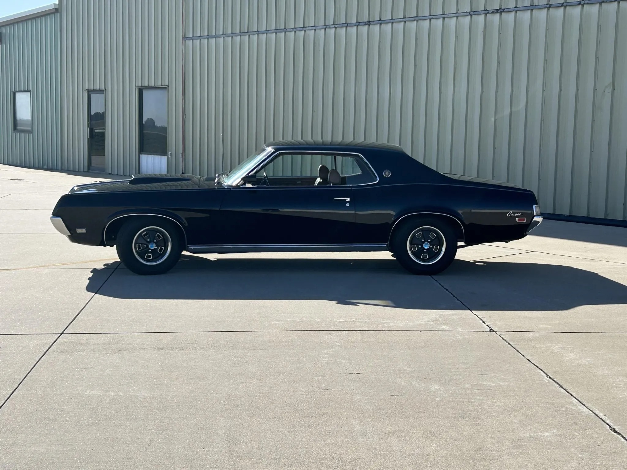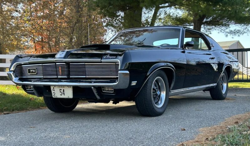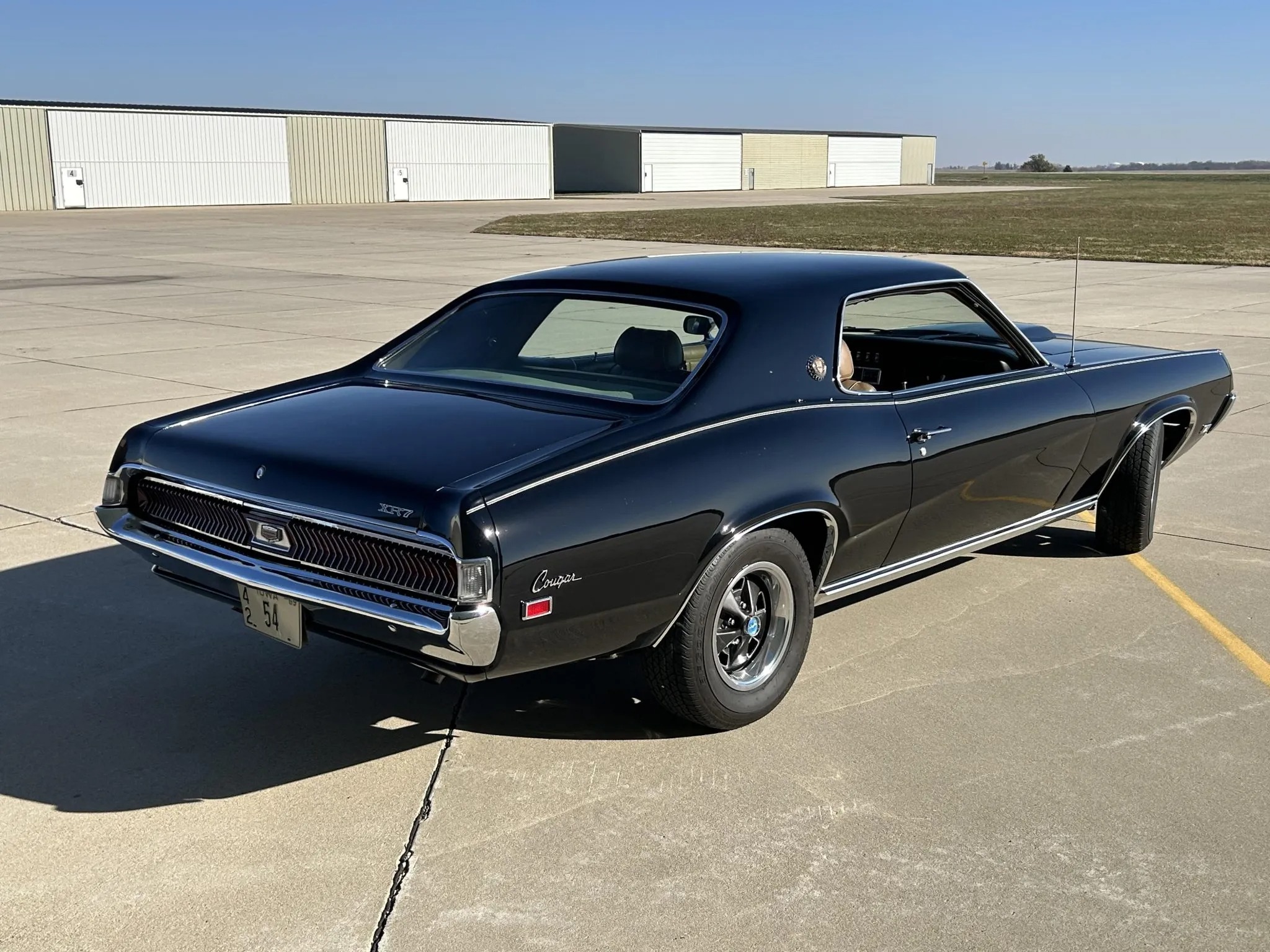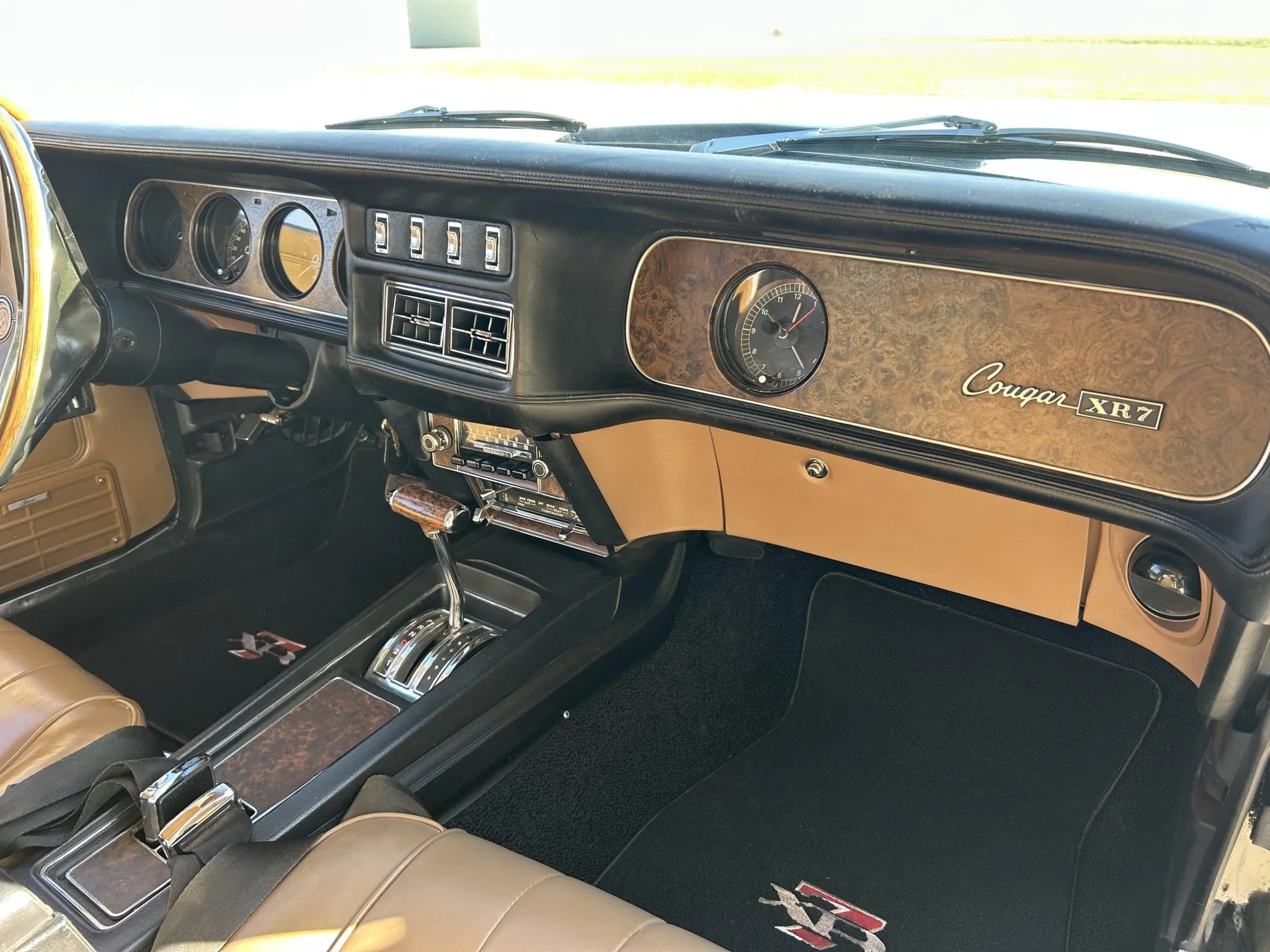 was ordered new with a 428ci Cobra Jet V8, Ram Air induction, a Traction-Lok differential, air conditioning, power windows, and an AM/FM radio. The engine block was replaced and fitted with the removed factory cylinder heads, which were rebuilt in 2025. The car was refurbished some time ago, which included a repaint in the factory black with silver pinstripes. Equipment includes a three-speed automatic transmission, front disc and rear drum brakes, 14” styled steel wheels, and a dual exhaust system. Inside, saddle leather upholstery covers the front bucket seats, and appointments consist of a sports console, woodgrain trim, and air conditioning. This Cougar XR-7 Cobra Jet is offered with an Elite Marti Report, the owner’s manual, the Ownercard, service records, a car cover, and a clean title