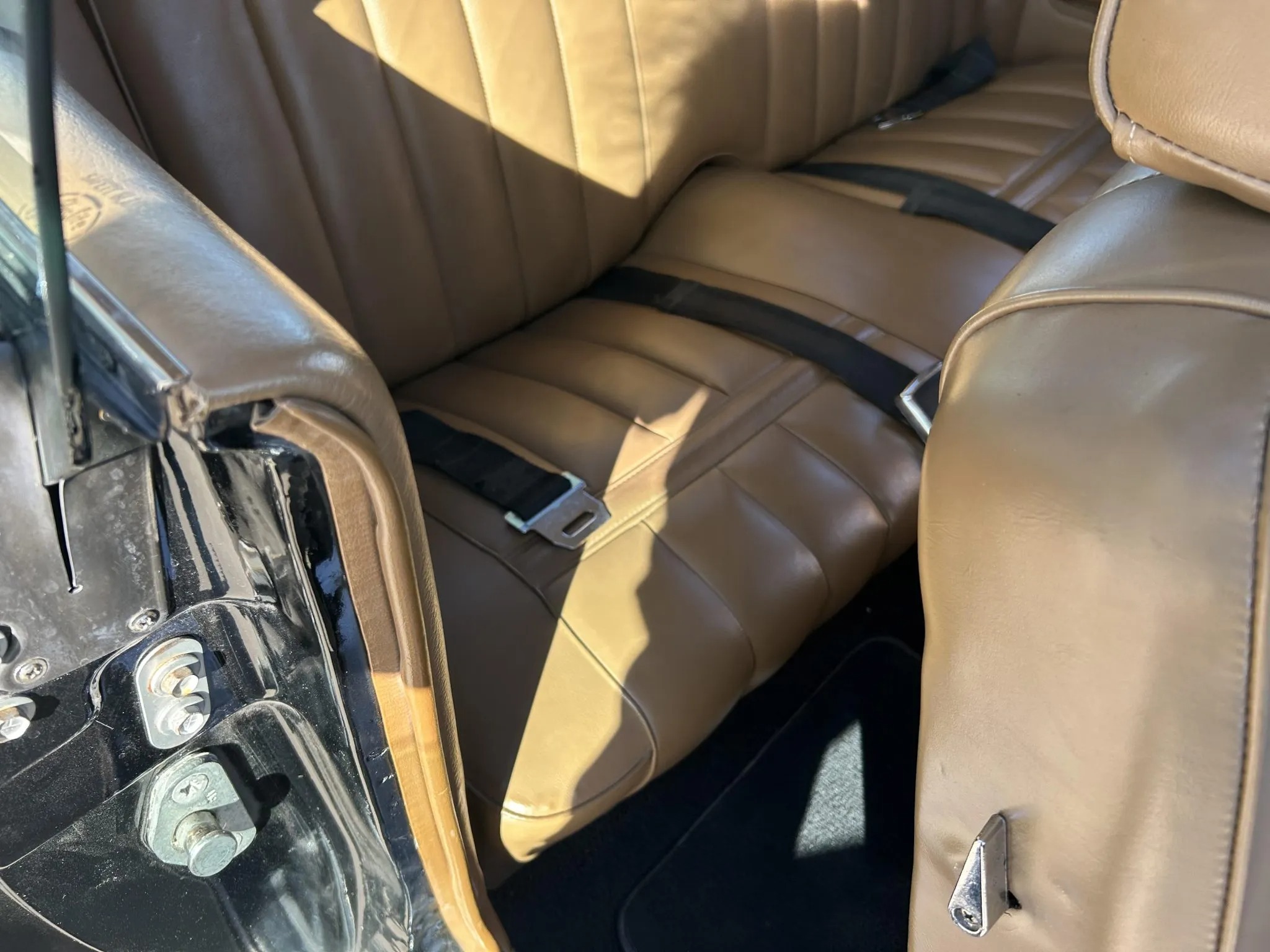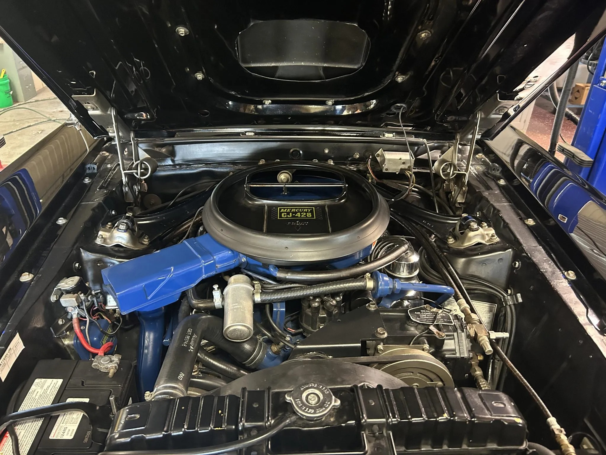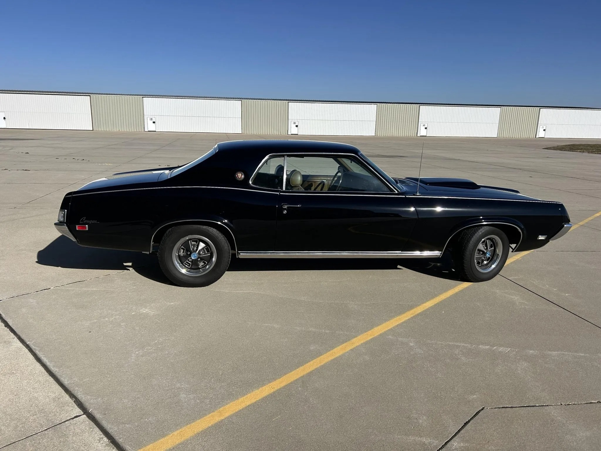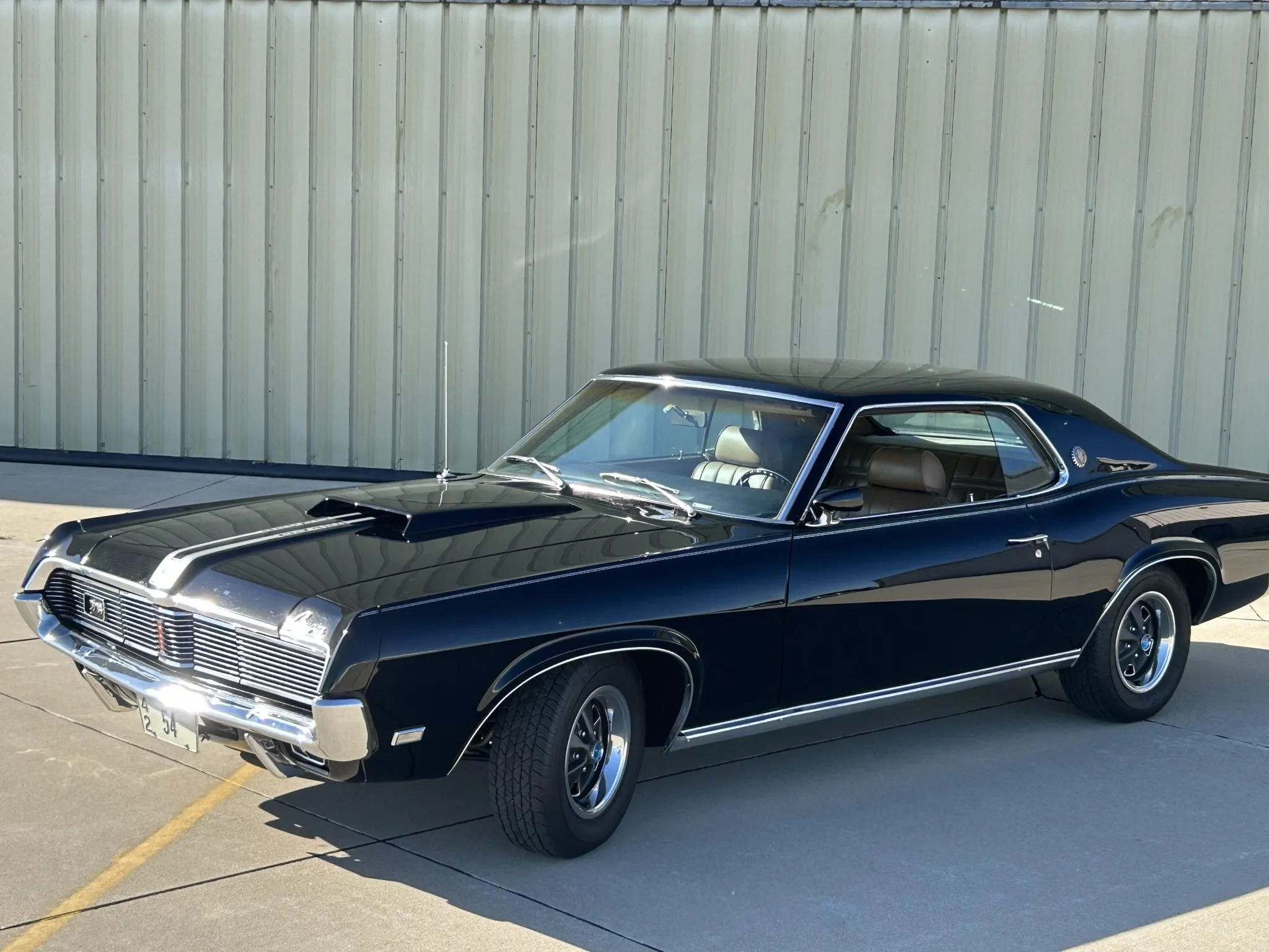 was ordered new with a 428ci Cobra Jet V8, Ram Air induction, a Traction-Lok differential, air conditioning, power windows, and an AM/FM radio. The engine block was replaced and fitted with the removed factory cylinder heads, which were rebuilt in 2025. The car was refurbished some time ago, which included a repaint in the factory black with silver pinstripes. Equipment includes a three-speed automatic transmission, front disc and rear drum brakes, 14” styled steel wheels, and a dual exhaust system. Inside, saddle leather upholstery covers the front bucket seats, and appointments consist of a sports console, woodgrain trim, and air conditioning. This Cougar XR-7 Cobra Jet is offered with an Elite Marti Report, the owner’s manual, the Ownercard, service records, a car cover, and a clean title