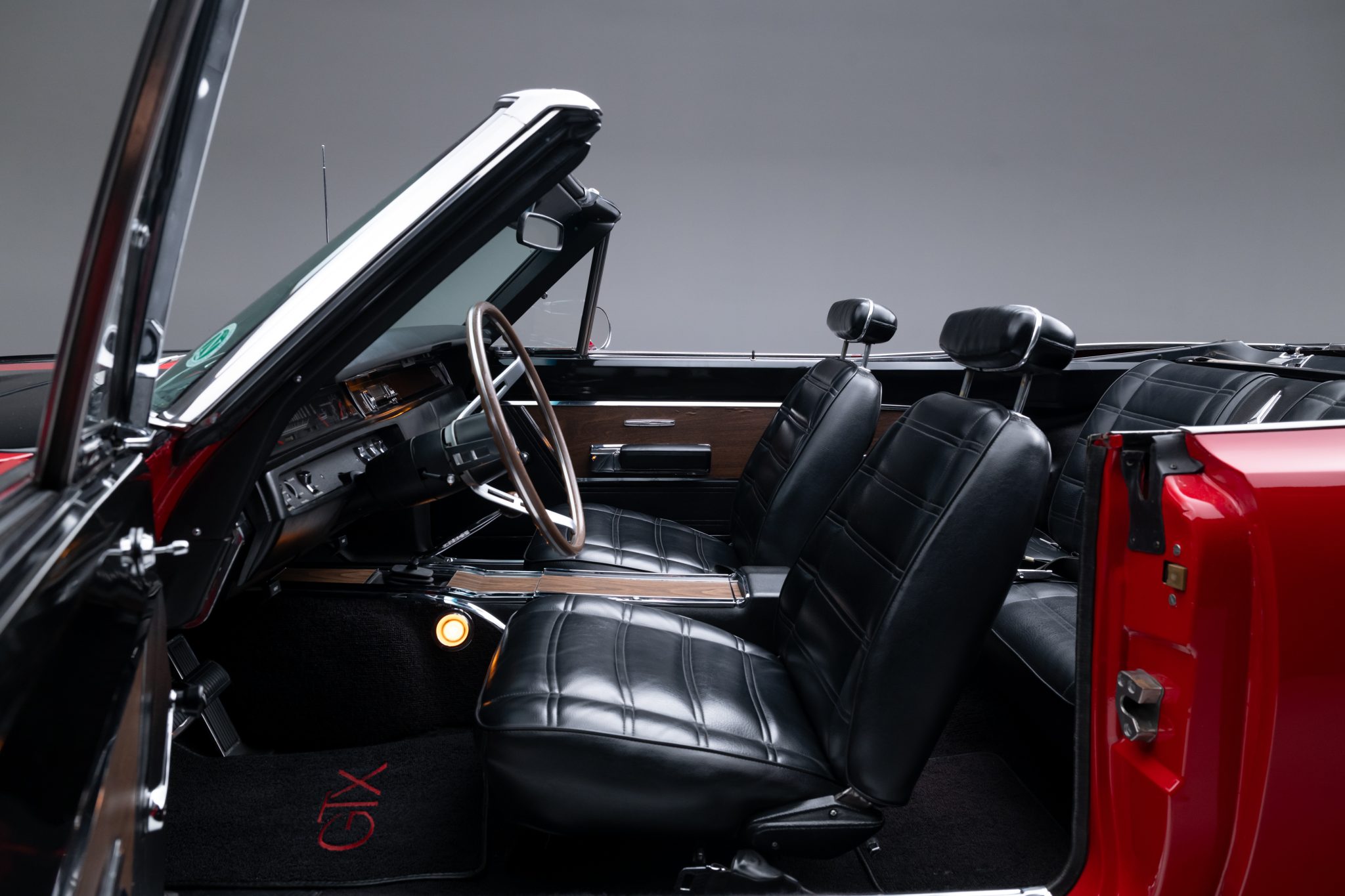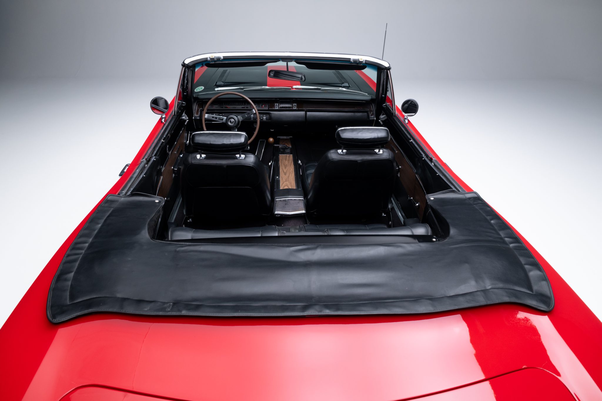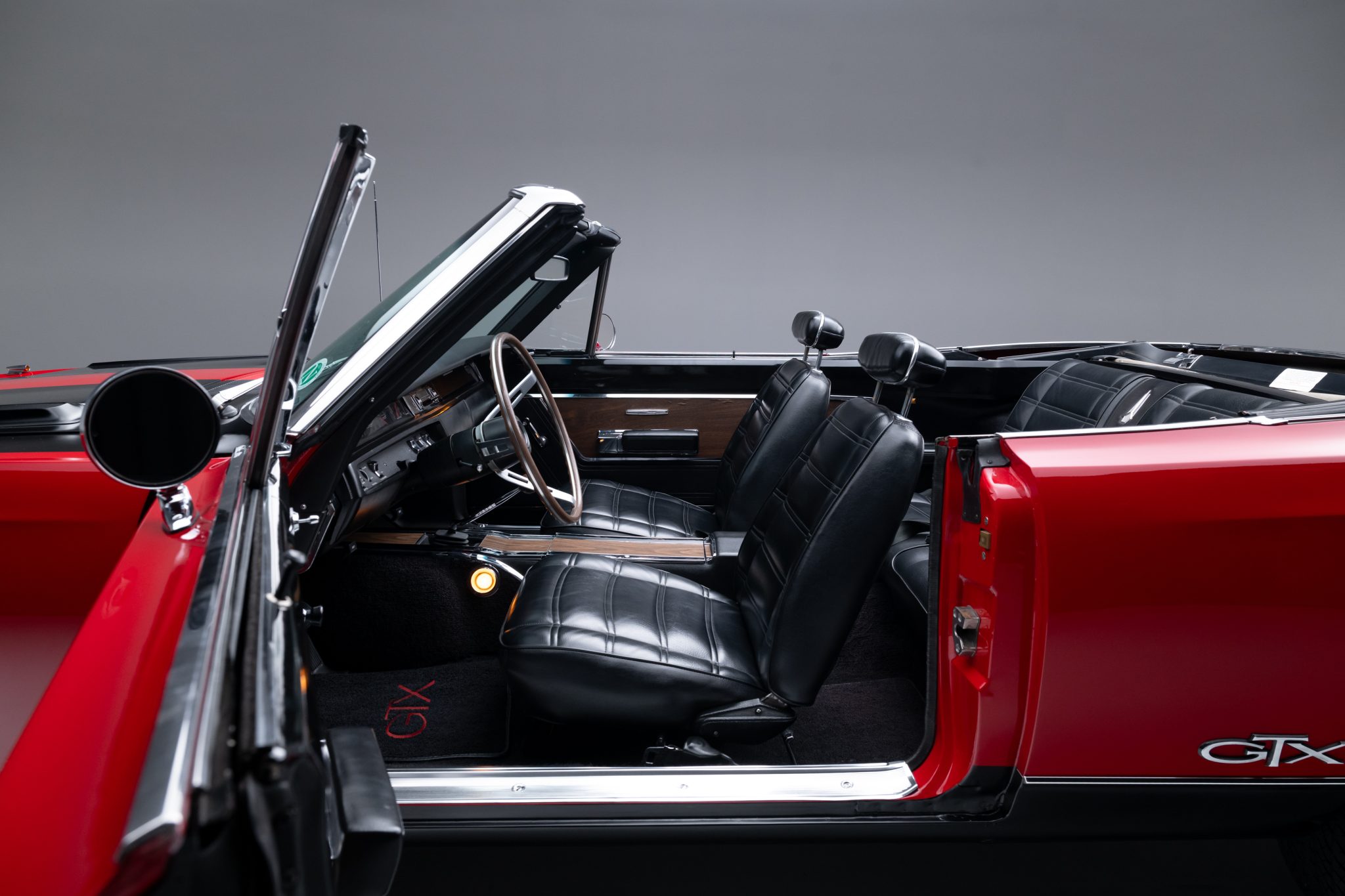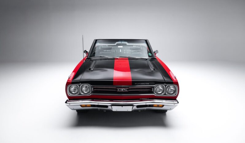 Power is provided by a 440ci V8 linked to a four-speed manual transmission and a Dana 60 rear axle, and the car is finished in Scorch Red with a black convertible top and black stripes over black vinyl upholstery. It is equipped with a black top boot, a center console, an AM radio, front-seat headrests, a four-barrel carburetor, power steering, and 14″ chrome road wheels with redline tires.